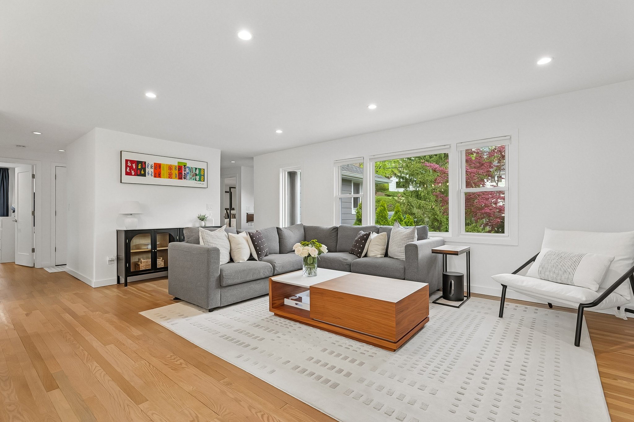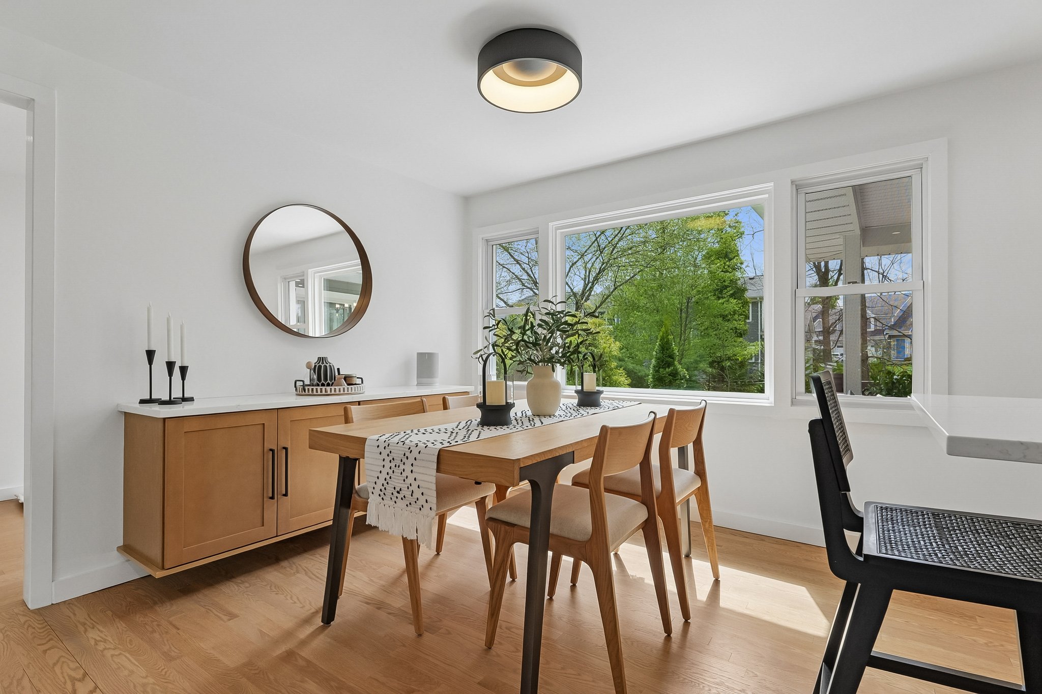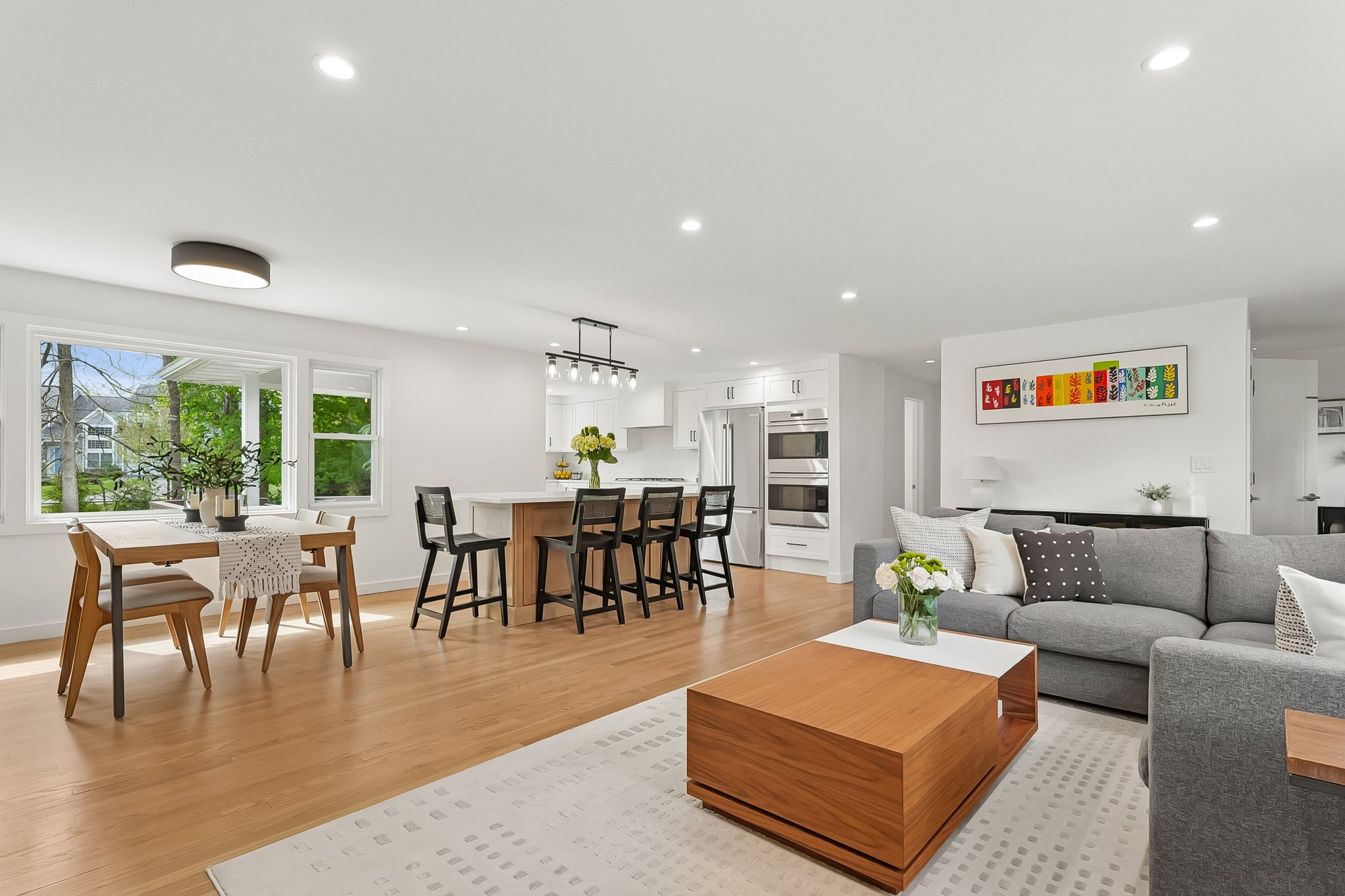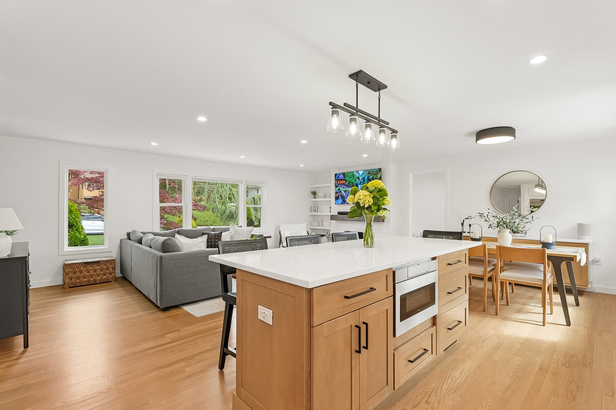 Welcome to elevated Ranch living, masterfully designed for entertaining. This meticulously maintained 3 bedroom, 1.5 rath home blends timeless style with modern comfort, offering a bright, open-concept layout ideal for both everyday living and effortless hosting. The inviting living room, complete with a cozy fireplace, flows seamlessly into the dining room complete with a floating wall-mounted cabinet and beautifully updated Kitchen featuring quartz countertops, a center island, custom windows, and high-end stainless steel appliances including Wolf and Bosch. Sliders provide direct access from the kitchen to a covered deck, creating the perfect indoor-outdoor flow for year-round entertaining. Just off the living room, a versatile office/playroom offers flexible space for remote work, hobbies, or additional living needs. The fully finished basement adds valuable living space with a dedicated laundry room and abundant storage. This home offers too many upgrades to list, including a new roof, siding, gutters, driveway, and more ensuring peace of mind for years to come along with central air, forced hot air heating, a sprinkler system, French drain, and sump pump. Outside, enjoy lush landscaping and a spacious deck, perfect for entertaining or relaxing in your own private retreat, while a 2-car garage completes this exceptional, move-in ready home that truly blends sophistication, comfort, and functionality. You don't want to miss this stunning home !