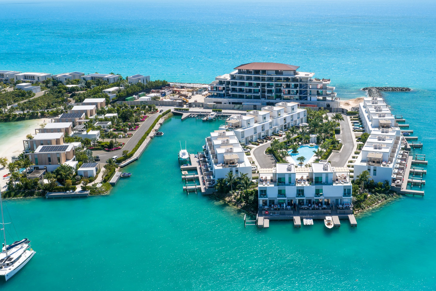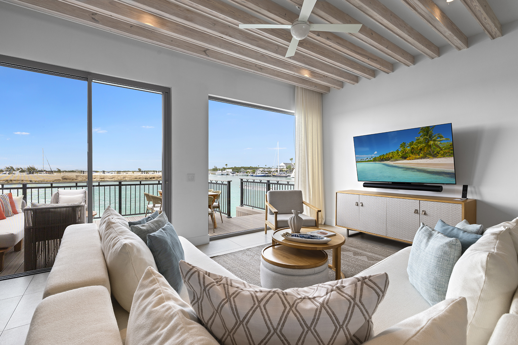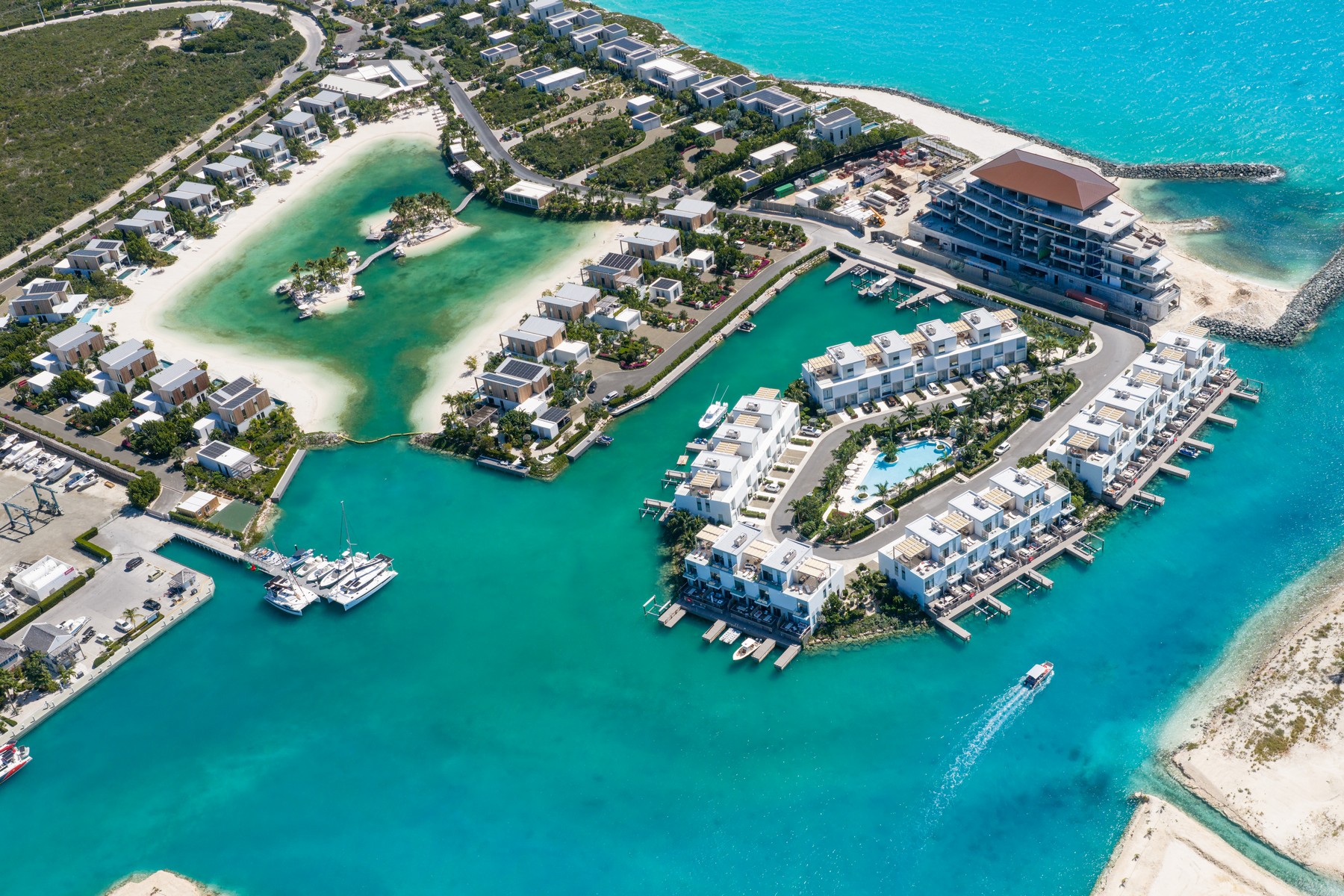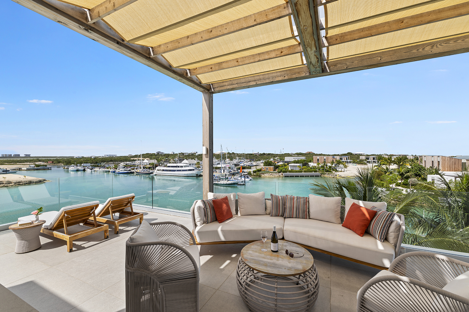 Welcome to C5, the only Boathouse available within low-density Building C. This waterfront two-bed + rooftop terrace enjoys waterfront views overlooking the Caicos Marina as well as sunset views from the rooftop over the salina and ocean. Offering 2,742 SF of gross living space on two levels and a rooftop terrace complete with wet bar and fridge, plumbing for a future hot tub, pergola and glass balustrades, C5 is a boat lover’s dream. The living/dining area as well as the contemporary Italian designed Arclinea kitchen enjoy additional sunlight through large format German engineered Shuco windows due to the prime corner position. Bosch appliances complete the elevated kitchen space, and the outdoor dining terrace provides an additional opportunity to enjoy al fresco living. A convenient lower terrace for easy boat/water access and water toy storage includes 4 SUP boards, a boat lift for boats up to 27-foot boat as well as floating dock. A 21-foot Hewes Red Fisher 2025 is available for separate purchase. The second level comprises two beds – the primary is waterfront – both with en-suite baths, spacious closets and terraces. A staircase leads up to a 3rd floor rooftop featuring stunning elevated water views. Ownership at the Launch includes private use of the central pool and entertainment area featuring hammocks, bar, BBQ stations, and loungers, as well as access to all South Bank amenities, such as the spa, Lua restaurant, Lagoon lounging islands, fitness center, Long Bay beach, and additional restaurant, pool and beach area upon completion of Arc. Management & services are provided by Grace Bay Resorts of iconic Grace Bay Club and its Private Residences Collection. Performing exceptionally in the rental program, please request a copy of the financials.