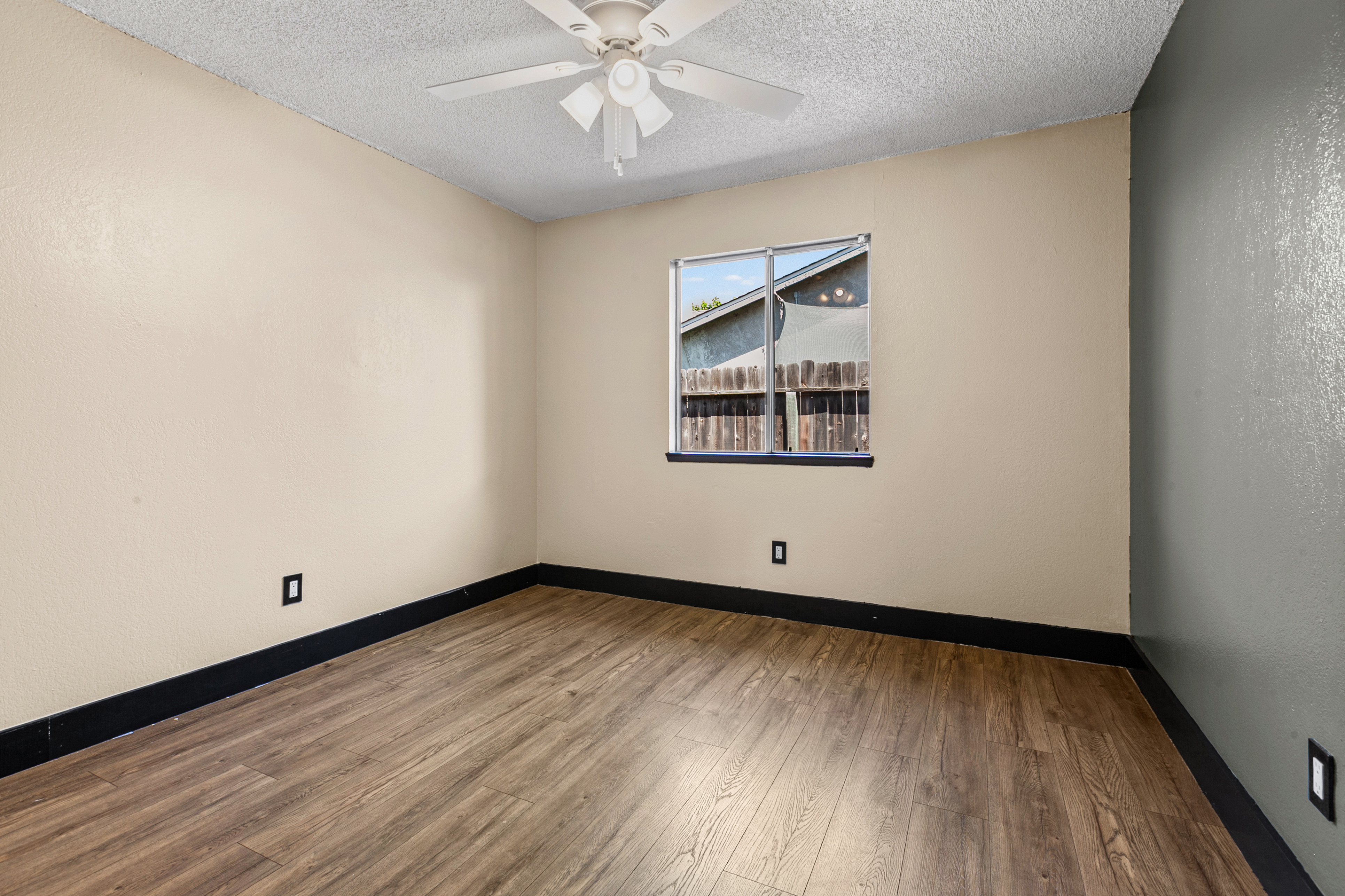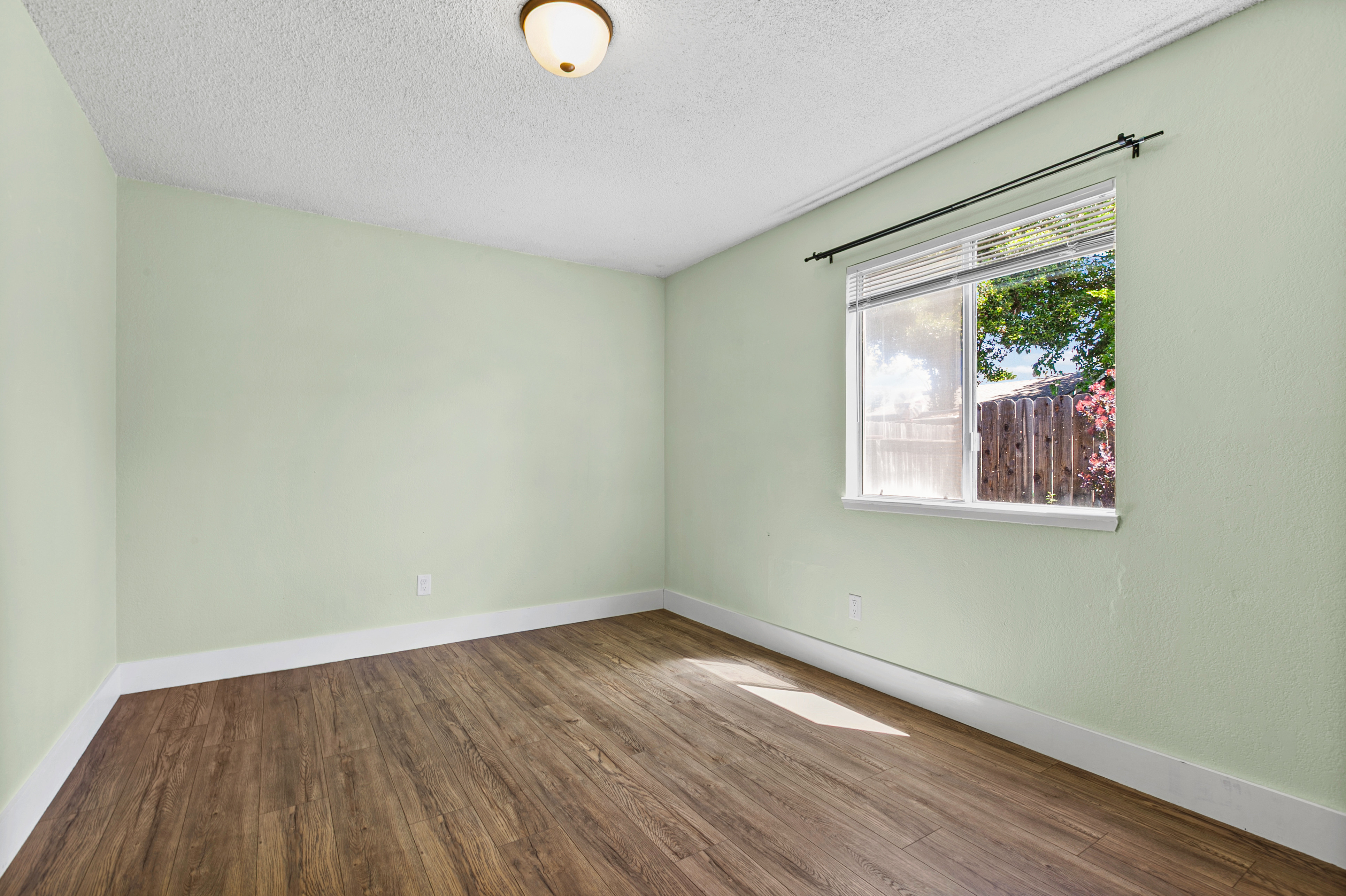 The primary bedroom is tucked toward the back of the home, with a large window overlooking the yard, giving it a quiet, private feel. The garage has been converted into a laundry room and fourth bedroom (unpermitted), offering additional space for guests, a home office, or extended living.