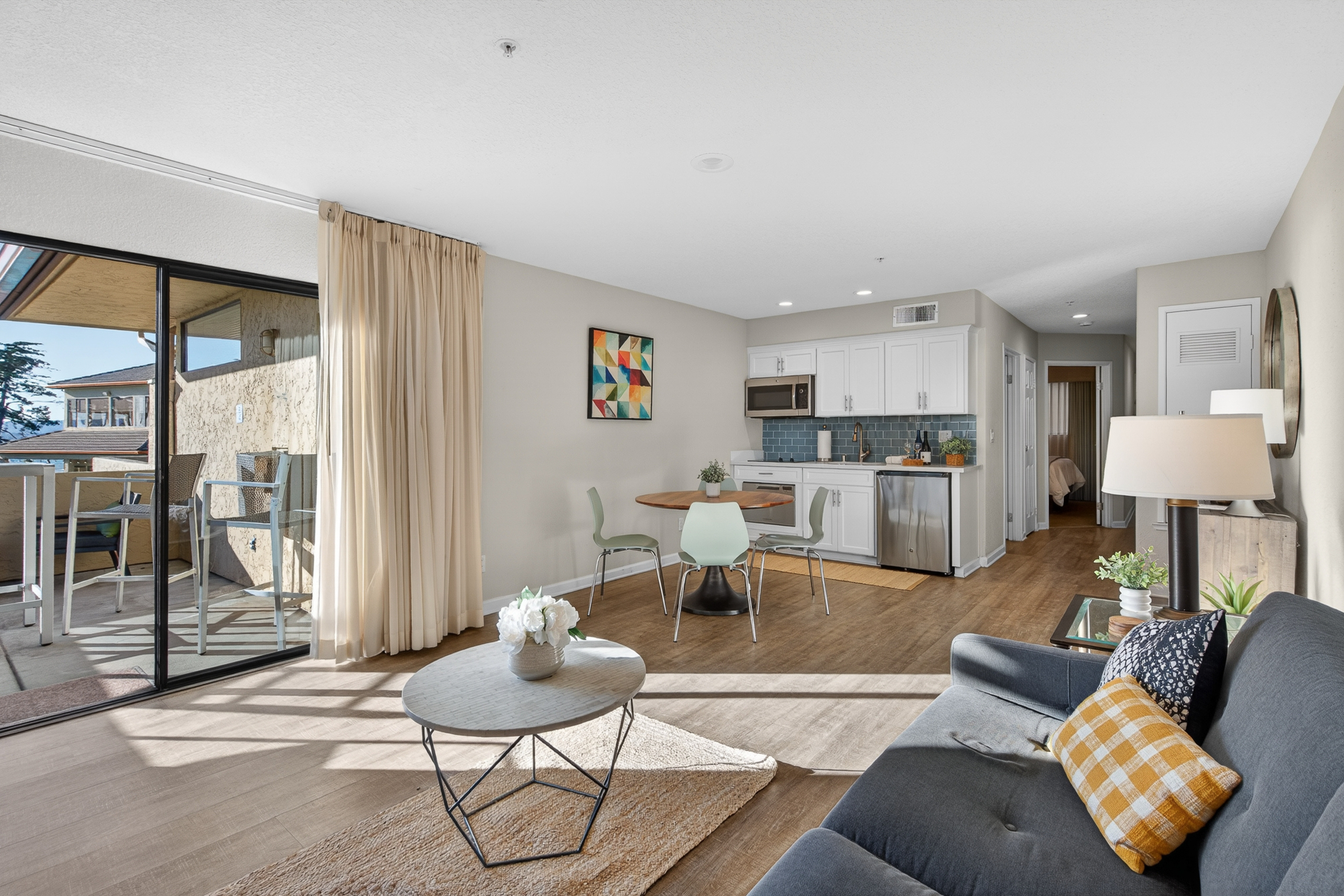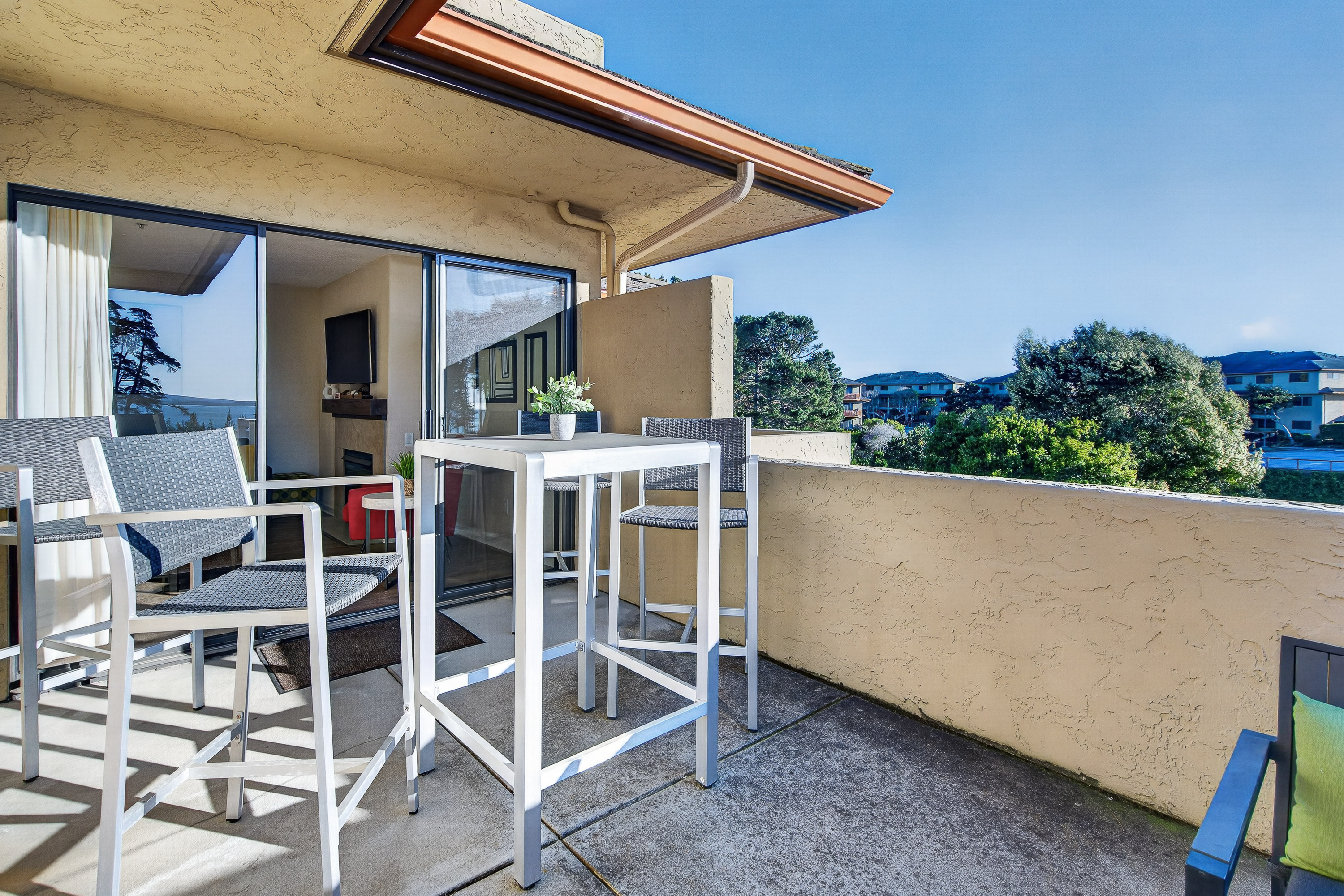 An ocean view and a private setting define this second-floor one-bedroom Seascape Beach Resort unit, set back from the main pool area and near the resorts central amenities. The unit features a kitchenette, casual dining area, fireplace, and living room with a great ocean view. Step out onto the private balcony deck to enjoy the coastal setting. Convenient elevator access from the parking garage adds to the ease of use. Enjoy resort amenities including three pools, on-site dining with restaurant and bar, and reserved beach firepits with smores service. The grounds offer walking paths along the coastline and direct access to miles of sandy beach. Nearby are Seascape Golf Club, Seascape Sports Club for tennis and pickleball, restaurants, and Seascape Foods organic market. Surf spots for all levels, hiking and mountain biking trails, the Santa Cruz Beach Boardwalk (approximately 25 minutes), and destinations such as Monterey Bay Aquarium, Carmel-by-the-Sea, and Pebble Beach.