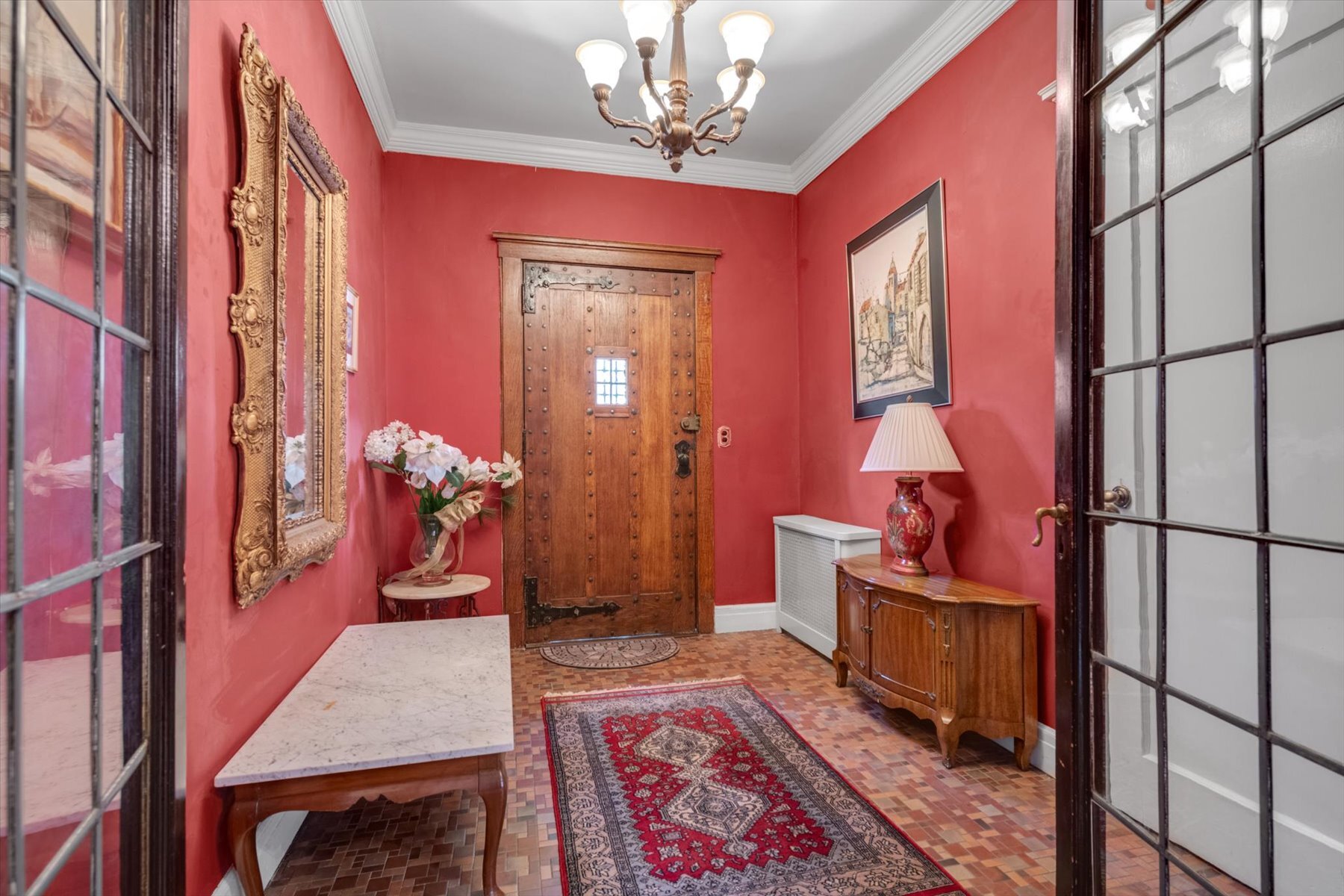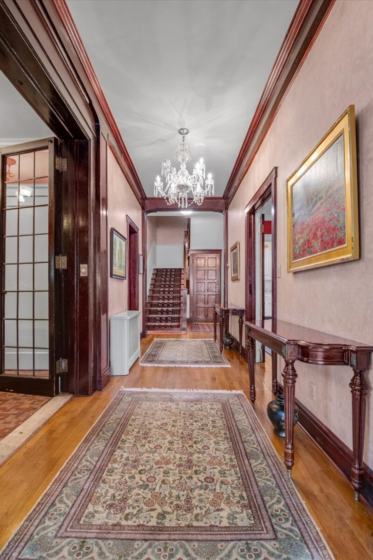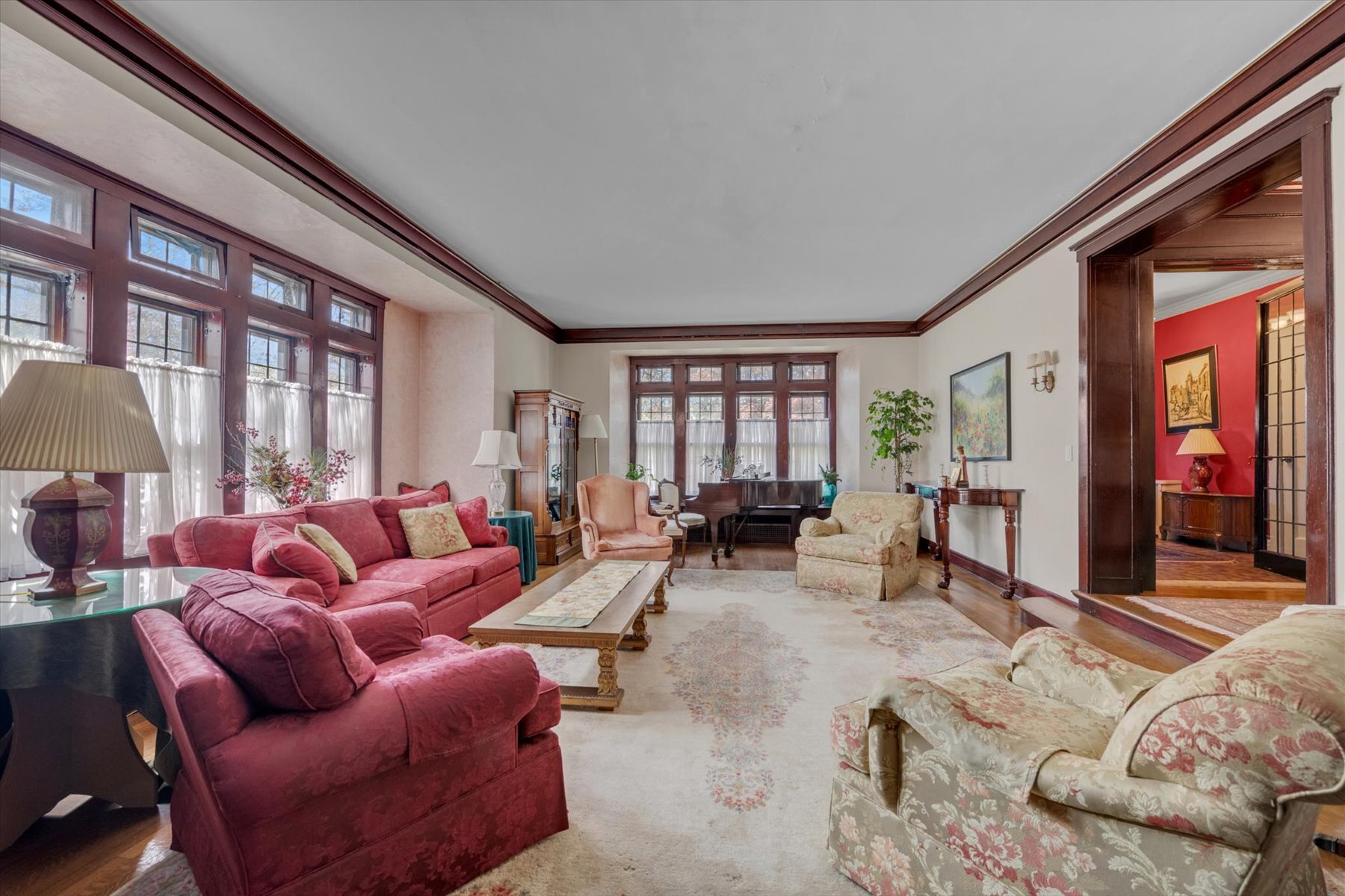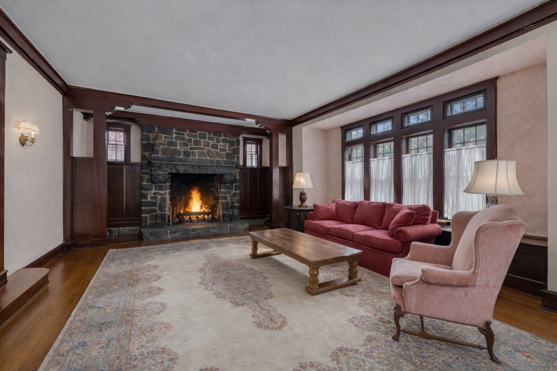 Enter through a grand foyer that immediately sets an elegant tone. A long, graceful hallway leads to a sunken living room anchored by a striking stone fireplace, while classic leaded glass windows bathe the space in natural light.