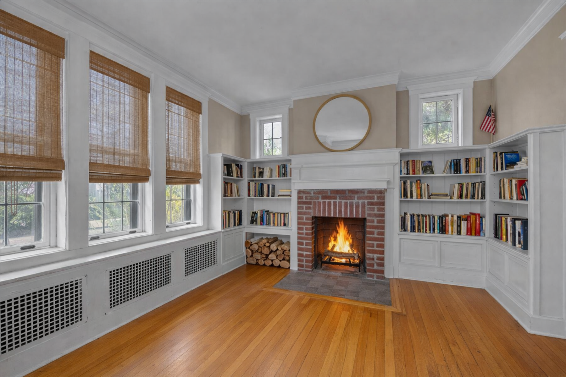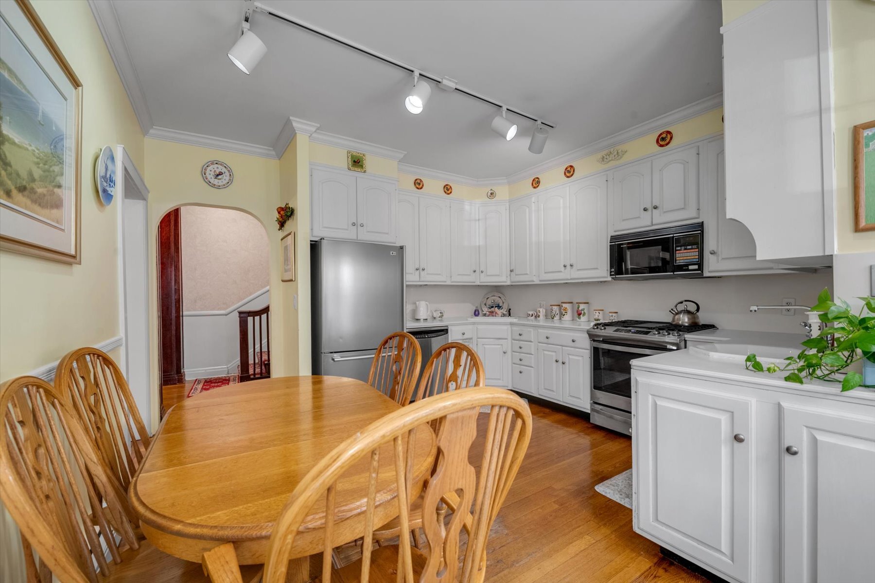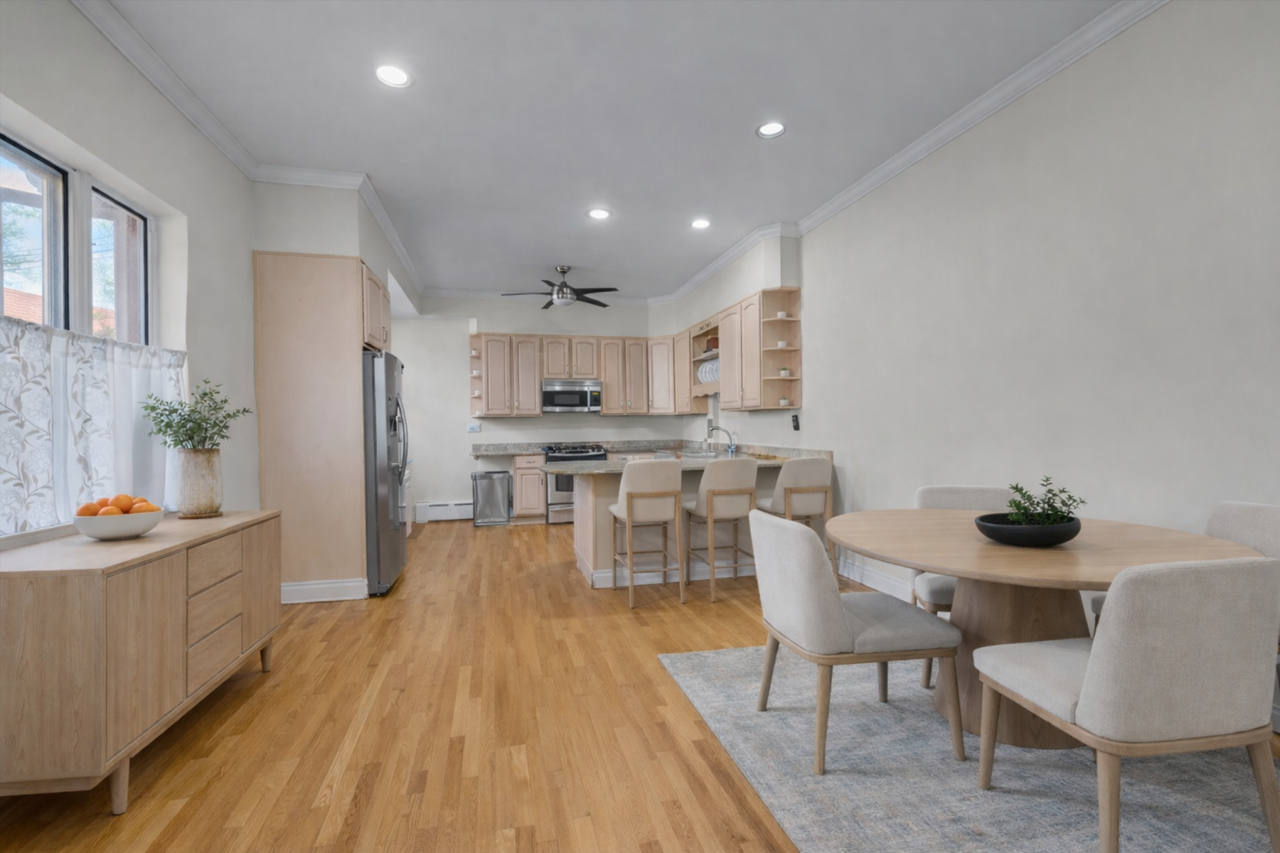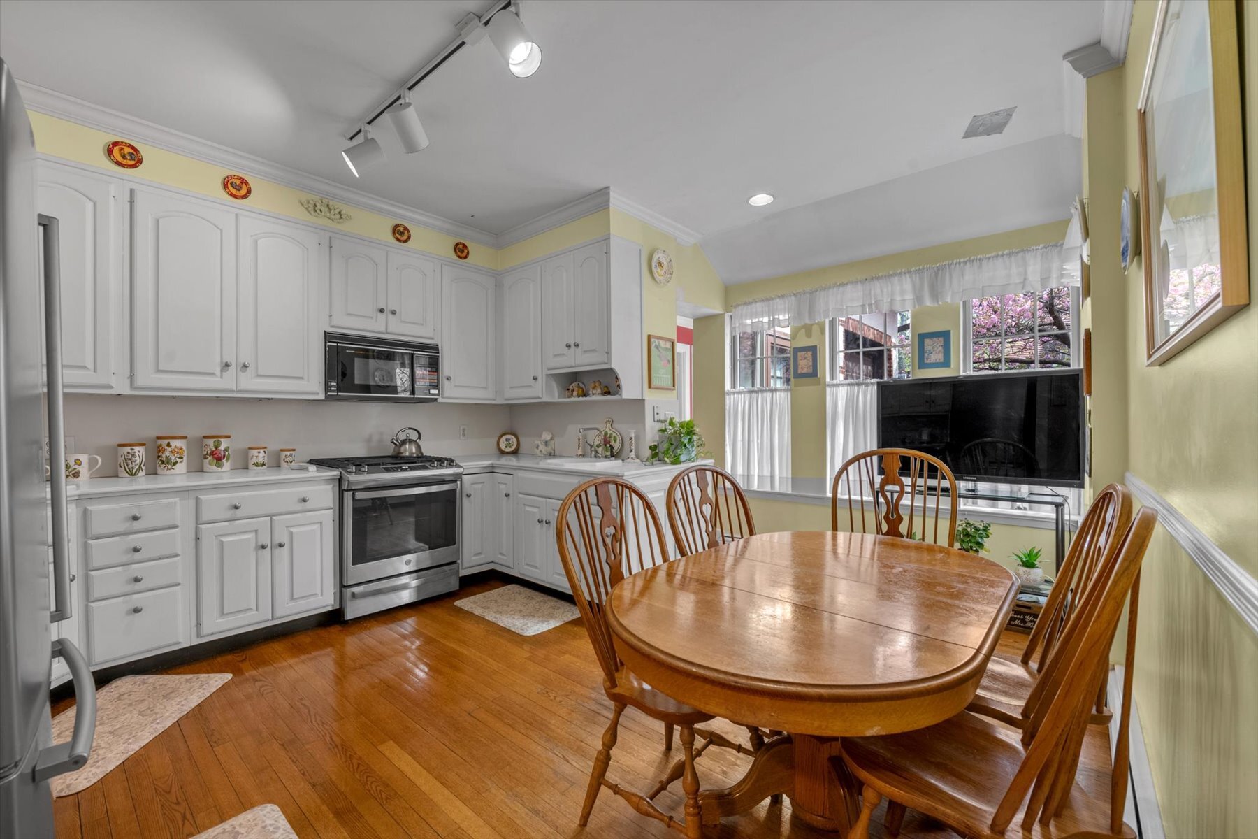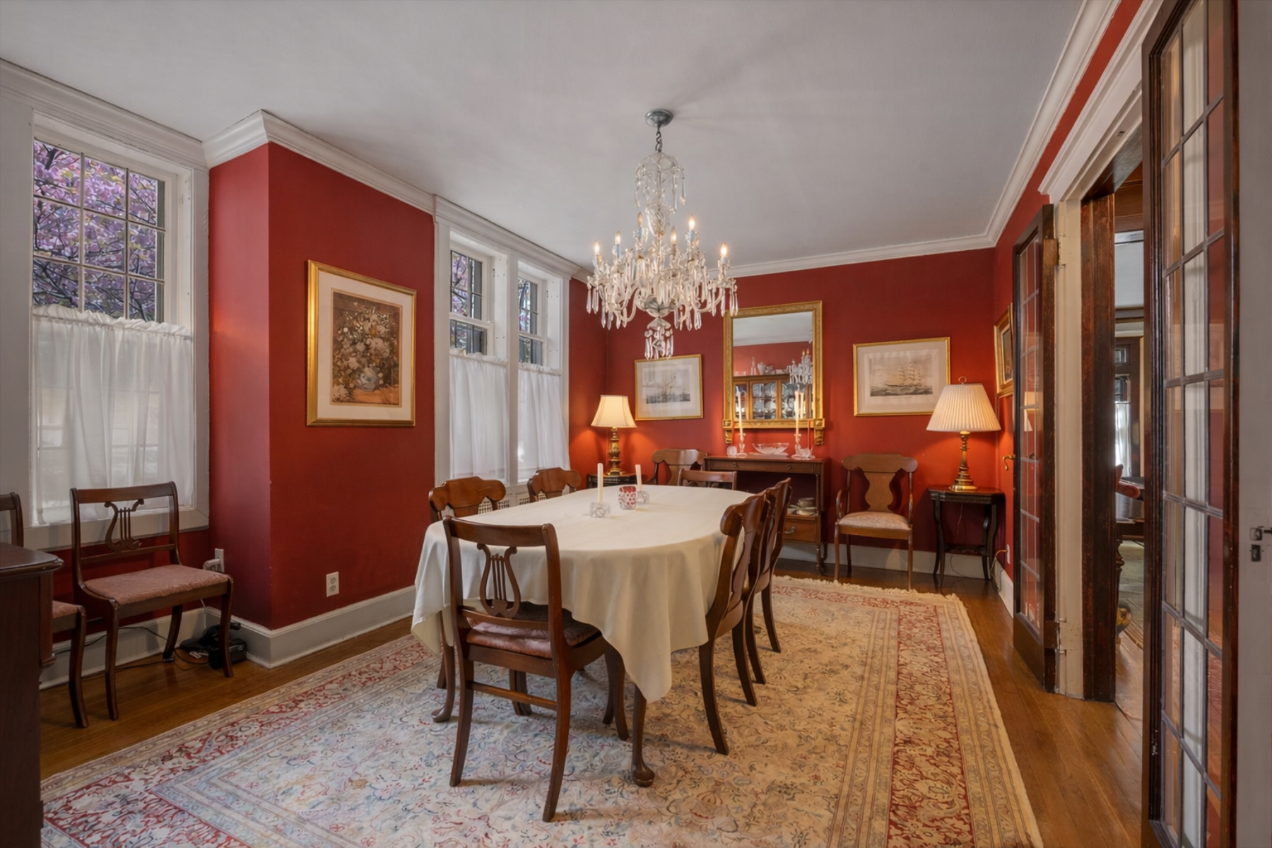 The home flows seamlessly into a bright, oversized dining room lined with windows perfect for hosting gatherings. A charming parlor room, convenient half bath, and a well-appointed kitchen that opens into a cozy TV den with direct garage access completes the main level. An additional door off the kitchen leads to a spacious driveway accommodating three to four vehicles, offering both convenience and flexibility, and provides a convenient second entrance to the home.