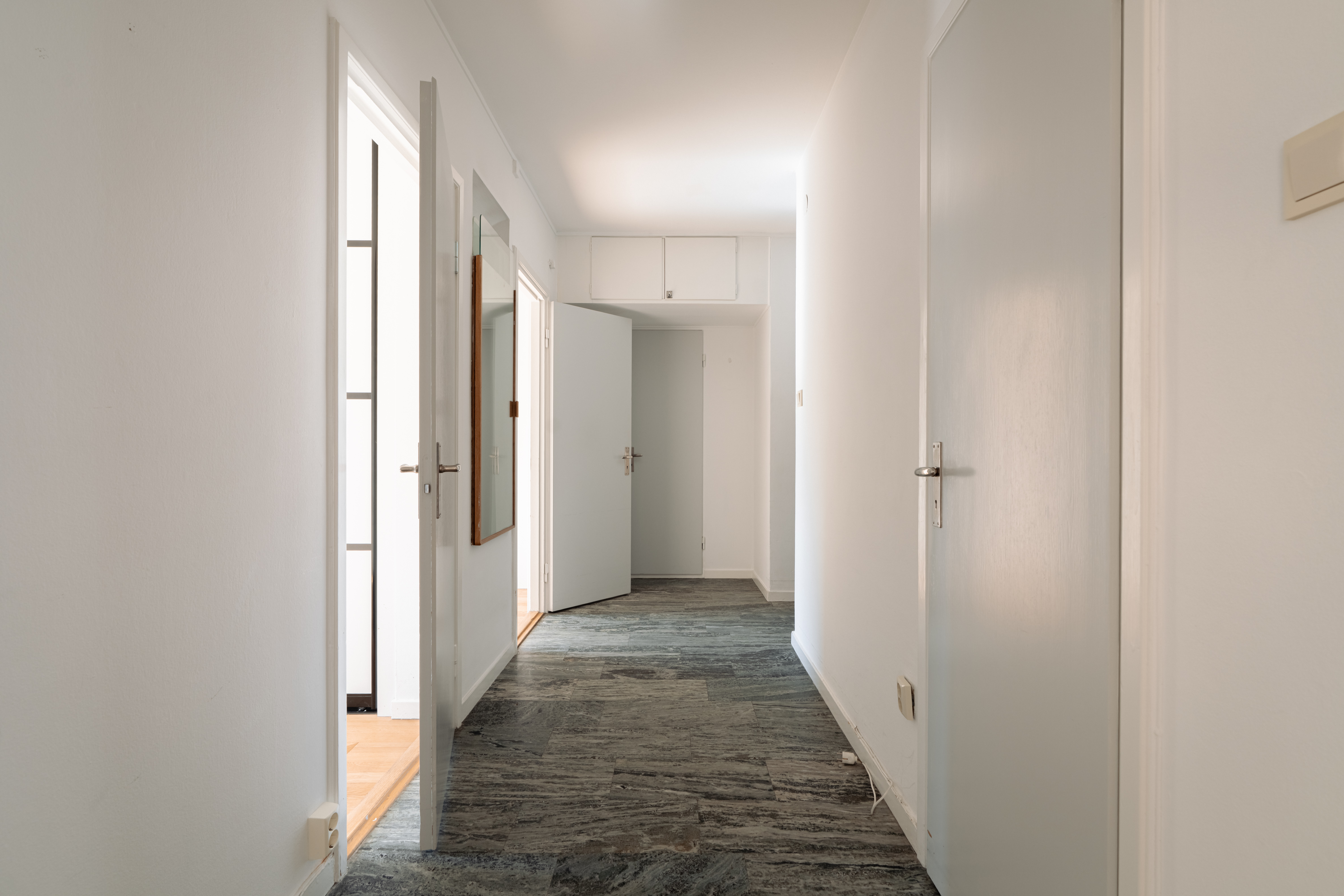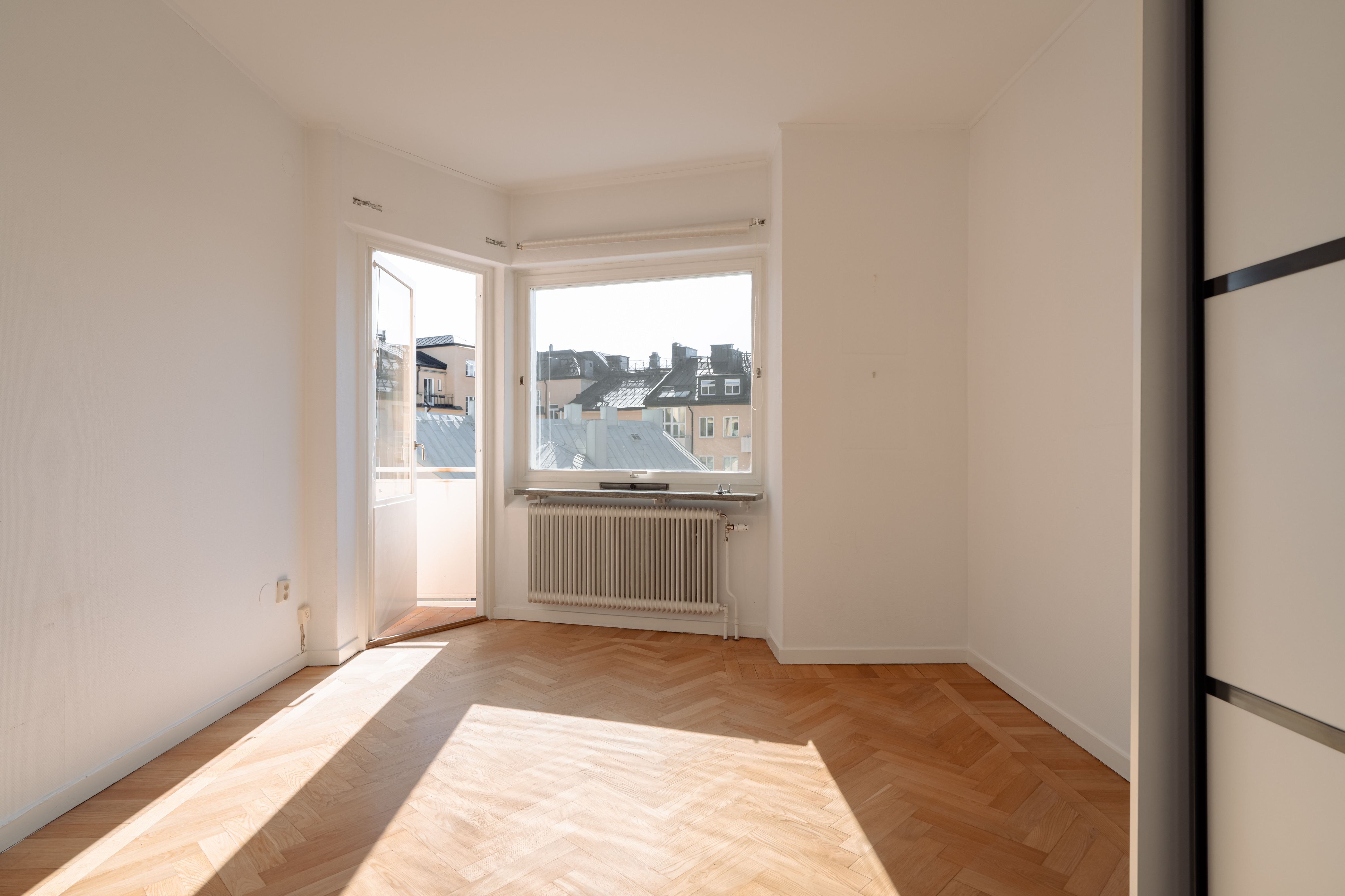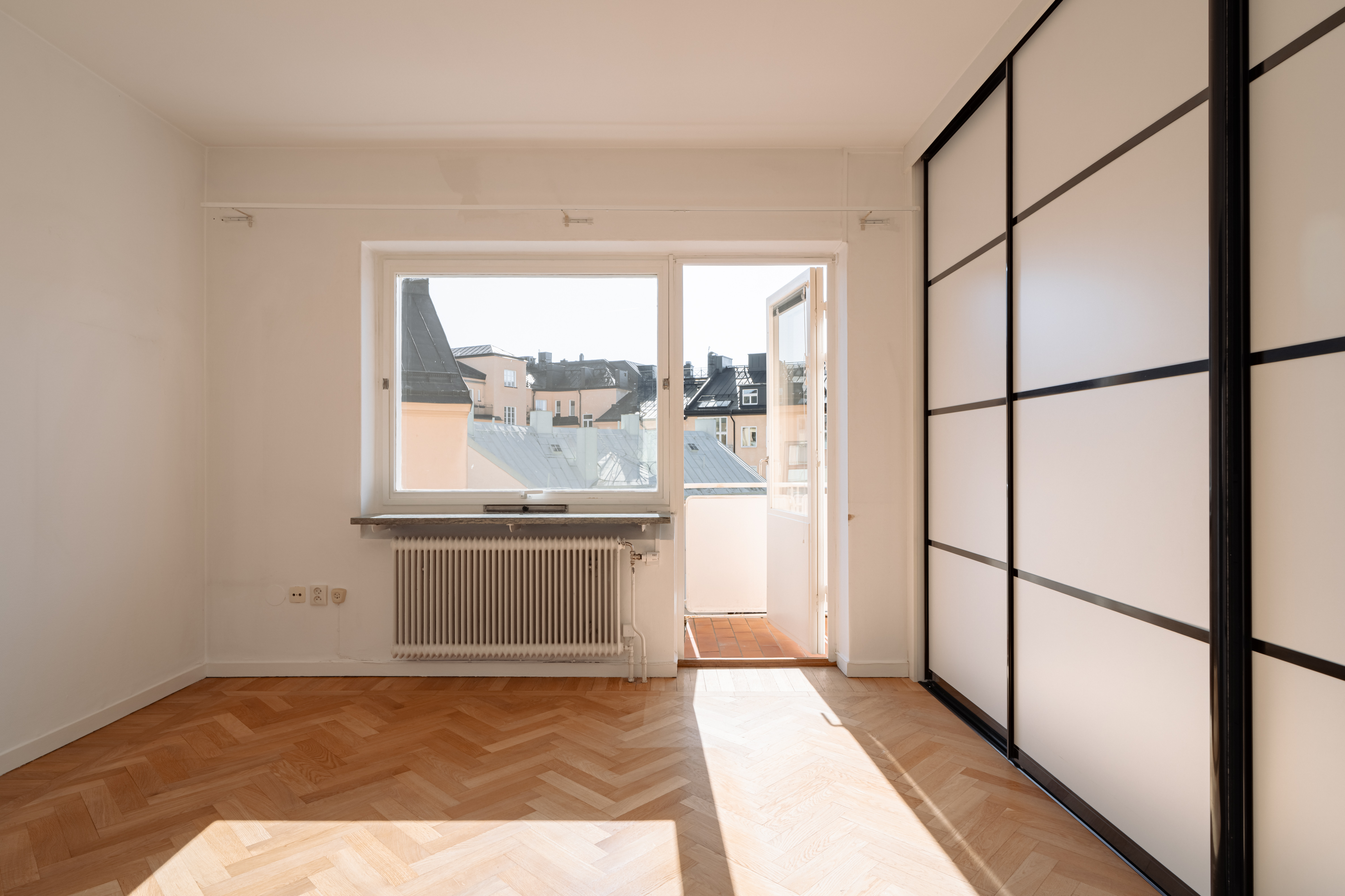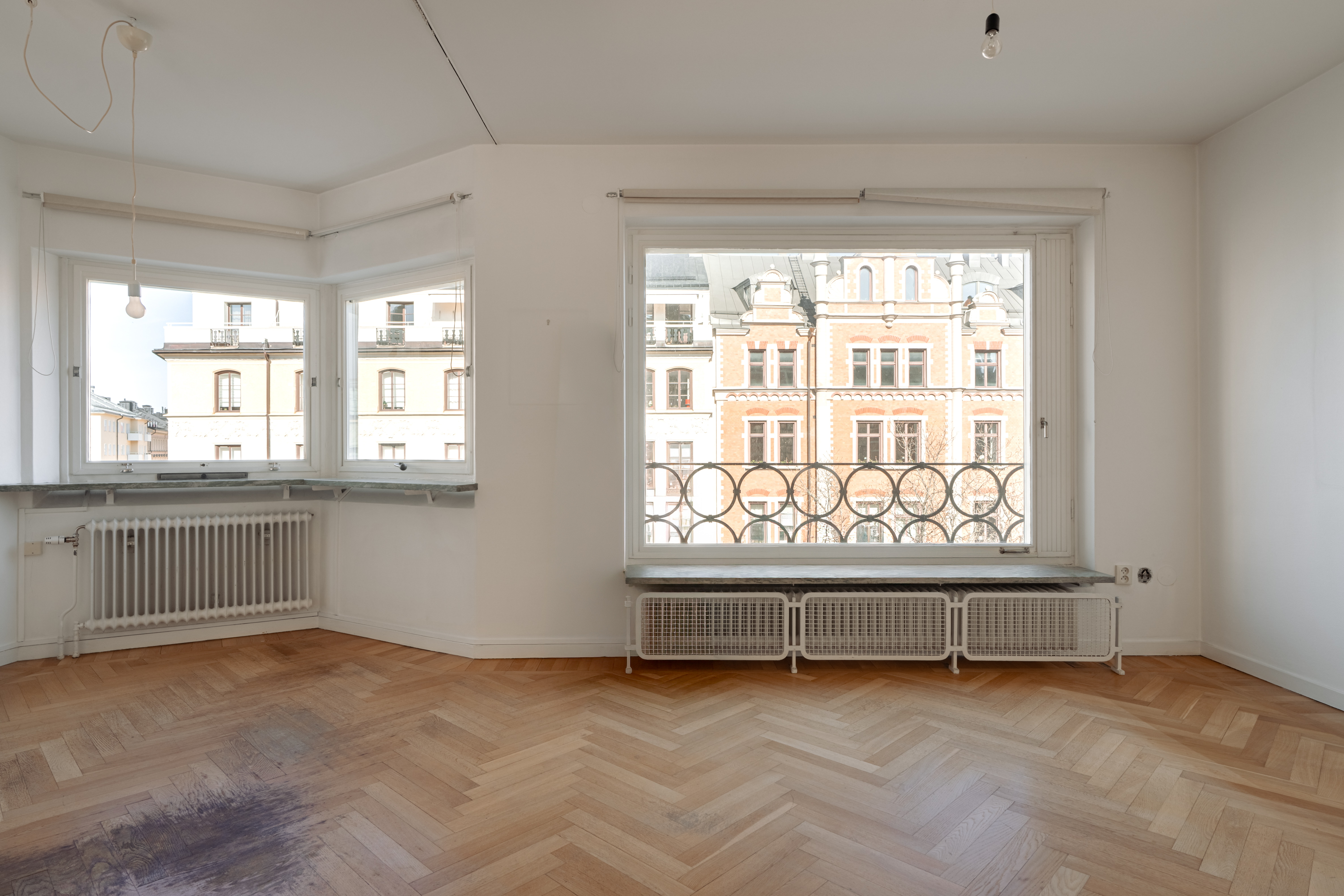 Large, low-set windows and a bay window facing Karlaplan provide an abundance of natural light.