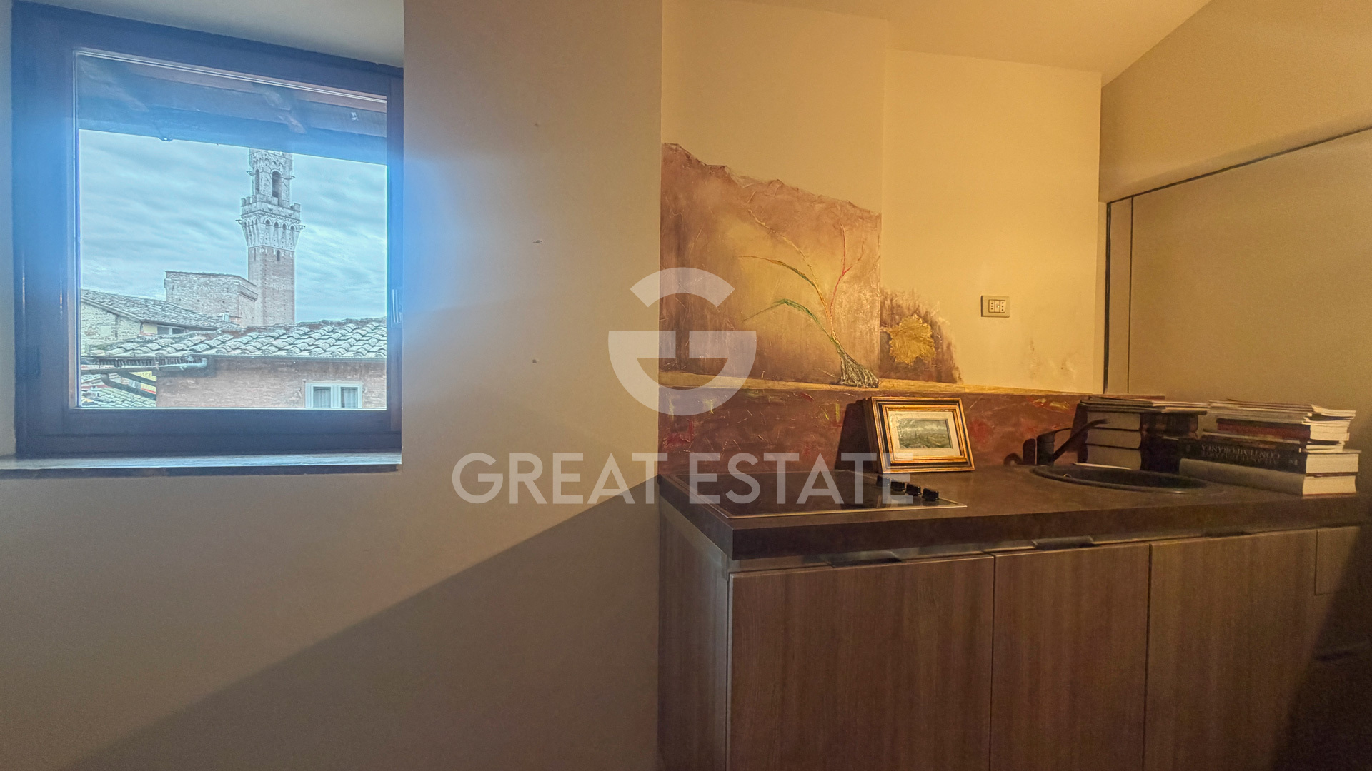 Located on the top floor, served by an elevator, of one of the most ancient palaces in Siena, this charming apartment is arranged over two levels.On the fourth floor is the main residence, composed of a spacious and bright living room, from which there is access to two double bedrooms and two bathrooms, one of which has a window. Completing this level is a generous living area, easily adaptable as a third bedroom, and a kitchen with a captivating view of the Torre del Mangia.On the fifth floor there is a large and luminous study, with the possibility of creating an additional bathroom, thanks to the existing plumbing connections already in place.The property also includes a private parking space, included in the sale price.Currently, the apartment is almost completely unfurnished, with the exception of a small and modern kitchen, thus offering the opportunity to customize the spaces according to individual needs.The images presented include solutions created with the aid of artificial intelligence, in order to showcase the potential and the various ways the interiors can be utilized.