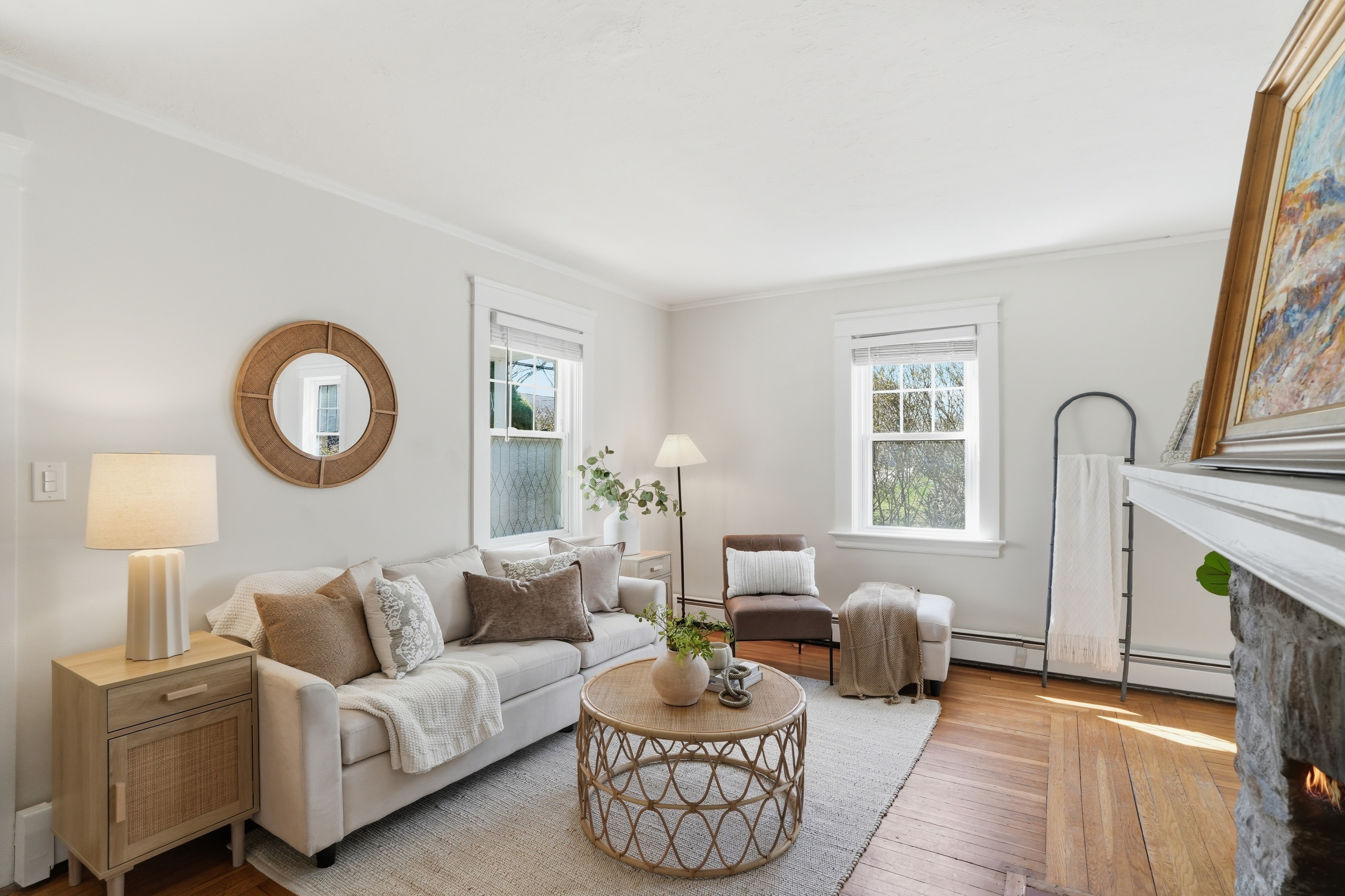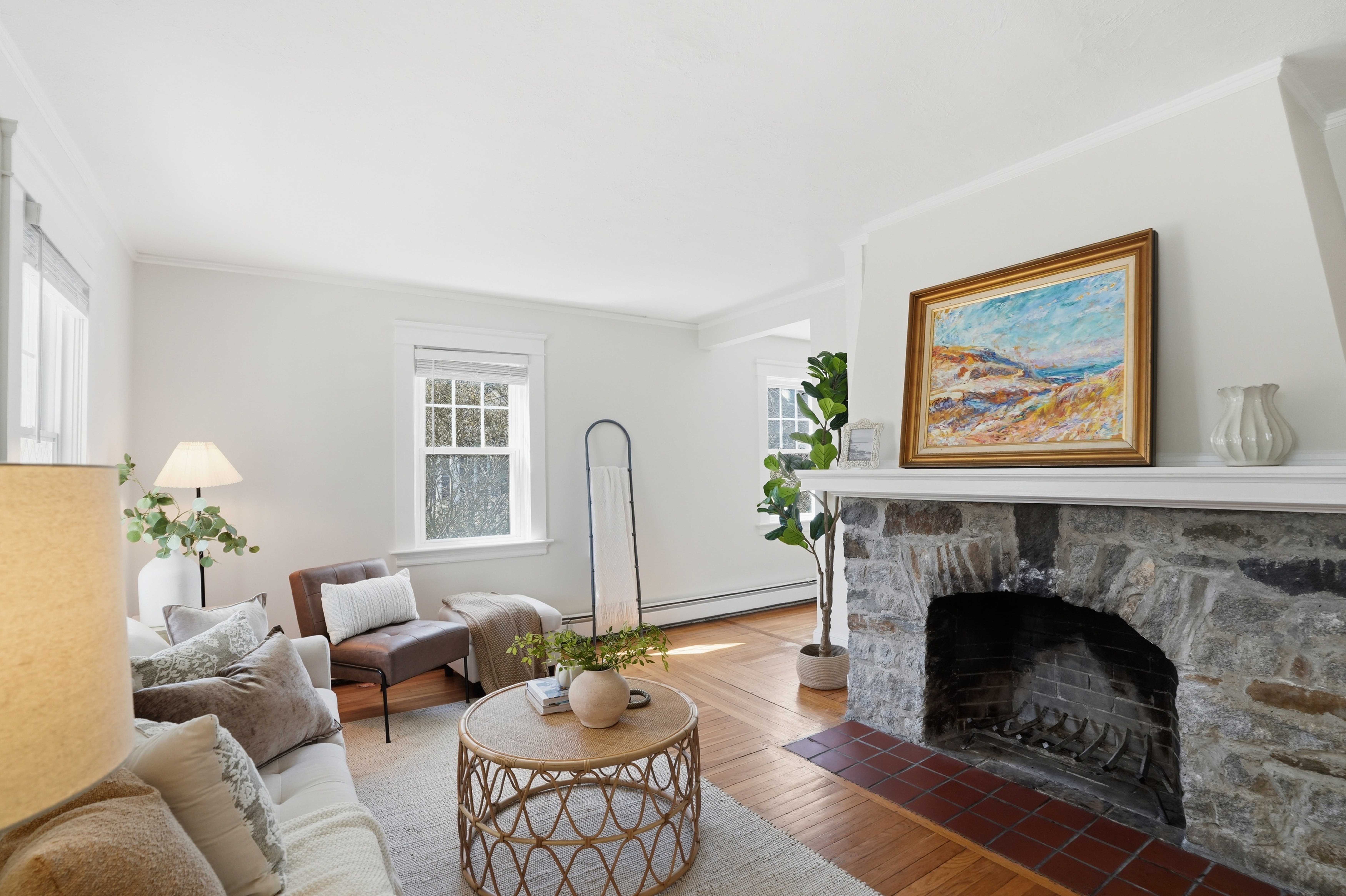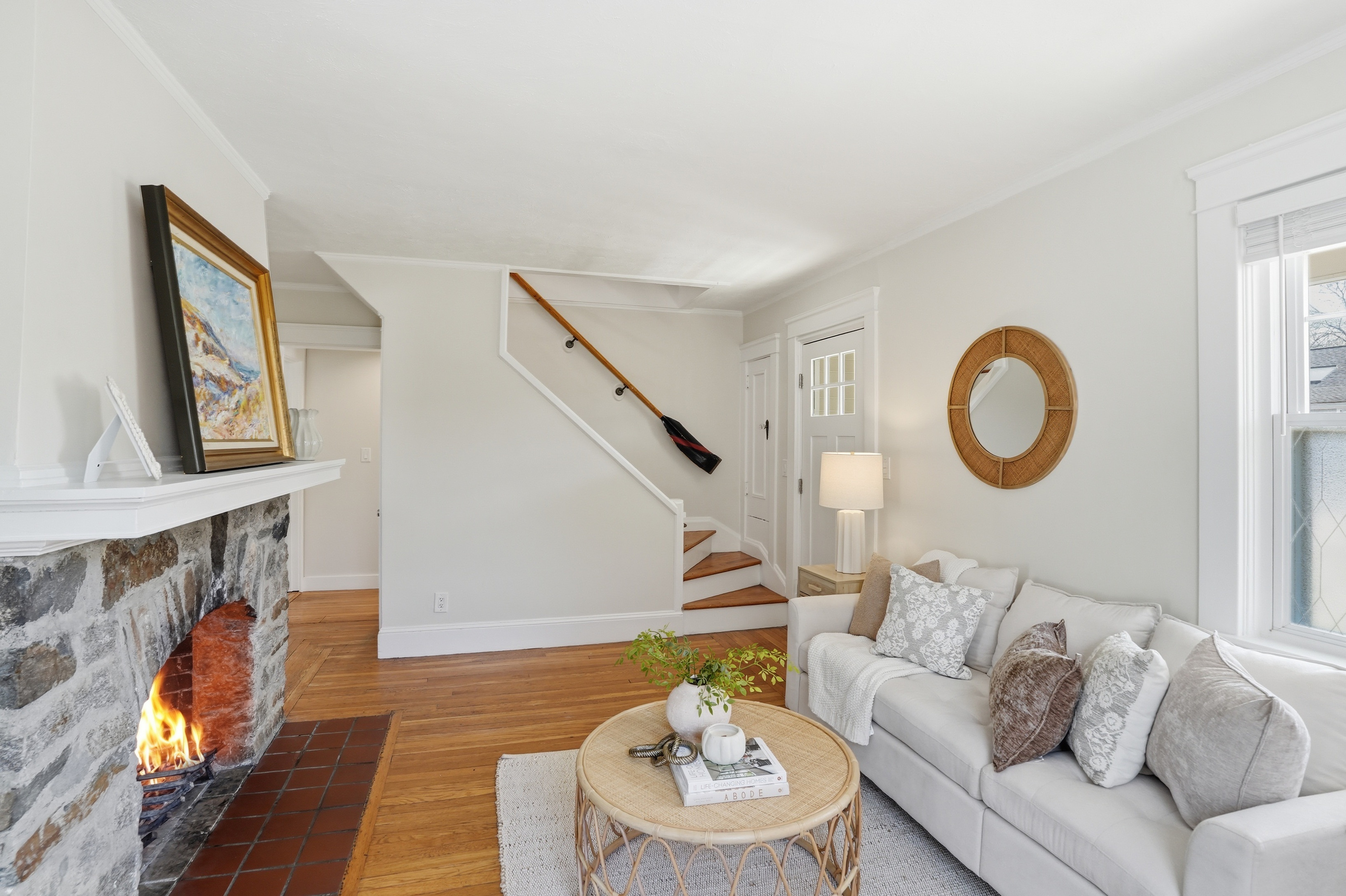 Welcome to a charming Cape offering impressive flexibility and value! This well-kept, much-loved residence features a spacious fenced yard abutting woodland, as well as a fully heated, 228 sq ft finished cottage with a full bath. Step onto the inviting front porch and into a living room anchored by a gorgeous stone fireplace. Gleaming hardwoods set the stage on the first floor, which includes a bedroom, full bath, and a versatile small room perfect as a large walk-in closet, office, or dressing room. The stylish kitchen is full of character and function, with a drop-down desk, stained glass, breakfast nook, and plentiful cabinetry. The rear family room boasts a vaulted ceiling, abundant natural light, and lovely views of the backyard, deck, and cottage. Upstairs, discover two additional bedrooms and an upper landing ideal for relaxing, reading, or studying. Charming nautical touches include an oar handrail, porthole window, and an adorable bedroom with hammocks. The full bath features a jacuzzi tub. The large unfinished basement is ideal for storage, a workshop, recreation room, gym, or office. The renovated cottage, complete with hidden drop-down beds and a modern bath, is ideal for a home office, guest space, au pair suite, or in-law area. This beloved home radiates warmth from the moment you arrive. Thoughtful details, exceptional functionality, and an ideal location near Primrose Hill School, the East Bay Bike Path, and Riverside shops make this property a true home run.