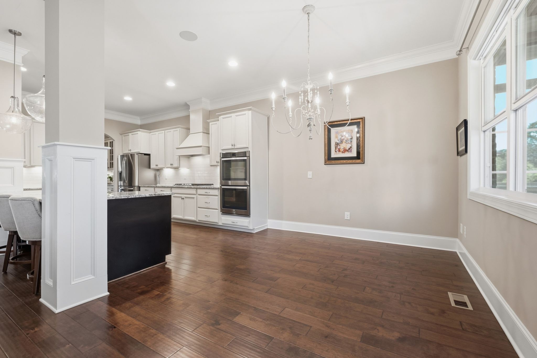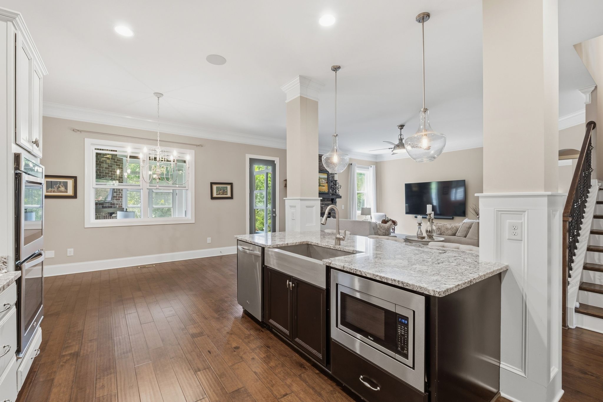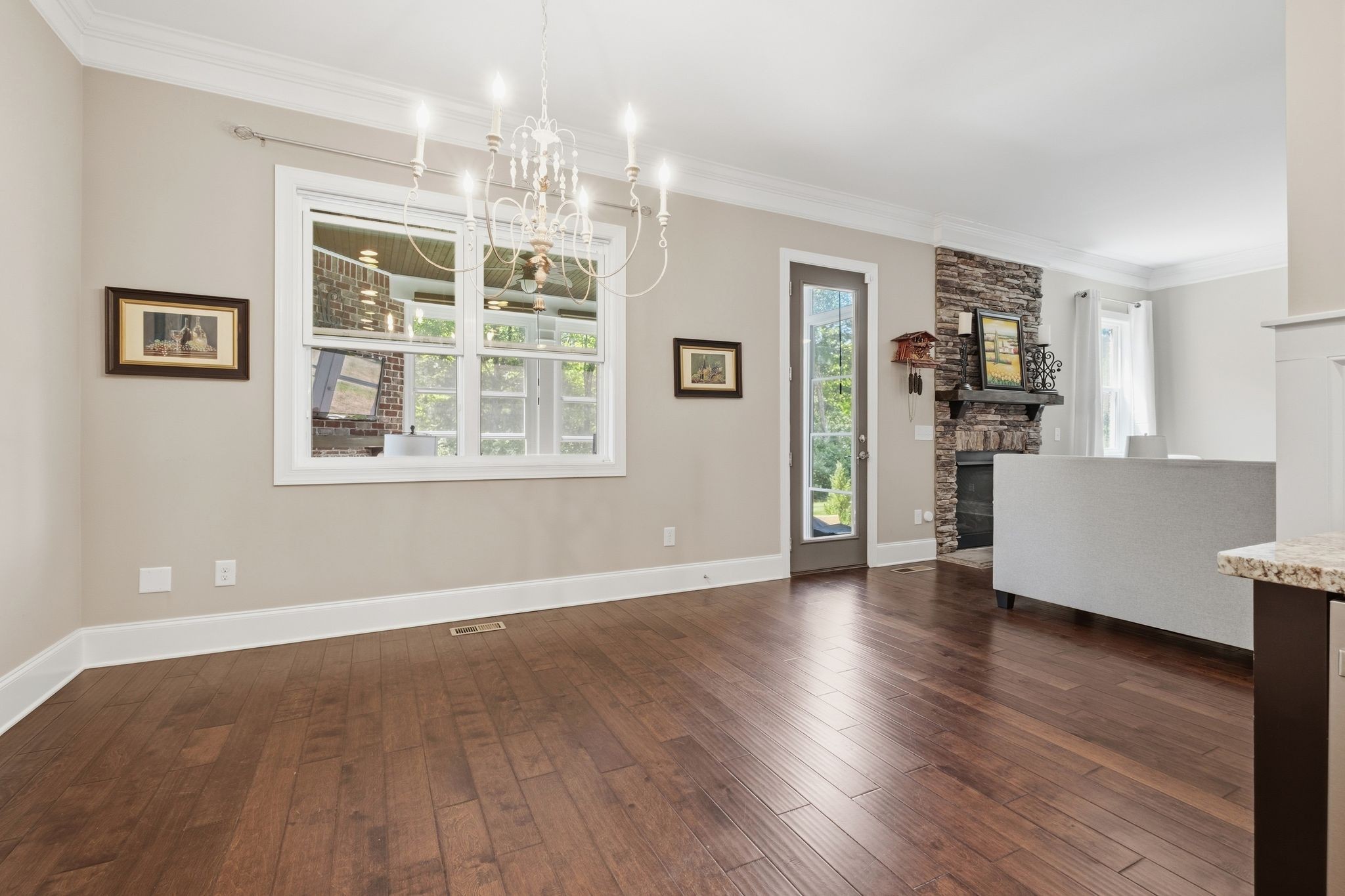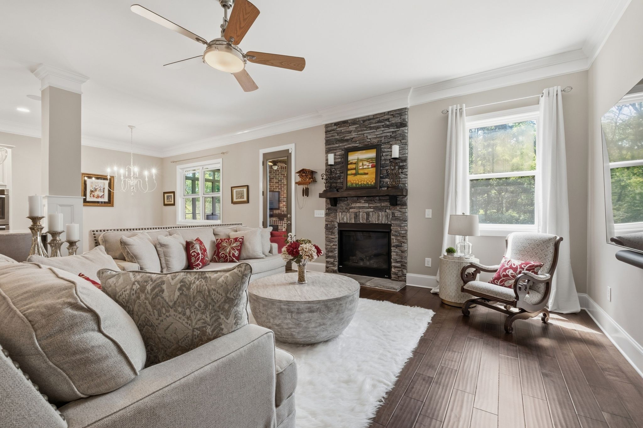 Full brick home situated on a level lot with a wooded backdrop, offering privacy and a peacefulsetting. This well-designed floor plan features two bedrooms on the main level, including aspacious Owner’s Suite and a secondary bedroom ideal for a nursery or multigenerational living,each with its own bath.The open-concept kitchen flows seamlessly into the family room and showcases white cabinetry,a butler’s pantry, and a large walk-in pantry, creating both functionality and storage. Upstairsincludes two additional bedrooms, a dedicated office, and an expansive bonus room with a walk-in closet, along with excellent attic access for additional storage.Enjoy year-round comfort in the sunroom featuring a brick fireplace with gas logs, with windowsthat open to easily convert the space into a screened porch.The three-car garage offers exceptional storage capacity, including multiple loft storage systems,and is well-suited for larger vehicles or boat storage.This home combines flexible living spaces, ample storage, and a private setting in a practical andinviting layout.