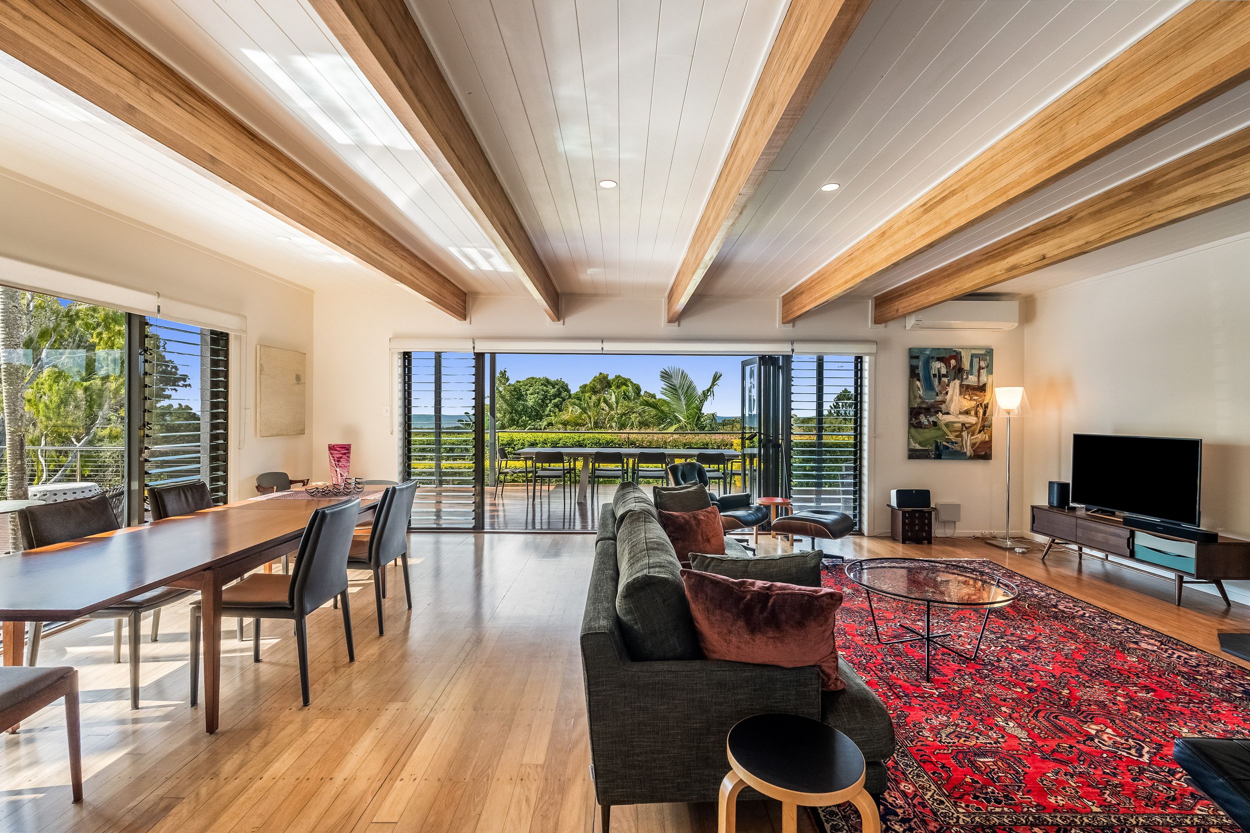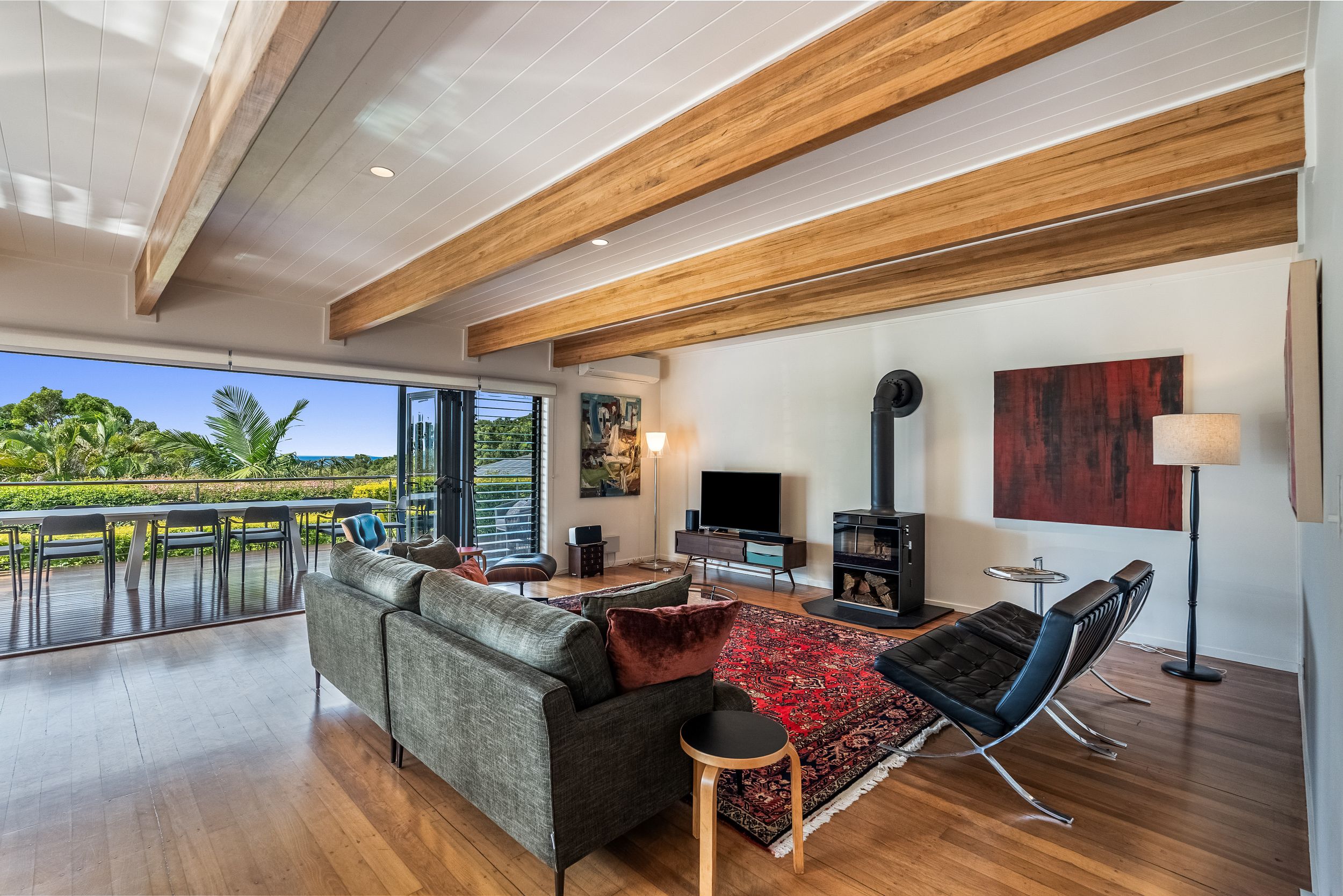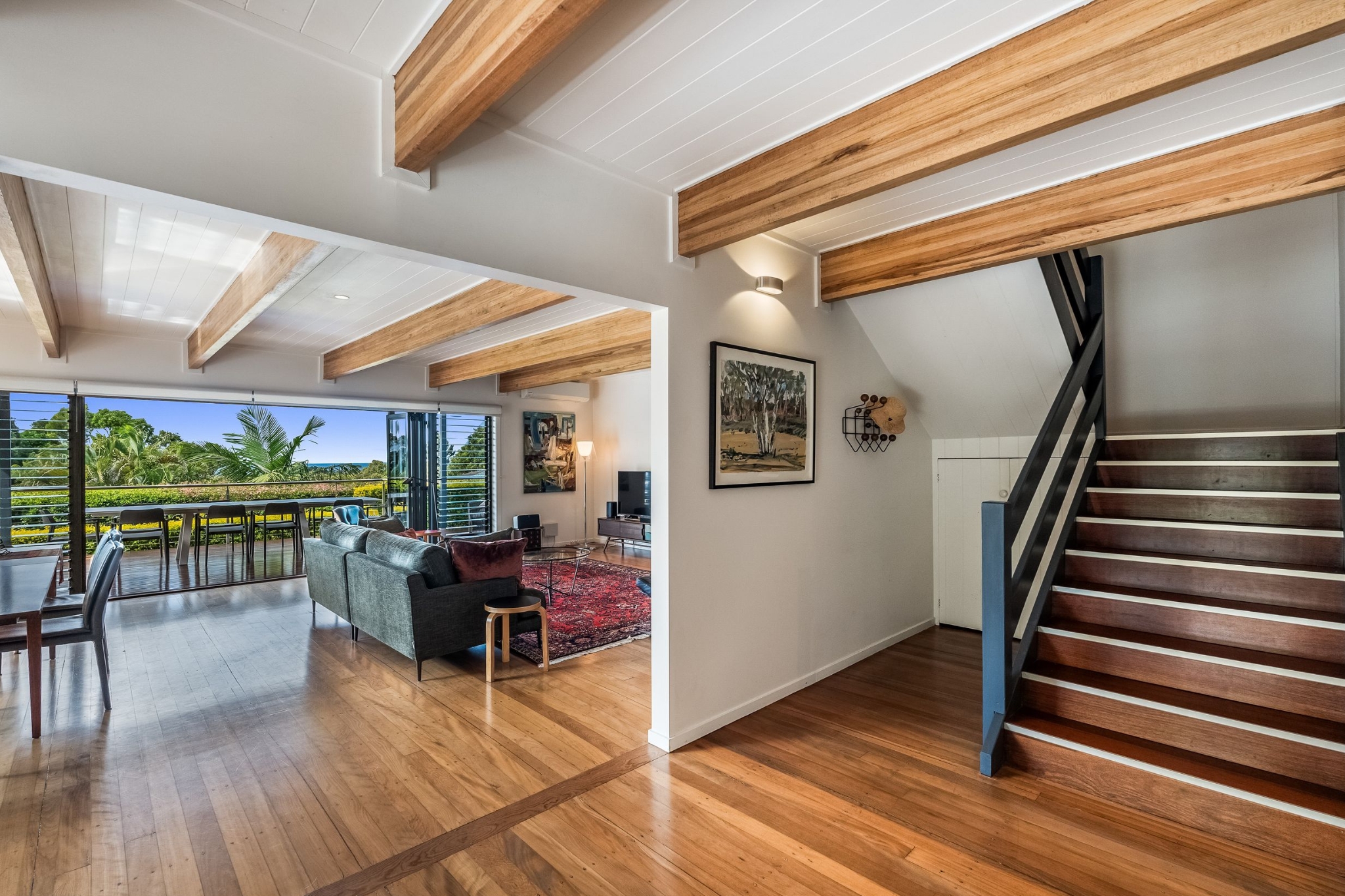 - Cathedral ceilings, exposed timber beams and polished timber flooring throughout