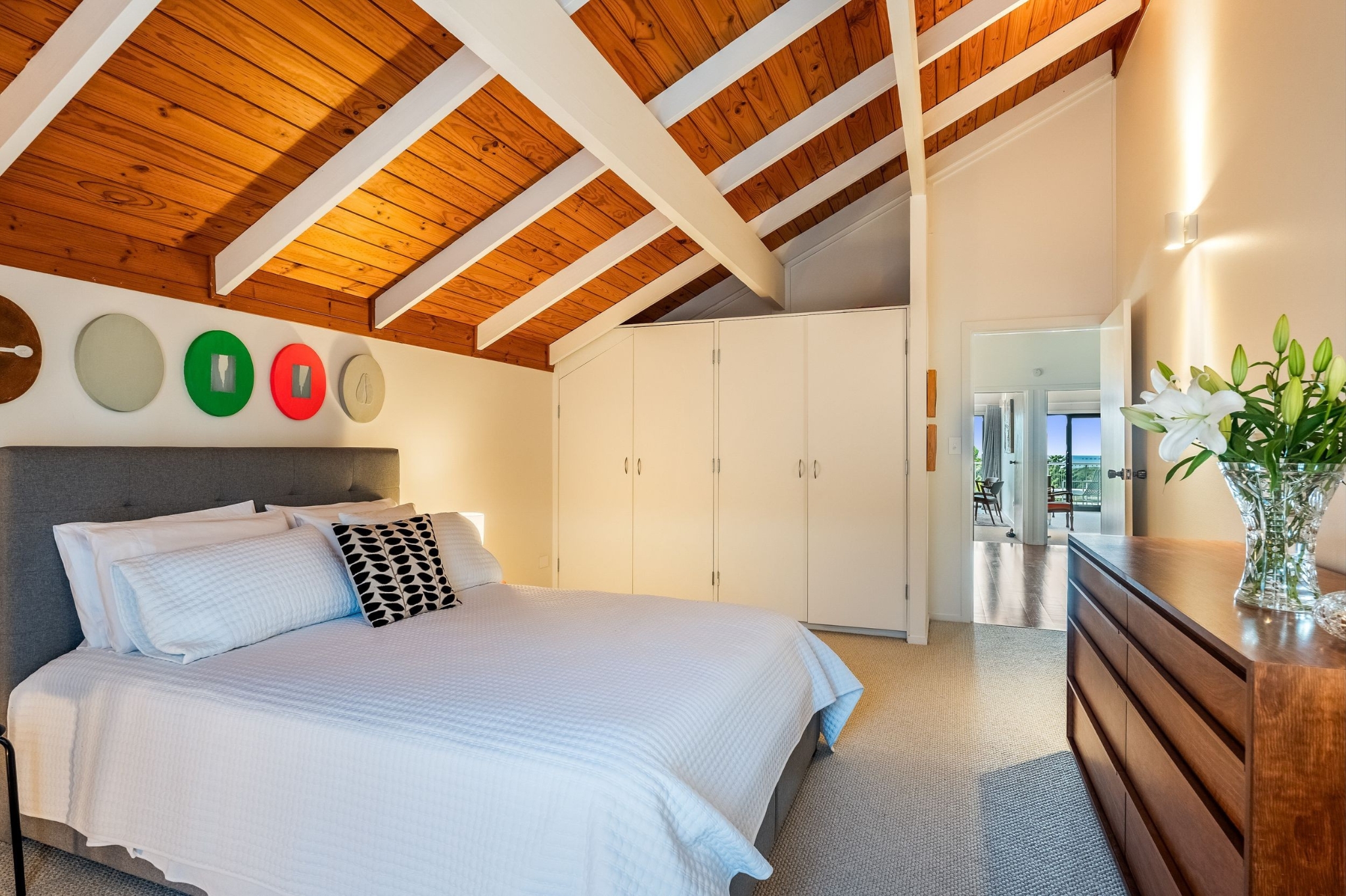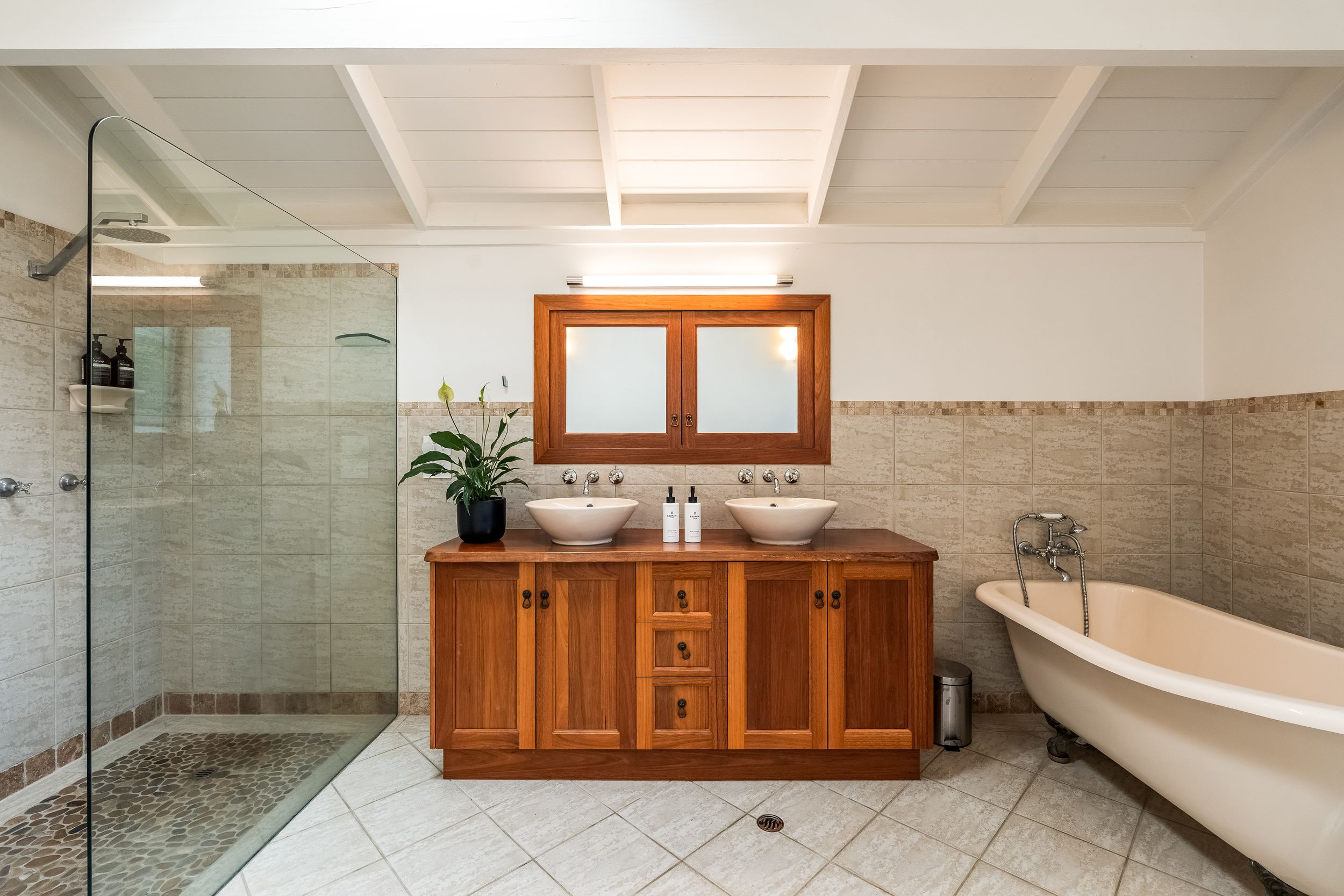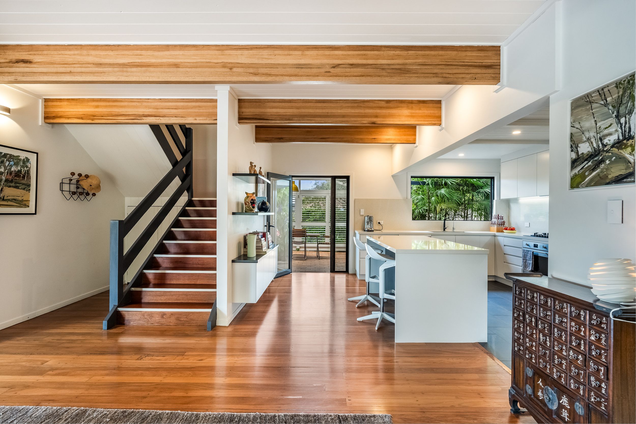 - Cathedral ceilings, exposed timber beams and polished timber flooring throughout