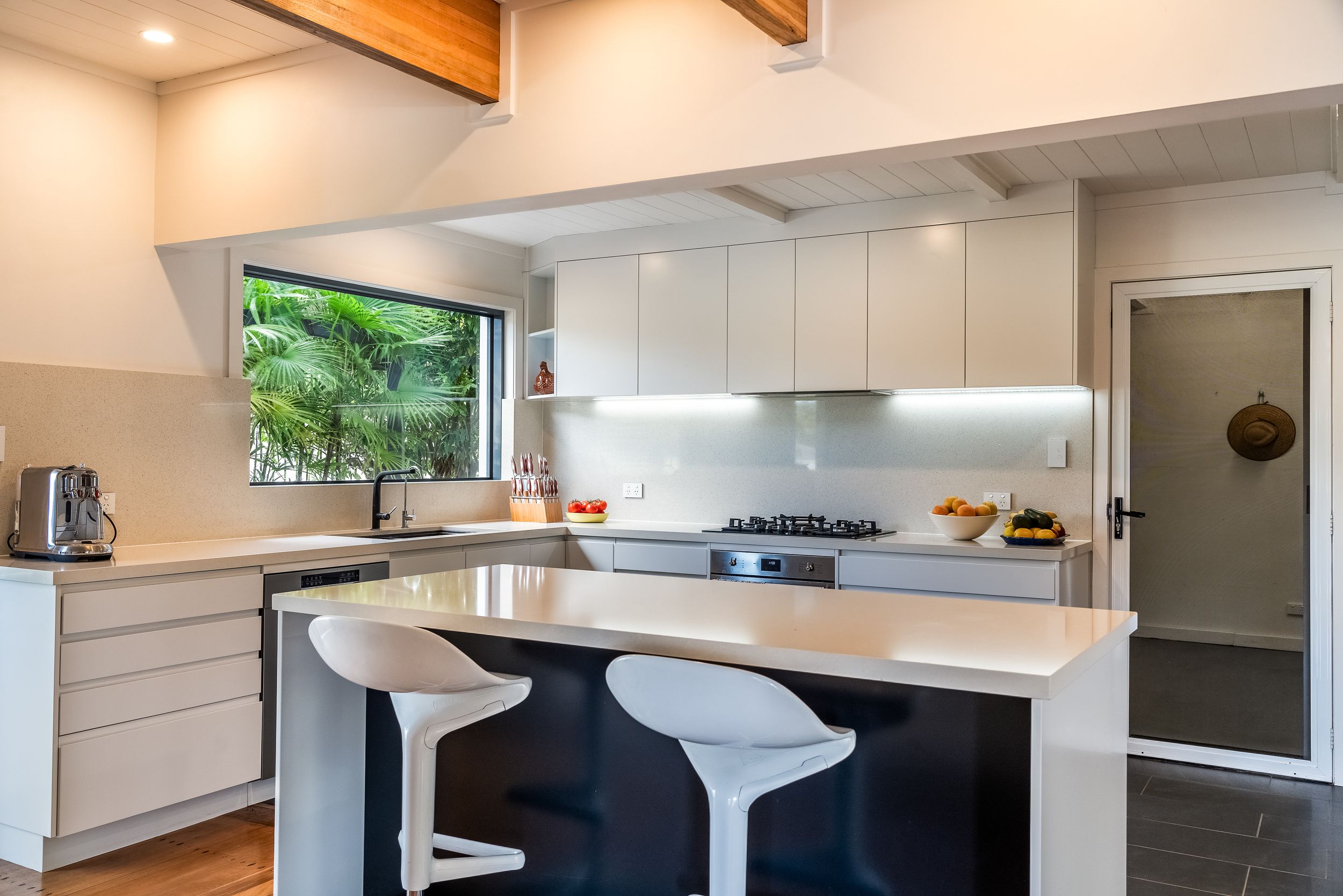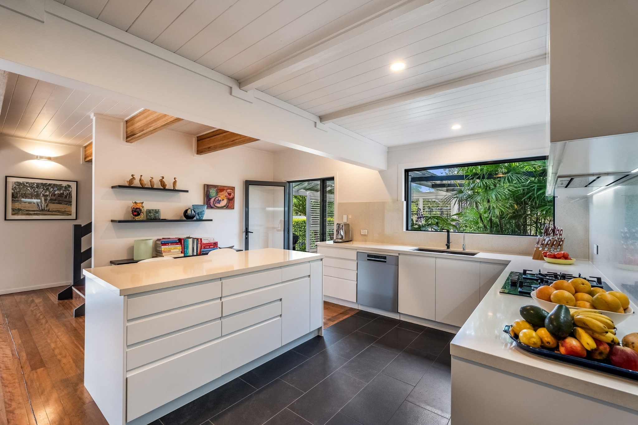 Defined by soaring cathedral ceilings, exposed timber beams and polished timber floors, the interiors are bathed in natural light and cooled by coastal breezes. The expansive ground level is designed for both everyday living and entertaining, with open-plan lounge and dining zones flowing effortlessly to covered decks, landscaped gardens and a solar-heated saltwater pool - with ocean views and relaxed, resort-style living. At the heart of the home, a beautifully appointed kitchen features stone benchtops, premium appliances including Smeg and Bosch, a Franke double sink, island bench and oversized pantry, seamlessly connecting to indoor and outdoor living spaces.
