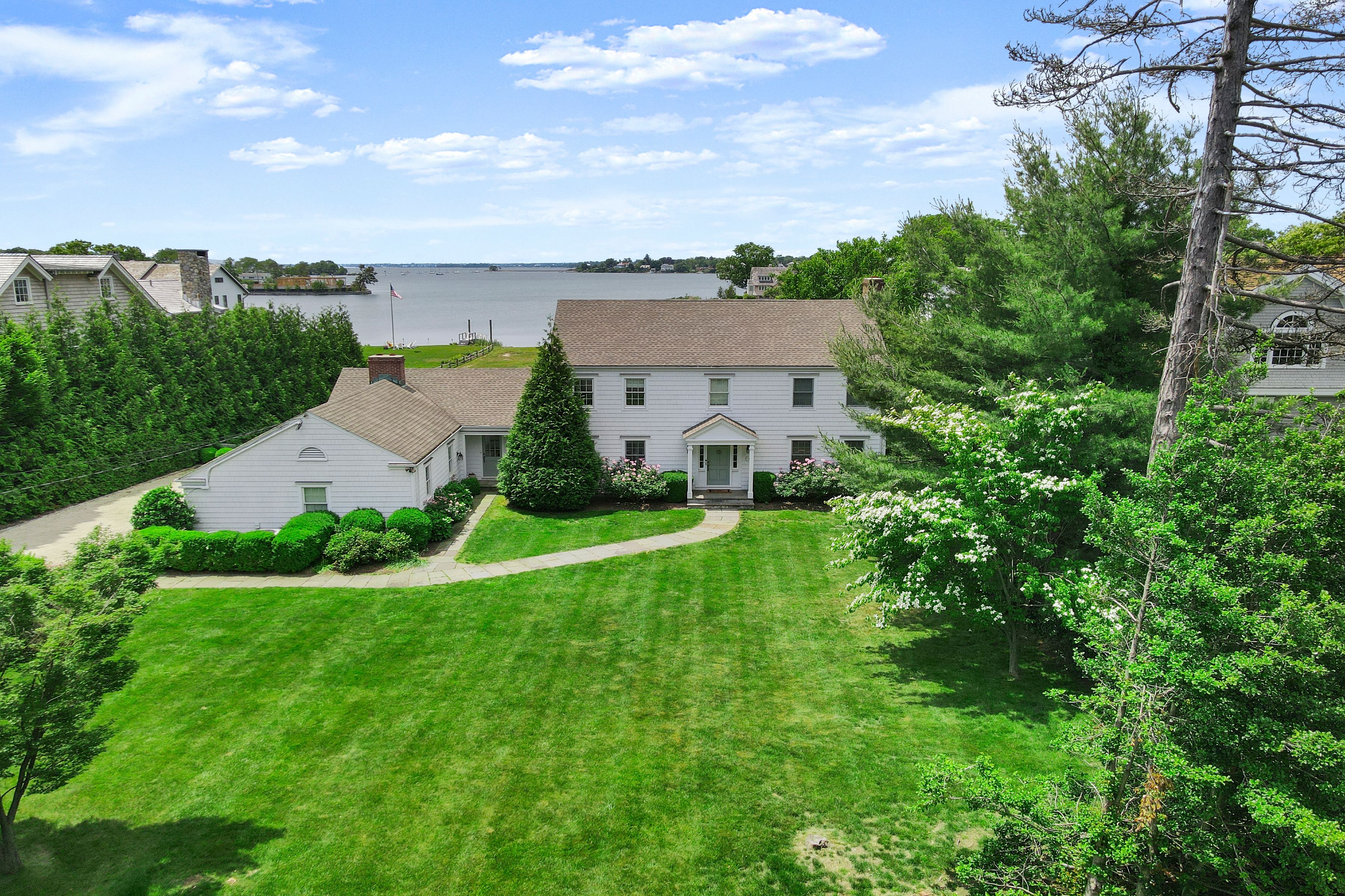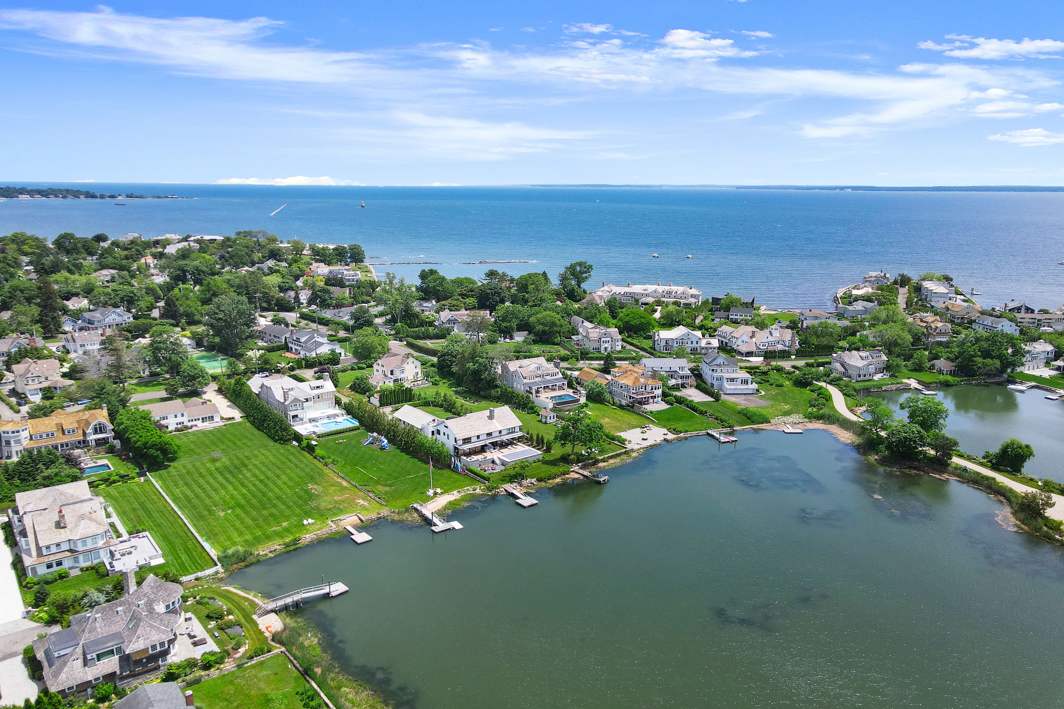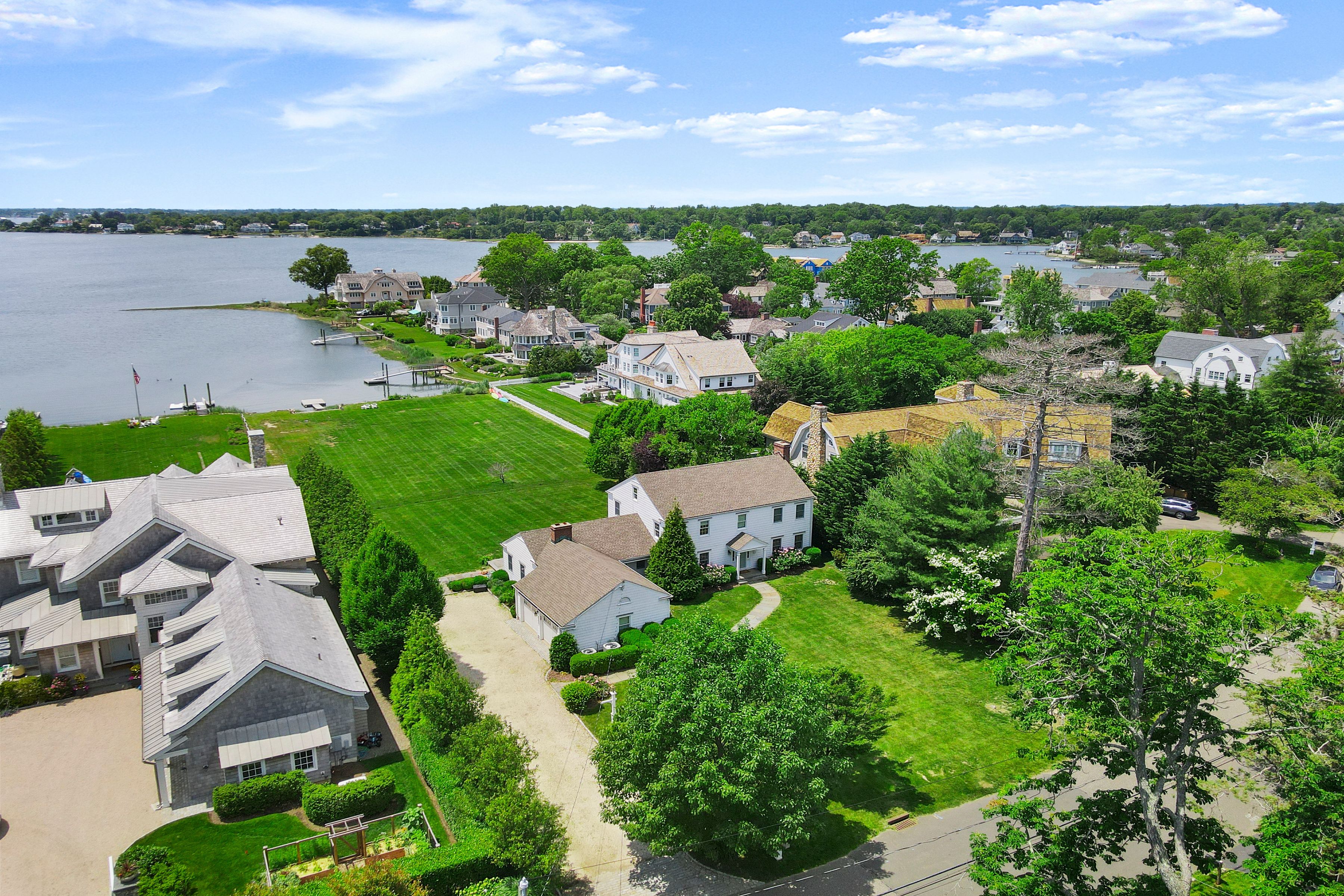 DIRECT WATERFRONT in OLD GREENWICH Enjoy western facing views and gorgeous sunsets on this expansive 1 ACRE property close to Greenwich Point, schools, train, and Village of OG. Enjoy year round carefree living at this updated 4 bedroom home. Open floor plan with spectacular natural light throughout. Spacious gourmet kitchen w/adjoining family room w/fireplace and French doors opening to the oversized soccer field size back yard directly to the water. A large Living room w/fireplace, lovely dining room and office on first floor complete this ideal family retreat. A perfect home and location! Owner pays for Landscaping. Updated dock pending approval.