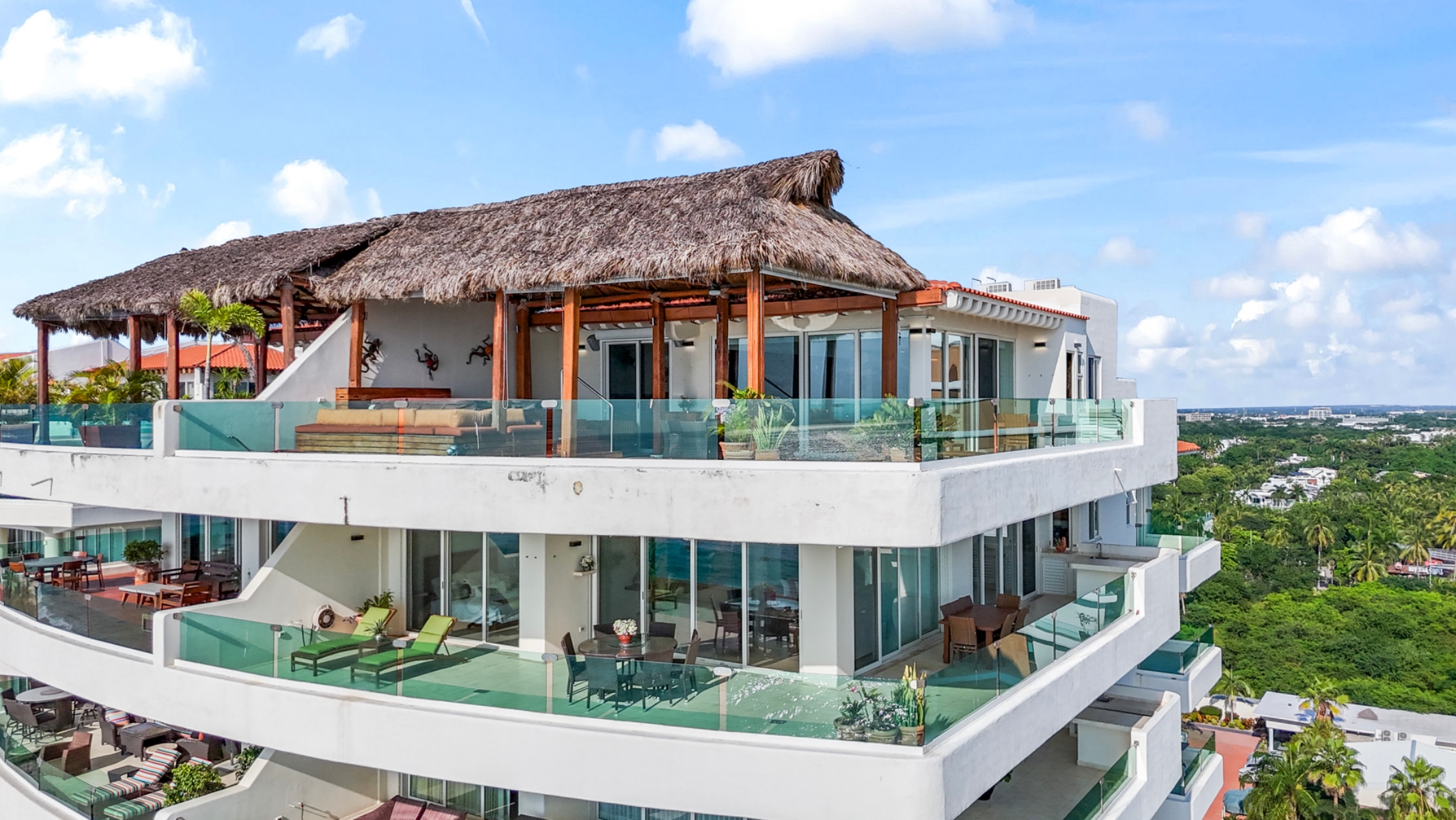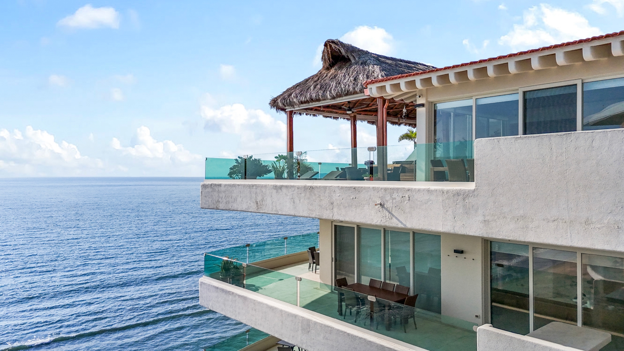 On the second level, you’ll find the main master suite with a full bathroom and closet, as well as a living room, dining area, and kitchen, plus a small additional bedroom for children or extra guests. The most attractive feature of the residence is undoubtedly the rooftop terrace, complete with a palapa, private jacuzzi, dining area, and lounge space—perfect for relaxing while enjoying sunsets and the fireworks that light up the bay during festive occasions.