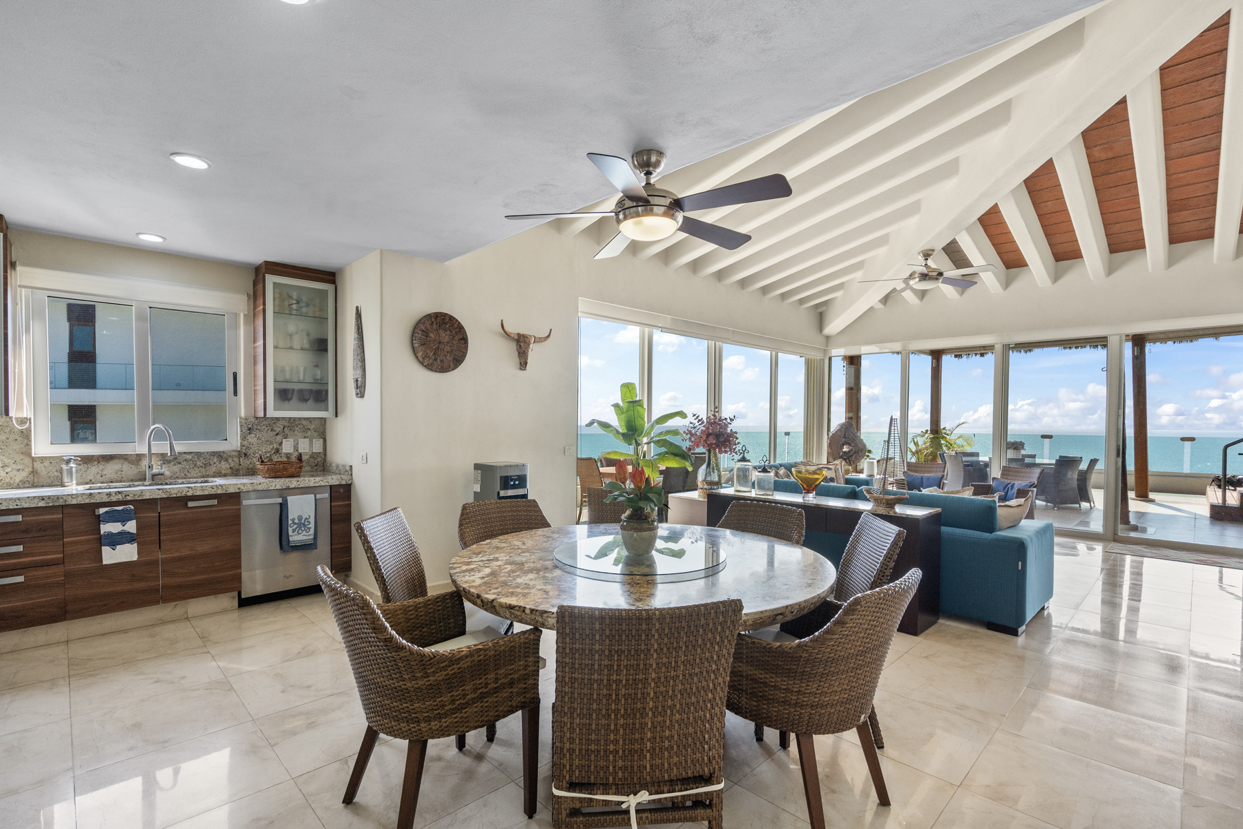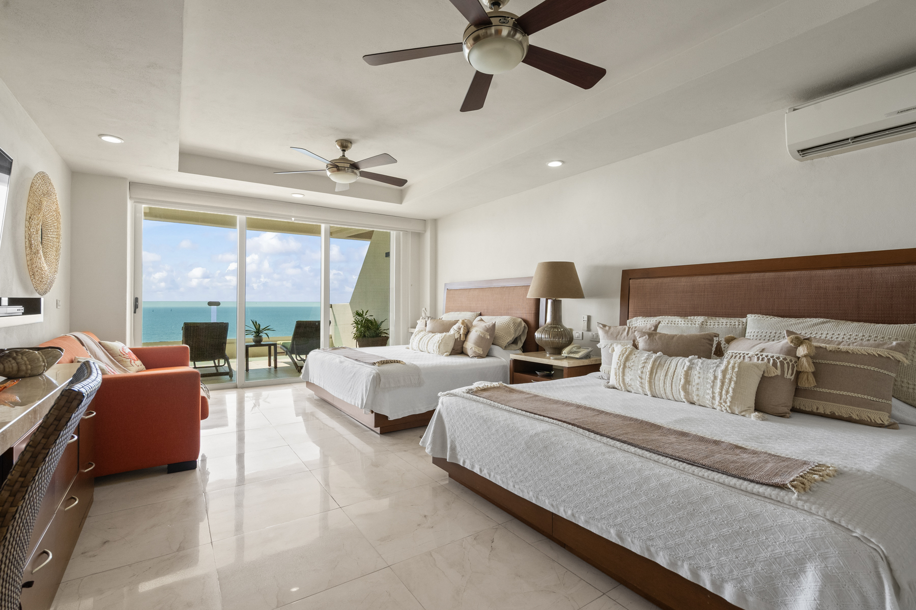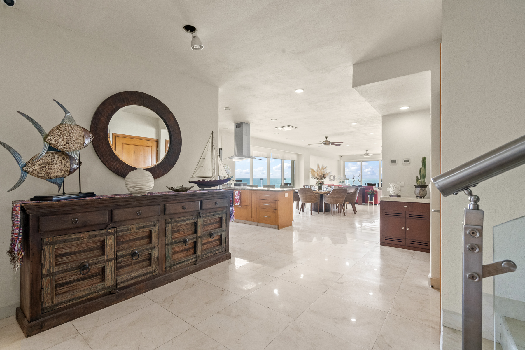 With a spacious and versatile layout, the residence features 5 bedrooms distributed across two levels, comfortably accommodating groups or families of up to 8 adults—making it an ideal option for premium stays in Riviera Nayarit.