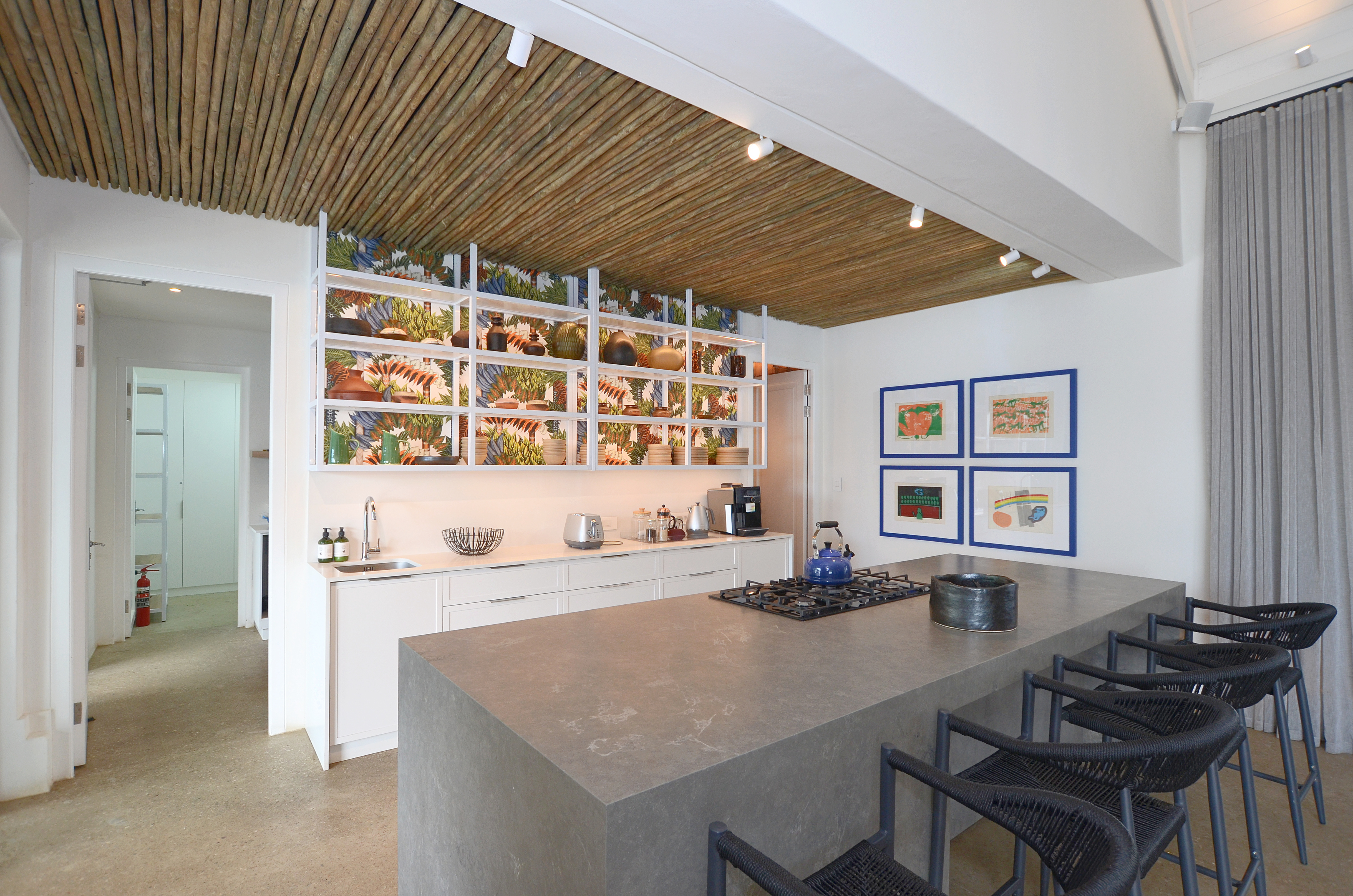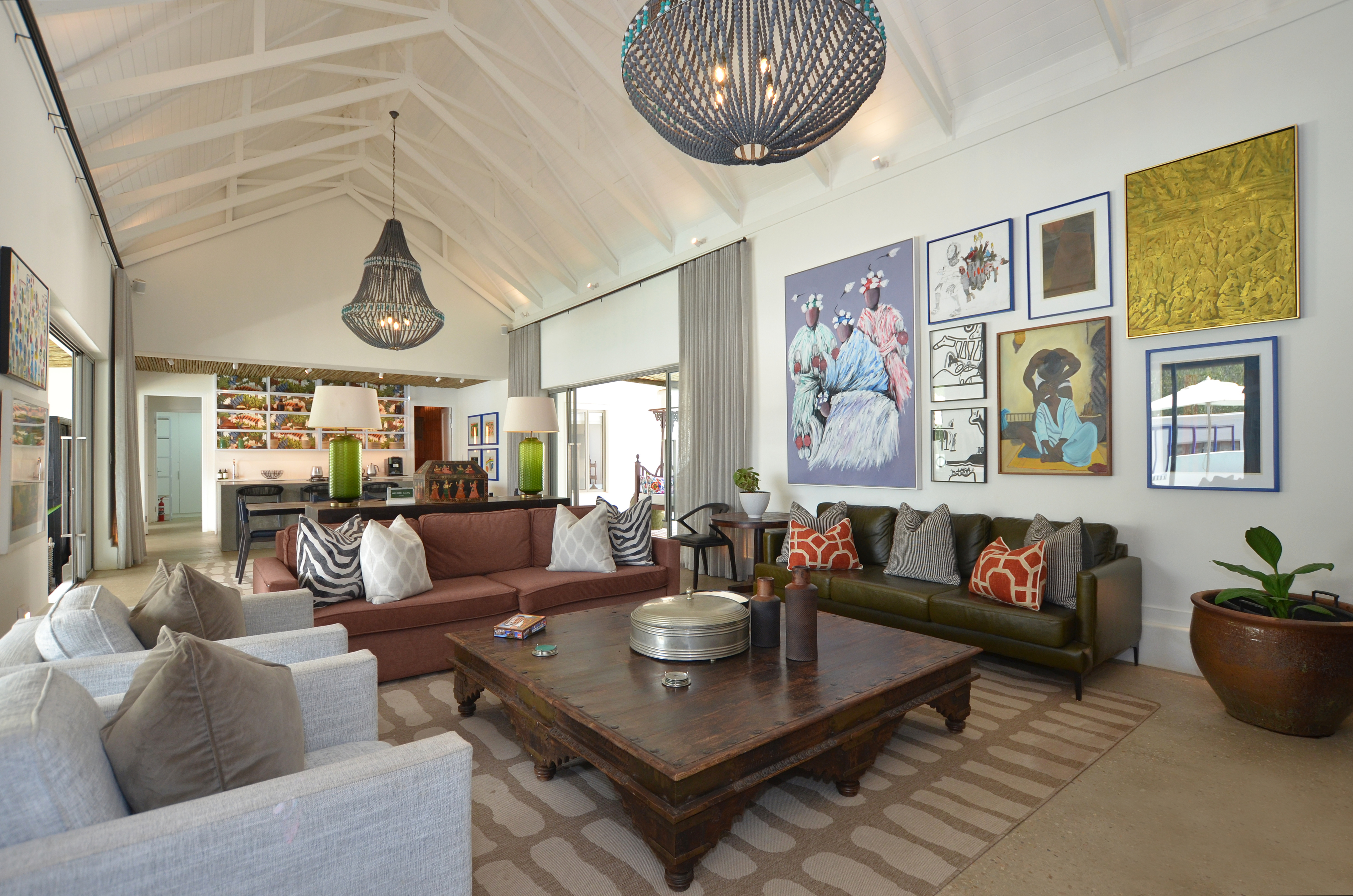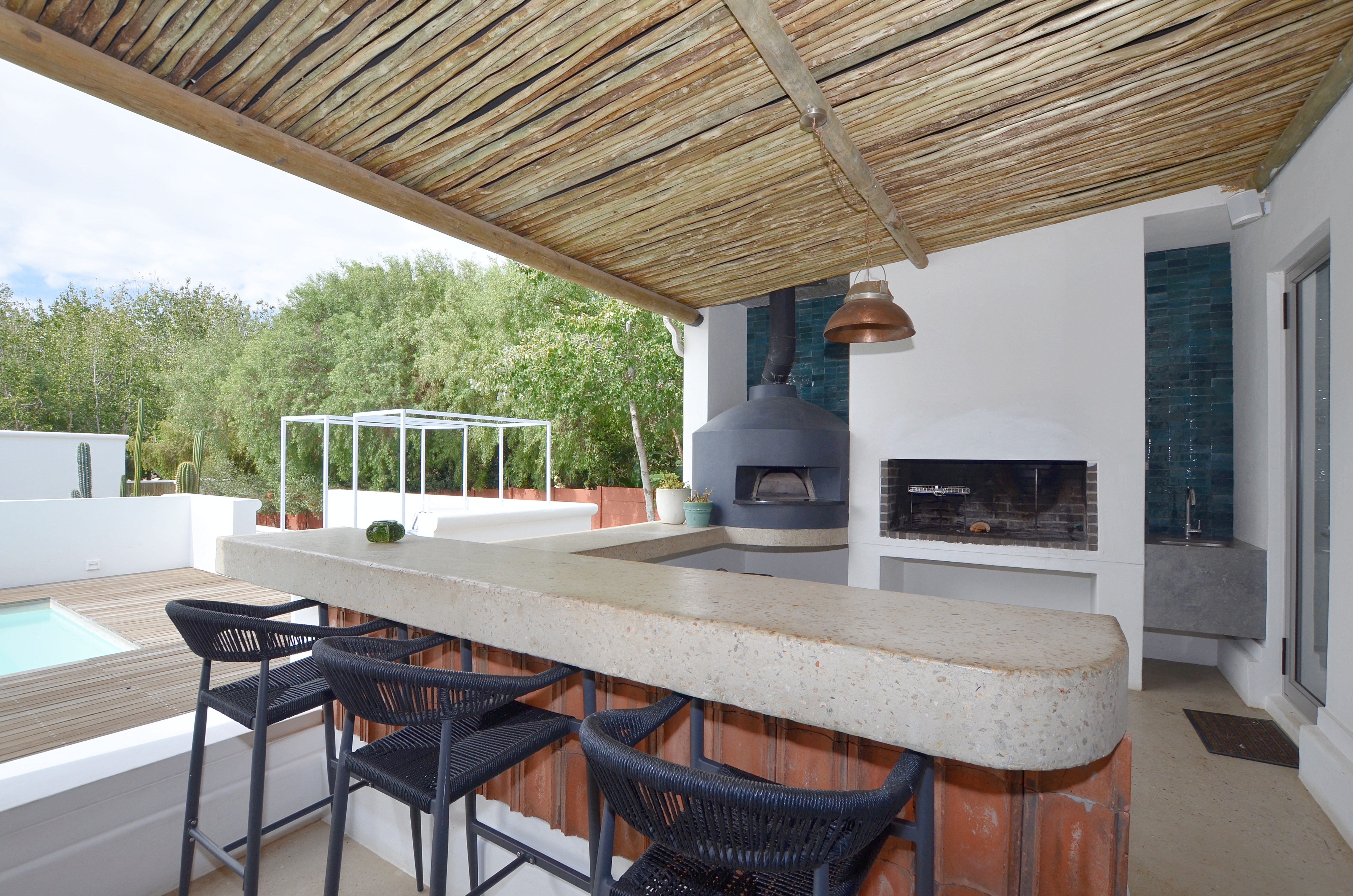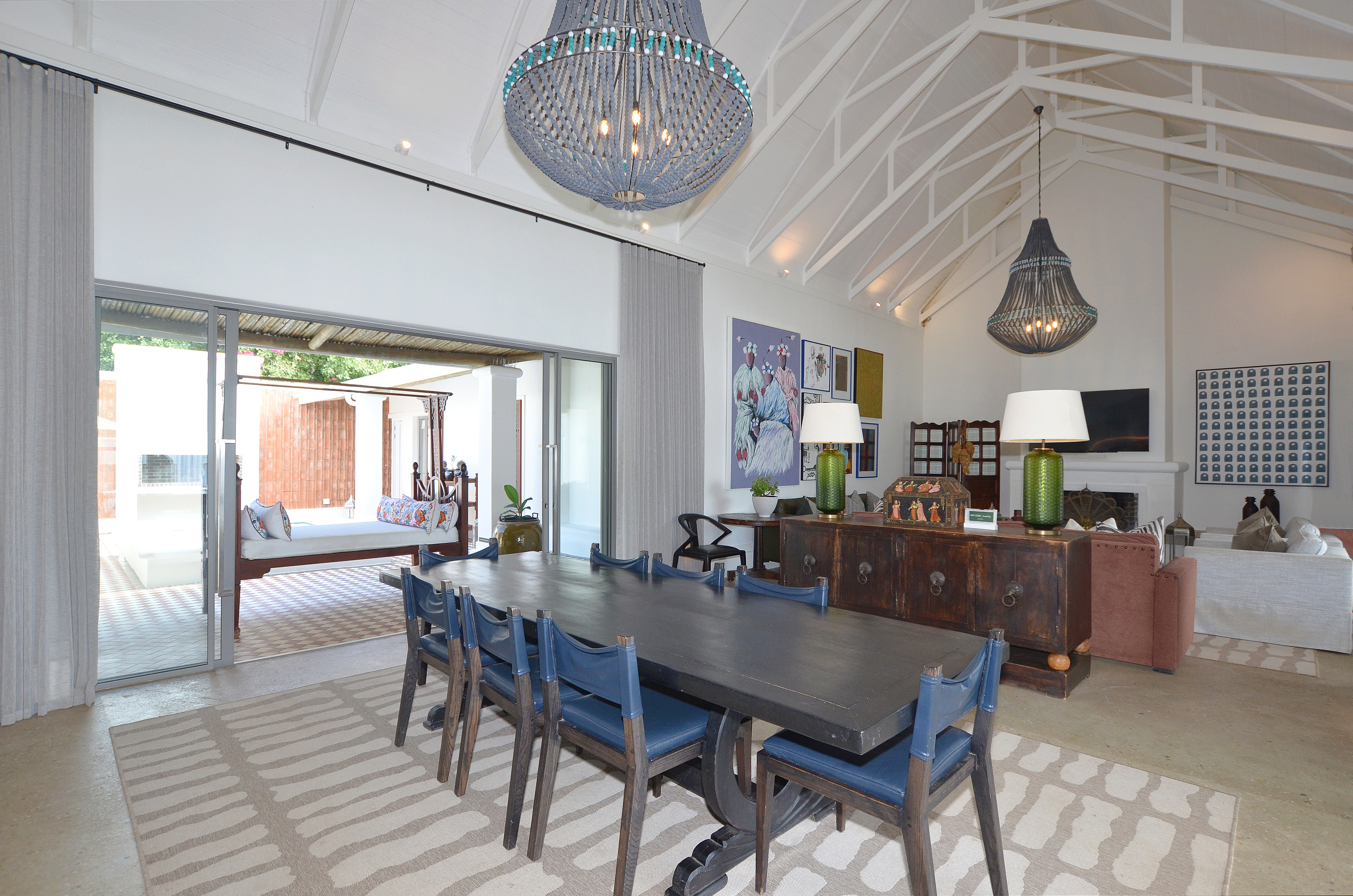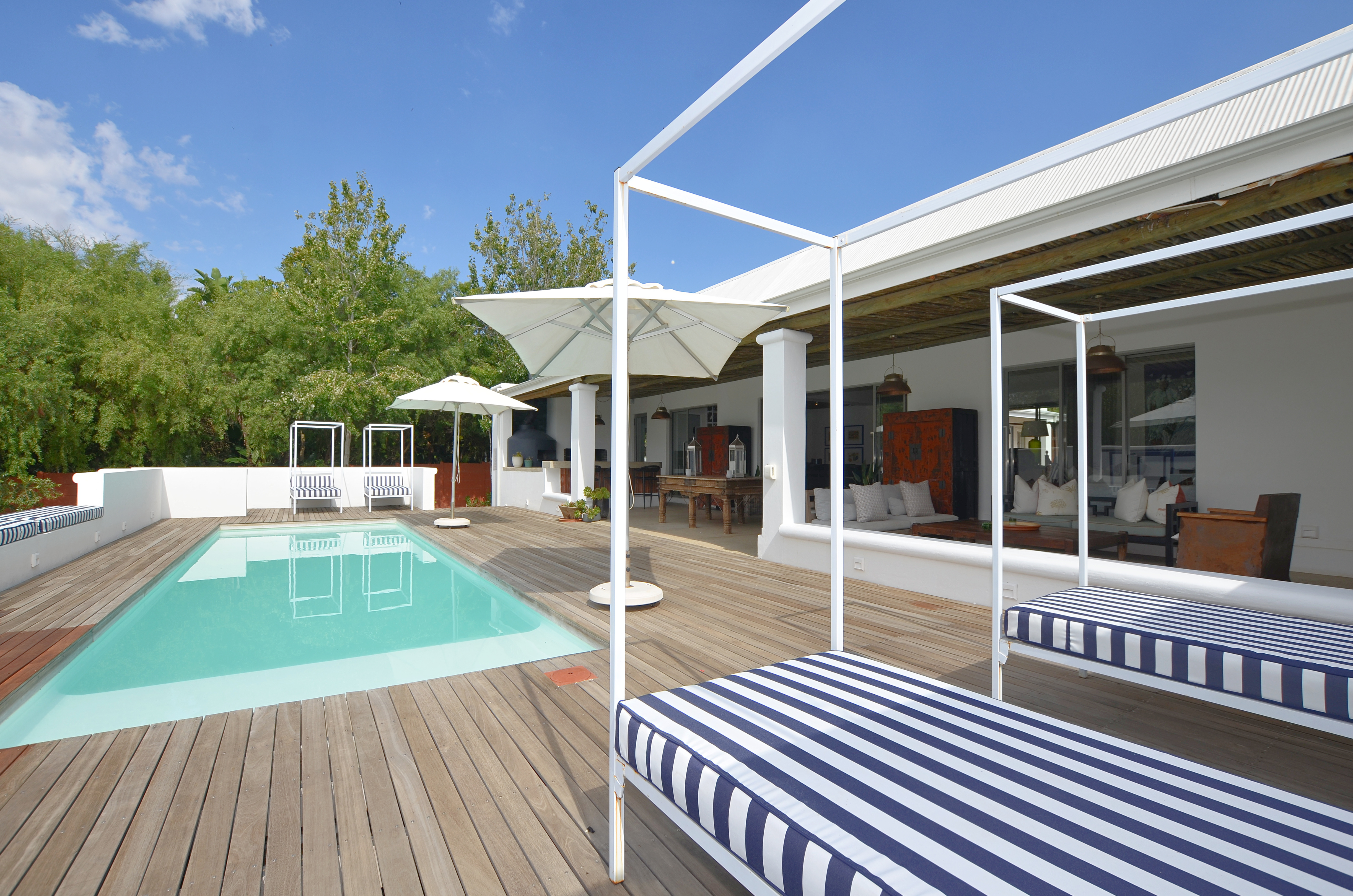 The beautifully landscaped garden has been thoughtfully designed for low-maintenance living while providing an exceptional setting for outdoor entertaining. Long alfresco lunches, sunset dinners, and memorable evenings under the stars become part of everyday life here. Beneath the striking blue rectangular frames, perfectly suited for festival lighting, lies an inviting entertainment space ideal for a 30-seater long table, creating an unforgettable dining experience in the heart of the Swartland. A sparkling swimming pool anchors the outdoor space beautifully, complemented by a wooden deck and elegant four-poster pool loungers that enhance the sense of luxury and relaxation.