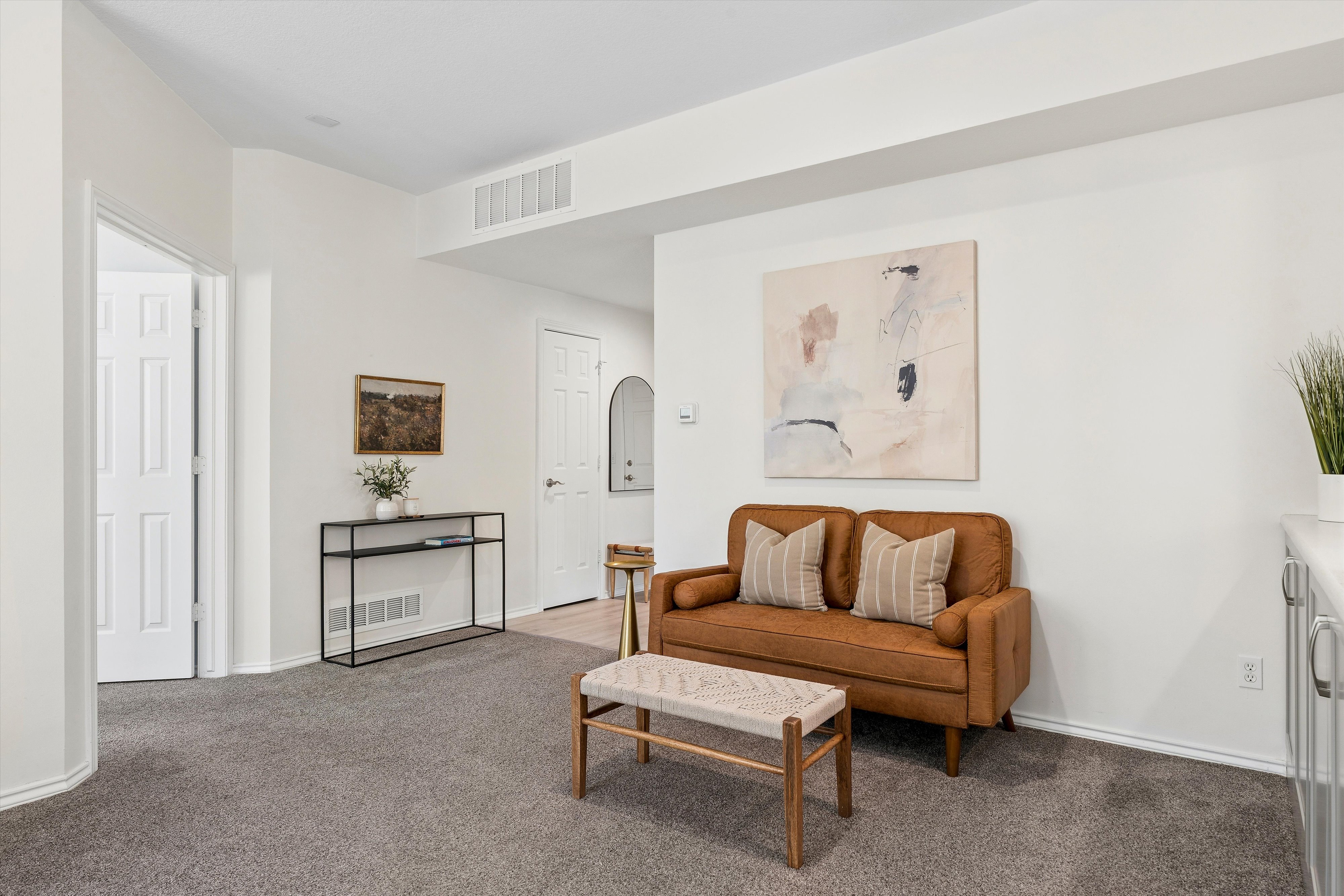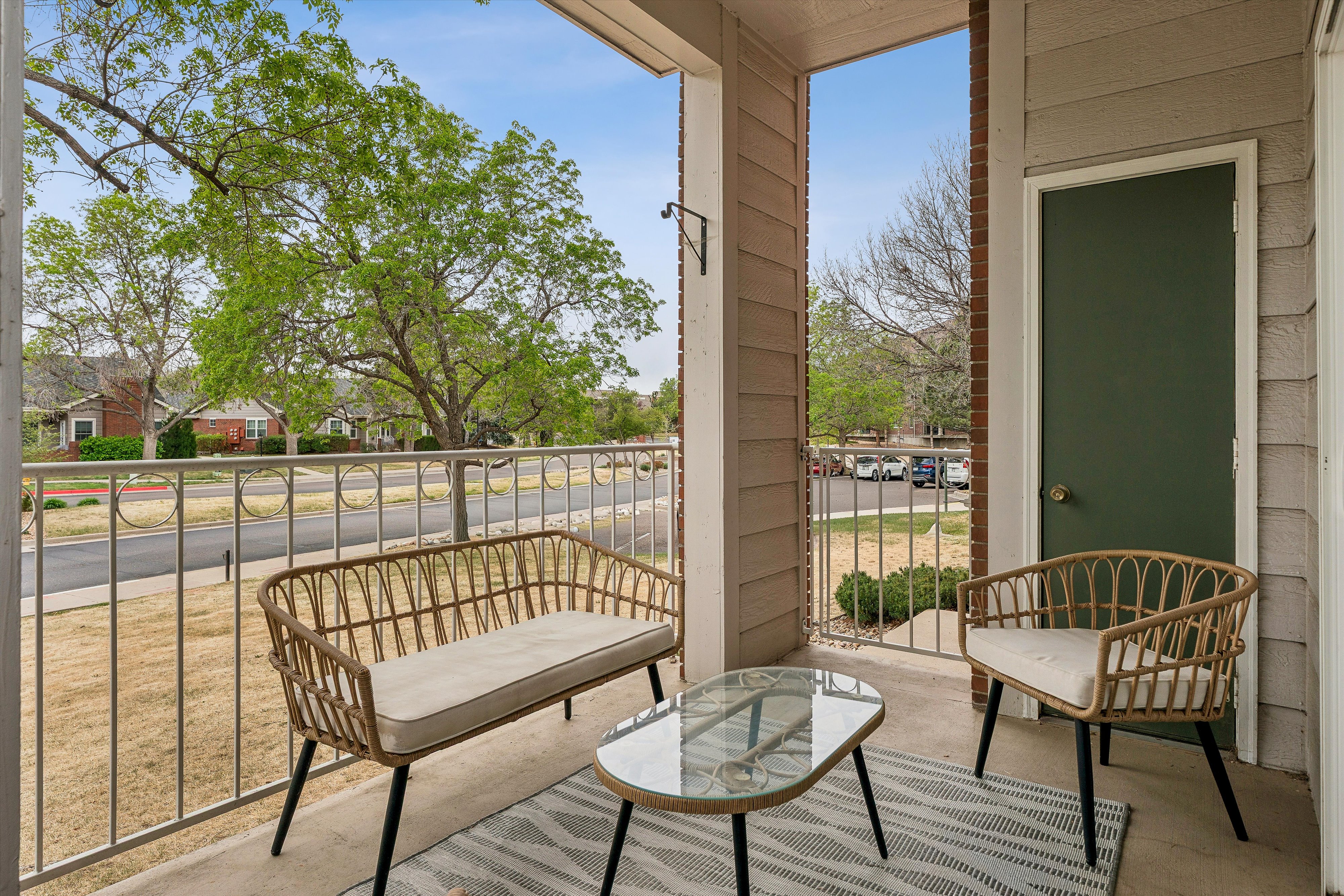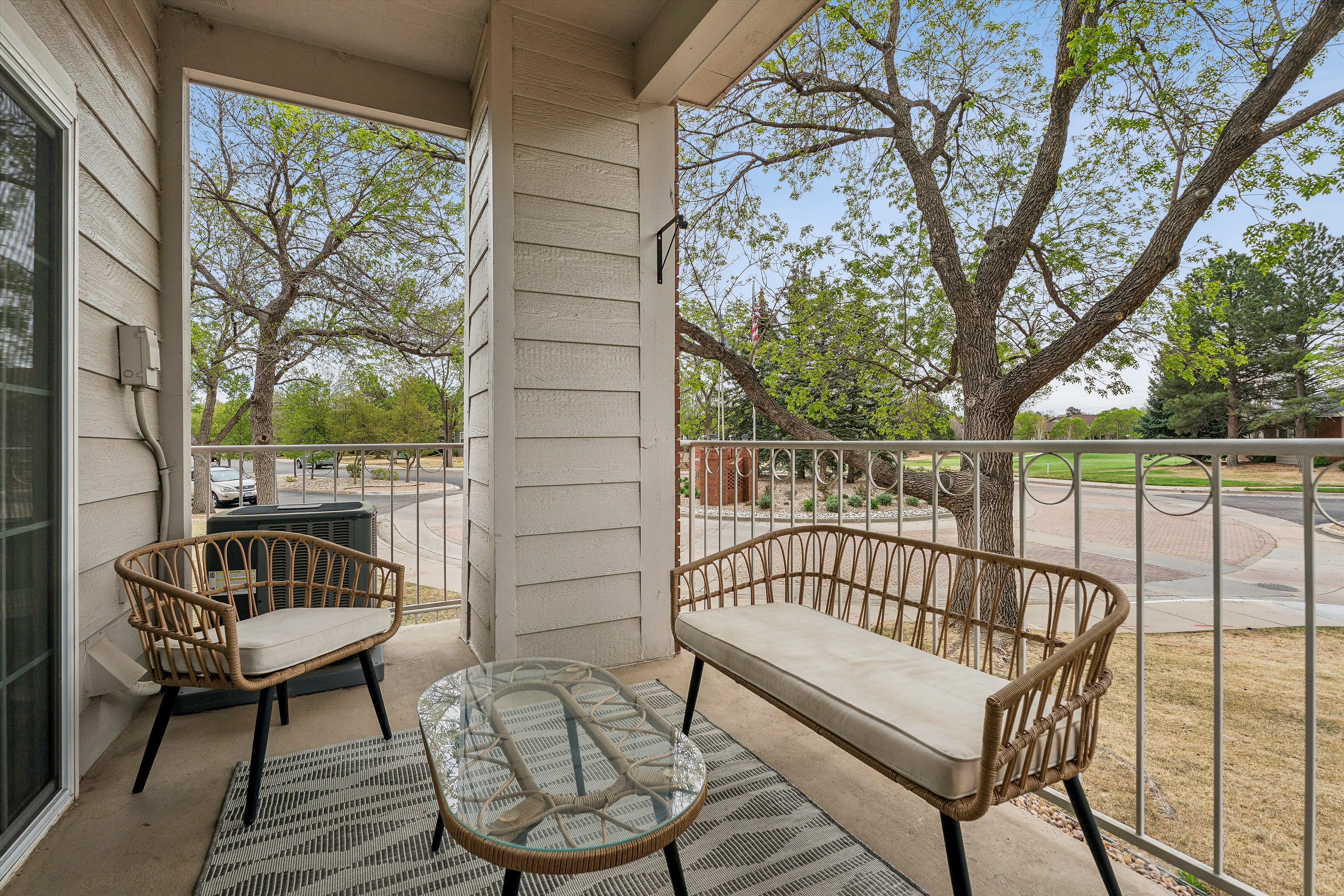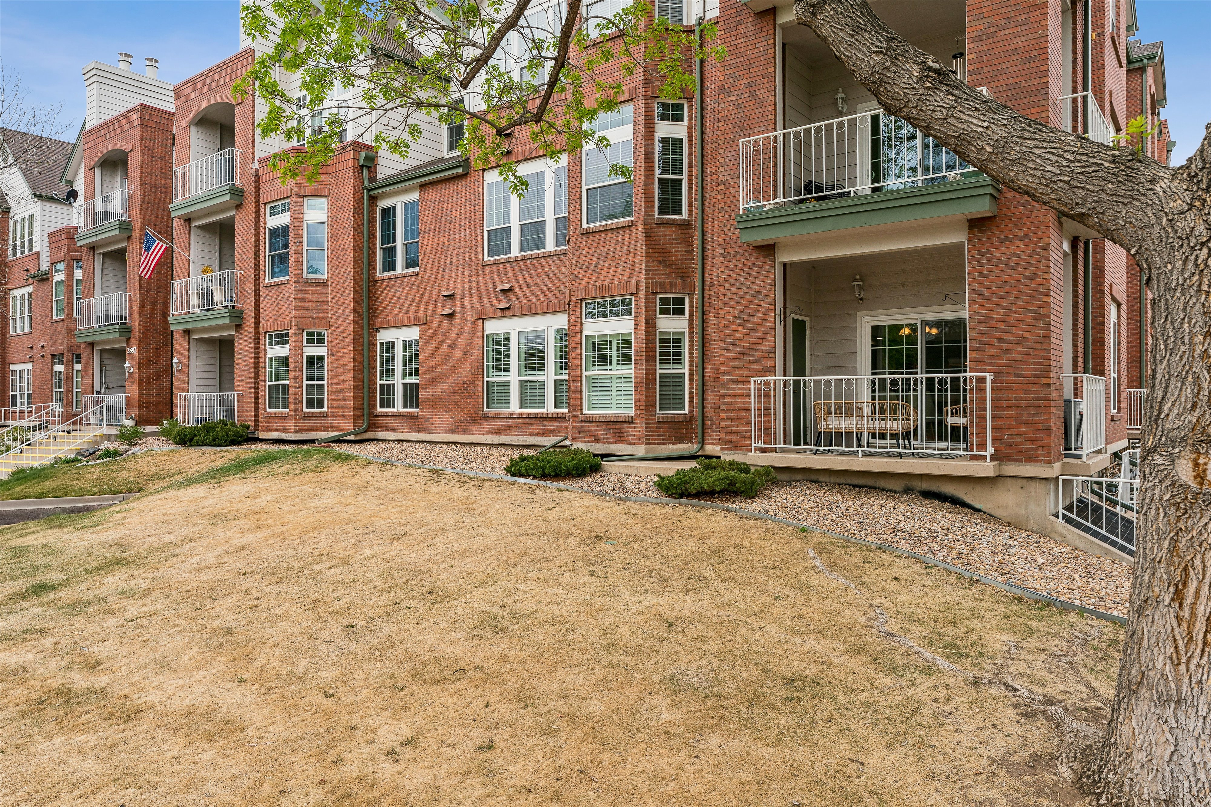First floor, corner unit condo in 55+ Centennial at Riverwalk in Littleton. Main level access and a functional, low-maintenance layout. Open living area with abundant natural light. Newer carpet and LVP flooring throughout. Kitchen features quartz countertops, soft close cabinets, and ample storage. Primary suite includes an updated bathroom with folding shower seat. Secondary bedroom suitable for office or flex use. Oversized northeast-facing patio provides additional outdoor space with tree coverage. Includes private underground parking near building entry with storage. Community amenities include clubhouse, fitness center, outdoor pool, hot tub, library, billiards, social spaces, and walking trails. Convenient access to downtown Littleton, light rail, shopping, and golf. Secured building with HOA covering maintenance for true lock-and-leave living.