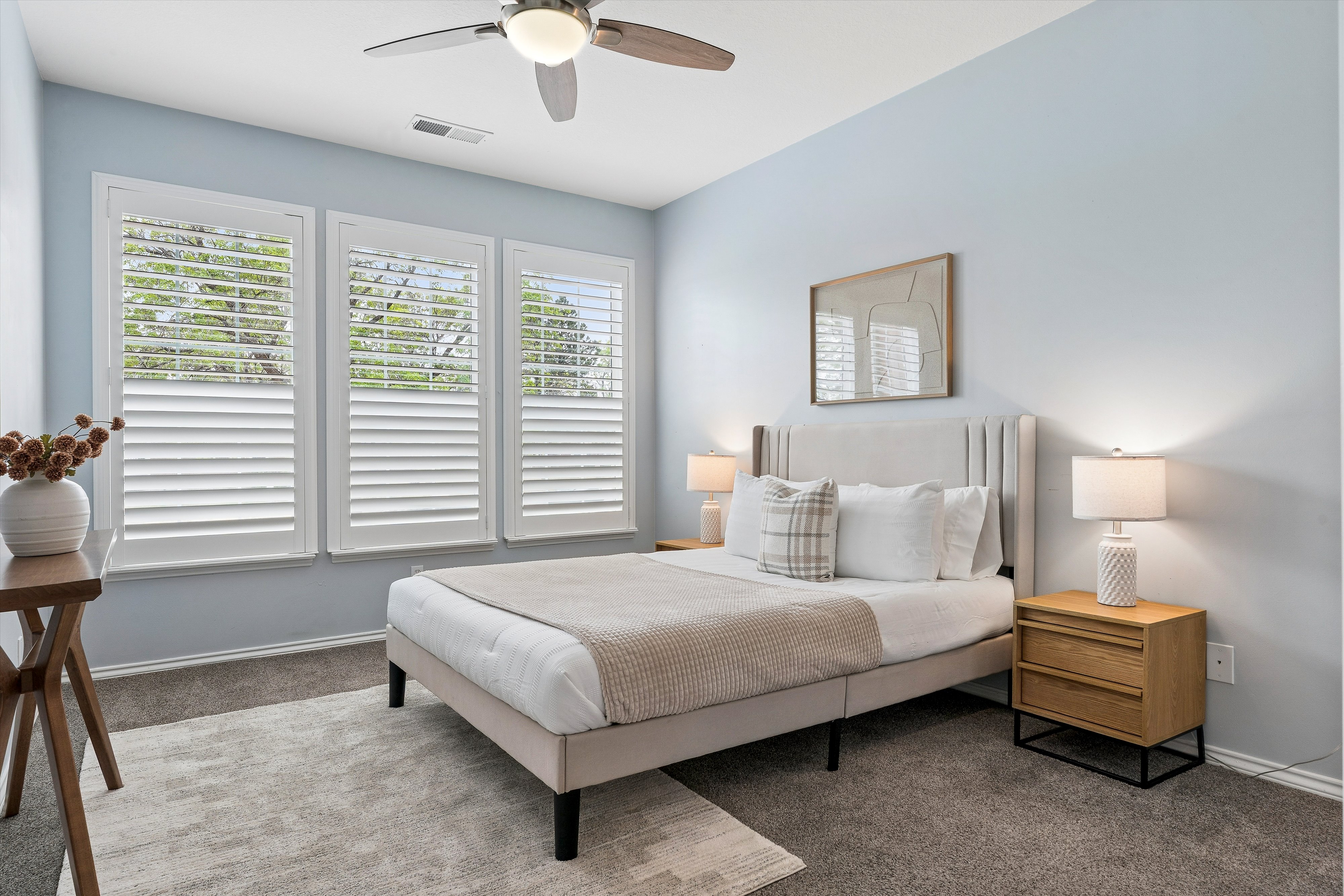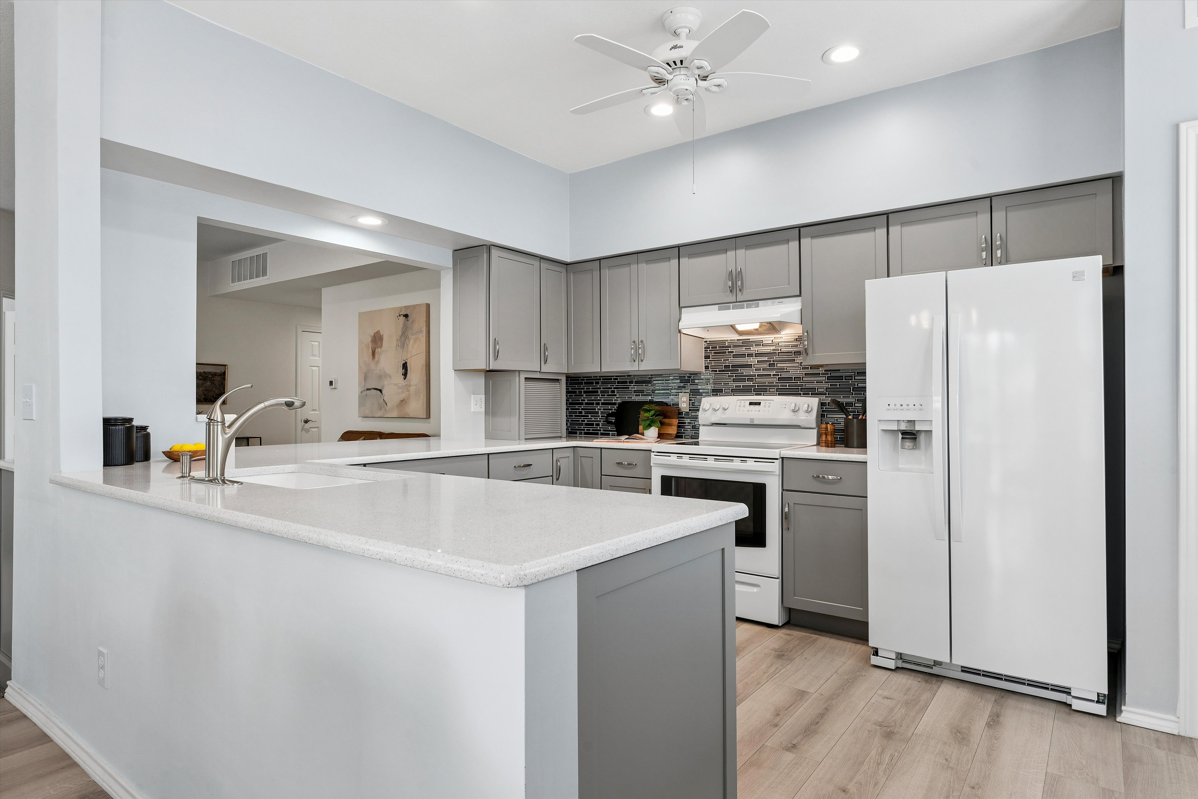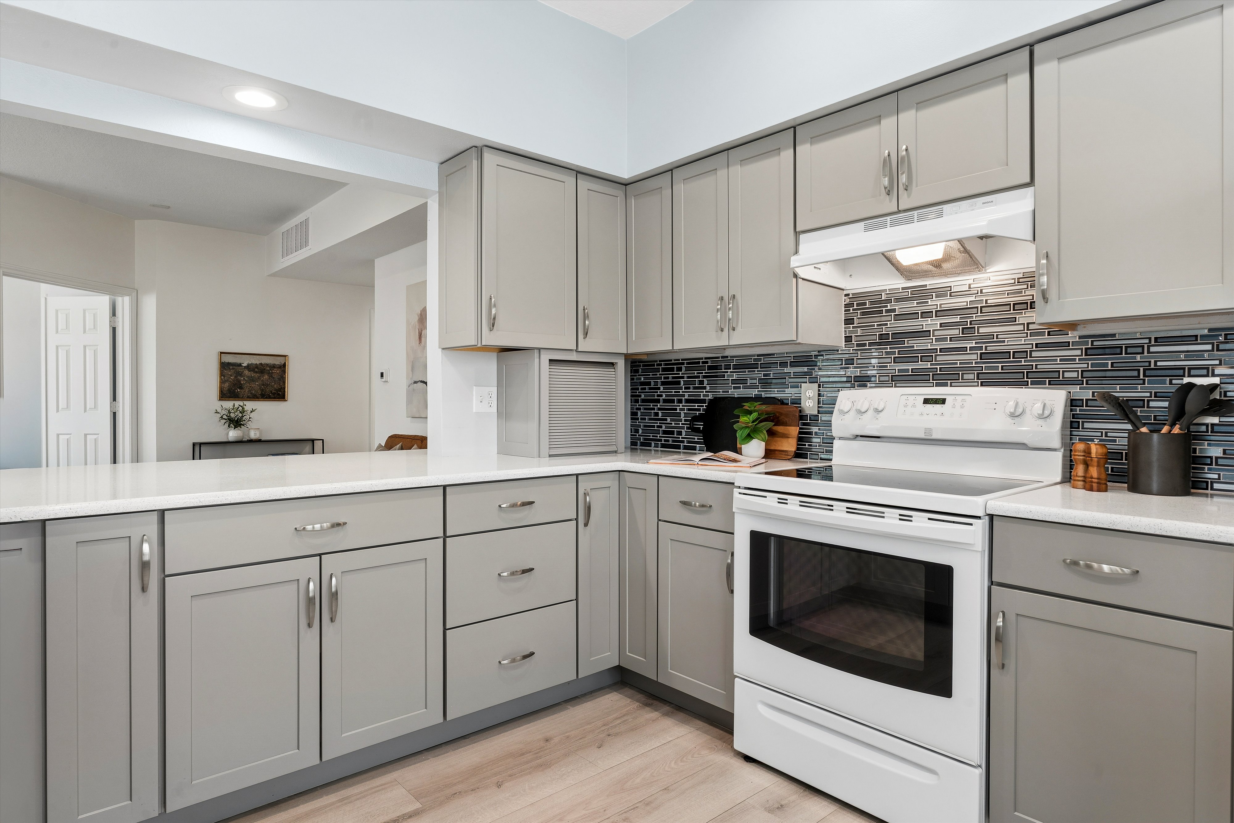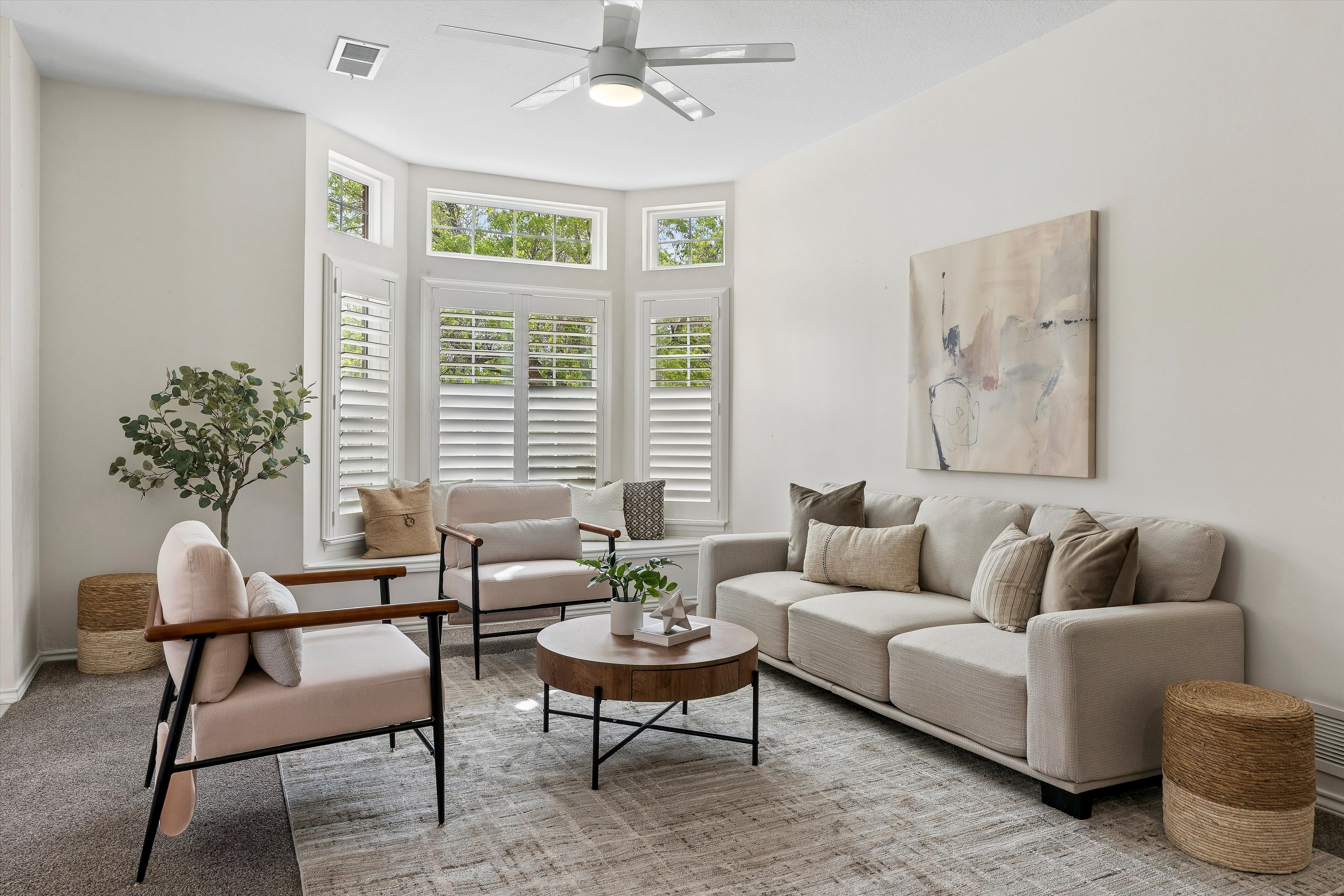 First floor, corner unit condo in 55+ Centennial at Riverwalk in Littleton. Main level access and a functional, low-maintenance layout. Open living area with abundant natural light. Newer carpet and LVP flooring throughout. Kitchen features quartz countertops, soft close cabinets, and ample storage. Primary suite includes an updated bathroom with folding shower seat. Secondary bedroom suitable for office or flex use. Oversized northeast-facing patio provides additional outdoor space with tree coverage. Includes private underground parking near building entry with storage. Community amenities include clubhouse, fitness center, outdoor pool, hot tub, library, billiards, social spaces, and walking trails. Convenient access to downtown Littleton, light rail, shopping, and golf. Secured building with HOA covering maintenance for true lock-and-leave living.