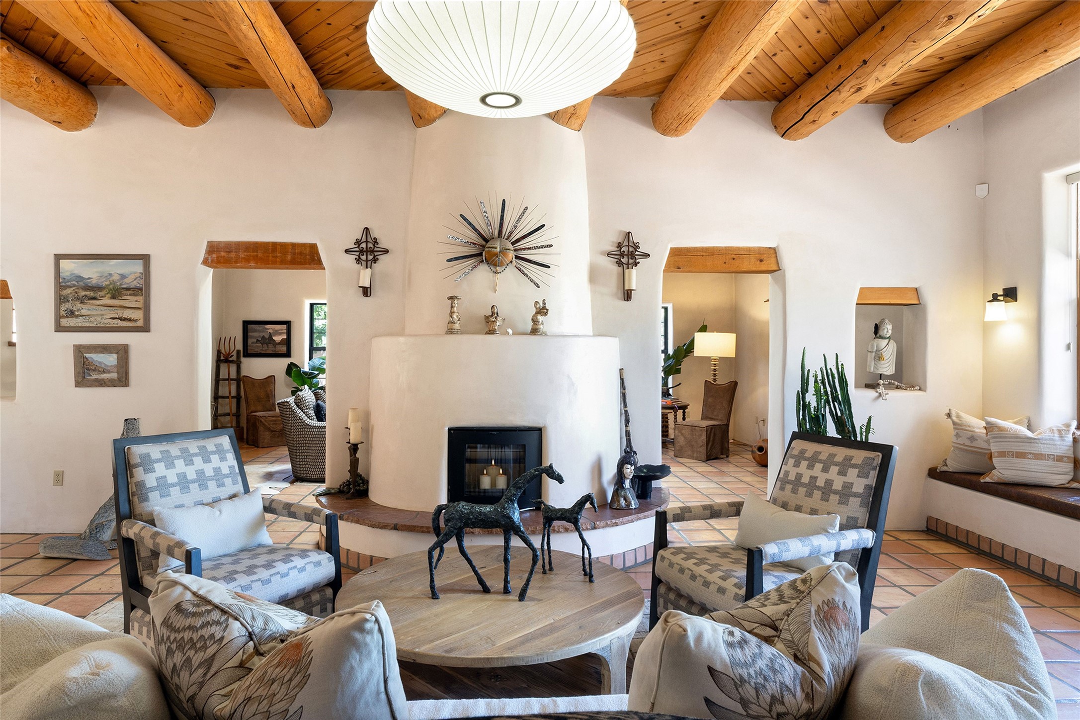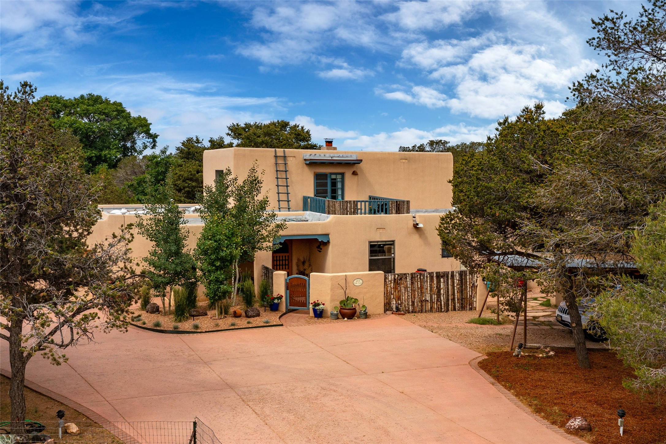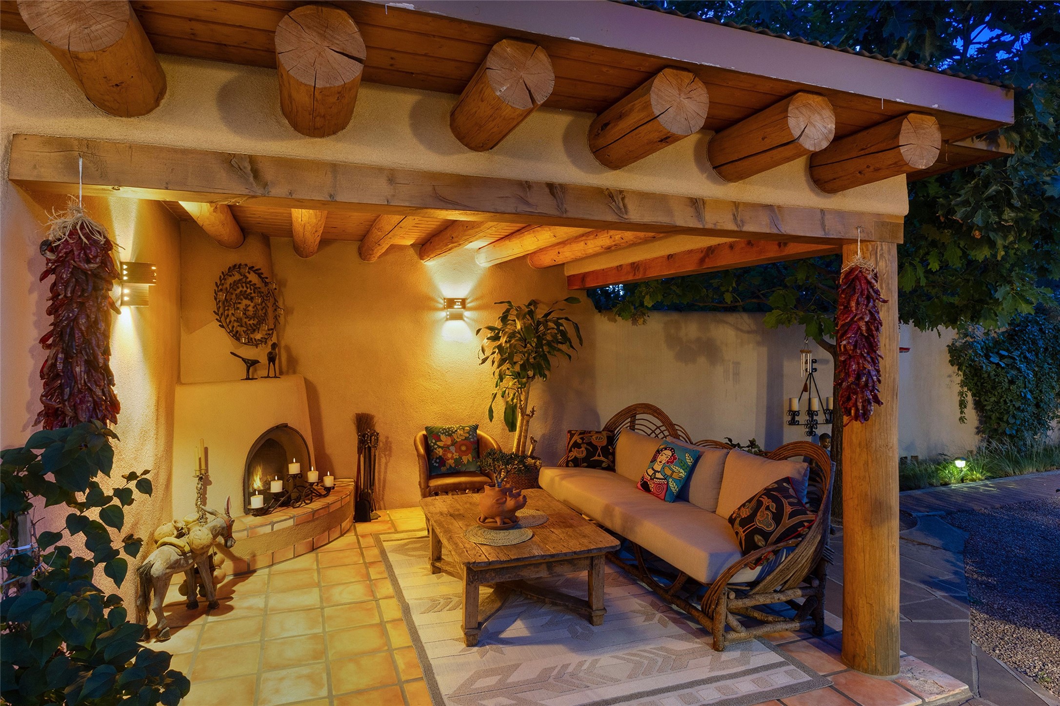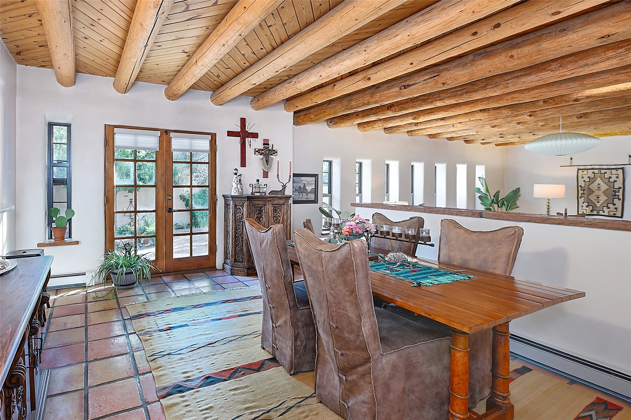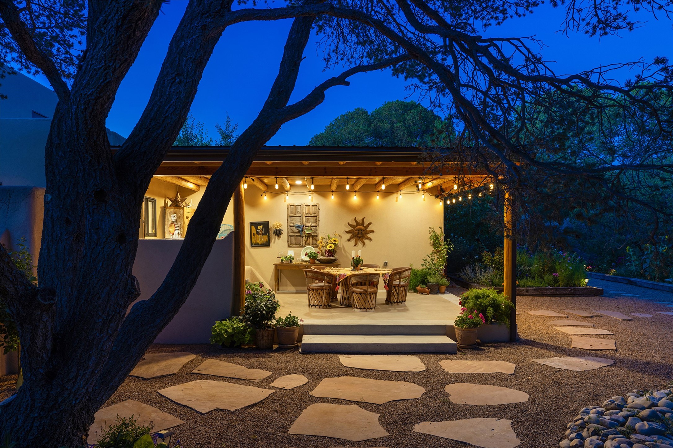 Welcome to 104 Calle Paula in highly coveted Sol y Lomas, an exquisitely appointed 4-bedroom, 3.5-bath home set on 1.12 private, beautifully landscaped acres in the heart of Santa Fe. Offering a rare blend of in-town convenience and country-style living, this property is thoughtfully designed for both everyday comfort and effortless entertaining. The updated chef’s kitchen features Wolf and Viking appliances, custom cabinetry, and sleek stone countertops. Enhancing functionality and flow, the layout has been thoughtfully improved with a reconfigured connection between the kitchen and dining area, along with the addition of a dedicated interior laundry and mudroom. The primary suite offers a quiet retreat with a spa-like bath, walk-in closet, and private patio with expansive views to the north, east, and west. Classic Santa Fe elements including high ceilings with large vigas, multiple kiva fireplaces, and artisanal finishes bring warmth and character throughout the home. Shaded portals, peaceful patios, and lush gardens with mature trees create a seamless indoor-outdoor living experience, further complemented by a small orchard, greenhouse, and chicken coop. A detached studio provides flexible space for a home office, art studio, or for guest overflow. Tucked within a quiet enclave just minutes from the Santa Fe Plaza, restaurants, shopping, and medical facilities, this property offers a rare combination of privacy, comfort, and convenience.
