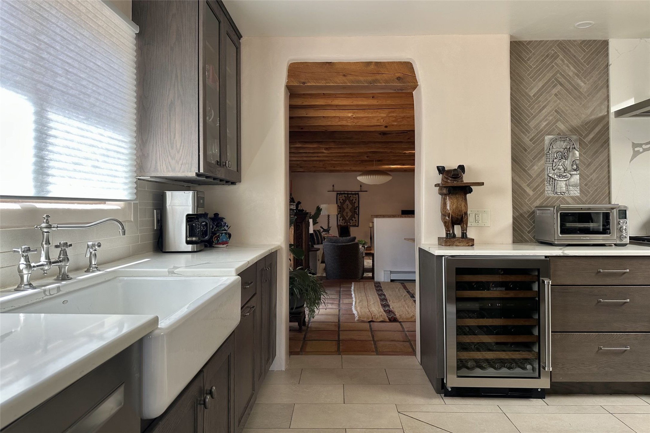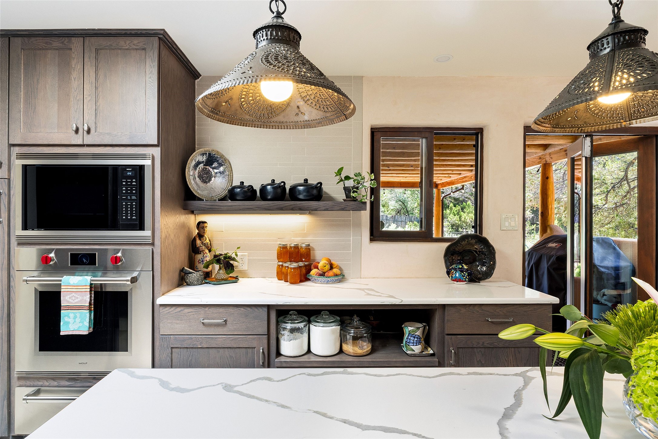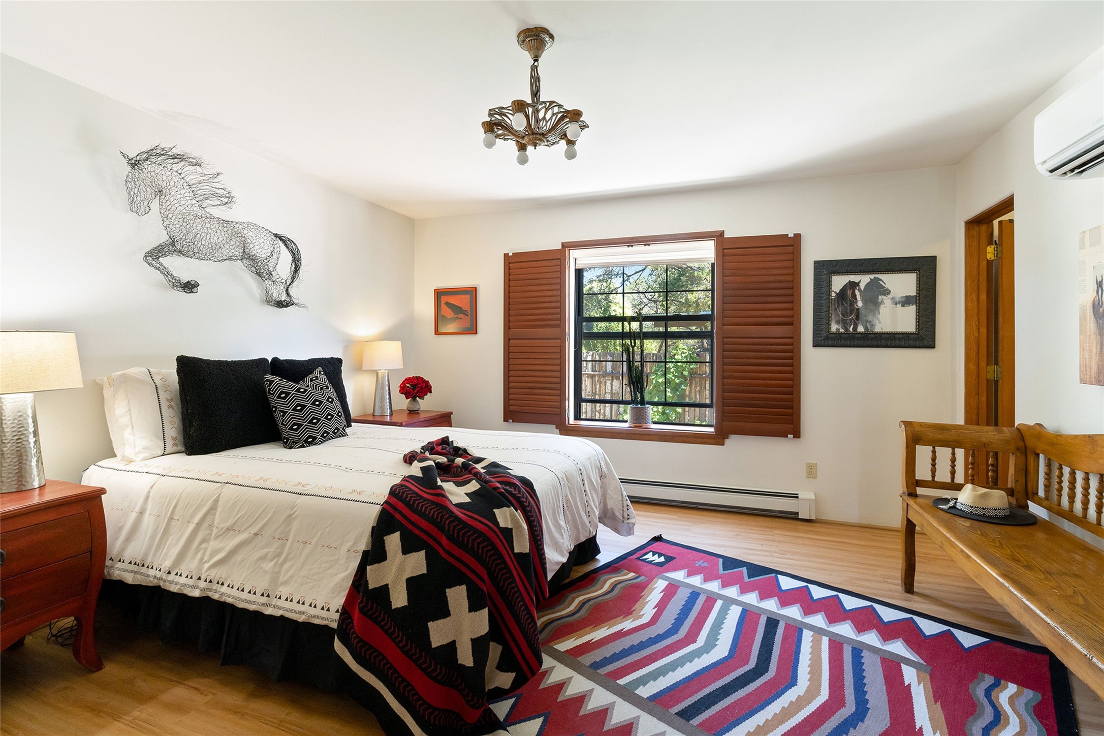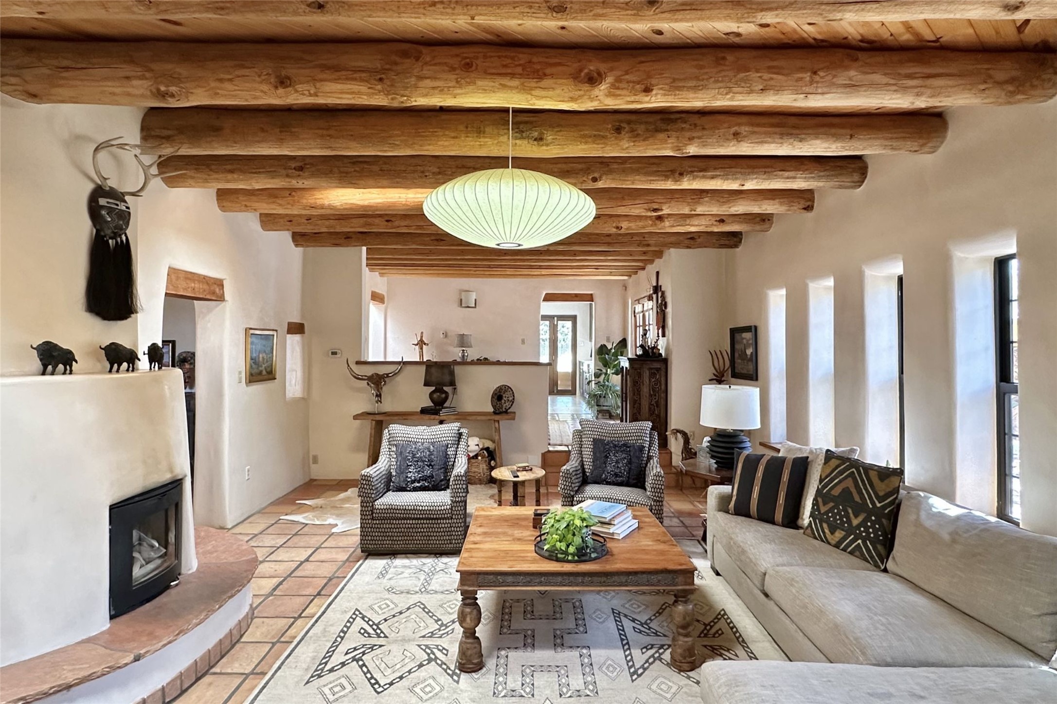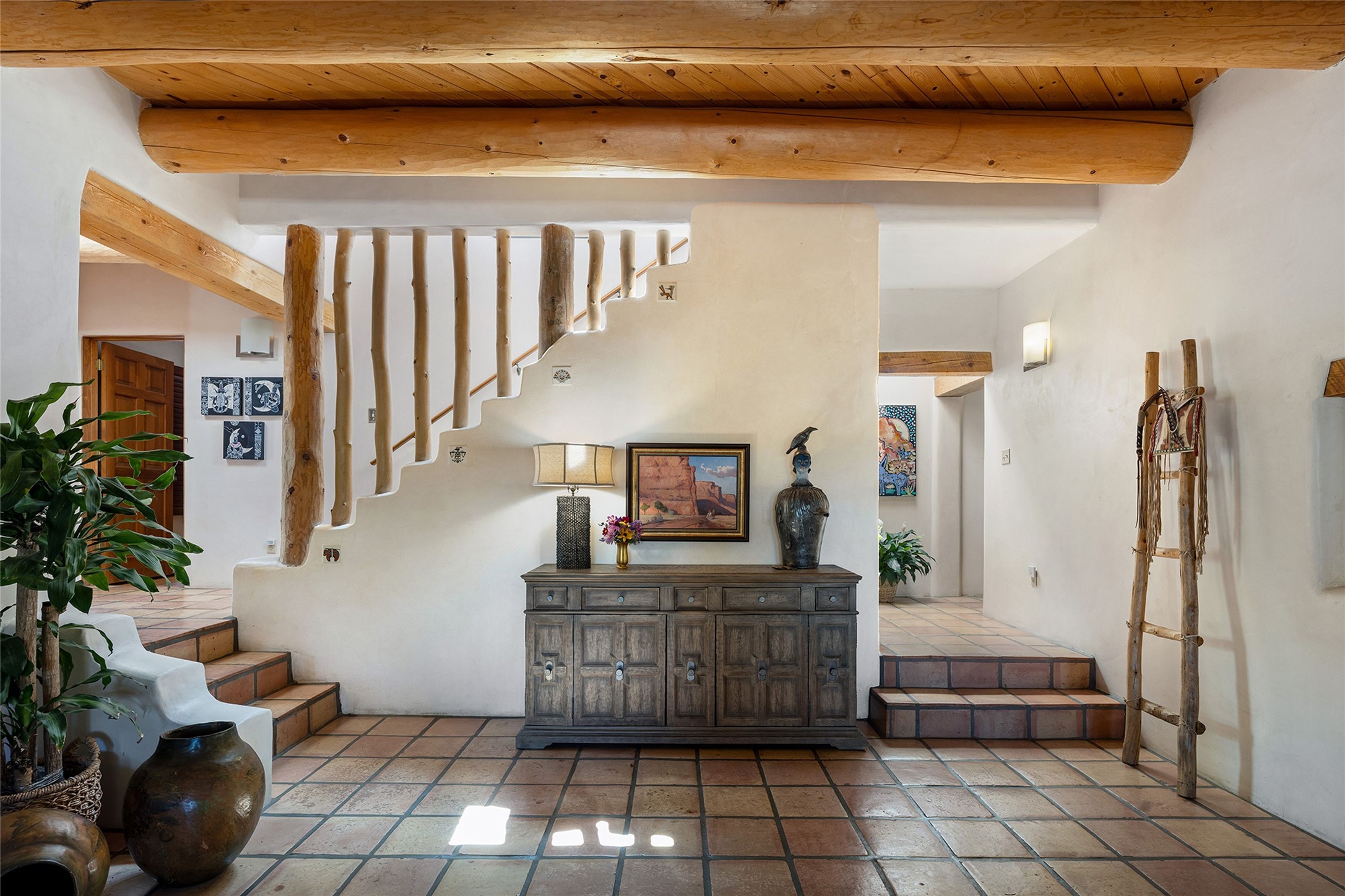Welcome to 104 Calle Paula in highly coveted Sol y Lomas, an exquisitely appointed 4-bedroom, 3.5-bath home set on 1.12 private, beautifully landscaped acres in the heart of Santa Fe. Offering a rare blend of in-town convenience and country-style living, this property is thoughtfully designed for both everyday comfort and effortless entertaining. The updated chef’s kitchen features Wolf and Viking appliances, custom cabinetry, and sleek stone countertops. Enhancing functionality and flow, the layout has been thoughtfully improved with a reconfigured connection between the kitchen and dining area, along with the addition of a dedicated interior laundry and mudroom. The primary suite offers a quiet retreat with a spa-like bath, walk-in closet, and private patio with expansive views to the north, east, and west. Classic Santa Fe elements including high ceilings with large vigas, multiple kiva fireplaces, and artisanal finishes bring warmth and character throughout the home. Shaded portals, peaceful patios, and lush gardens with mature trees create a seamless indoor-outdoor living experience, further complemented by a small orchard, greenhouse, and chicken coop. A detached studio provides flexible space for a home office, art studio, or for guest overflow. Tucked within a quiet enclave just minutes from the Santa Fe Plaza, restaurants, shopping, and medical facilities, this property offers a rare combination of privacy, comfort, and convenience.