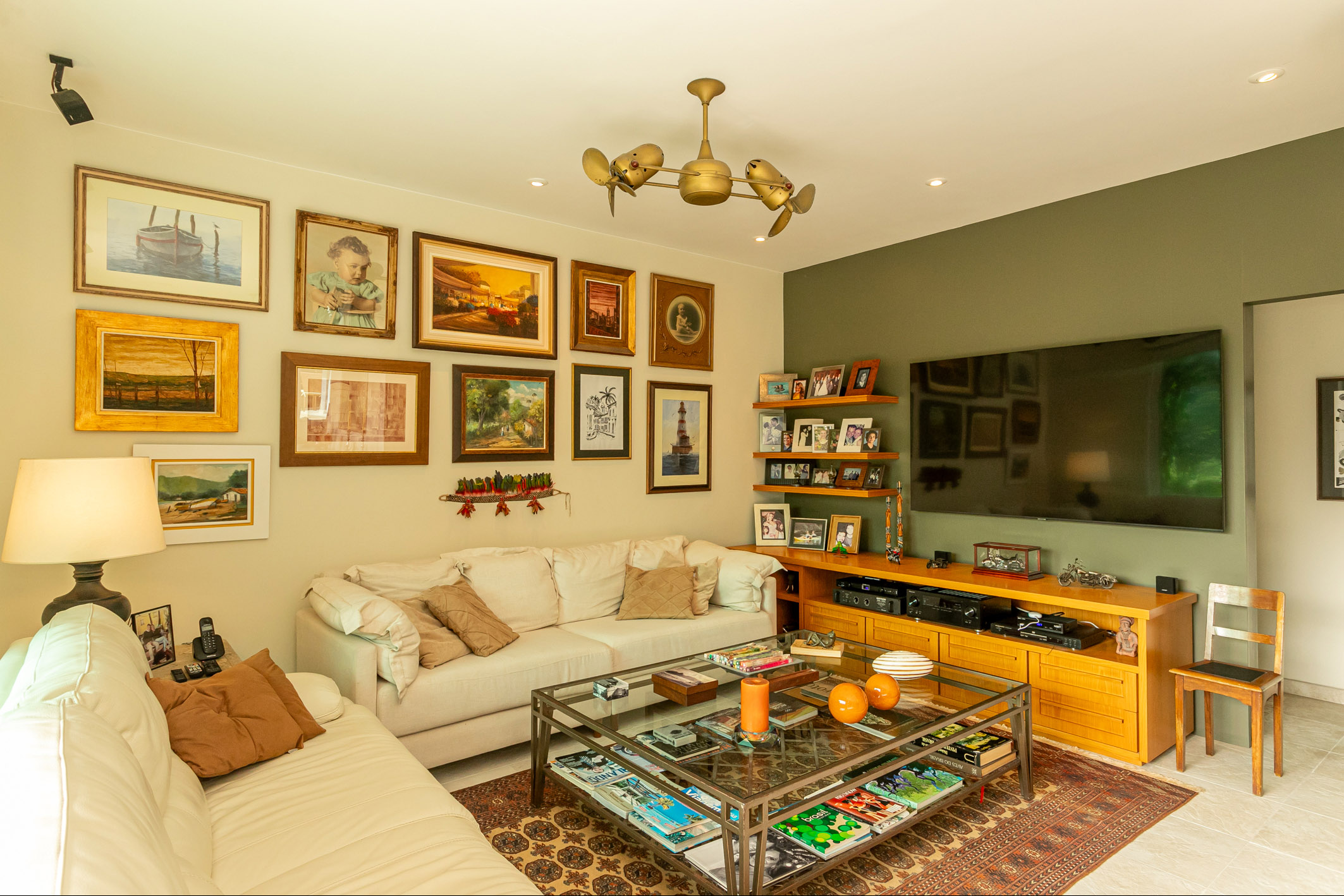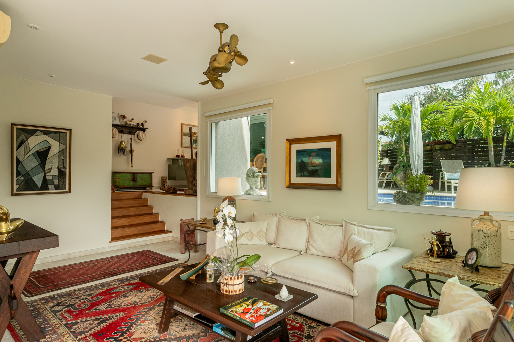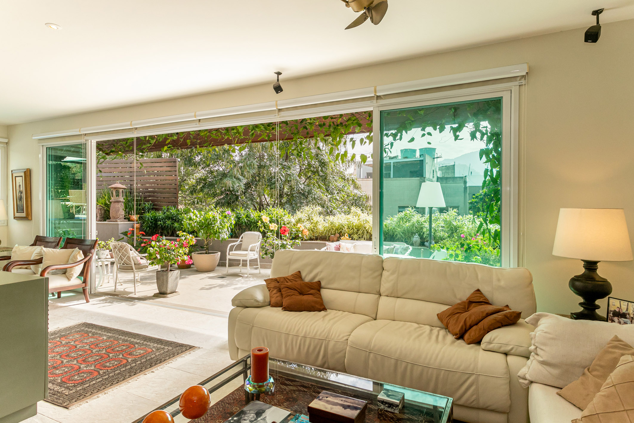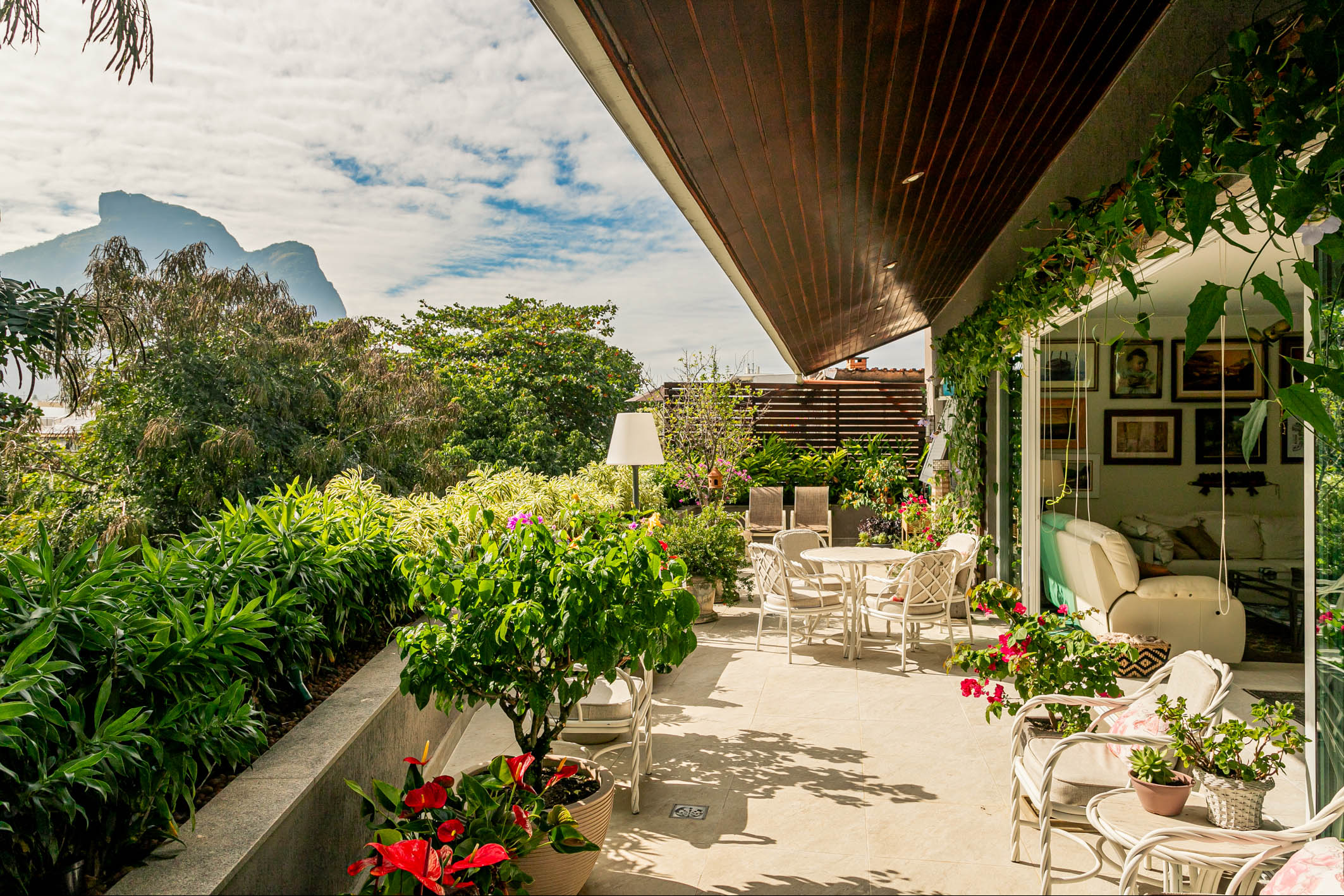 This penthouse is located in Jardim Oceânico, just one block from the beach, and features a well-distributed layout with open views of Pedra da Gávea. The social area includes three spacious living areas, arranged as living room, TV room, and dining room on a slightly elevated level, all connected to a landscaped terrace. Two powder rooms serve this area. The private quarters offer a primary suite with walk-in closet and a second suite, also with closet. On the upper level, there is a guest suite with walk-in closet and a private balcony. The service area includes a kitchen with dining space, laundry area, and complete staff quarters. The outdoor area features a barbecue space, sauna, and a swimming pool, along with solar energy and an automatic irrigation system for the gardens. The property includes five parking spaces and a storage room located in the service hall.