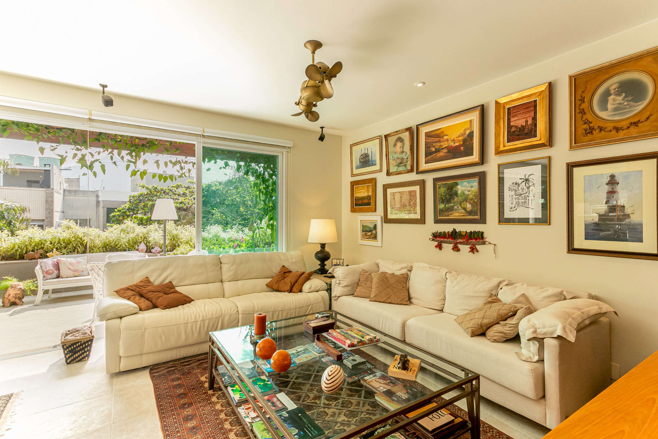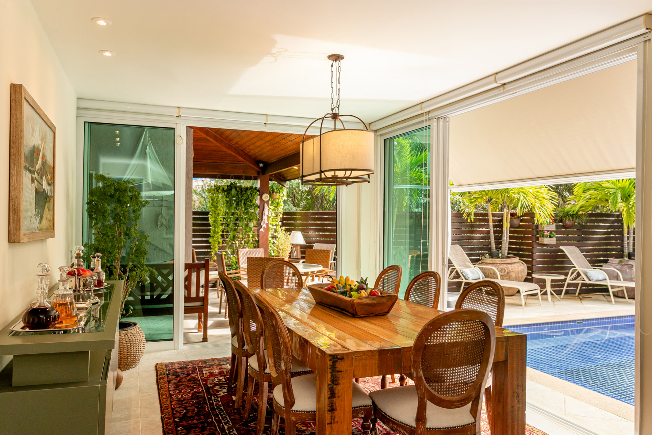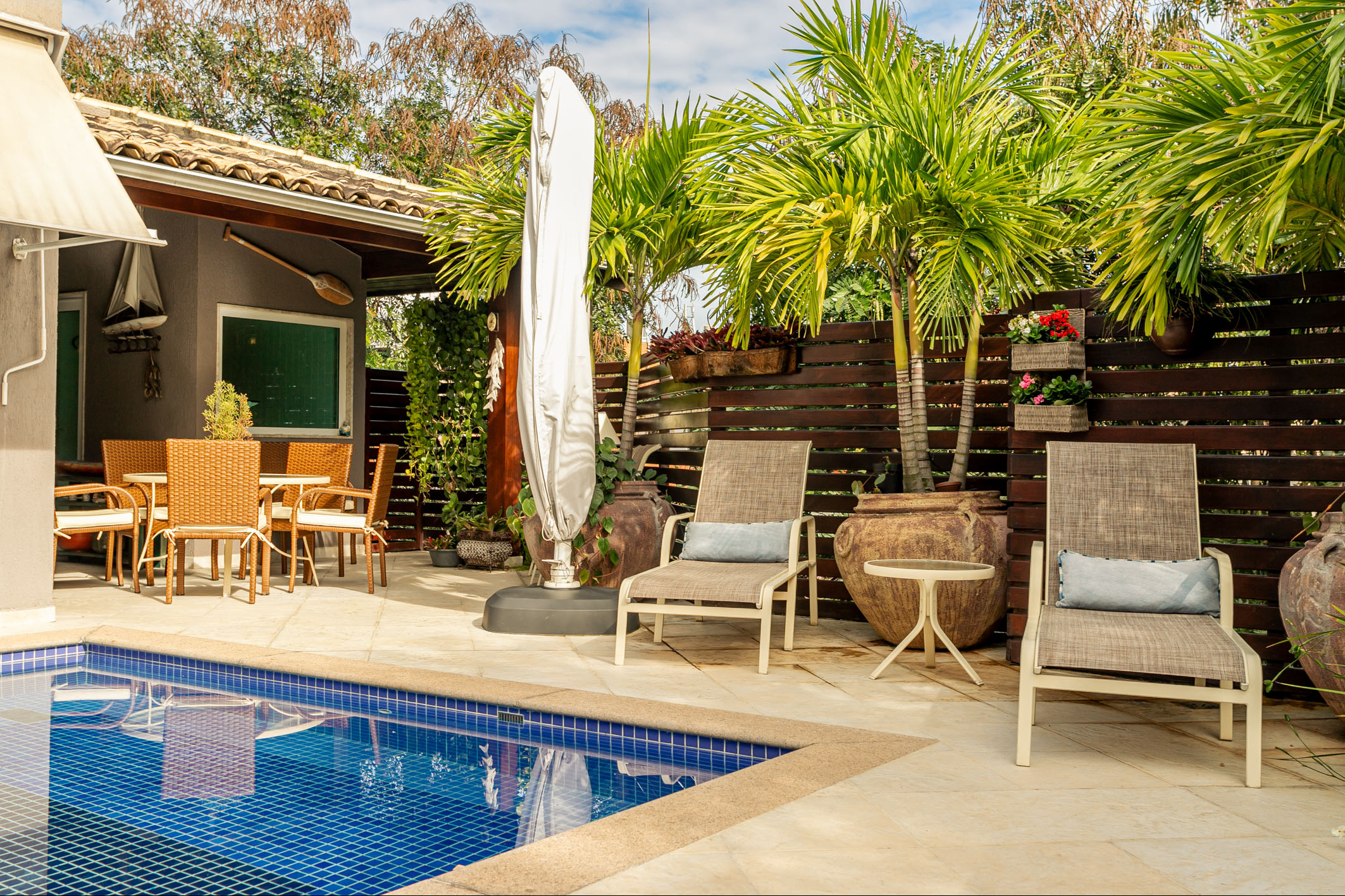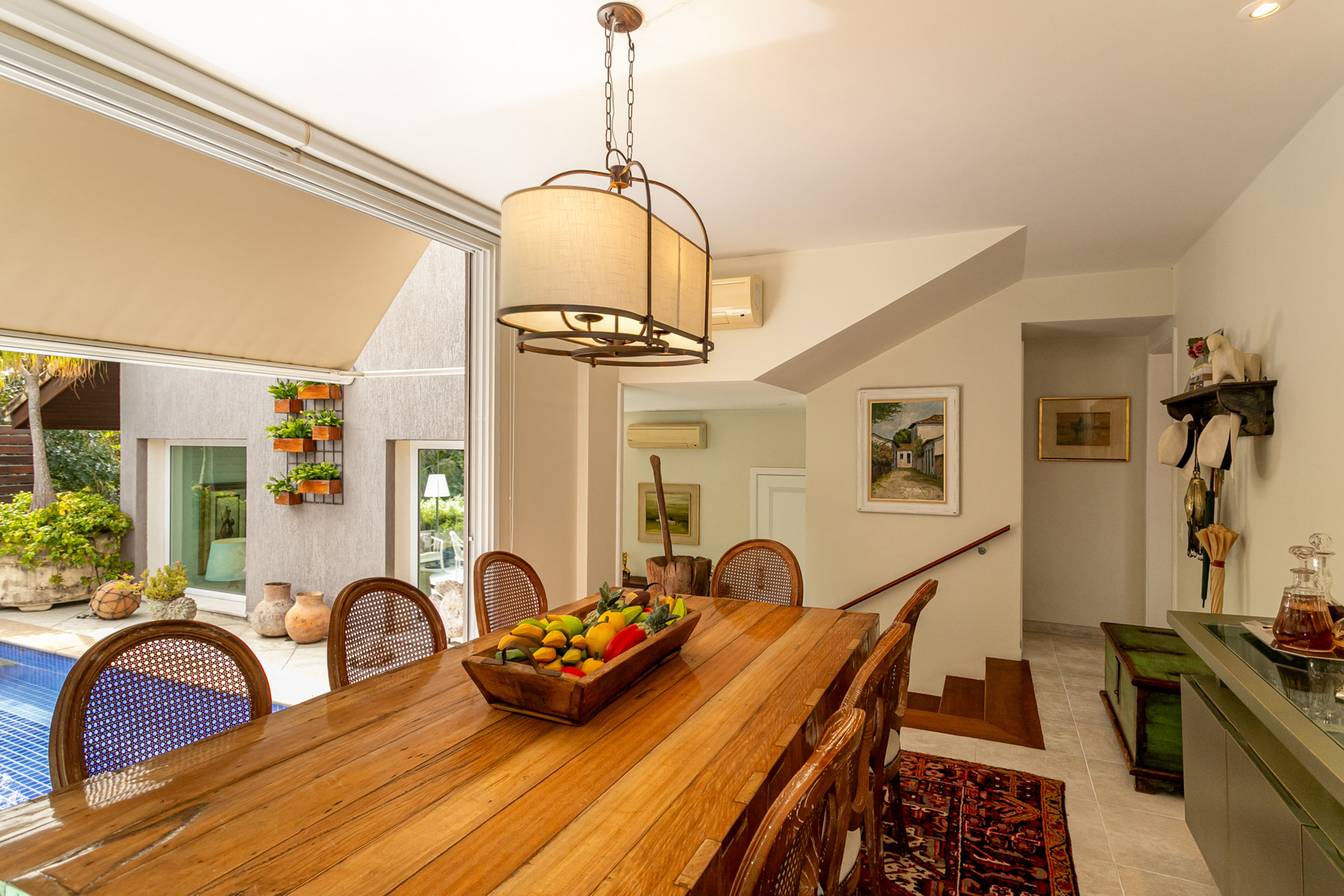 This penthouse is located in Jardim Oceânico, just one block from the beach, and features a well-distributed layout with open views of Pedra da Gávea. The social area includes three spacious living areas, arranged as living room, TV room, and dining room on a slightly elevated level, all connected to a landscaped terrace. Two powder rooms serve this area. The private quarters offer a primary suite with walk-in closet and a second suite, also with closet. On the upper level, there is a guest suite with walk-in closet and a private balcony. The service area includes a kitchen with dining space, laundry area, and complete staff quarters. The outdoor area features a barbecue space, sauna, and a swimming pool, along with solar energy and an automatic irrigation system for the gardens. The property includes five parking spaces and a storage room located in the service hall.