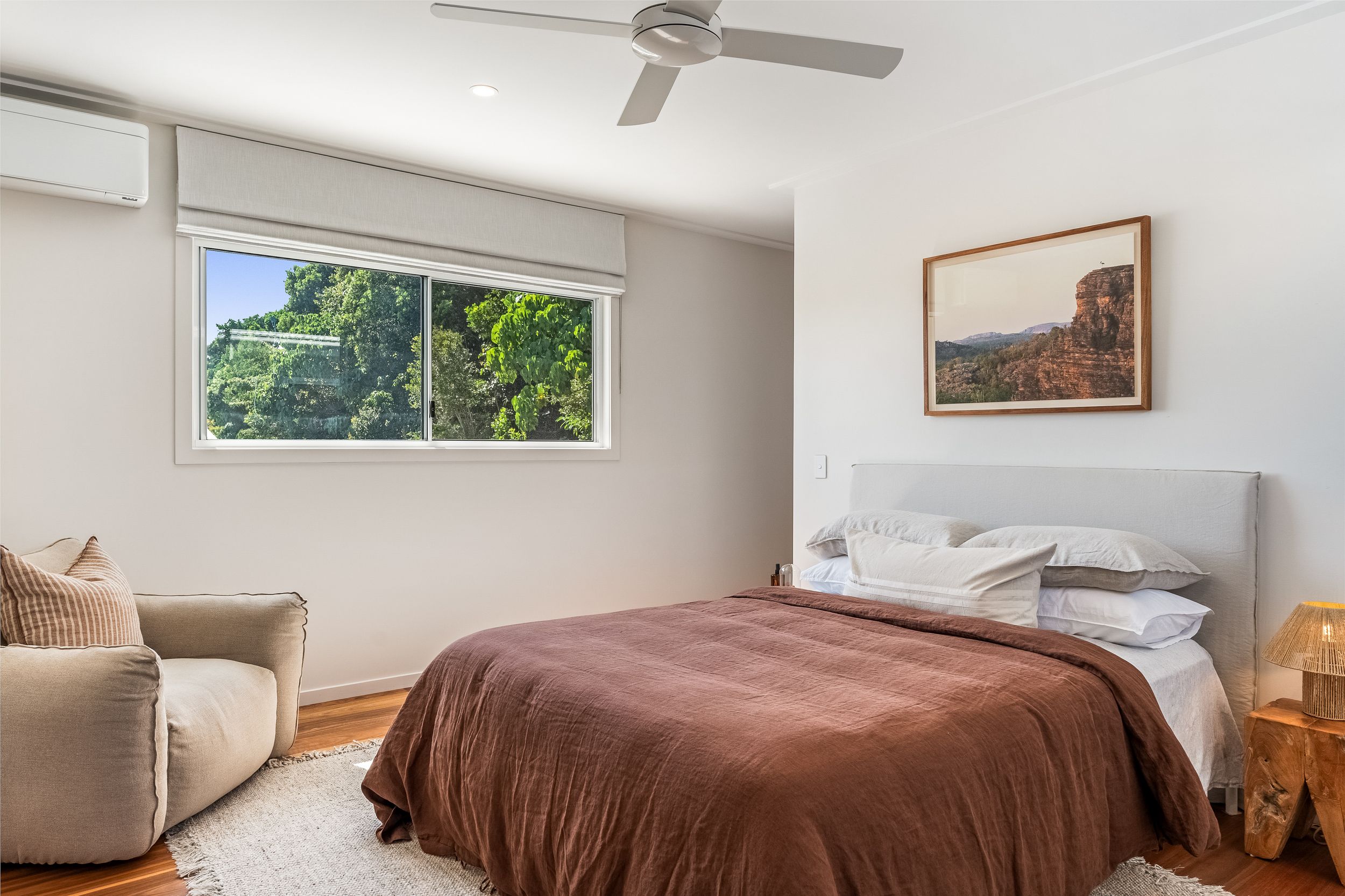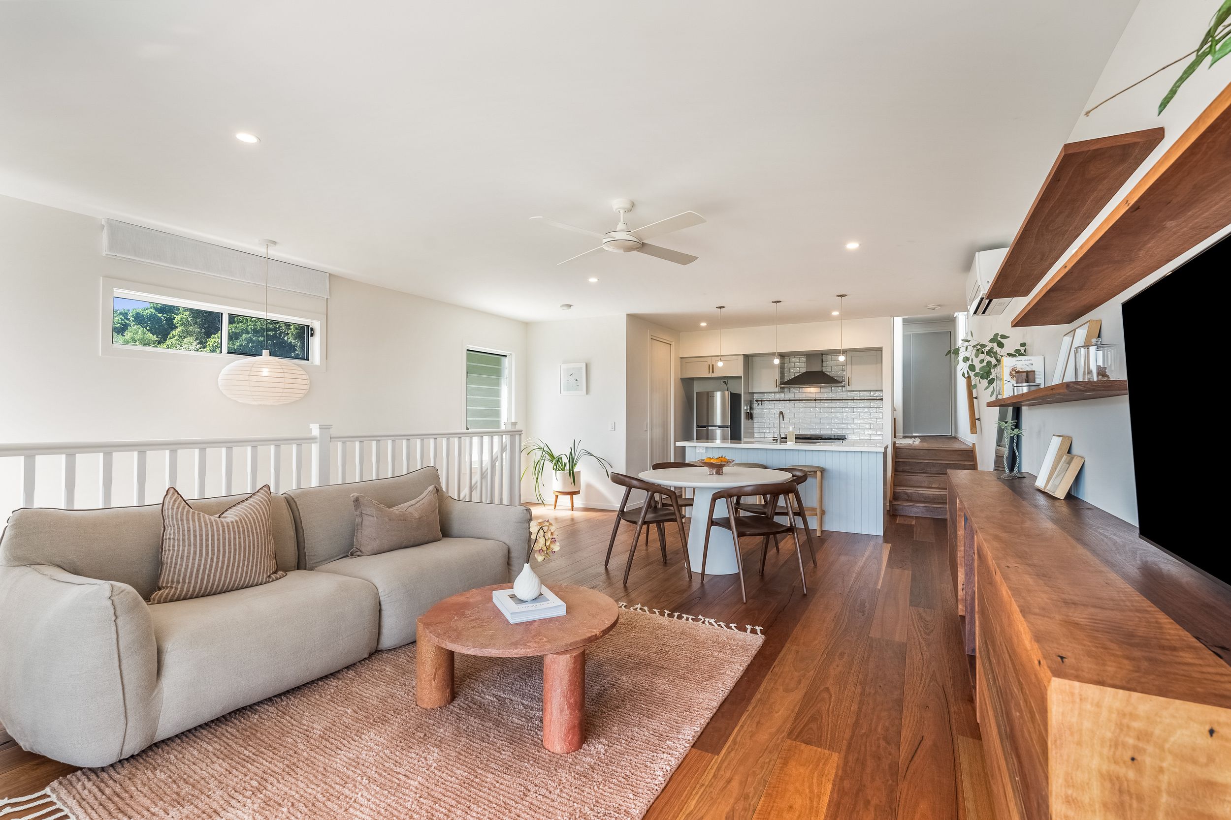 Inside, stunning timber floors and a warm, contemporary palette set the tone across both levels. The upper floor is the heart of the home, with an open plan living and dining area flowing to the kitchen and out to a generous balcony where the sunset views across the hinterland are simply spectacular. The master bedroom is also on this level, complete with ensuite and built-in robes. Downstairs, three additional bedrooms with built-in robes, a family room, central bathroom and laundry provide excellent separation for families, while a single lock-up garage and covered porch complete the entry. Outside, a beautifully designed rear entertaining deck features a built-in BBQ kitchen with stone benchtop surrounded by lush tropical plantings.