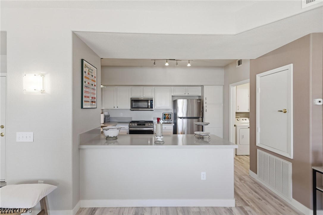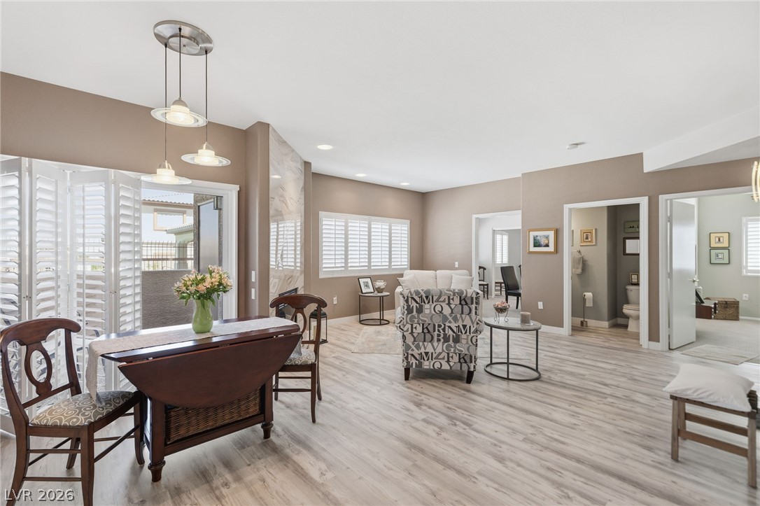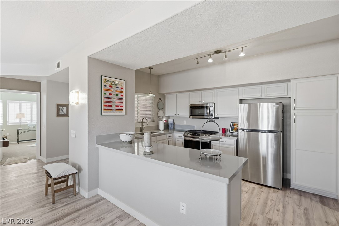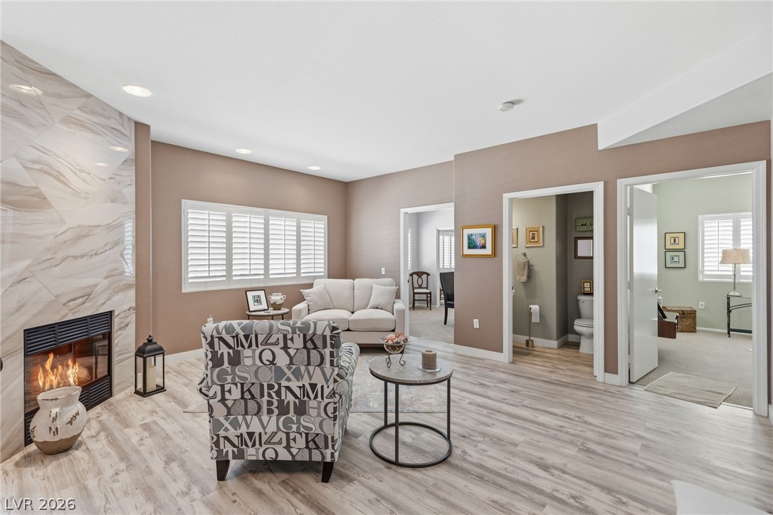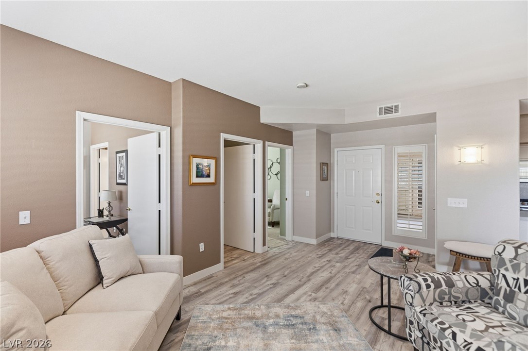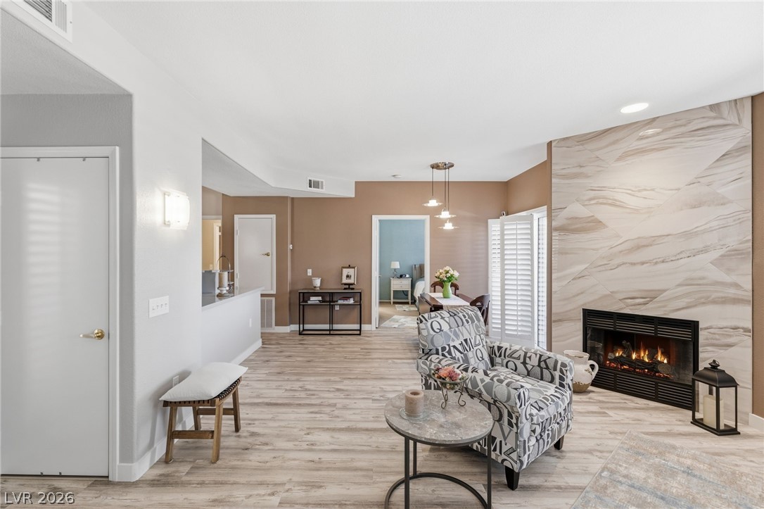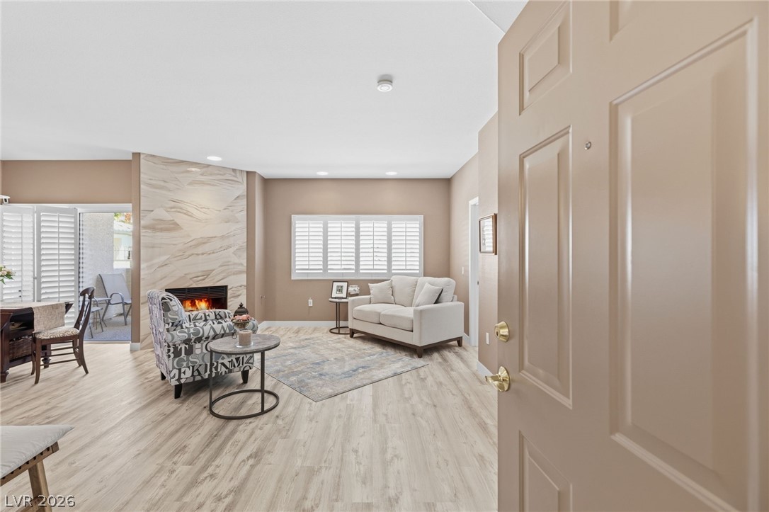 Stunning downstairs condo ideally positioned overlooking the pool! This beautifully designed 3-bedroom, 2.5-bath home offers an open layout with a spacious living and dining area centered around a striking floor-to-ceiling marble fireplace. Luxury laminate flooring in the main living areas pairs perfectly with low-profile Berber carpeting in the bedrooms. The kitchen features sleek quartz countertops and stainless appliances. The primary suite offers a relaxing retreat with a custom walk-in closet by California Closets and a built-in wall feature for added style and storage plus a huge walk in shower. Subtle accessibility enhancements - such as wider doorways, lower outlets, and lowered kitchen counters - are seamlessly integrated, making the home wheelchair accessible without compromising design. Located in a gated community with a pool, spa, fitness center and no rental restrictions, this property presents an exceptional opportunity for both homeowners and investors alike.