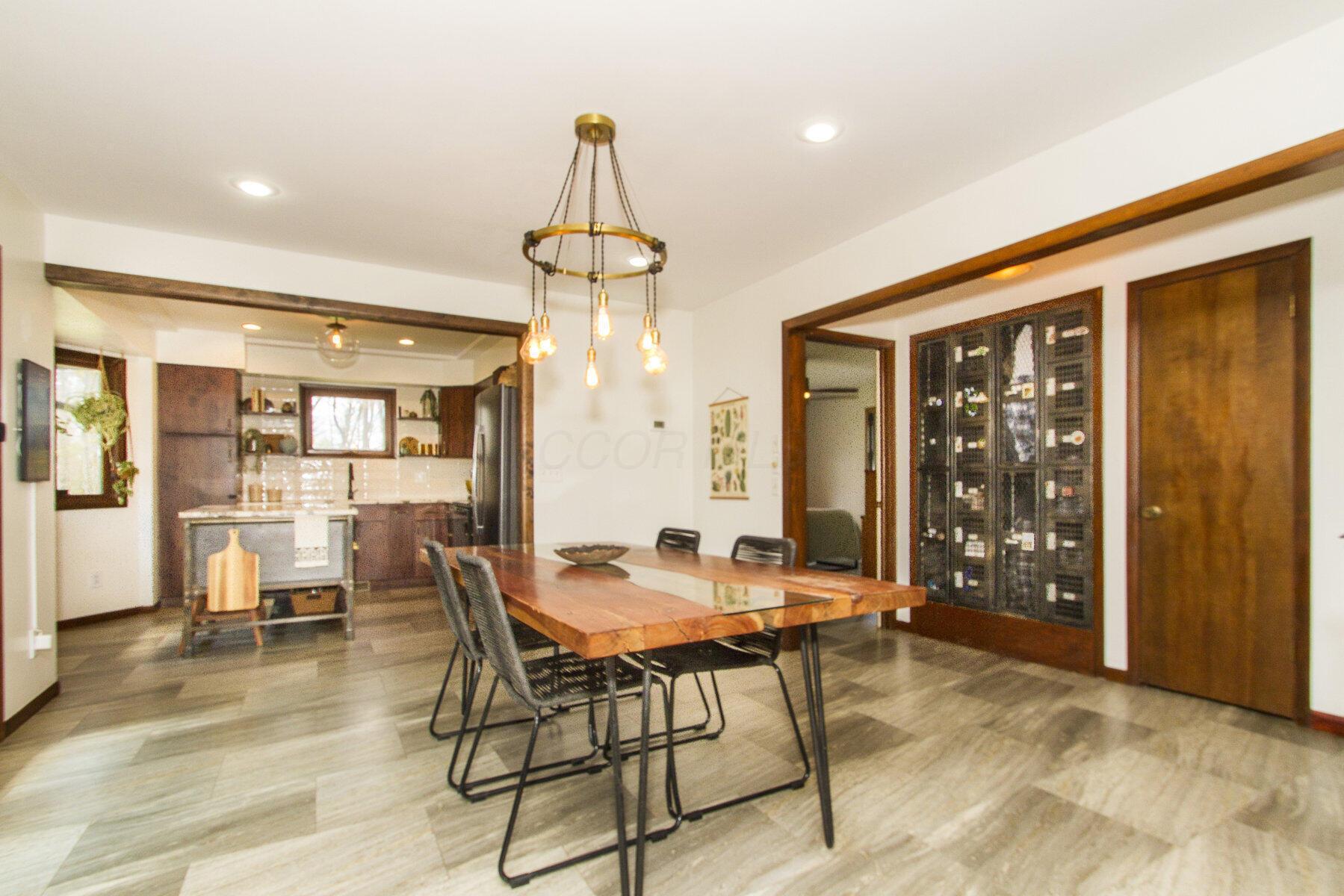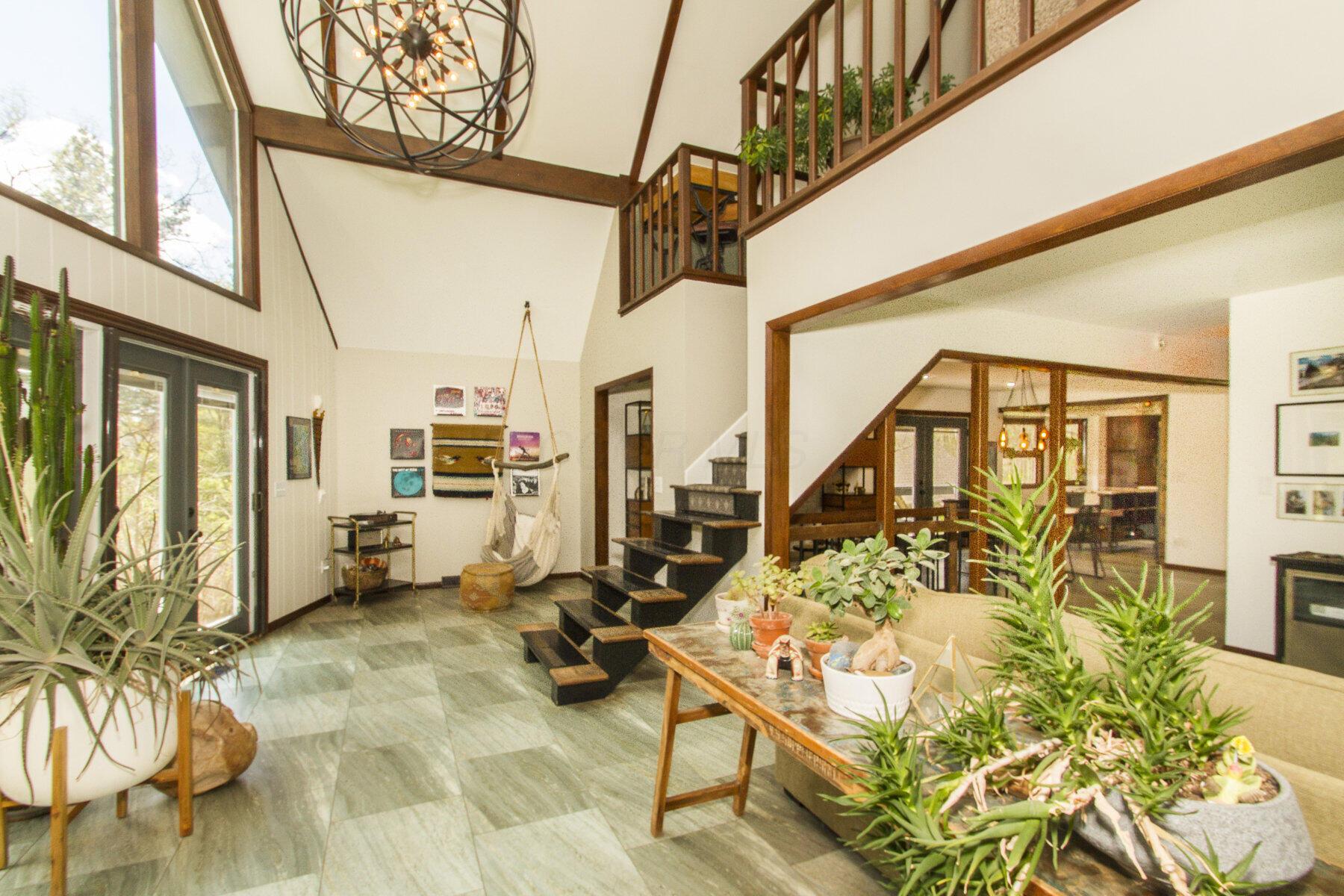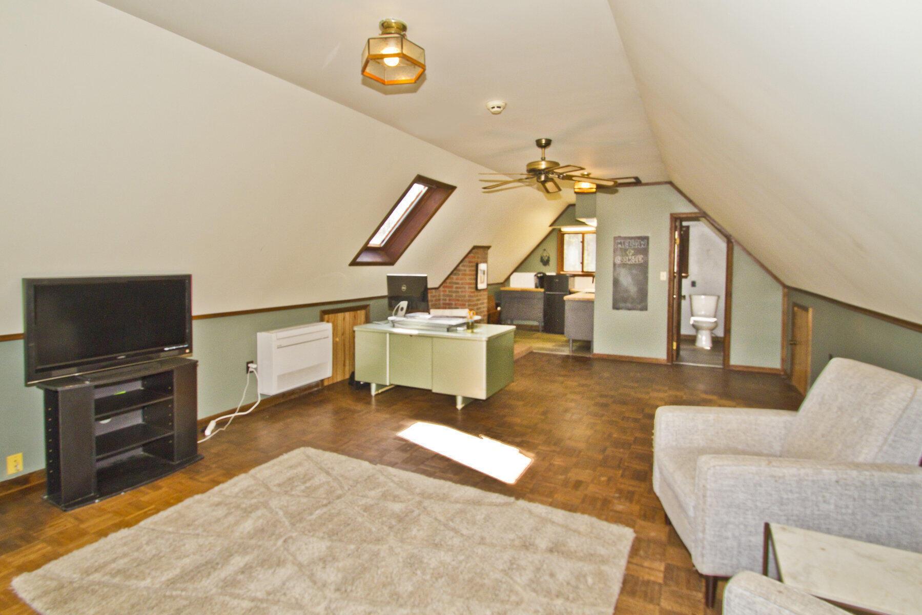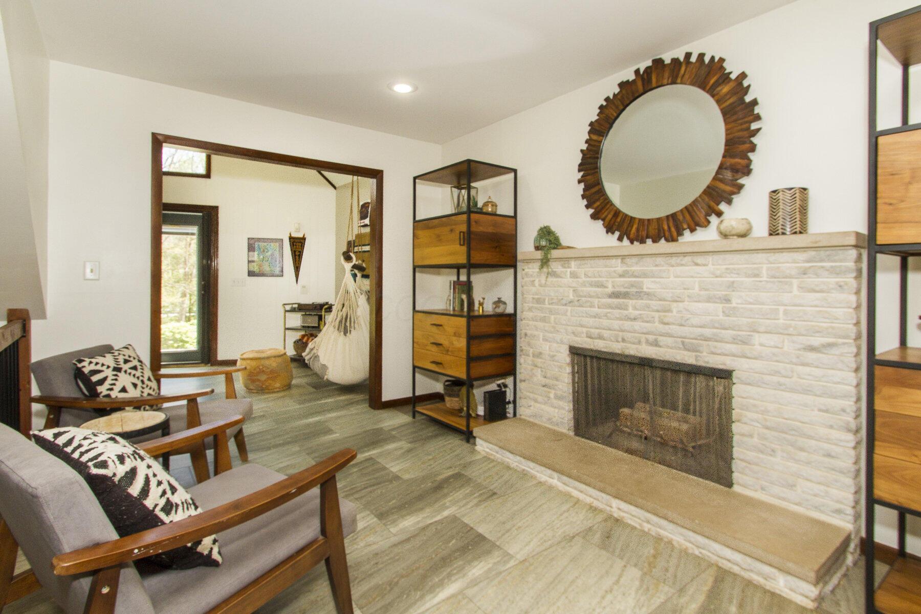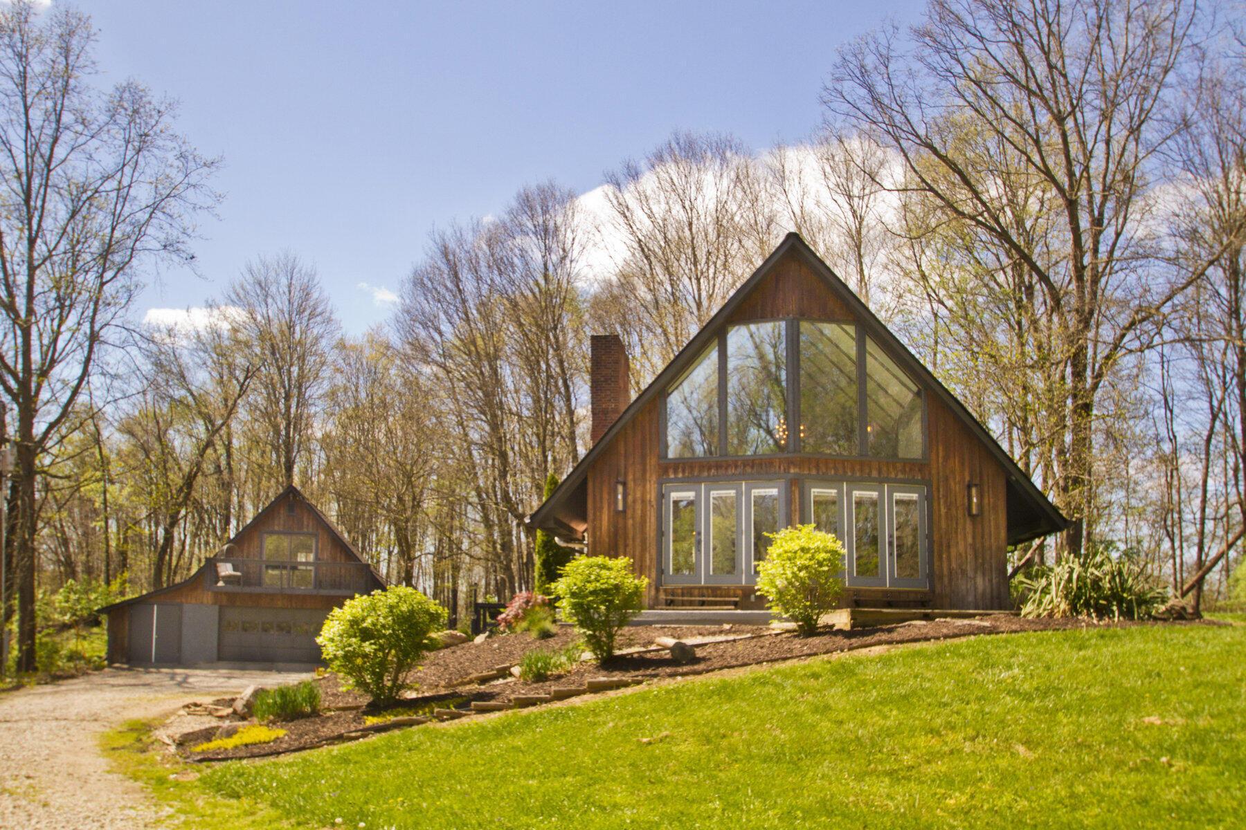 This unique A frame home, located at 3285 Wilson Road, Sunbury, Ohio is situated on a beautiful five-acre wooded lot in the highly desirable Big Walnut school district. The lot is bordered by a stream and has many mature trees throughout and a small pond on the property. The A frame styled home is a 3BD,2.5 BA home with many updates throughout the home. In addition to the home, there is an ADU located above the two-car detached garage, with a full bath and kitchenette area perfect for an additional living space or home office.