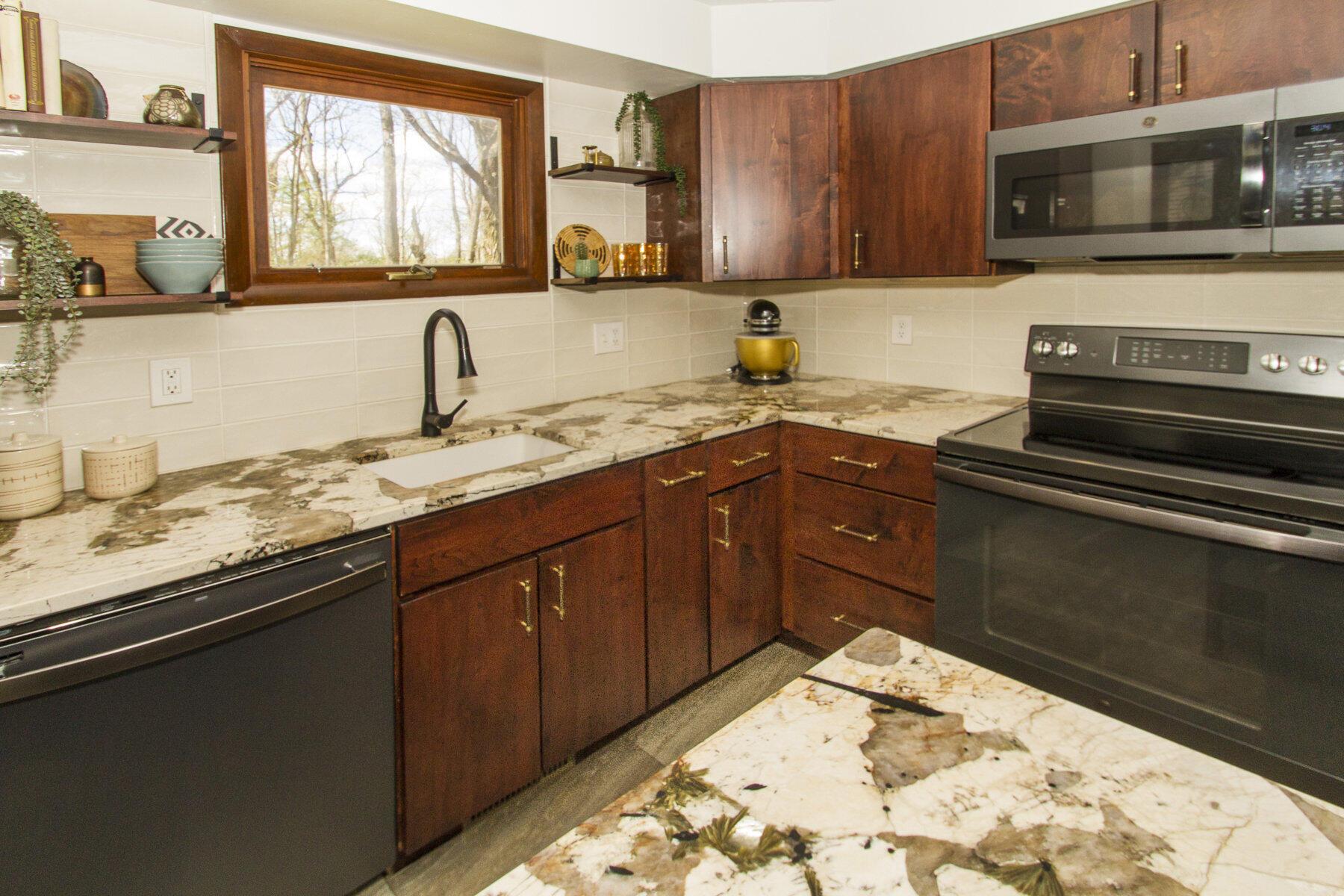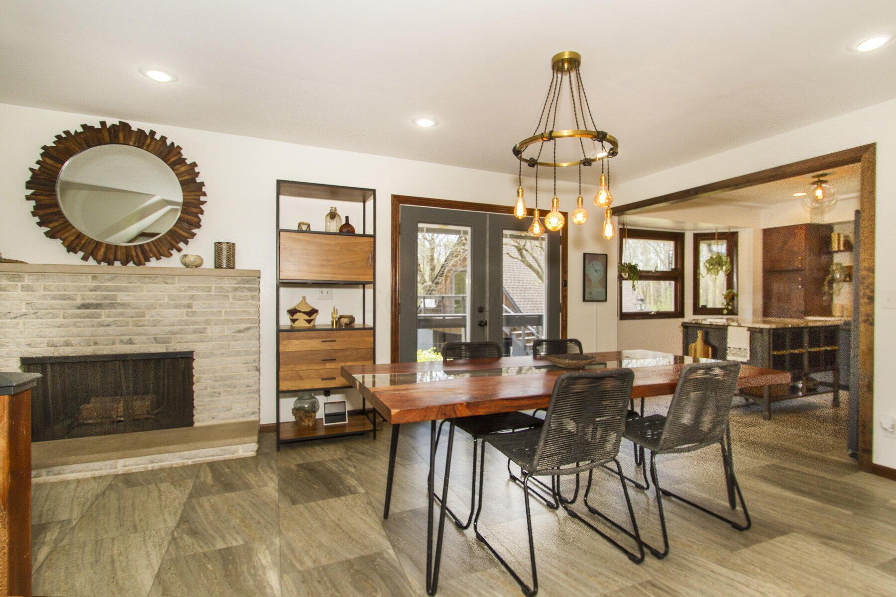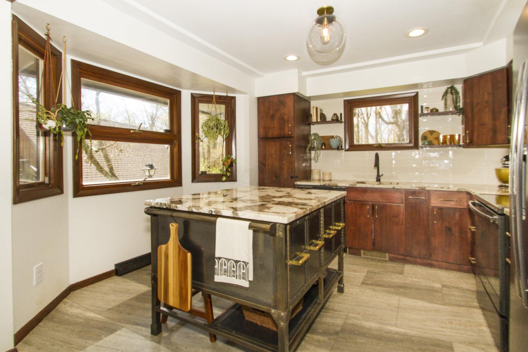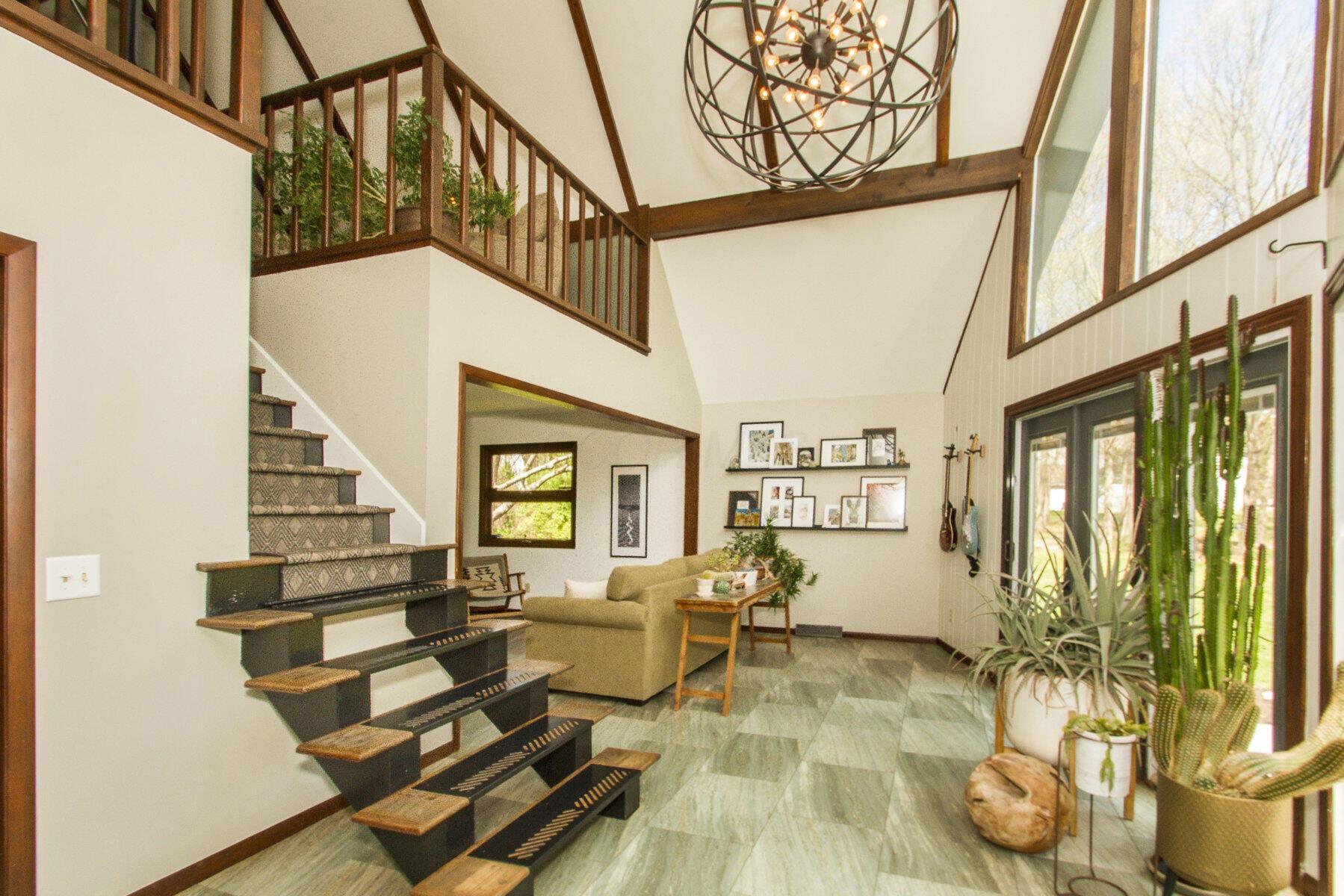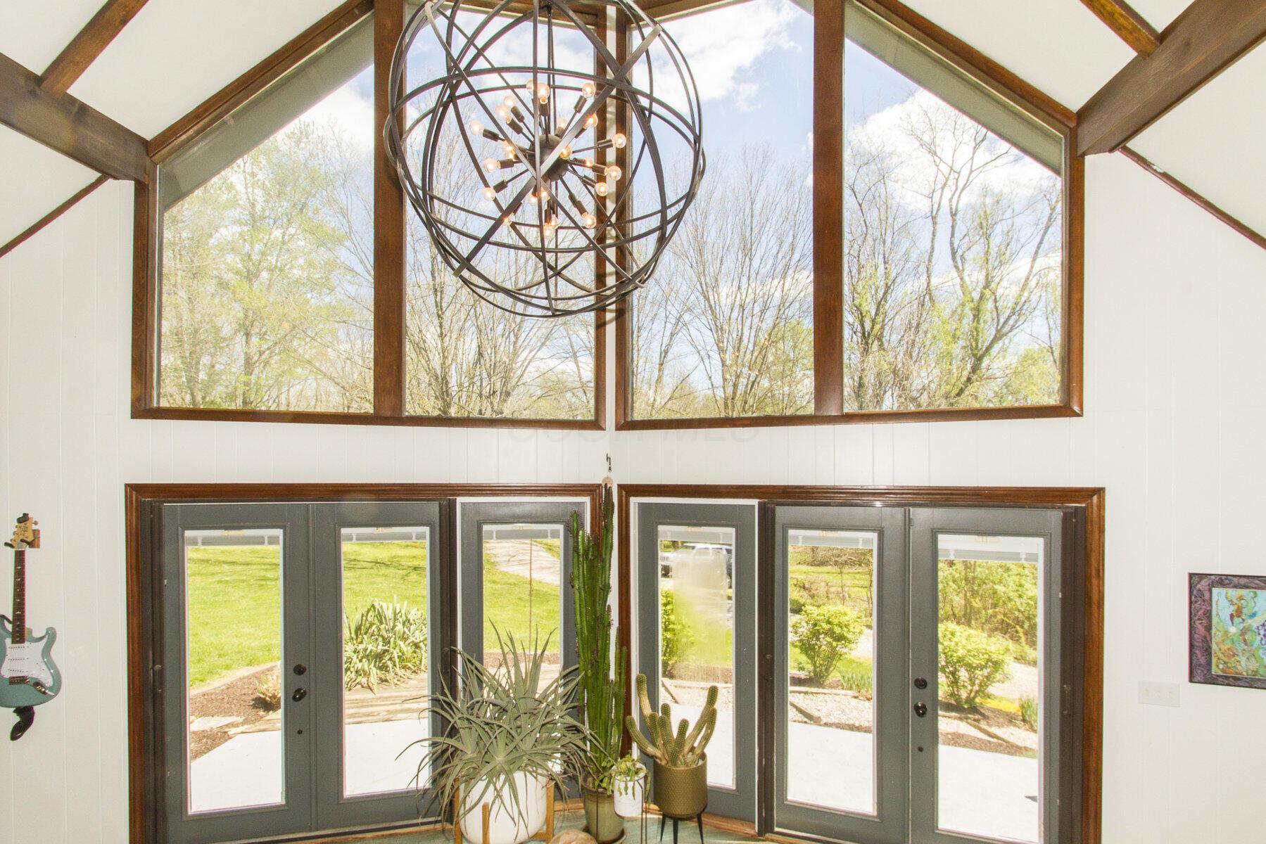 This unique A frame home, located at 3285 Wilson Road, Sunbury, Ohio is situated on a beautiful five-acre wooded lot in the highly desirable Big Walnut school district. The lot is bordered by a stream and has many mature trees throughout and a small pond on the property. The A frame styled home is a 3BD,2.5 BA home with many updates throughout the home. In addition to the home, there is an ADU located above the two-car detached garage, with a full bath and kitchenette area perfect for an additional living space or home office.