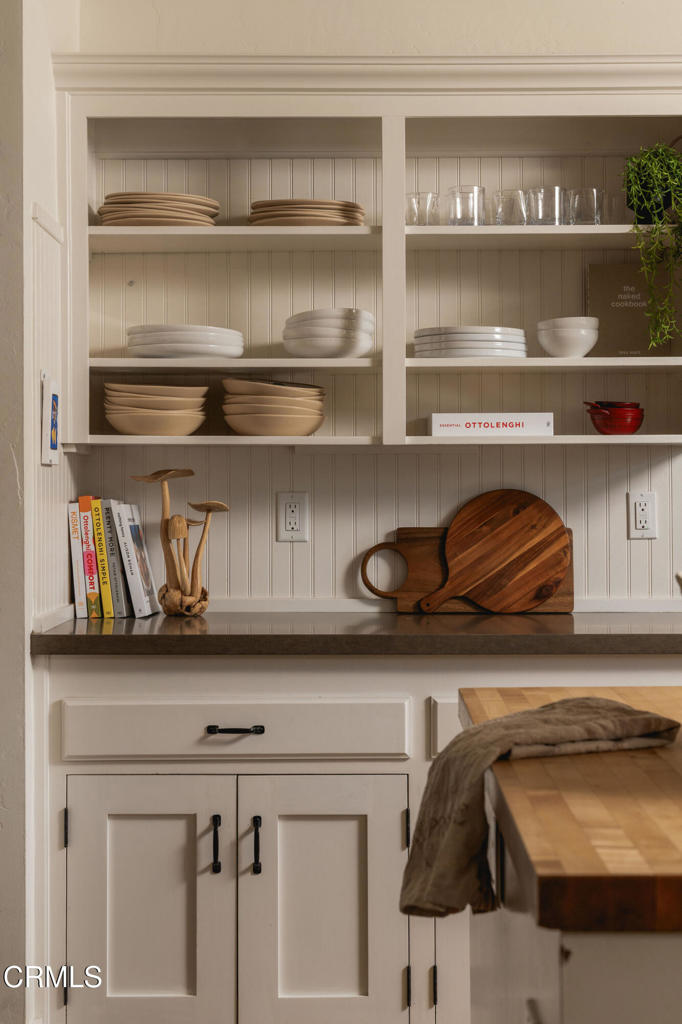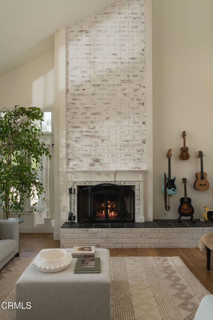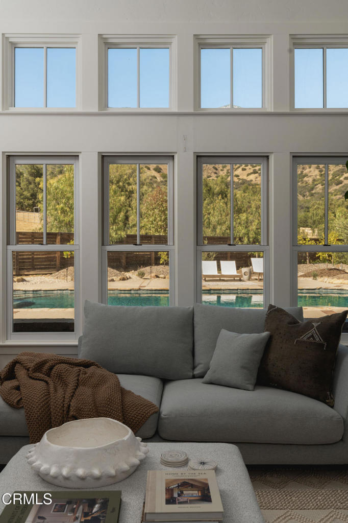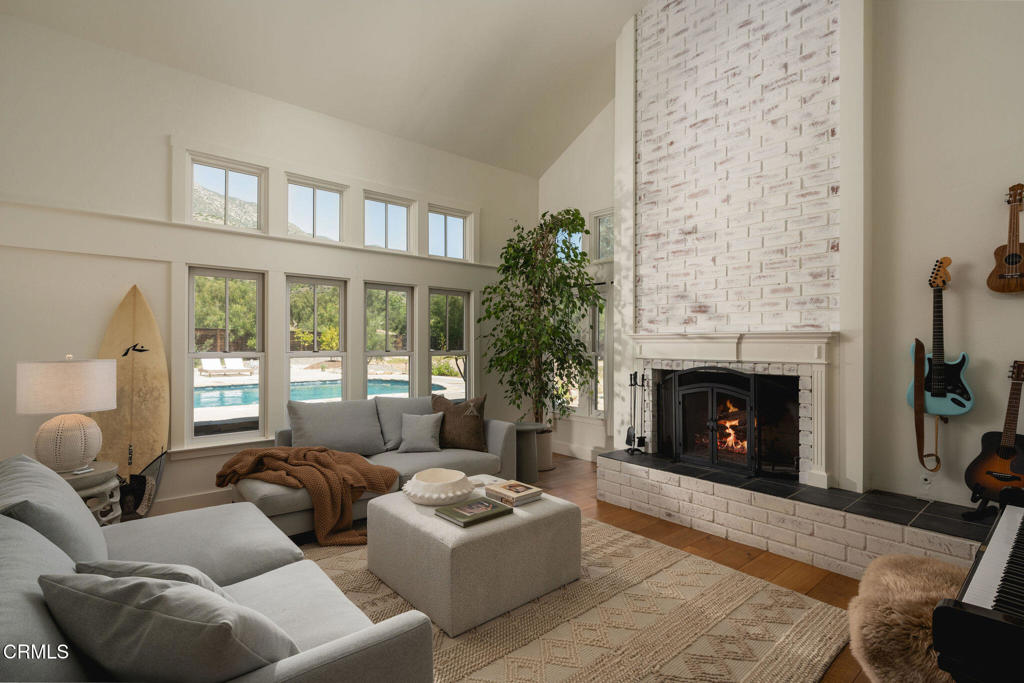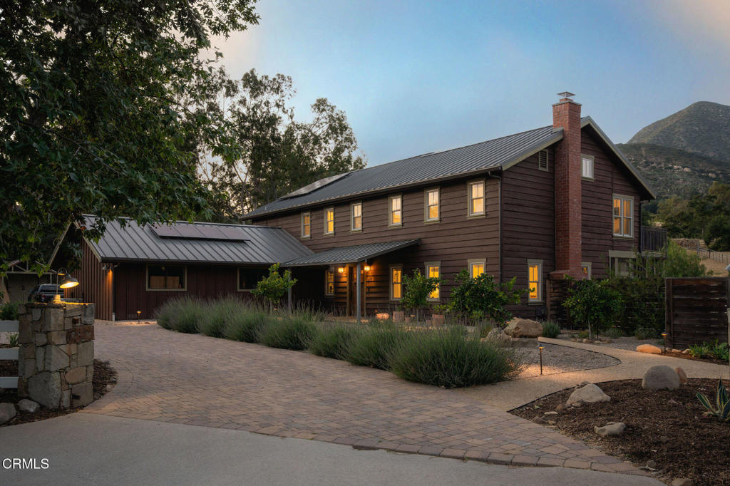 A timeless farmhouse sits on an acre of land against the mountains, where an unobstructed view, towering sycamores, and a profound sense of peace welcome you home. Designed by Ojai's beloved architect Zelma Wilson, craftsman details and farmhouse warmth anchor this handsome home at the top of the coveted Del Oro circle.Inside, a high-ceilinged foyer opens the home in every direction. Straight ahead, the formal living room is anchored by a magnificent, nearly two-story fireplace and connected to a gracious dining room. To the left, a chef's kitchen -- appointed with a Wolf range, Sub-Zero refrigerator, stone countertops, and walk-in pantry -- shares the space with an inviting family room. To the right, a spacious fifth bedroom offers maximal versatility on the main floor, complete with its own fireplace and screened porch. Upstairs, four ample bedrooms and a primary suite offer sweeping mountain views. Outside, the property has been transformed with intention. New flagstone hardscape and lavender-lined decomposed granite pathways wind through a landscape of California natives -- ceanothus, manzanita, sage varietals, and succulents. A veritable orchard rounds it all out, bearing Hass and Reed avocados, Meyer lemon, Australian finger lime, Cara Cara and blood oranges, Pixie mandarins, Ruby Red grapefruit, Black Mission figs, and Asian pear. Rooftop solar and two Tesla batteries provide an extra provide an extra layer of efficiency and security. Gazing toward the mountains, the pool and spa are an utterly romantic gathering place and the beginning of great things to come. The stone deck opens to an exceedingly usable, as yet undeveloped portion of the parcel -- ideally configured for a pool house, ADU, pickleball court, garden, barn, or all of the above. This exceptional home is fully appointed, and remains full of possibility.