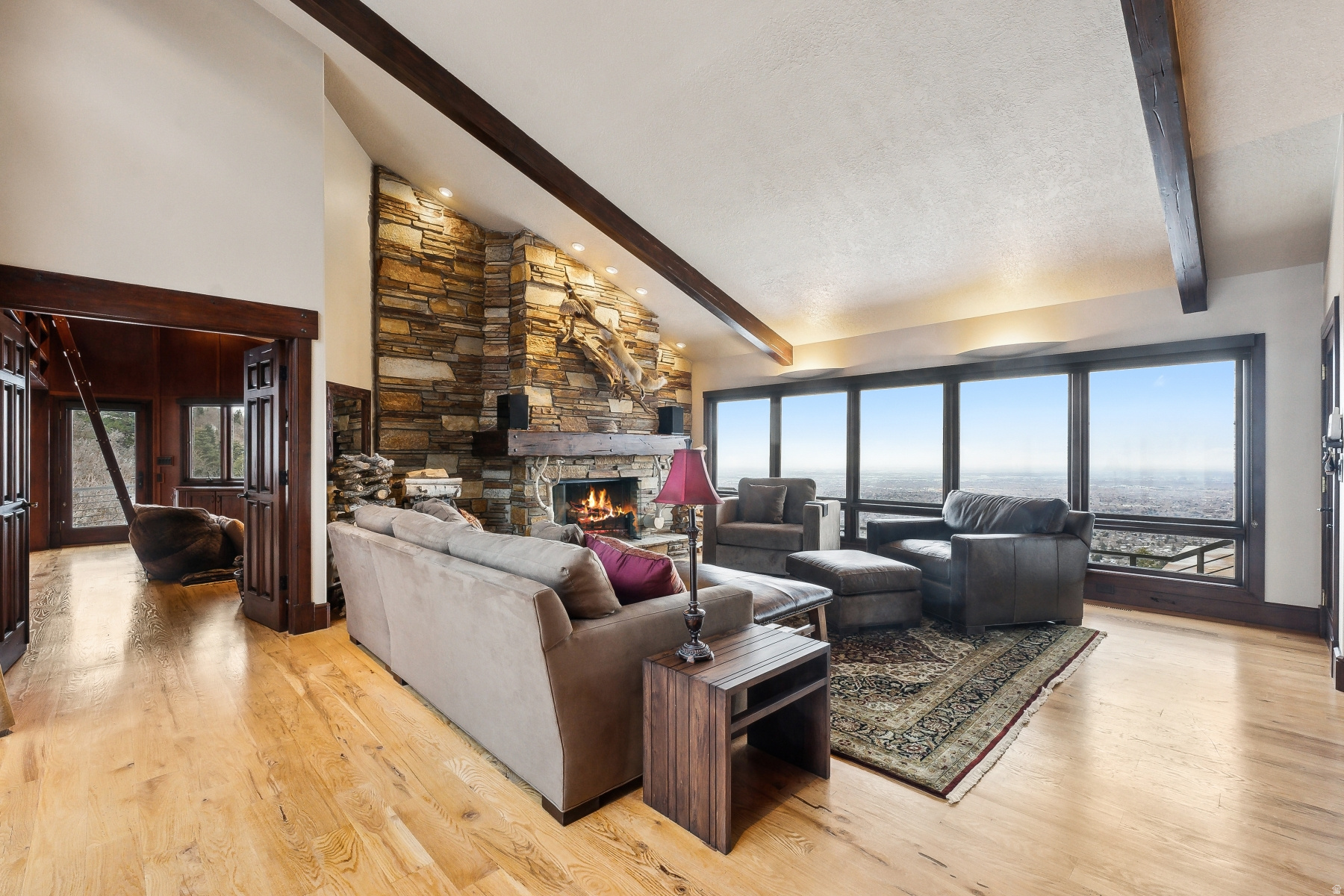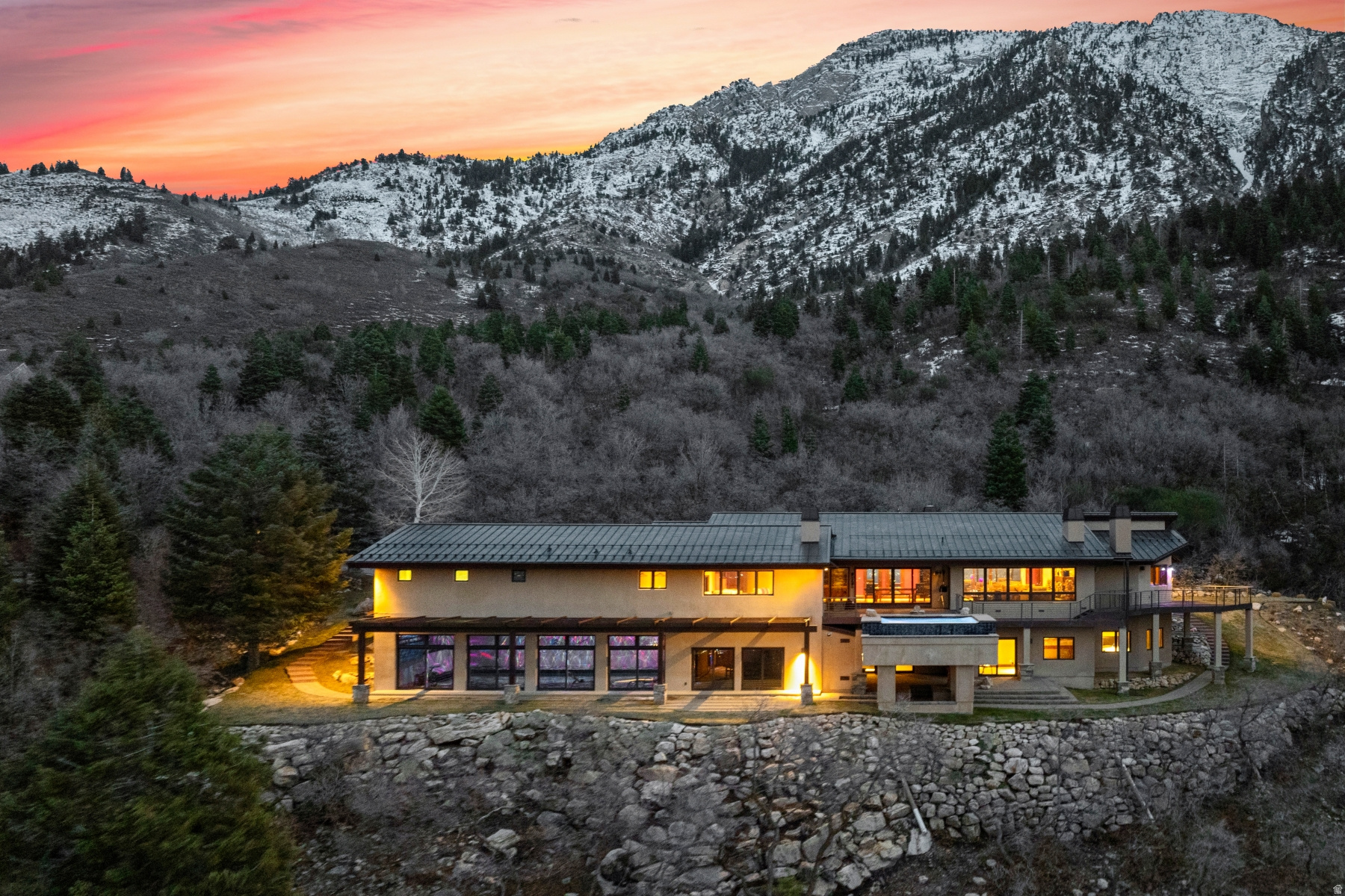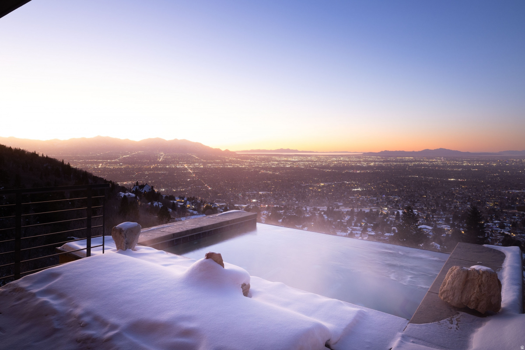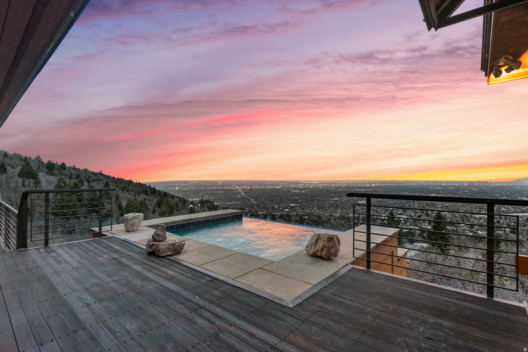 Nestled on a secluded 1.42 acre lot, this gated mountain retreat on Zarahemla Drive is a one of a kind property that you won't want to miss. The soaring windows offer breathtaking views and an abundance of natural light, making this residence a true sanctuary. Step inside and be immediately captivated by the rich, handcrafted woodwork that adorns every corner, from the wood beams in the vaulted ceilings to the custom cabinetry in the entertainers kitchen. Every sunset in this home makes you feel like you're on vacation. Through the sliding glass doors you will find your private deck, where nature and luxury living meet. Unwind in the stunning infinity hot tub, perfectly positioned to offer uninterrupted, panoramic views of the surrounding mountains and city skyline - where the sunsets are unmatched anywhere in Olympus Cove. Each evening the sky transforms into an unforgettable panoramic display, painting the sky in changing hues that must be seen to be believed. The primary suite features its own fireplace and en-suite bathroom with a deep walk in closet. The open-concept floor plan is designed for both entertaining and relaxed living. The large stone fireplace in the great room sets the tone for winter nights, while the wall of windows brings the beauty of the mountains indoors. On the lower level, an indoor 32 ft. heated pool and spa allowing year-round enjoyment and sweeping views of the entire valley, complemented by a fully equipped wet bar, a ping pong table, pool table room and a fireplace. Three additional bedrooms and bathrooms on this level will accommodate your needs. The private lane with a heated driveway and three-plus car garage is perfect for storing your cars and bikes. The maintenance free copper roof and chimneys add lasting durability to this exceptional home. With breathtaking views, exceptional craftsmanship, and sophisticated design, this home defines mountain living at its finest.
