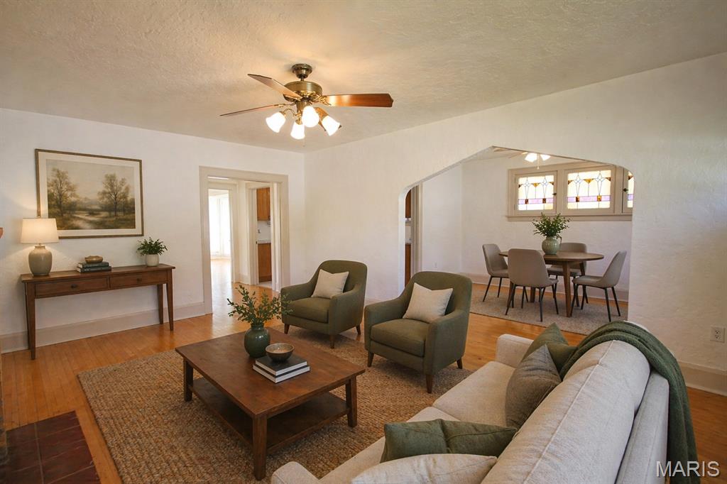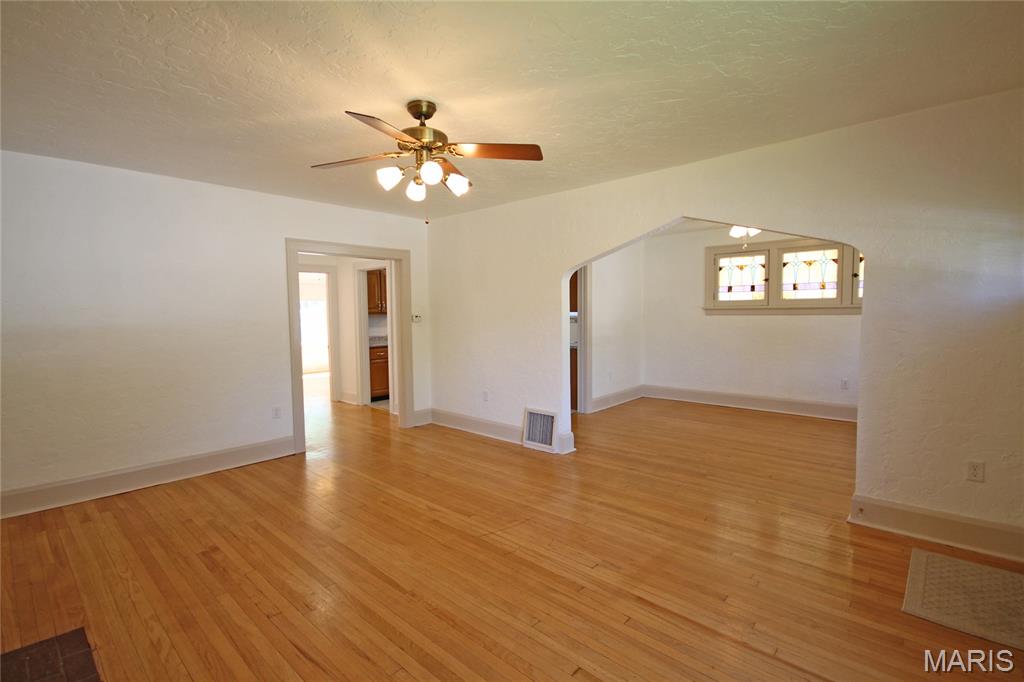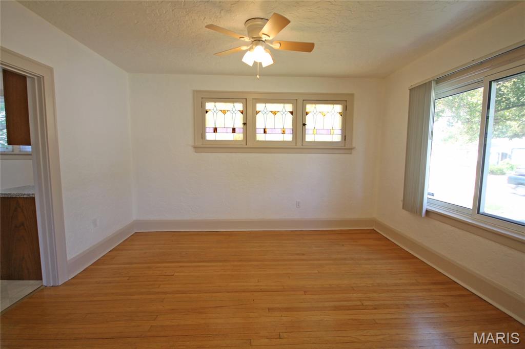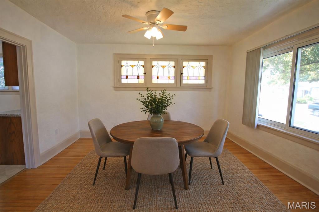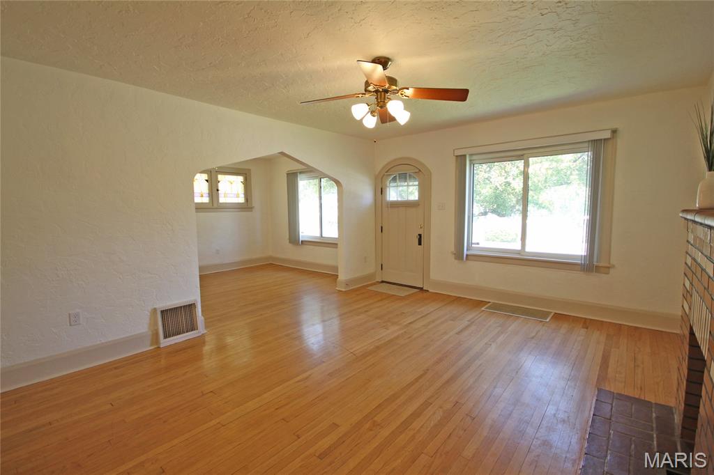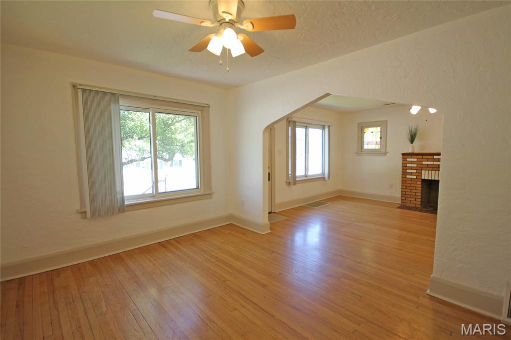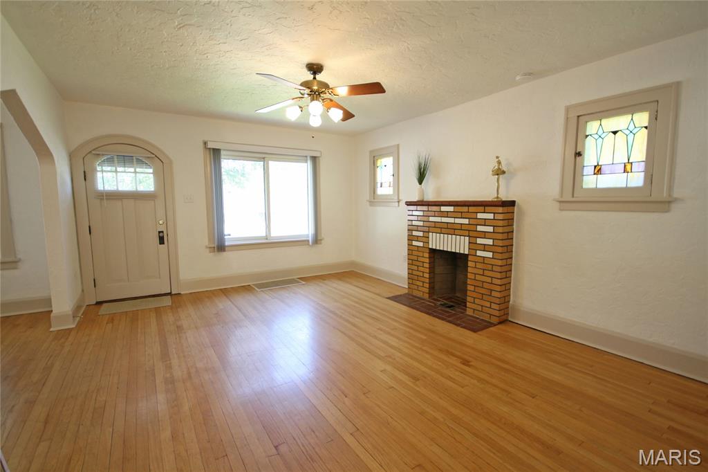 This attractive brick bungalow blends timeless curb appeal with comfortable interior spaces and the bonus of a large garage. Enter to an open living space featuring warm wood floors and beautiful architectural details, including stained glass windows. Find a fireplace in the living room and ceiling fans in both generously sized living and dining rooms. The kitchen offers plenty of cabinet space for everyday storage. You will delight in the two nicely sized main floor bedrooms with sizable closets, as natural light pours from large windows. Downstairs, the home offers storage and workshop rooms, as well as a clean, versatile space ready to be transformed into additional living or recreation areas. Major updates bring peace of mind with a new high efficiency HVAC system, updated panel, and newer PVC stack. Plus, electricians just updated the wiring throughout the home! Enjoy the outdoors with a fenced back yard, driveway and wide garage with opener. The gem has already passed occupancy and is ready for your enjoyment. Conveniently located with easy access to dining, shopping and schools, it provides a community feeling in one inviting package!
