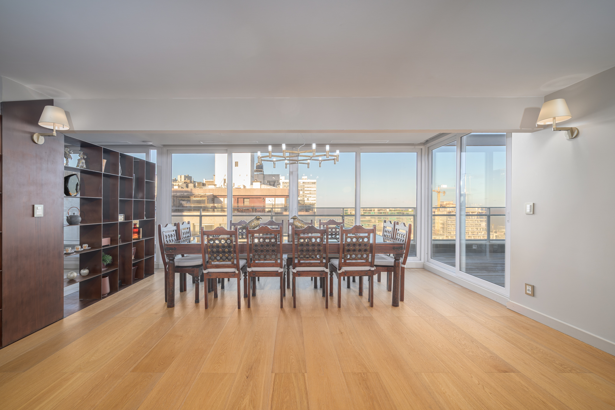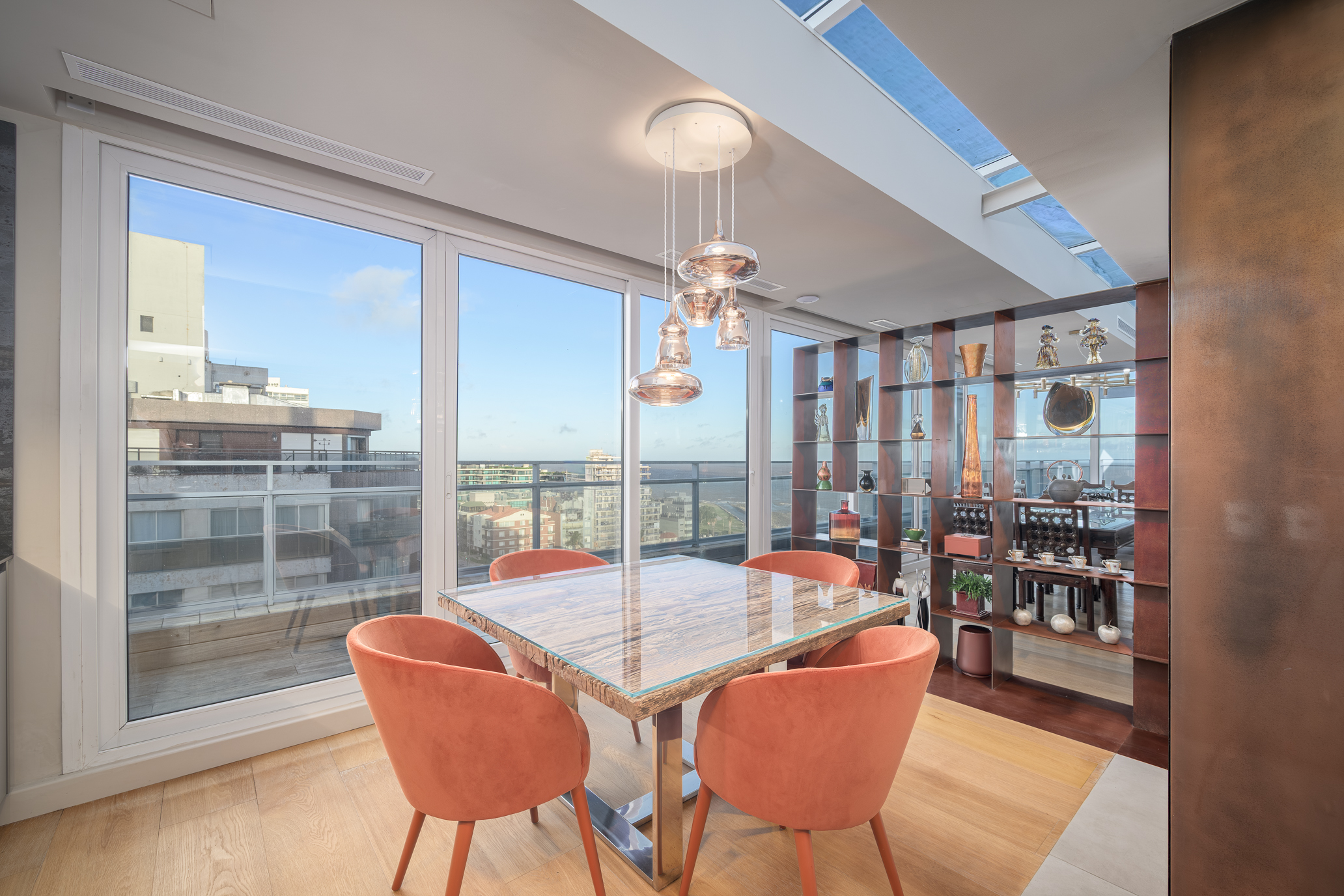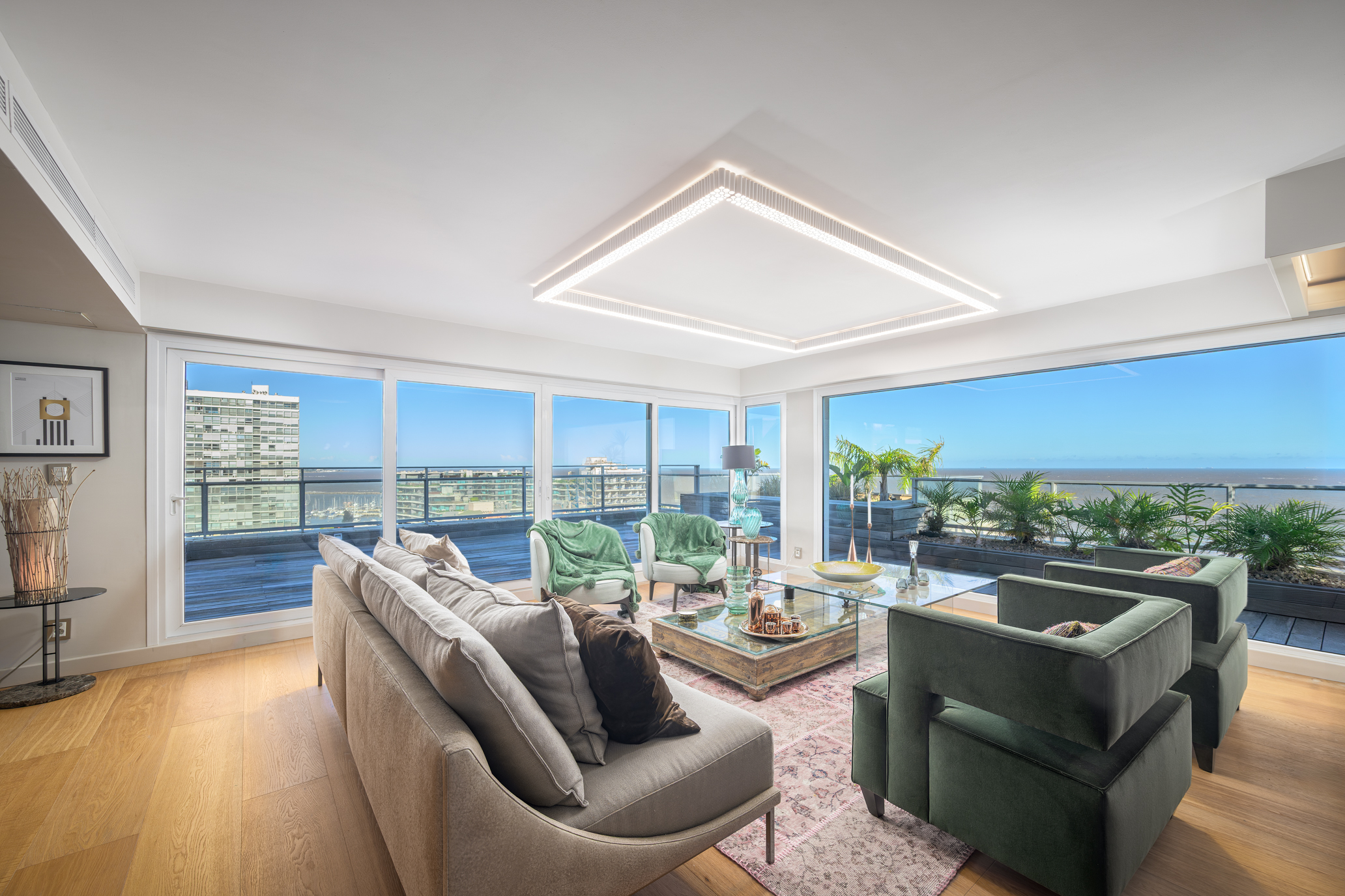 Offering 322 sqm of interior space and 135 sqm of terraces, the property stands out for its generous scale, contemporary design, and uninterrupted views over Pocitos Bay.