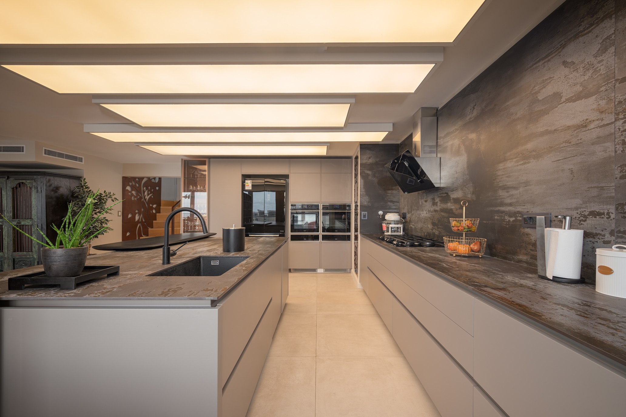 The private quarters include two en-suite bedrooms, highlighted by a distinguished primary suite with a walk-in closet, designed to ensure maximum comfort and privacy.