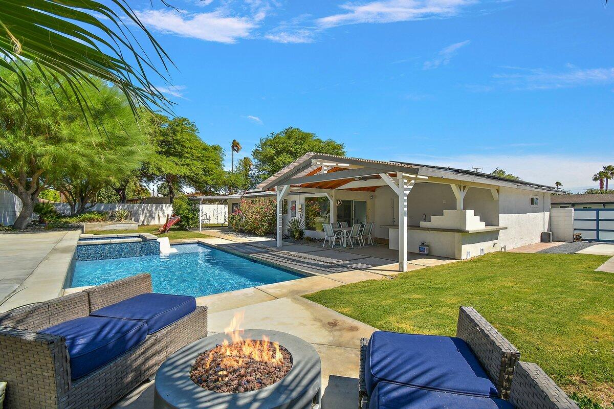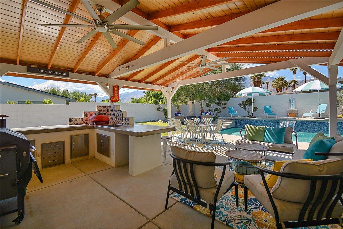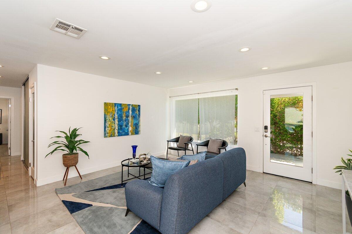 Need a soft landing before you buy or the perfect work-from-home space? This beautifully remodeled 3-bedroom, 2-bath home in Palm Springs is available for a 12-month lease and offers comfort, privacy, and incredible mountain views. Enjoy a spacious, private backyard with a covered patio, built-in BBQ, and a Pebble Tec saltwater pool and spa perfect for relaxing or entertaining. Inside, the home features a bright, open feel with large windows, a modern kitchen with stainless steel appliances and quartz countertops, and clean, updated finishes throughout. Additional perks include a finished 2-car garage, RV parking, solar for energy efficiency, and included refrigerator, washer, and dryer. Pet-friendly with approval. Move-in ready come experience the Palm Springs lifestyle! Home has solar. Great utility savings. Bathroom in garage to service pool.