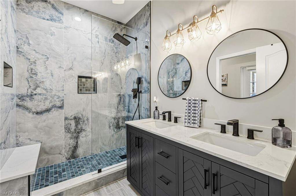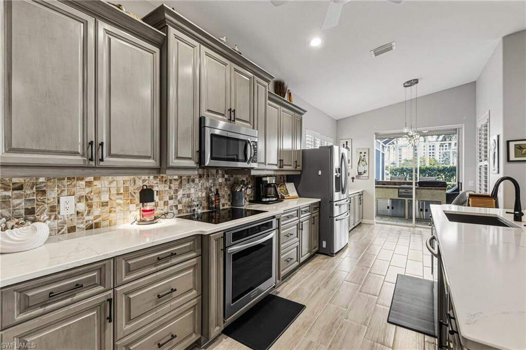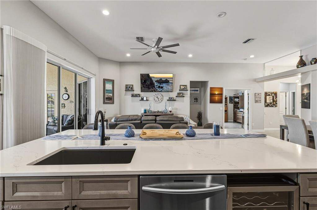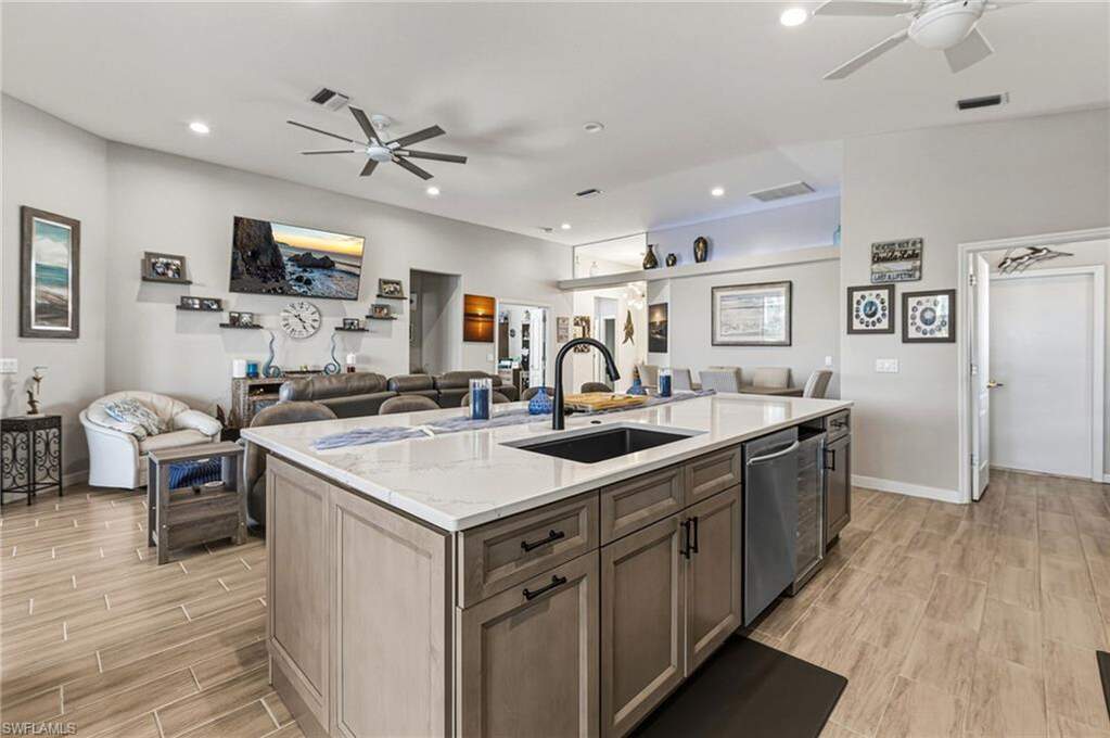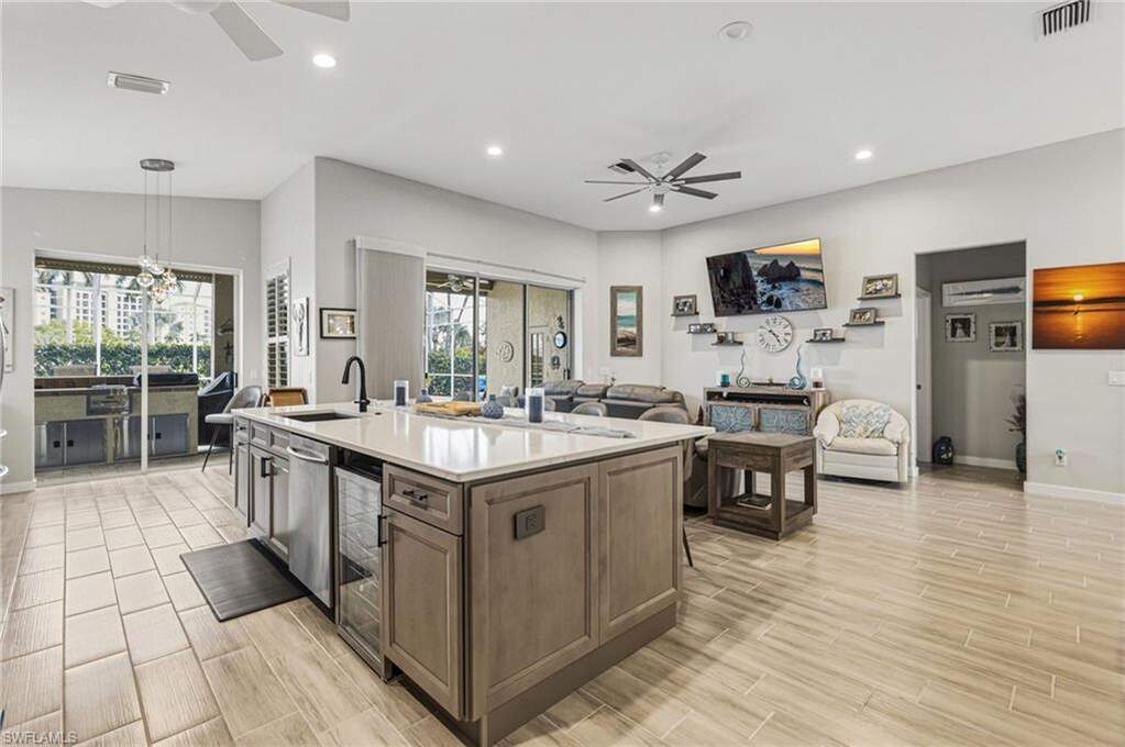 Nestled within the highly coveted enclave of Osprey Point in Gulf Harbour, this exquisitely reimagined residence offers breathtaking lakefront vistas and unforgettable sunset views. Thoughtfully renovated in 2025, this elegant home features two bedrooms plus a versatile den, two full baths, and soaring ceilings that enhance the light-filled, open-concept design. The stunning kitchen has been completely transformed with newly installed custom island cabinetry, designer quartz countertops, an induction cooktop, and premium fixtures including a new sink, faucet, disposal, and air switch. Kitchen is enhanced with a wine fridge. Existing cabinetry has been refinished to perfection, seamlessly blending style and functionality, while a newly designed dry bar adds an element of sophistication ideal for entertaining. Wide-plank flooring and refined base trim flow gracefully throughout the living spaces, including the living room and luxurious primary suite. The spa-inspired primary bath is a true showpiece, featuring all-new plumbing, a beautifully designed walk-in shower, custom vanities, updated fixtures, designer tilework, and premium finishes. The guest bath has been equally elevated with a new tub, vanity, fixtures, and refined detailing. The electrical panel has been thoughtfully upgraded to accommodate a portable generator, ensuring the ability to operate hurricane shutters and maintain essential appliances during power outages. Complete hurricane protection for peace of mind. Outdoor living is equally impressive, with an upgraded pool and expansive deck completed in 2021, complemented by a new pool heater for year-round enjoyment. The outdoor bar offers a refrigerator, perfect for entertaining! This home also offers peace of mind with a new roof and gutters (2024), new A/C system (2025), new hot water tank (2025), professionally cleaned ductwork (2024), and a Halo 5 water softener system installed in late 2025. Every detail of this exceptional property has been carefully curated to deliver a luxurious, move-in-ready lifestyle in one of Gulf Harbour's most desirable communities.