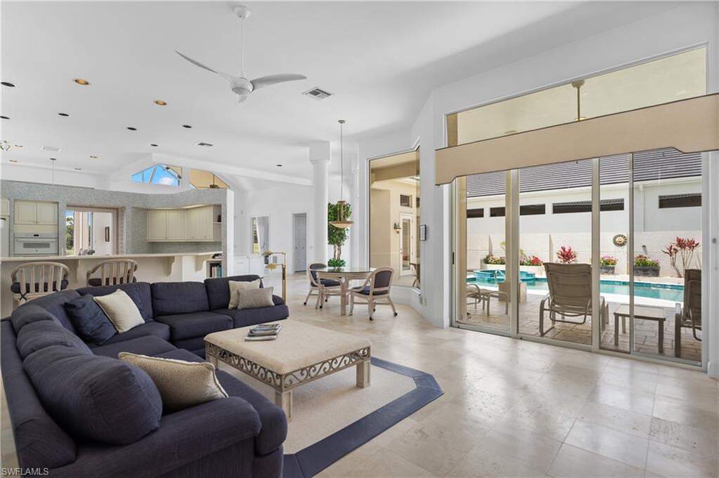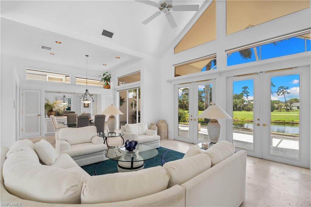 One or more photo(s) has been virtually staged, AI generated or rendered. Residence with spectacular lake and golf course views, ideally located within the coveted Audubon Golf & Country Club in North Naples. Enjoy highly desirable Southern exposure, offering prime sun over pool and breathtaking sunset skies. This nicely maintained home offers 3,002 square feet under air with 4 bedrooms + den, 3 bathrooms, including a private guest cabana. Notable updates include a new roof (2023) and new HVAC system (2024). Inside, vaulted ceilings and expansive windows fill the home with natural light, creating a bright and inviting atmosphere throughout. French doors open to a spacious screened lanai with a picture screen enclosure, perfectly framing unobstructed lake and golf course views. An additional private outdoor retreat awaits in the courtyard, featuring a pool and spa with ample lounging space-ideal for relaxing or entertaining in total privacy. The primary suite offers picturesque views, private lanai access, and a beautifully renovated spa-like bath complete with dual vanities and a large walk-in shower with multiple showerheads, along with direct access to the pool area. The private guest house is perfect for hosting family and visitors, featuring a bedroom, bathroom, kitchenette with a small refrigerator, and an upstairs loft ideal for an additional bedroom or living space. Ideally located just minutes from Mercato and Naples' world-class beaches, Audubon offers a prestigious gated and guarded lifestyle with an 18-hole championship golf course, tennis, pickleball, three new regulation-length bocce courts with a spacious seating area, a new croquet court with seating, a scenic bayside boardwalk, and a poolside club and cafe featuring a beautifully appointed fitness center. The main clubhouse is currently undergoing extensive renovations.