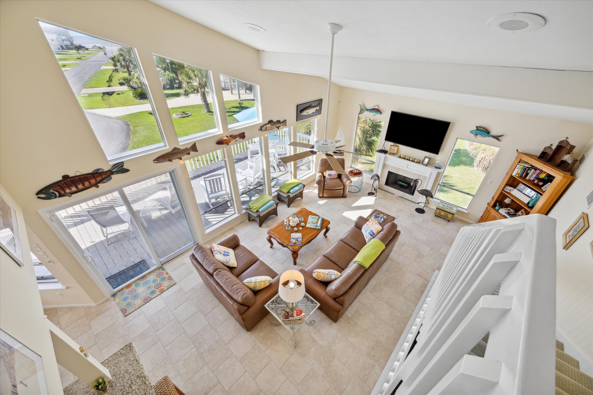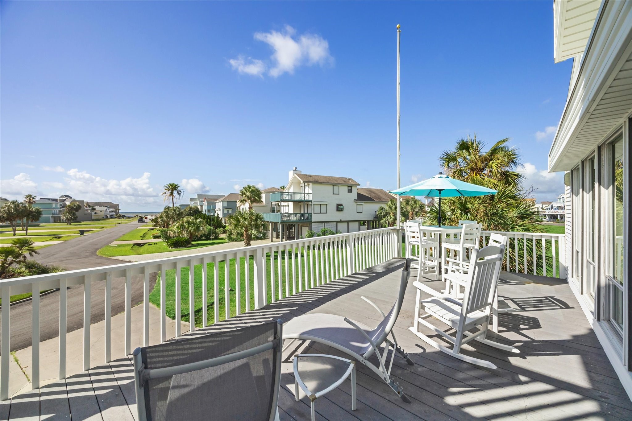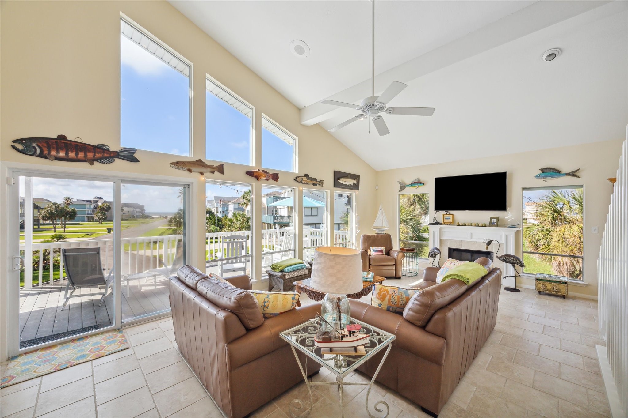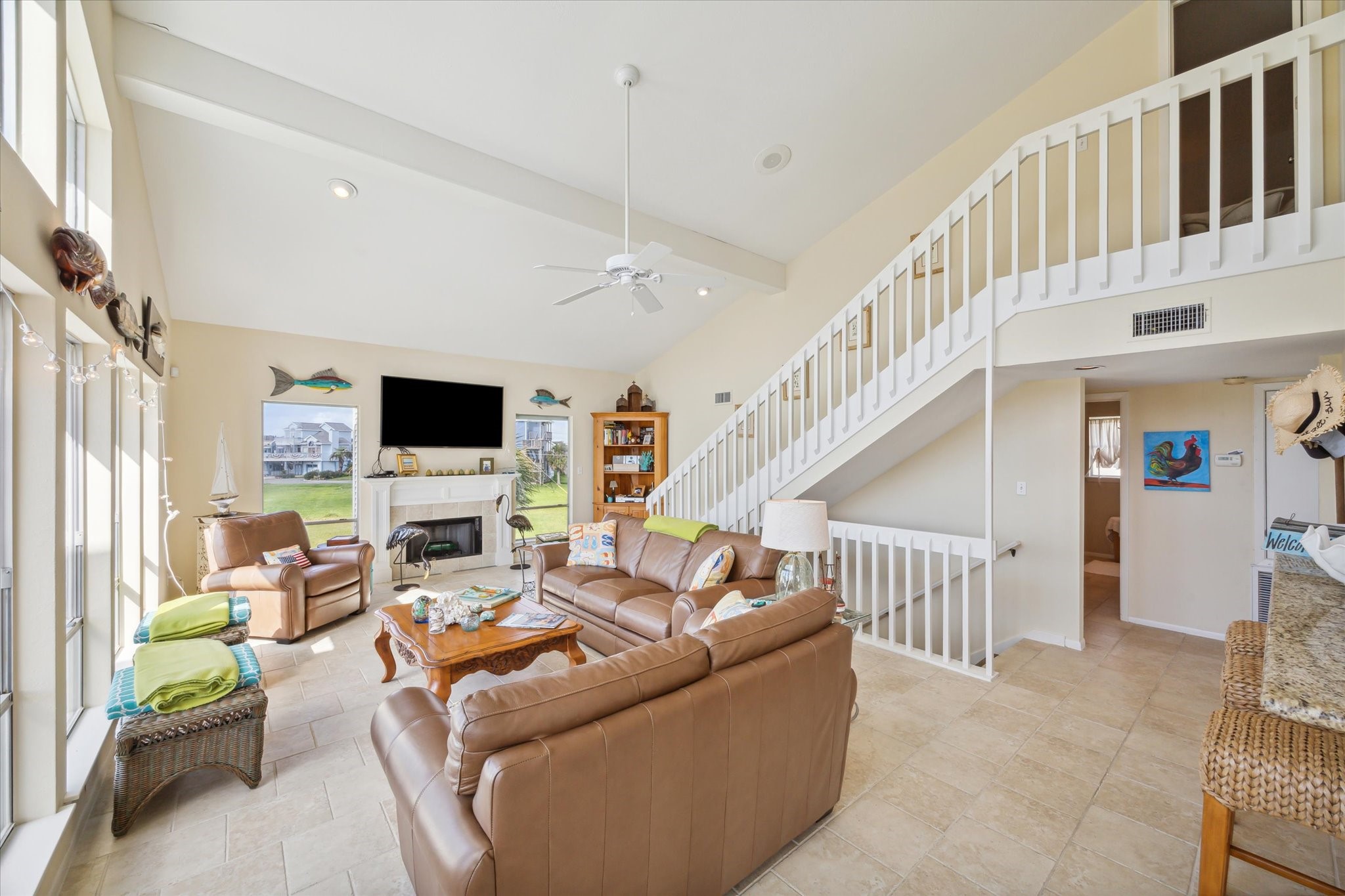 Welcome to Paradise! Spectacular beach views from inside the house and from the decks at this updated two-story located on an oversized cul-de-sac lot in Pirates Beach! High ceilings and an open floor plan contribute to the coastal feel, while walls of windows showcase the views of the Gulf. Loaded with natural light, the main level features the living room with a woodburning fireplace, dining, and a truly updated kitchen, plus two guest bedrooms and an updated full bath. Upstairs is the primary bedroom with a large, updated bath plus an additional guest bedroom / second primary bedroom with an updated full bath. The lot next door is also for sale, to be sold separately, and the mandatory Galveston Country Club social membership conveys. There are electric storm shutters plus an electric exterior lift. NEW roof and 2 HVAC 2026! A very special place to call home.