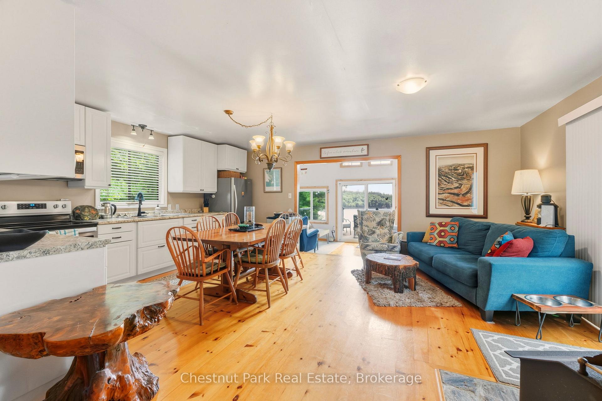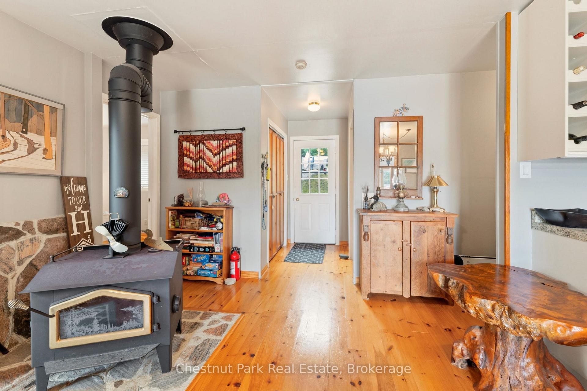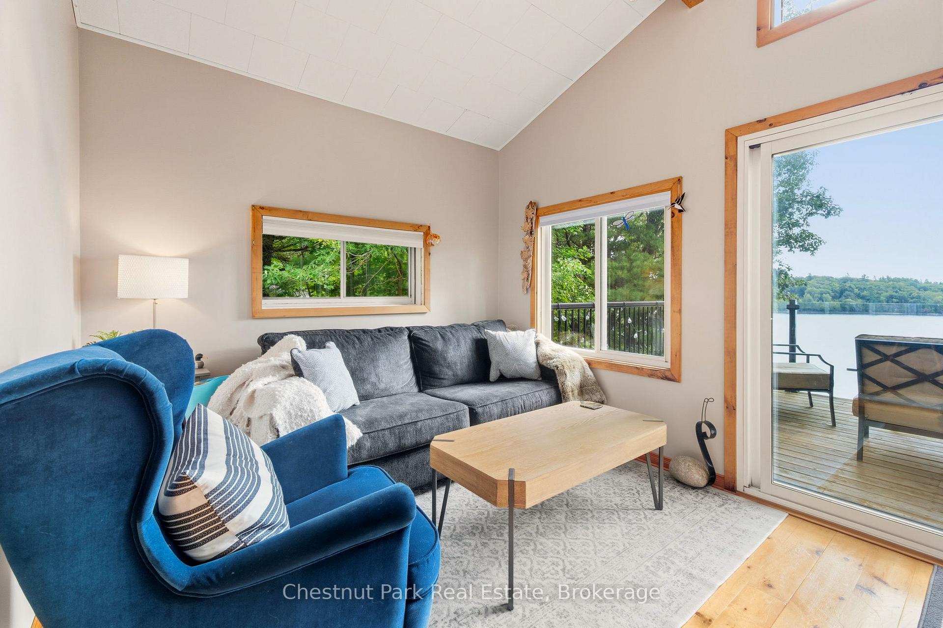 Tucked along a private, tree-lined shoreline, this lakefront retreat makes an unforgettable first impression - sweeping lake views greet you the moment you step through the front door. An elevated setting delivers wide-open vistas across a calm, tucked-away bay, while a wraparound deck with glass railings frames the scenery without interruption. A winding path leads to a lakeside fire pit perfectly positioned for those legendary cottage country sunsets. At the water's edge, a sandy beach, on-land decking, and a large floating dock with deep water access create an ideal playground for boaters and swimmers of all ages - everything you could want from a true Ontario waterfront. Inside, the open-concept living area sets a warm and welcoming tone with hardwood floors, a wood-burning stove, and large windows that flood the space with natural light. The updated kitchen offers stainless steel appliances and generous storage, flowing seamlessly into a family room that captures the very essence of cottage living - wraparound windows, walkout deck access, and panoramic water views that make every moment feel like a getaway. Two bedrooms complete the main cottage. A newly built bunkie thoughtfully extends your guest capacity, featuring a primary bedroom, a bunkbed room separated by pocket doors, its own three-piece bath, and plenty of natural light throughout - ideal for families with kids or visiting guests who deserve their own space. Private, picturesque, and move-in ready, this is a rare opportunity to plant roots in Ontario's premier cottage country.