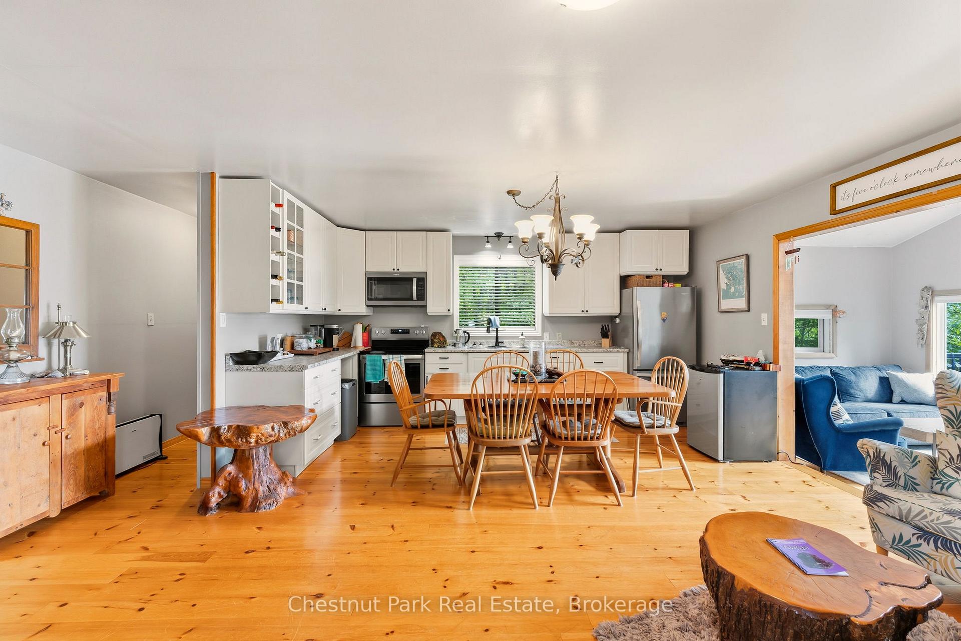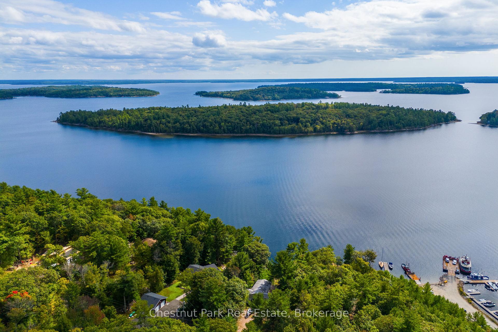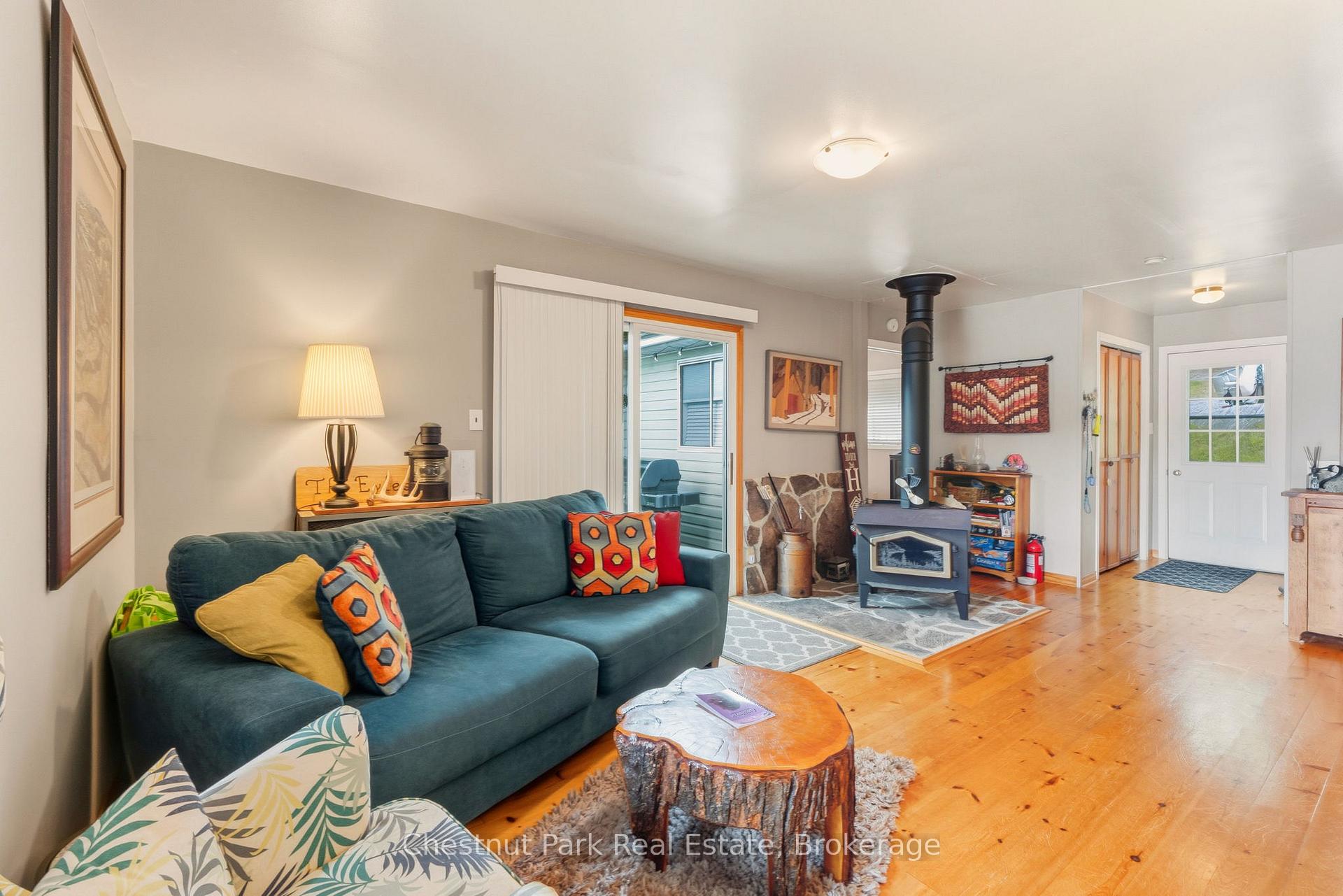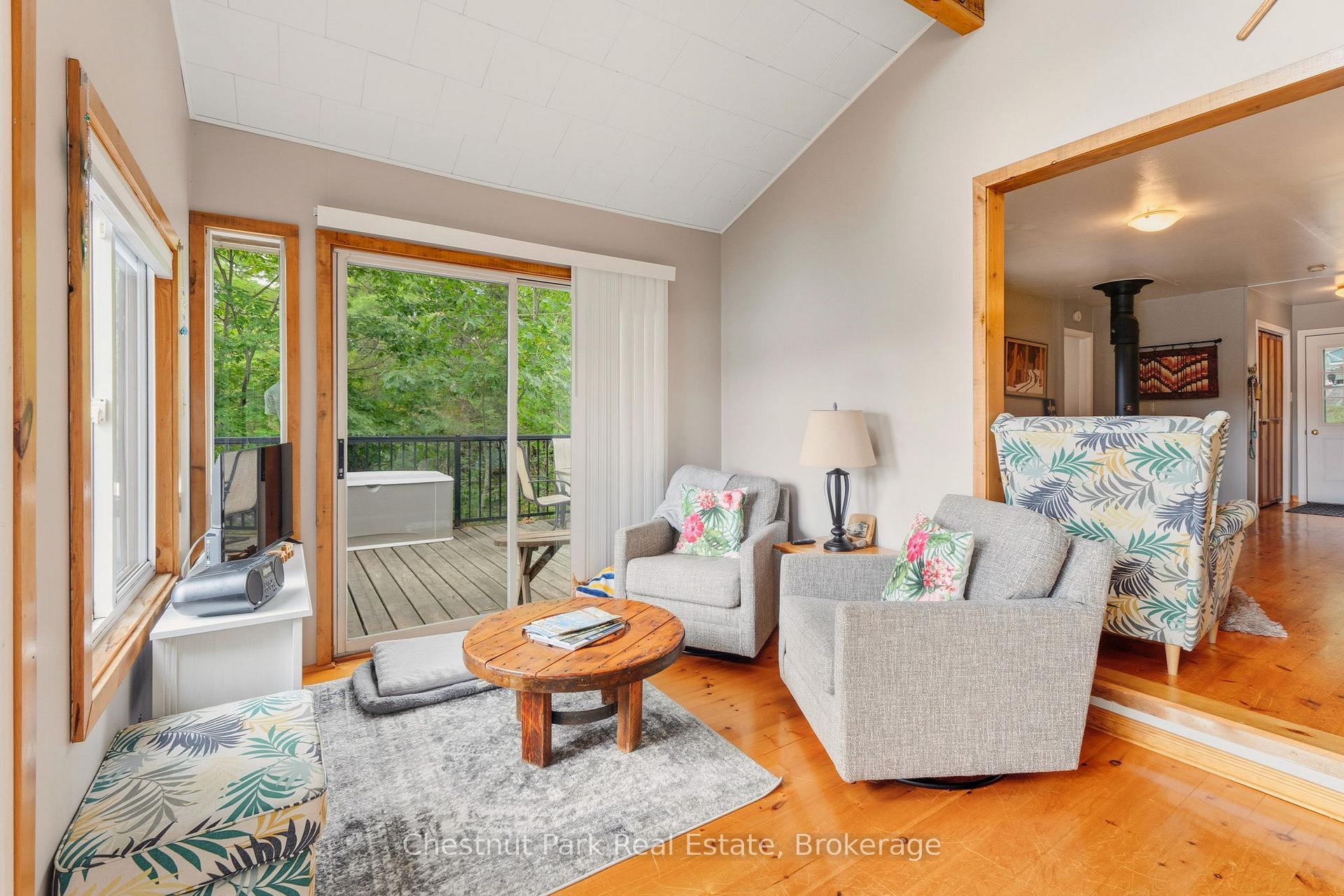 Tucked along a private, tree-lined shoreline, this lakefront retreat makes an unforgettable first impression - sweeping lake views greet you the moment you step through the front door. An elevated setting delivers wide-open vistas across a calm, tucked-away bay, while a wraparound deck with glass railings frames the scenery without interruption. A winding path leads to a lakeside fire pit perfectly positioned for those legendary cottage country sunsets. At the water's edge, a sandy beach, on-land decking, and a large floating dock with deep water access create an ideal playground for boaters and swimmers of all ages - everything you could want from a true Ontario waterfront. Inside, the open-concept living area sets a warm and welcoming tone with hardwood floors, a wood-burning stove, and large windows that flood the space with natural light. The updated kitchen offers stainless steel appliances and generous storage, flowing seamlessly into a family room that captures the very essence of cottage living - wraparound windows, walkout deck access, and panoramic water views that make every moment feel like a getaway. Two bedrooms complete the main cottage. A newly built bunkie thoughtfully extends your guest capacity, featuring a primary bedroom, a bunkbed room separated by pocket doors, its own three-piece bath, and plenty of natural light throughout - ideal for families with kids or visiting guests who deserve their own space. Private, picturesque, and move-in ready, this is a rare opportunity to plant roots in Ontario's premier cottage country.