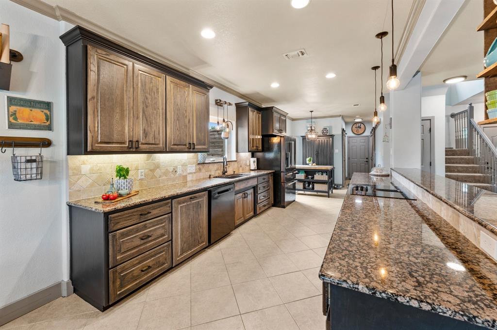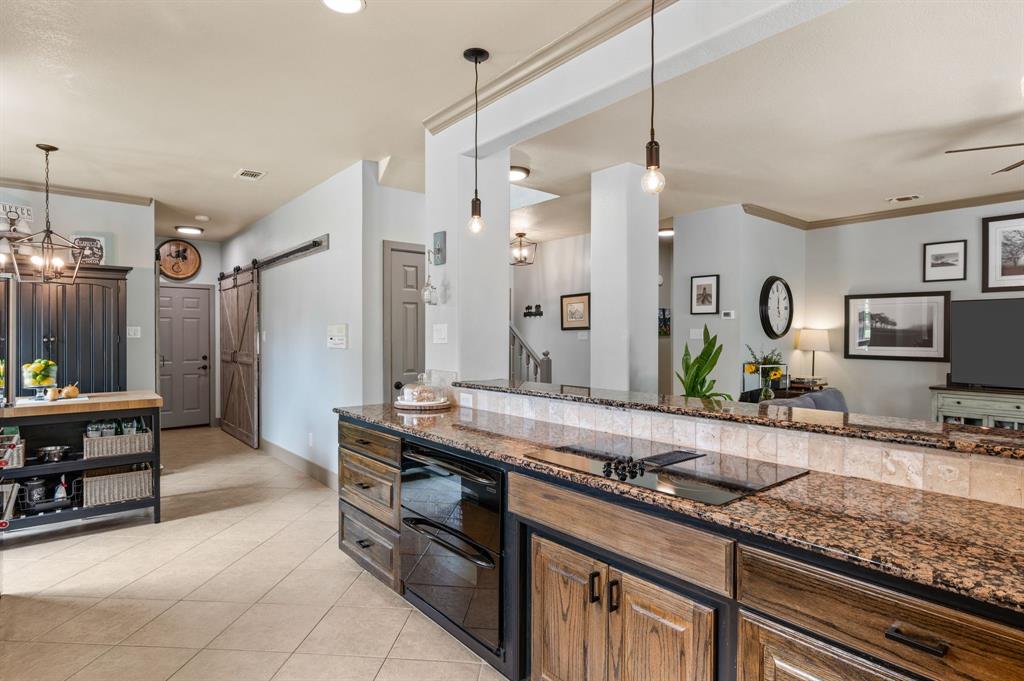 This stunning farmhouse-style property is located on a quiet street in the heart of Keller. Situated on a nearly one-acre lot with mature trees, the home features approximately 170,000k in high-end updates throughout. The open living space includes Luxury Vinyl Tile flooring, 5-inch baseboards, crown molding, and a wood-burning fireplace. Stacked sliding glass doors offer unobstructed views of the pool and backyard. The kitchen is fully updated with custom cabinetry, granite counters, a double oven with convection cooking, and an electric cooktop with downdraft. The breakfast nook features custom built-in storage bench seating. The oversized, large wood table, custom built for the space, is negotiable. The spacious primary suite is downstairs, offering a quiet retreat with a bay window, sitting room, and direct access to the pool and backyard. Its renovated en-suite bath features a soaking tub, separate shower, a dual-sink quartz vanity, and stylish fixtures and hardware. Additional functional spaces in this home include a large pantry with a space-saving barn door, a microwave, a mini-fridge, countertop space for food prep, and multiple electric outlets. There's also a stylized laundry room with a custom repurposed wood counter and ample shelving for organized storage. Two additional oversized bedrooms are upstairs, each with an en-suite bathroom. The exterior is designed for relaxation and utility, featuring a recently renovated heated saltwater pool and spa, a pergola-covered seating area, and a large private fenced yard. The property includes a workshop equipped with electricity, plumbing, and a separate septic tank. A long driveway and double-wide gate provide ample parking space for an RV, boat, or other recreational vehicles. Modern upgrades include energy-efficient Low-E windows and app-programmable garage and pool systems. Recent maintenance includes a 2021 roof and gutters, updated exterior siding, gas hot water heater & HVAC units installed in 2023-2024.
