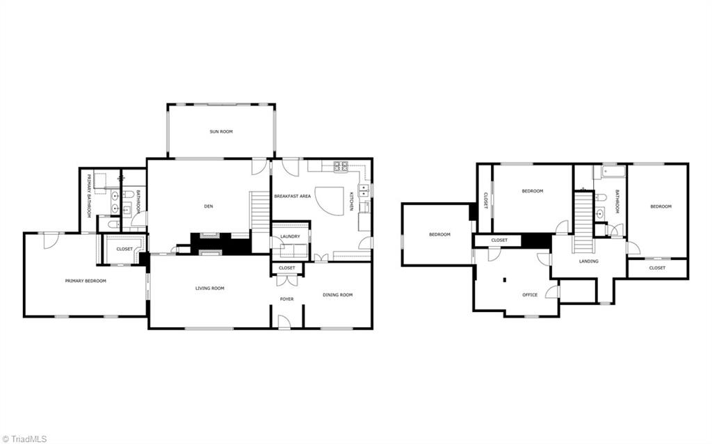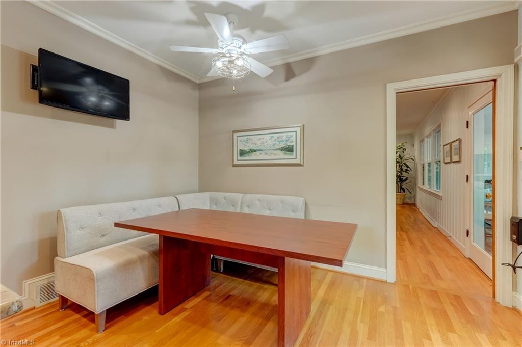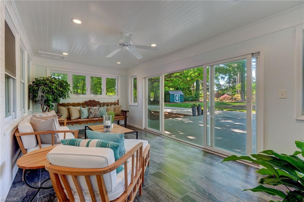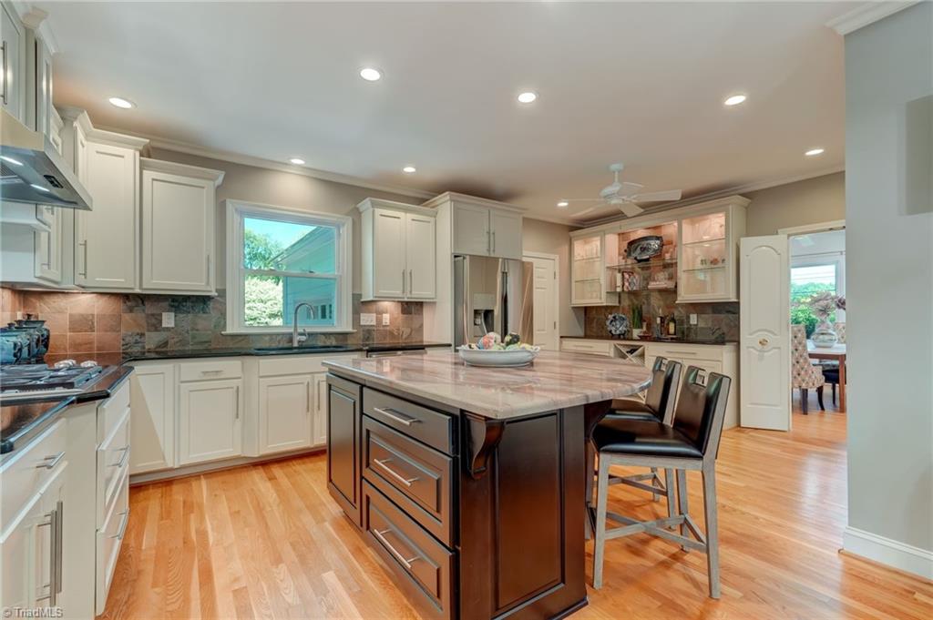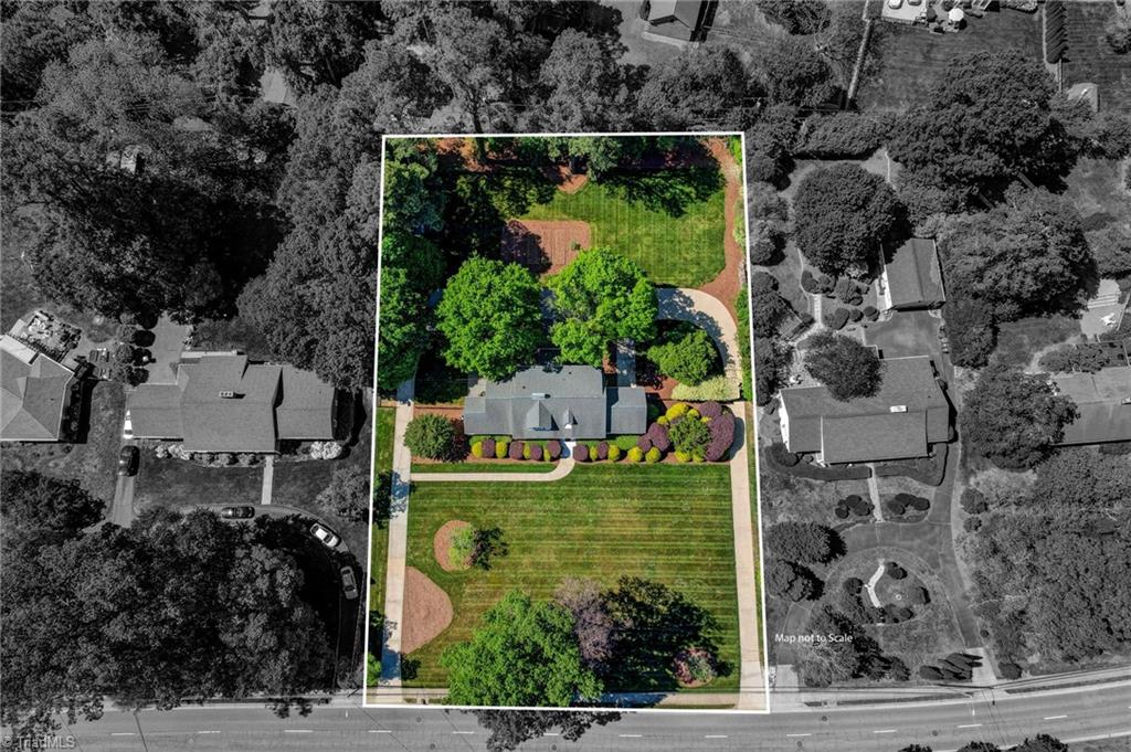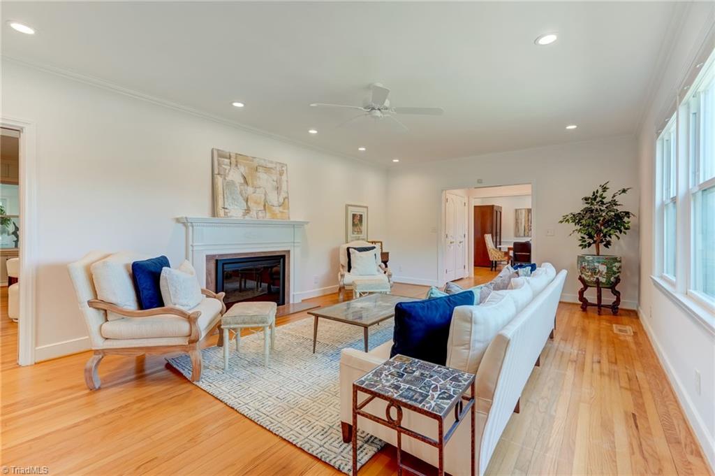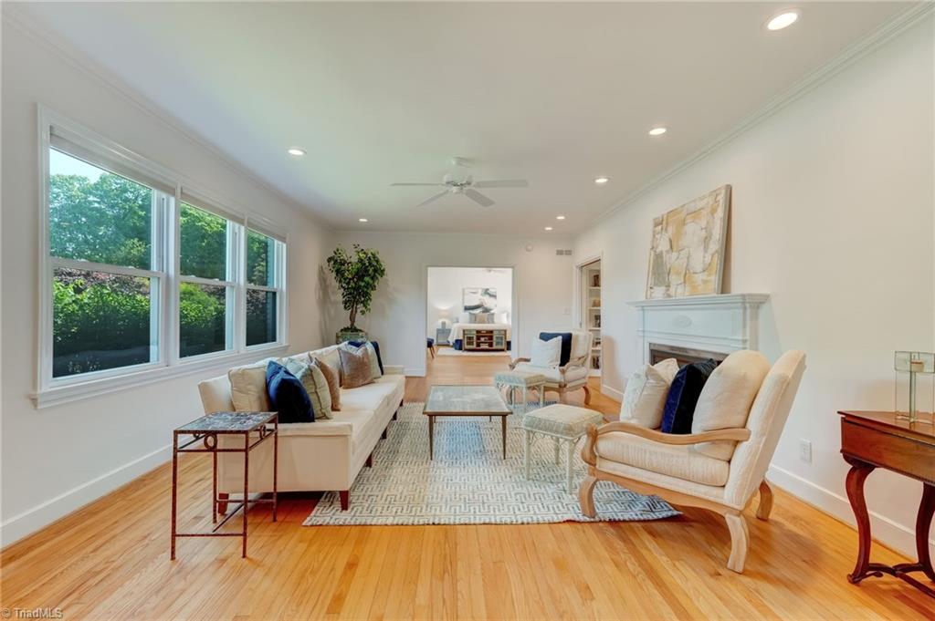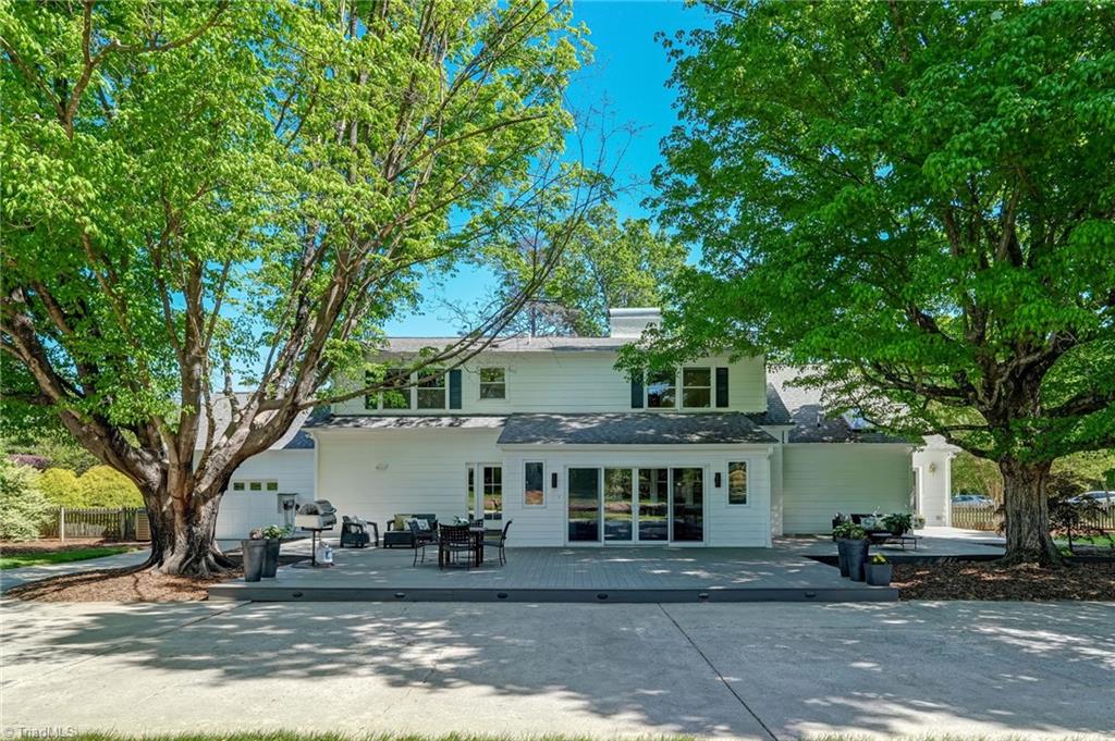 Set on a beautifully manicured 1.35-acre lot in Starmount Forest, this home offers a serene, private setting framed by established landscaping and exceptional curb appeal. Inside, wood floors run throughout with a natural, easy flow between spaces. The dining room opens to a well-designed kitchen with granite countertops, a large island with bar seating, a walk-in pantry, and a cozy breakfast area. The den and living room - both with fireplaces - provide inviting gathering spaces, while a bright sunporch adds additional living filled with natural light. The main-level primary suite features a sitting area, a luxury en suite bath, and a large closet. Upstairs includes three additional bedrooms plus an office/flex space. The spacious deck overlooks a peaceful, private backyard with garden beds. Circular drive and rear-entry garage add privacy, parking, and storage. Minutes from many parks and trails, shopping, and downtown Greensboro.