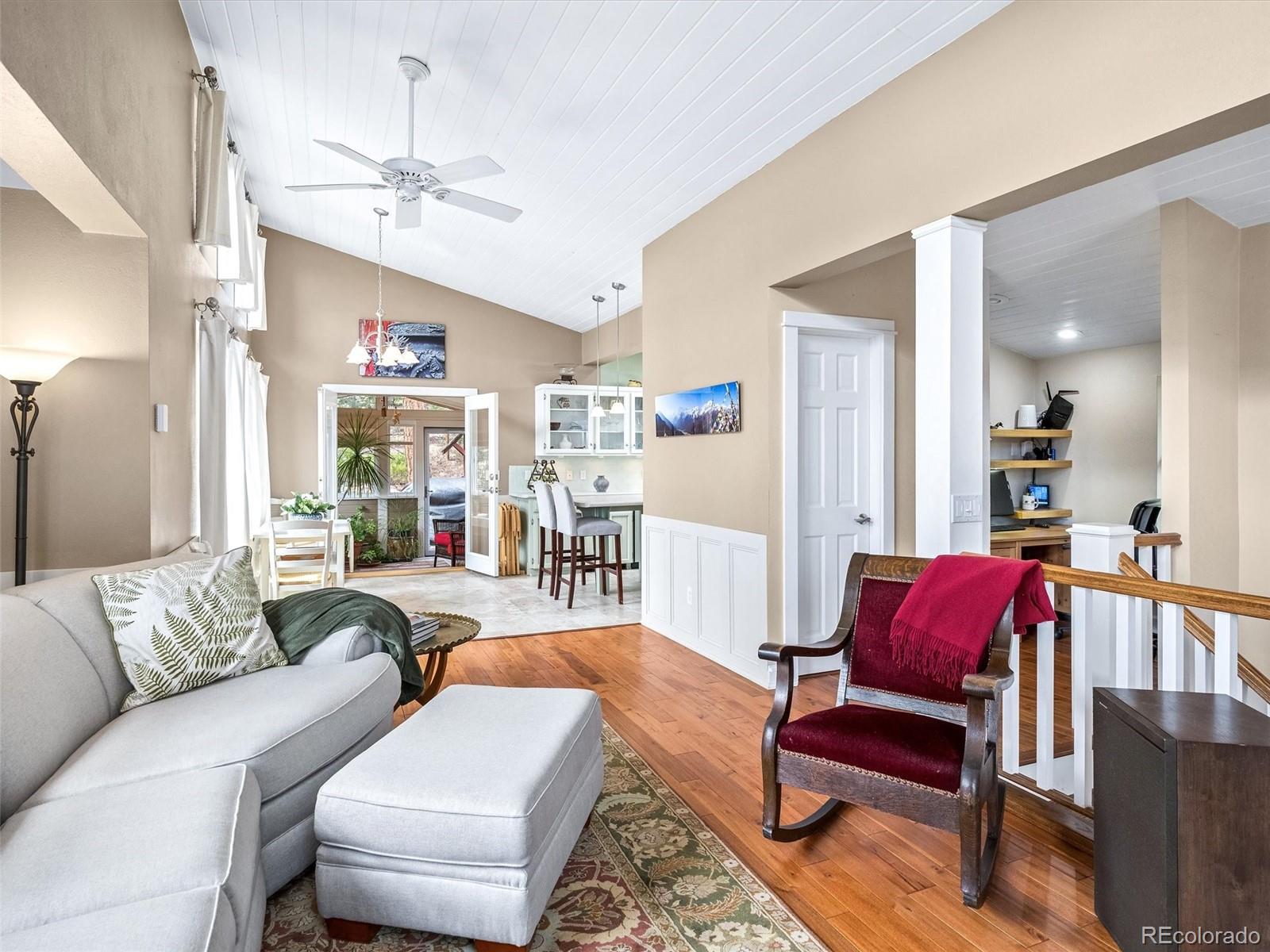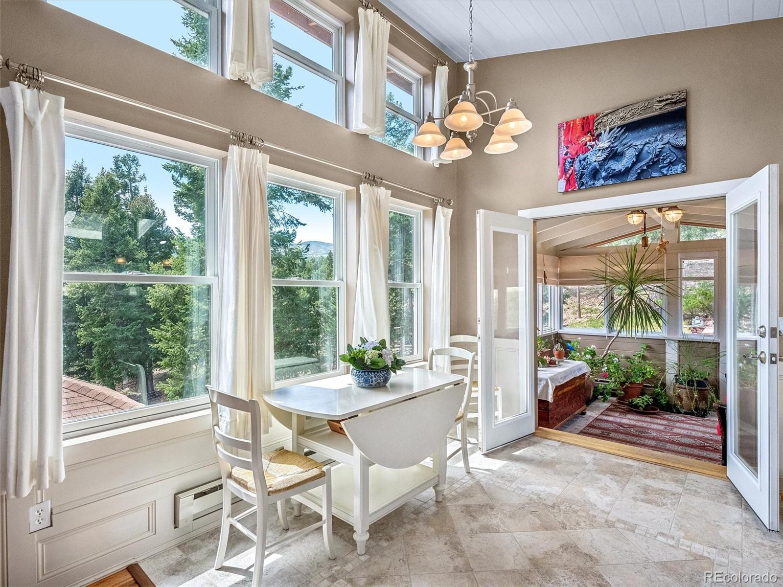 This thoughtfully designed and charming 2-bedroom, 2-bath home offers comfort, style, and exceptional mountain living. Enjoy incredible views and abundant sunshine all day long in this beautifully maintained and updated retreat, featuring Andersen tilt-in windows, rich hardwood flooring, and classic 6-panel doors throughout. The inviting living room is anchored by a cozy gas fireplace and expansive windows that capture breathtaking views from every angle. The open floor plan is ideal for everyday living and entertaining, highlighted by an updated kitchen with a center island and abundant cabinetry. The main level also includes a dedicated office area, powder room, and a sunroom that provides a peaceful, year-round retreat. The lower level is complete with two bedrooms, including one with exterior access, a bathroom with a tiled walk-in shower, and a separate laundry room with additional storage. Step outside to your professionally landscaped outdoor oasis, backing to over 500 acres of Stransky Ranch. Unwind with a tranquil water feature, pond with salamanders, and a fenced garden designed to protect your harvest from our beloved local wildlife. A water cistern supports efficient irrigation, for easy maintenance. Choose between the covered front porch or the spacious deck featuring an enclosed gazebo, both offering scenic views and a tranquil setting for relaxation after a busy day. The oversized 3-car garage is equipped with a 220 EV charging station, while the third bay is currently set up as a heated workshop, yet can be easily converted for a small car or ATV. A separate large storage shed provides ample space for all your mountain tools and toys. An added bonus: the driveway has southern exposure for quick and easy snow melt. Schedule your showing for this special property.