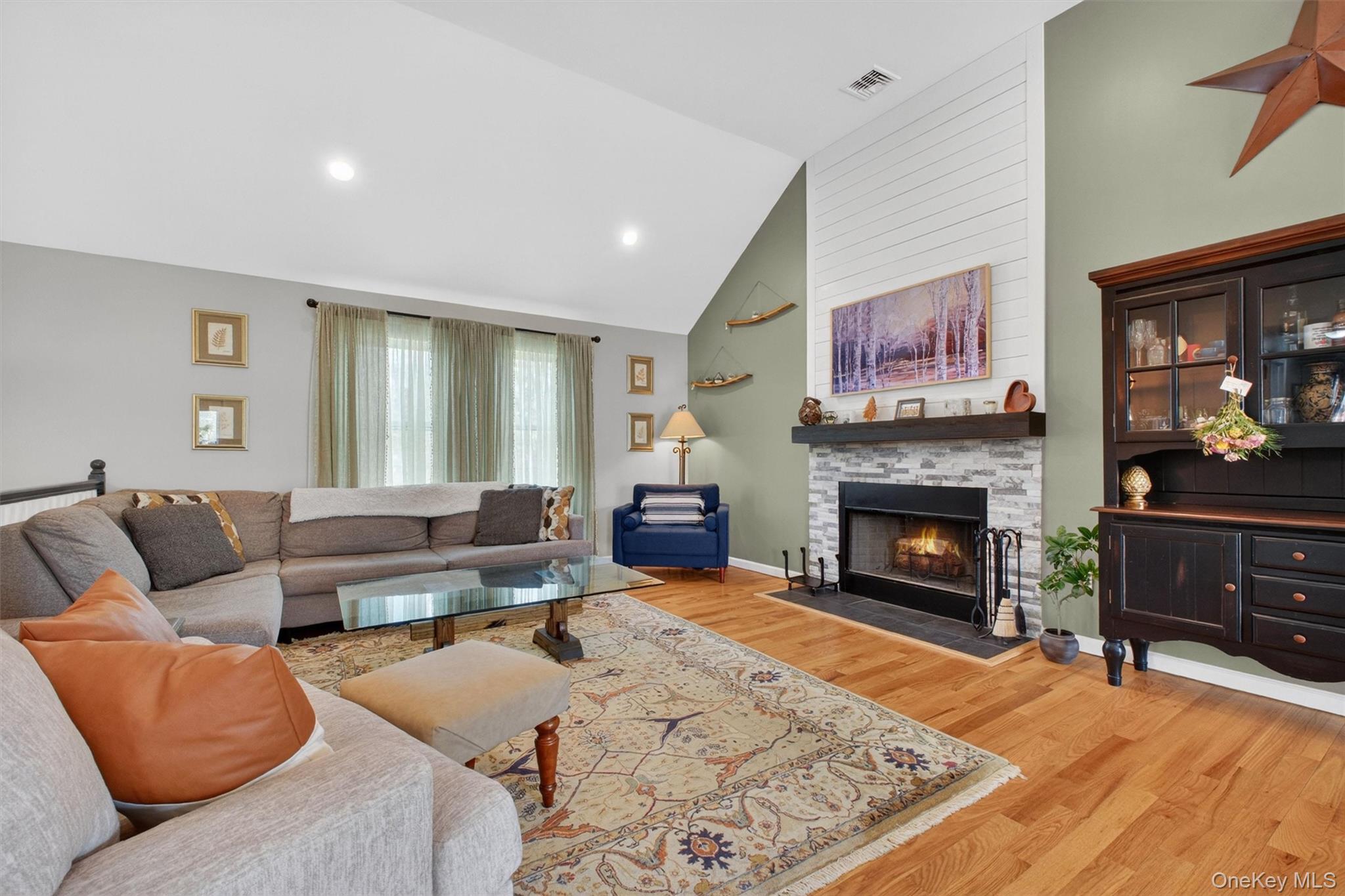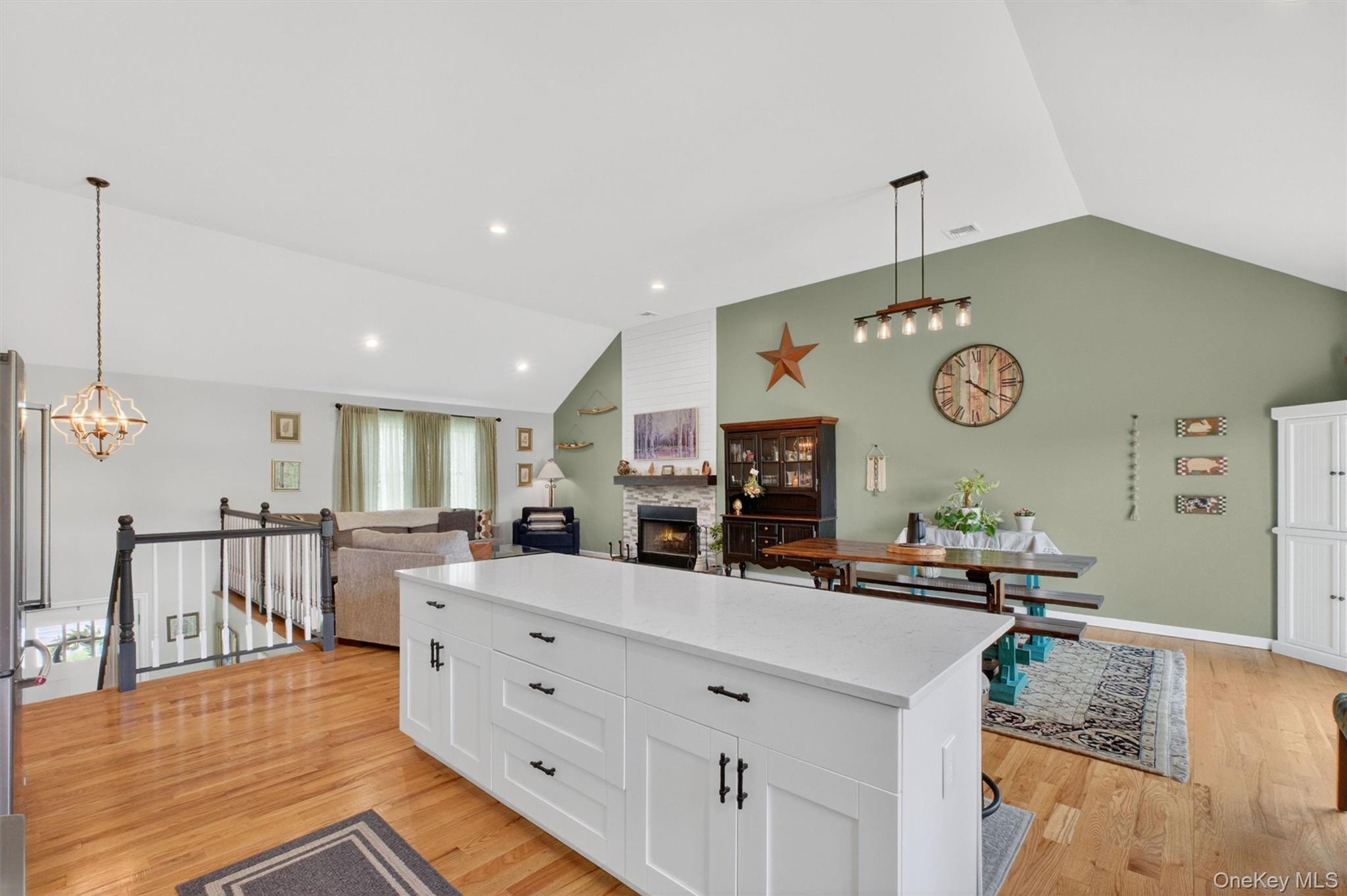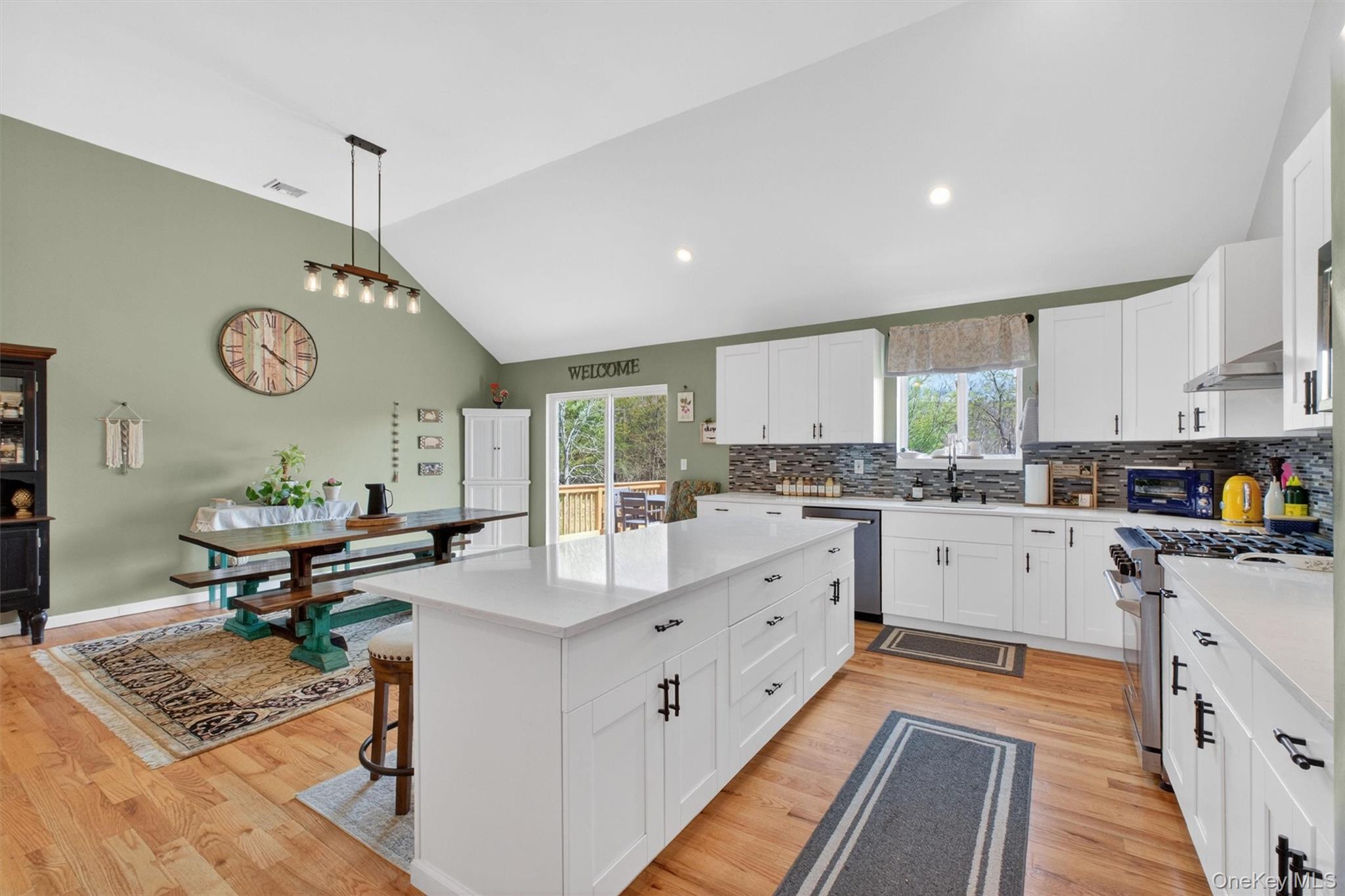 Picture perfect move-in condition! This 3 bedroom, 3 bath contemporary ranch is privately set on 1.69 beautifully landscaped acres on a quiet street in Poughquag with mountain views overlooking a horse farm. Spacious entry foyer welcomes you into an open living room featuring cathedral ceilings, hardwood floors, and a wood burning fireplace with stone front. Formal dining room with sliding glass door opens to the deck, perfect for indoor and outdoor entertaining. Custom gourmet kitchen offers quartz countertops, tile backsplash, built-in microwave, island seating for four, premium range hood, and 5-burner gas stove. Main level also features two large bedrooms, full hall bath with tub, and a private primary suite with cathedral ceilings, room for a king size bed, and custom shower. Bright, fully above-ground lower level includes a family room with custom ceilings, full bath, laundry room, generous storage, and sliding glass door to backyard. Two car garage and oversized driveway provide ample parking. Propane heat, wood burning fireplace, and septic sized for a potential fourth bedroom complete this exceptional home. Conveniently located close to highways. Move right in!