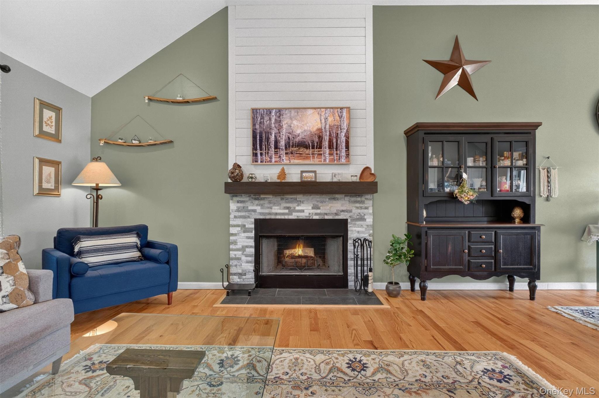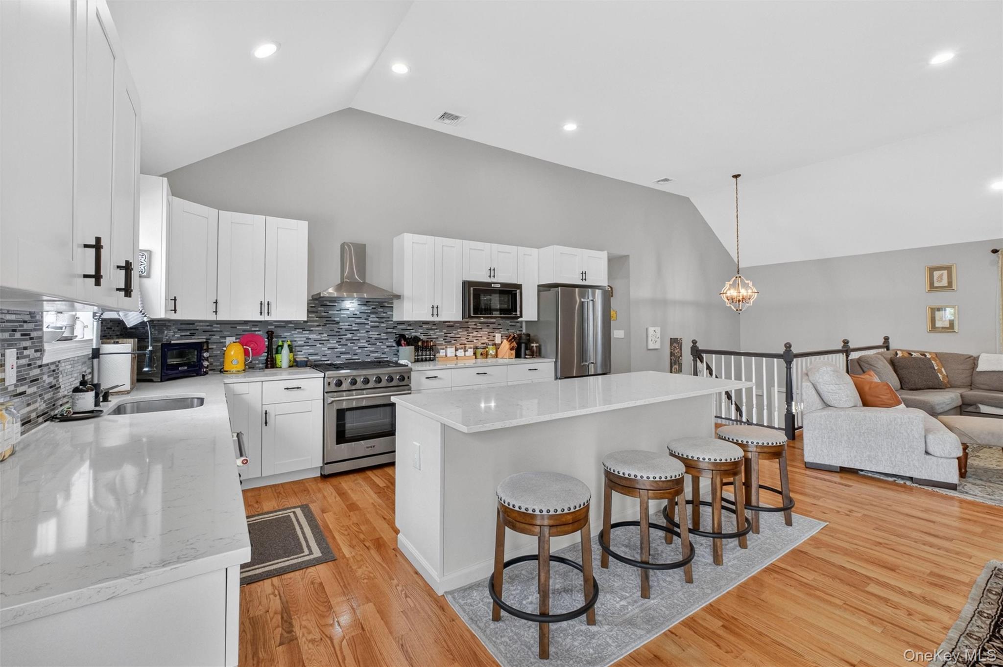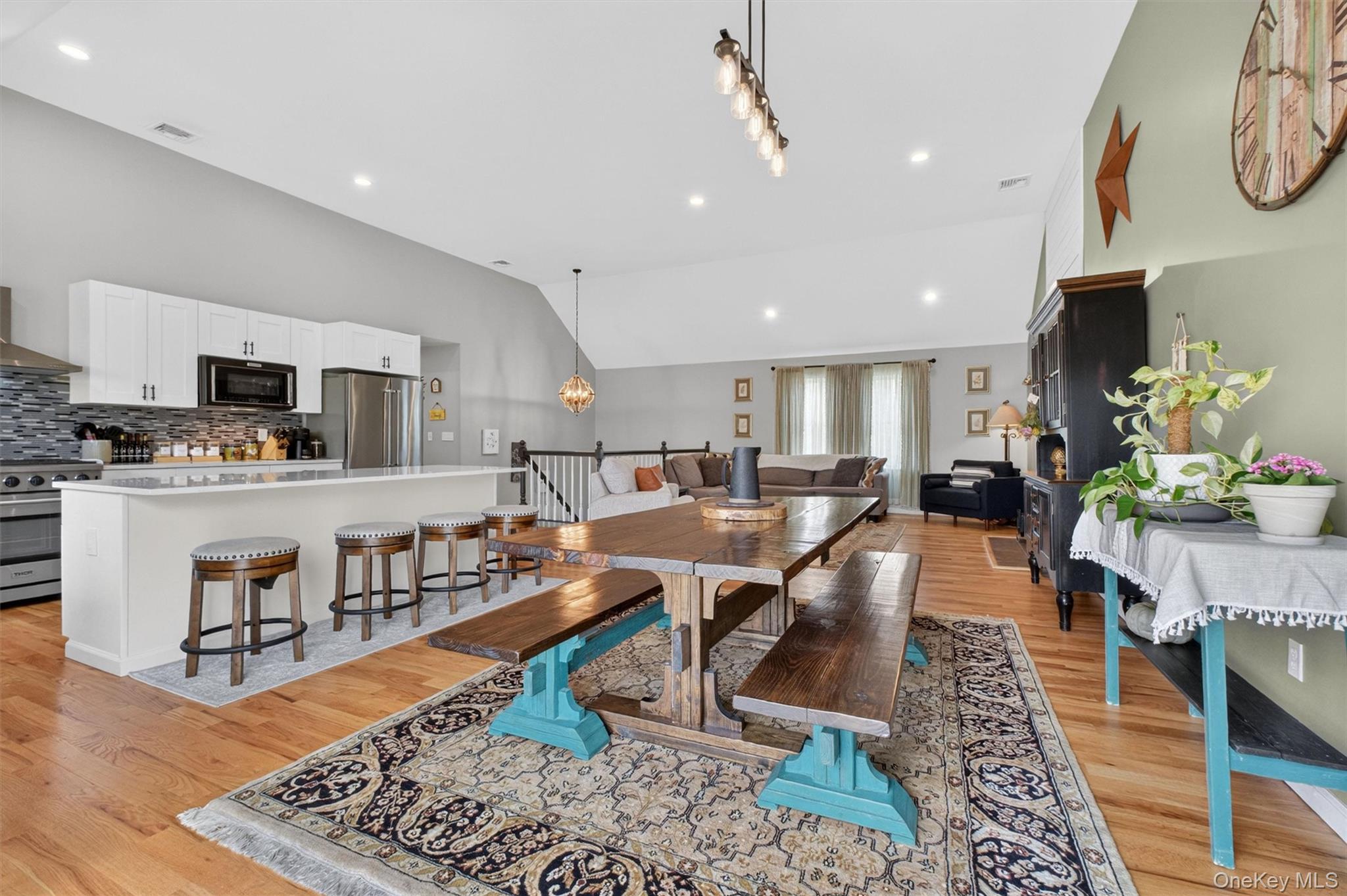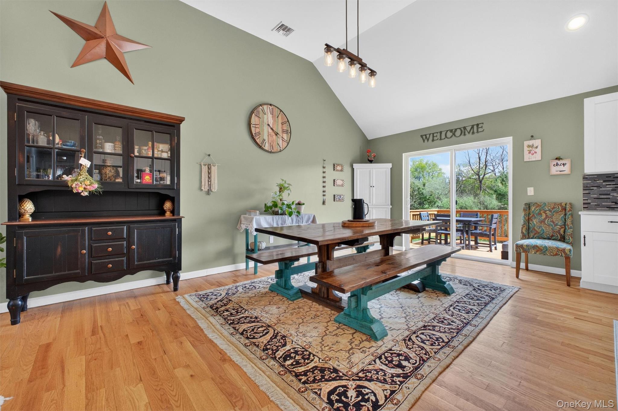 Picture perfect move-in condition! This 3 bedroom, 3 bath contemporary ranch is privately set on 1.69 beautifully landscaped acres on a quiet street in Poughquag with mountain views overlooking a horse farm. Spacious entry foyer welcomes you into an open living room featuring cathedral ceilings, hardwood floors, and a wood burning fireplace with stone front. Formal dining room with sliding glass door opens to the deck, perfect for indoor and outdoor entertaining. Custom gourmet kitchen offers quartz countertops, tile backsplash, built-in microwave, island seating for four, premium range hood, and 5-burner gas stove. Main level also features two large bedrooms, full hall bath with tub, and a private primary suite with cathedral ceilings, room for a king size bed, and custom shower. Bright, fully above-ground lower level includes a family room with custom ceilings, full bath, laundry room, generous storage, and sliding glass door to backyard. Two car garage and oversized driveway provide ample parking. Propane heat, wood burning fireplace, and septic sized for a potential fourth bedroom complete this exceptional home. Conveniently located close to highways. Move right in!