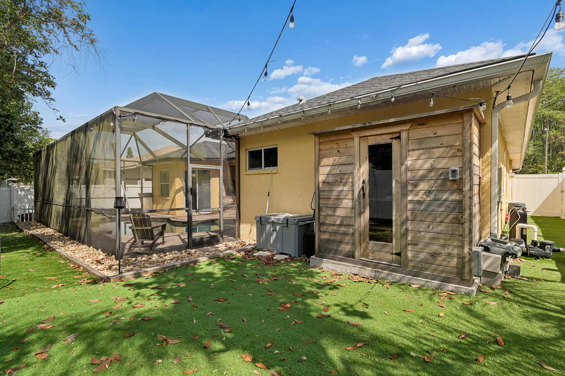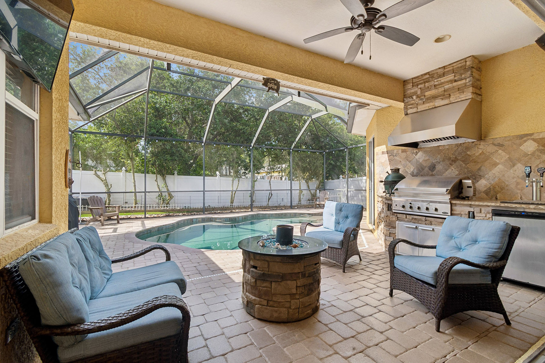 Outdoor living sets the tone for this residence at 360 Liam Avenue in Tarpon Springs, in the Grassy Pointe community. The screened lanai is thoughtfully designed with a saltwater pool featuring a PebbleTec finish, paver deck and an outdoor stone kitchen with grill, sink and refrigerator. A sauna is positioned just beyond the lanai, while the fenced yard enhances privacy. Positioned across from a conservation area and near a cul-de-sac, the setting supports a quiet, residential environment. Interior features include wood flooring throughout, with tile flooring in the kitchen, bedroom hallway and interior laundry room and no carpet! The great room features high ceilings and opens directly to the lanai, creating a cohesive indoor and outdoor living experience. The kitchen includes granite countertops, a breakfast bar, pantry closet and stainless steel appliances, with an adjacent dining area overlooking the main living space. The primary suite features a tray ceiling, a large walk-in closet and an en-suite bath with dual vanities and a separate tub and shower. An office or workspace is positioned between two secondary bedrooms, and the hall bath provides direct access to the pool area. A fourth bedroom at the front of the residence offers flexibility for a private office or guest space. Additional features include a three-car tandem garage, a fully paid solar roof system designed as an integrated roof and a 2020 roof replacement, including shingle and solar components. No flood insurance required. Tarpon Springs is known for its sponge docks and Dunedin is a short distance away. Come see this relaxed hideaway, quiet, charming and in the middle of beaches, good schools, varied dining and fun shopping. Just 35-40 minutes from Tampa International.