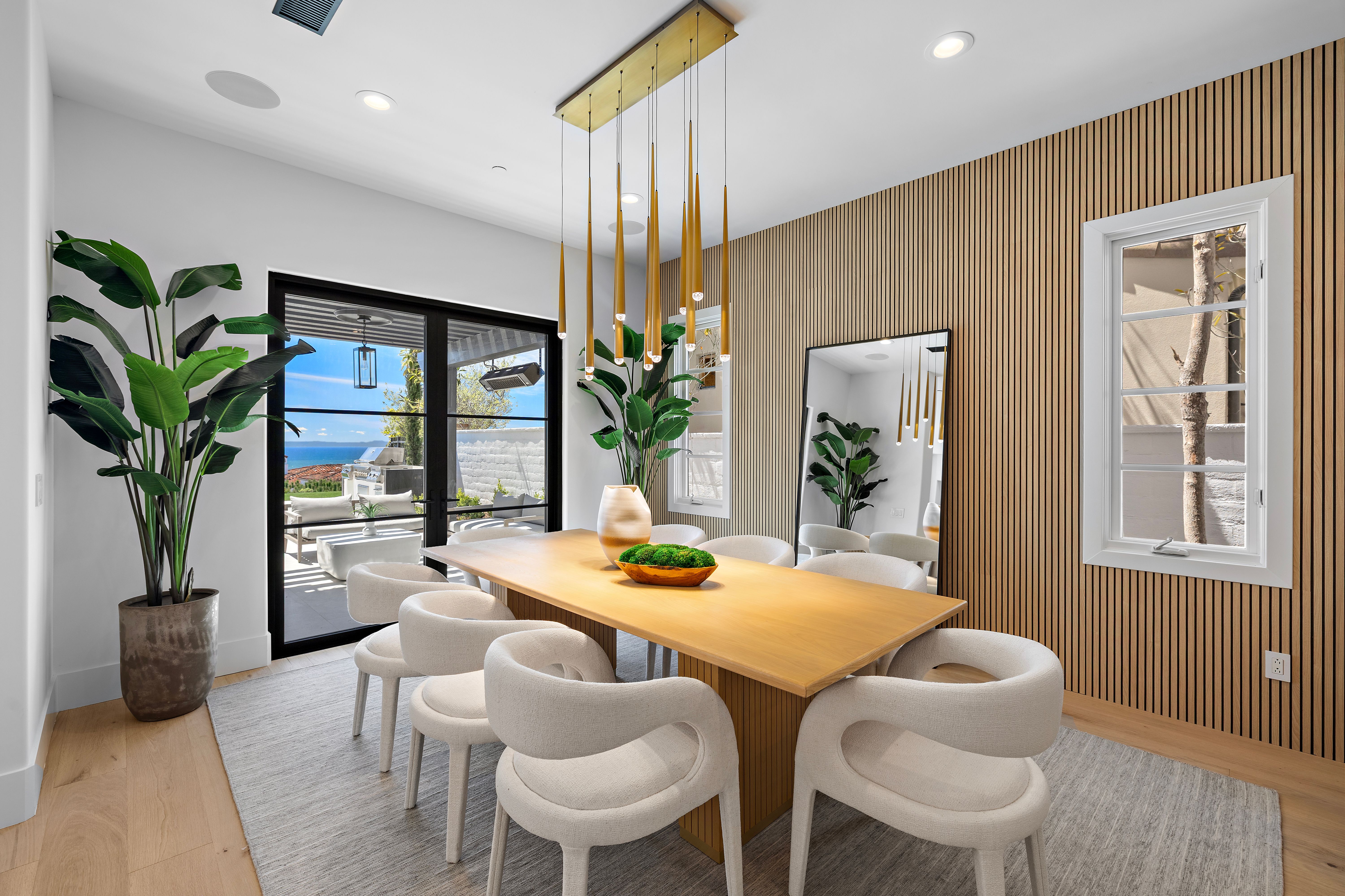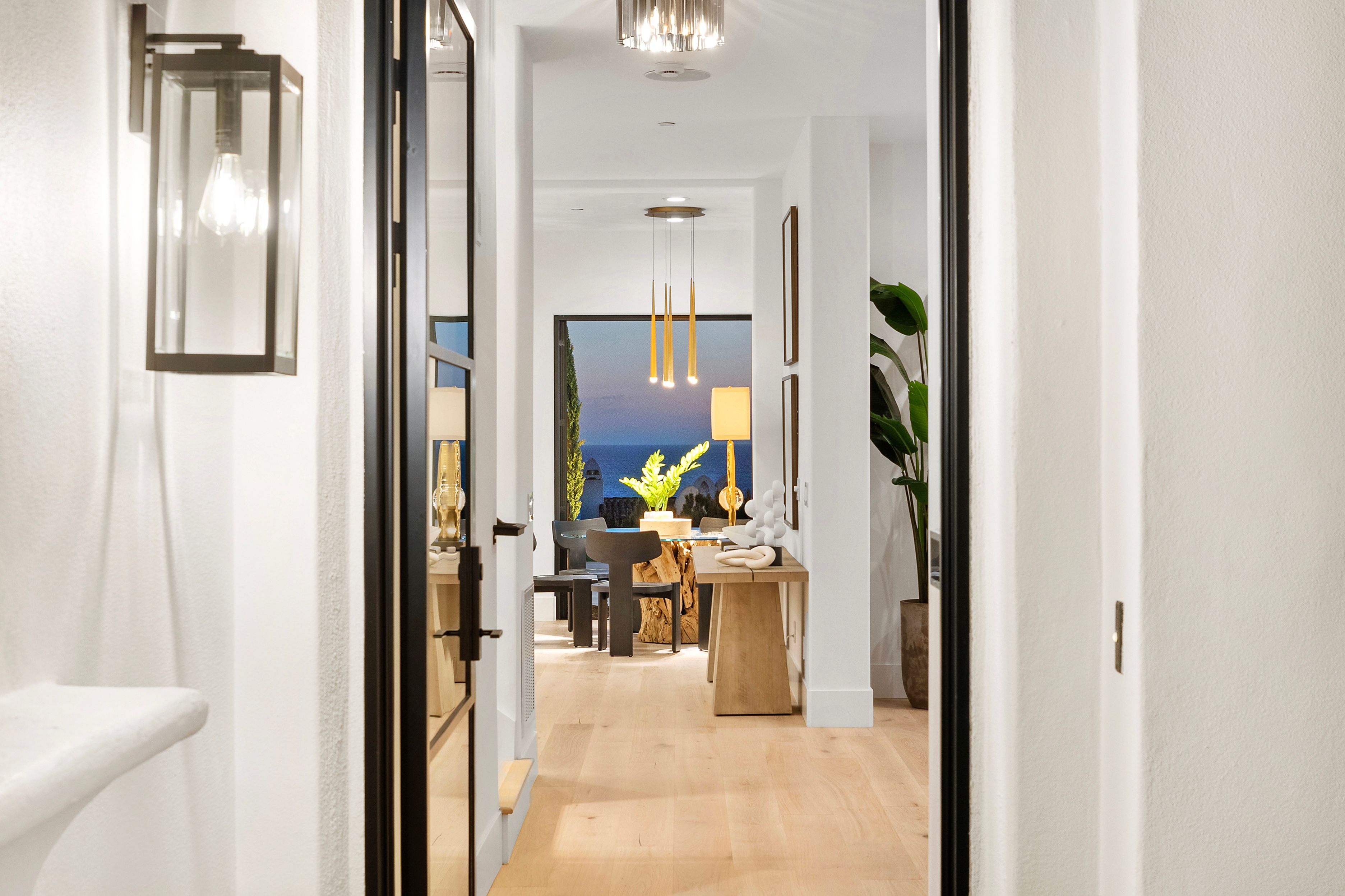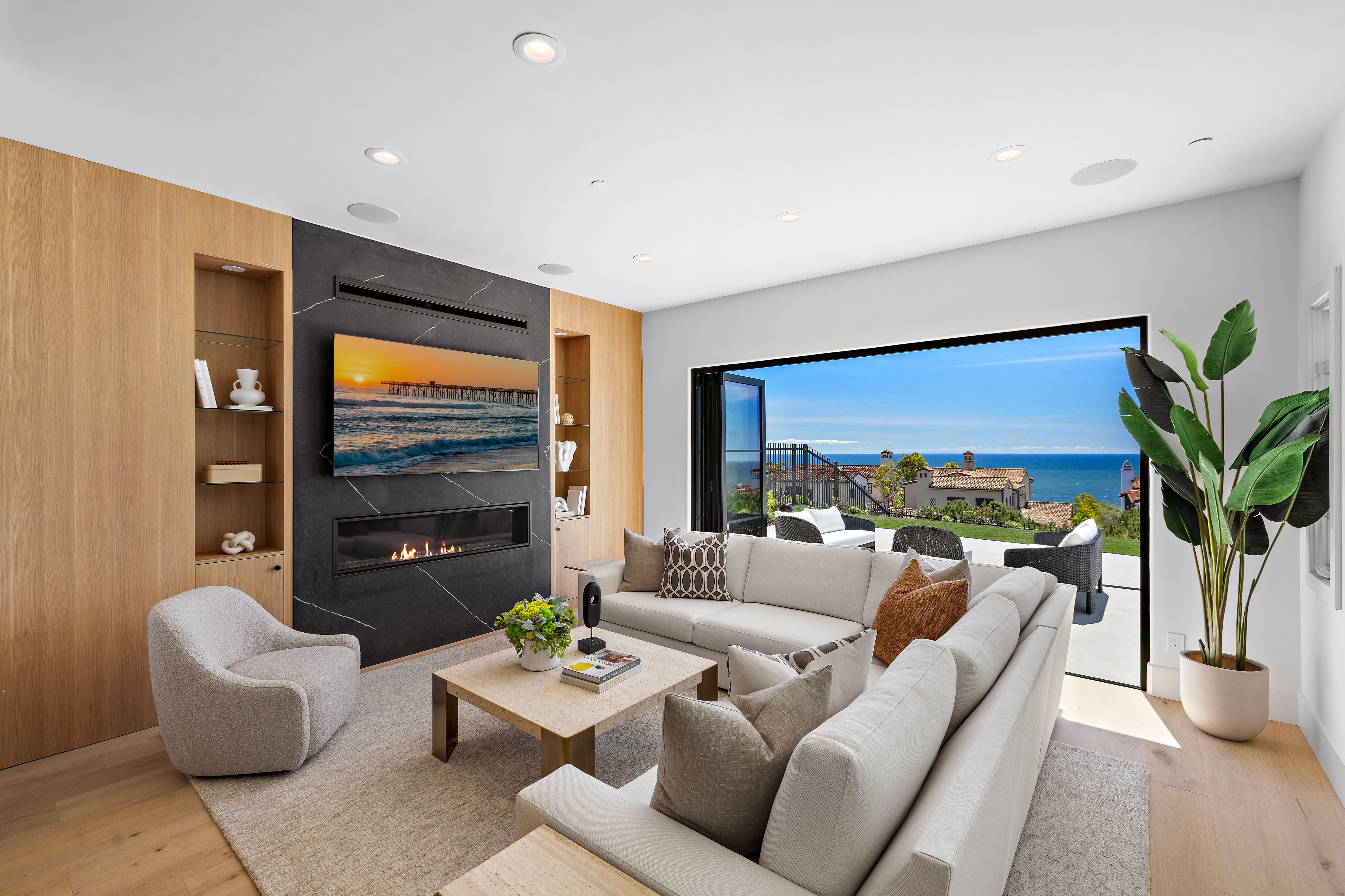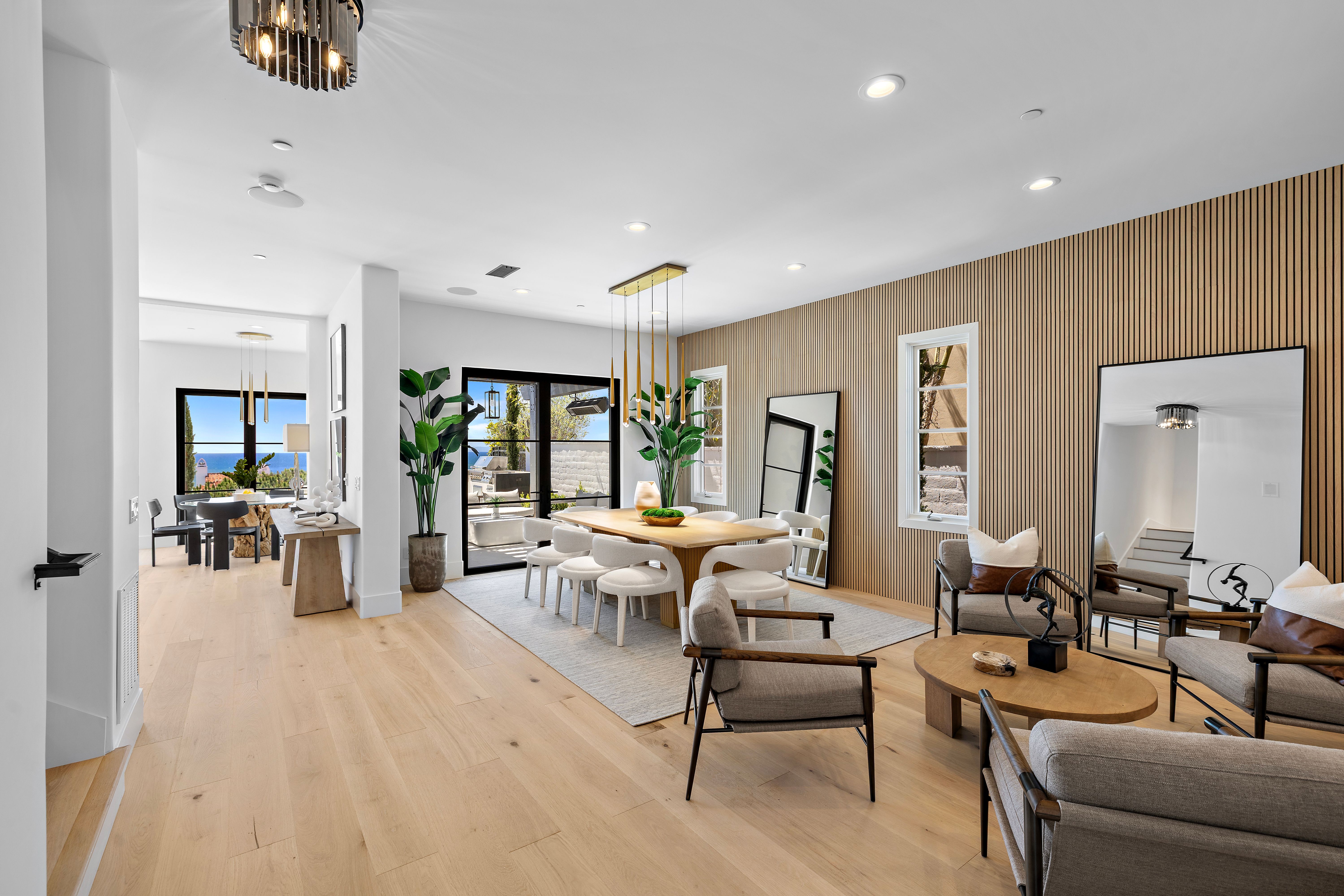 Welcome to 28 Surfspray Bluff, a newly reimagined architectural sanctuary positioned within the coveted Nautilus enclave of Crystal Cove. Blending timeless Santa Barbara-inspired architecture with a refined modern coastal sensibility, this exceptional 3,767 SF, 4 bedroom, 5 bathroom residence has been thoughtfully transformed with meticulous craftsmanship, elevated materials, and a design vision tailored to sophisticated seaside living. A newly designed front drive of sleek concrete and manicured turf creates an immediate sense of arrival, leading to a private gated entry and tranquil courtyard framed by curated landscaping and a serene fountain. Beyond a series of glass-paneled French doors, light-filled interiors unfold with sweeping sit-down ocean and Catalina Island views from both levels. Wide-plank oak flooring, custom vertical slat detailing, and a soft neutral palette establish an atmosphere of understated luxury that complements the natural beauty beyond. The chef’s kitchen is both statement and centerpiece, anchored by a waterfall Calacatta quartz island, white oak cabinetry, and professional-grade appliances by Thermador and Sub-Zero. Designed for effortless entertaining, the adjoining living and dining spaces transition seamlessly to the outdoor terrace, where sunset gatherings are framed by panoramic coastal vistas. The family room is distinguished by a dramatic black marble fireplace wall, custom oak built-ins, and direct access to the expansive patio. A bespoke wine room with illuminated display storage evokes the intimacy of a private tasting lounge. Upstairs, the primary suite serves as a serene retreat with ocean views, a spa-inspired bath, and a boutique-style dressing room. A private office/media lounge captures endless ocean vistas, offering an inspiring setting to unwind. Each secondary bedroom features its own en-suite bath, while a detached casita provides luxurious accommodations for guests. Outdoor living spaces are equally compelling, complete with a BBQ island, dining terrace, and multiple areas designed for evenings beneath the stars. Within the exclusive 24-hour guard-gated community of Crystal Cove, residents enjoy access to the Canyon Club’s resort-style amenities, scenic trails, and proximity to Crystal Cove State Beach, along with the boutiques and dining of Crystal Cove Shopping Center. At 28 Surfspray Bluff, timeless architecture, modern elegance, and coastal living converge in an extraordinary offering by the sea.
