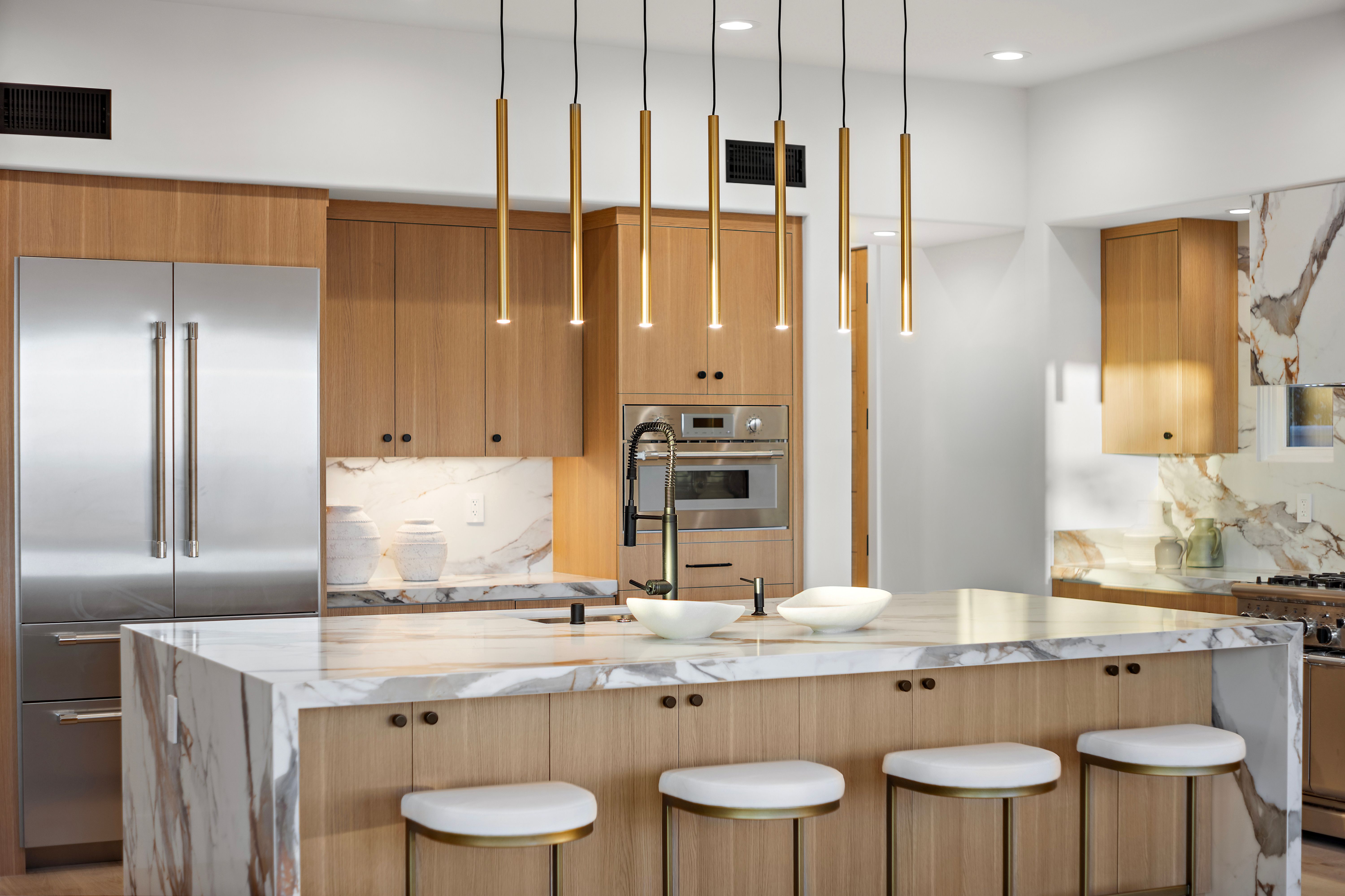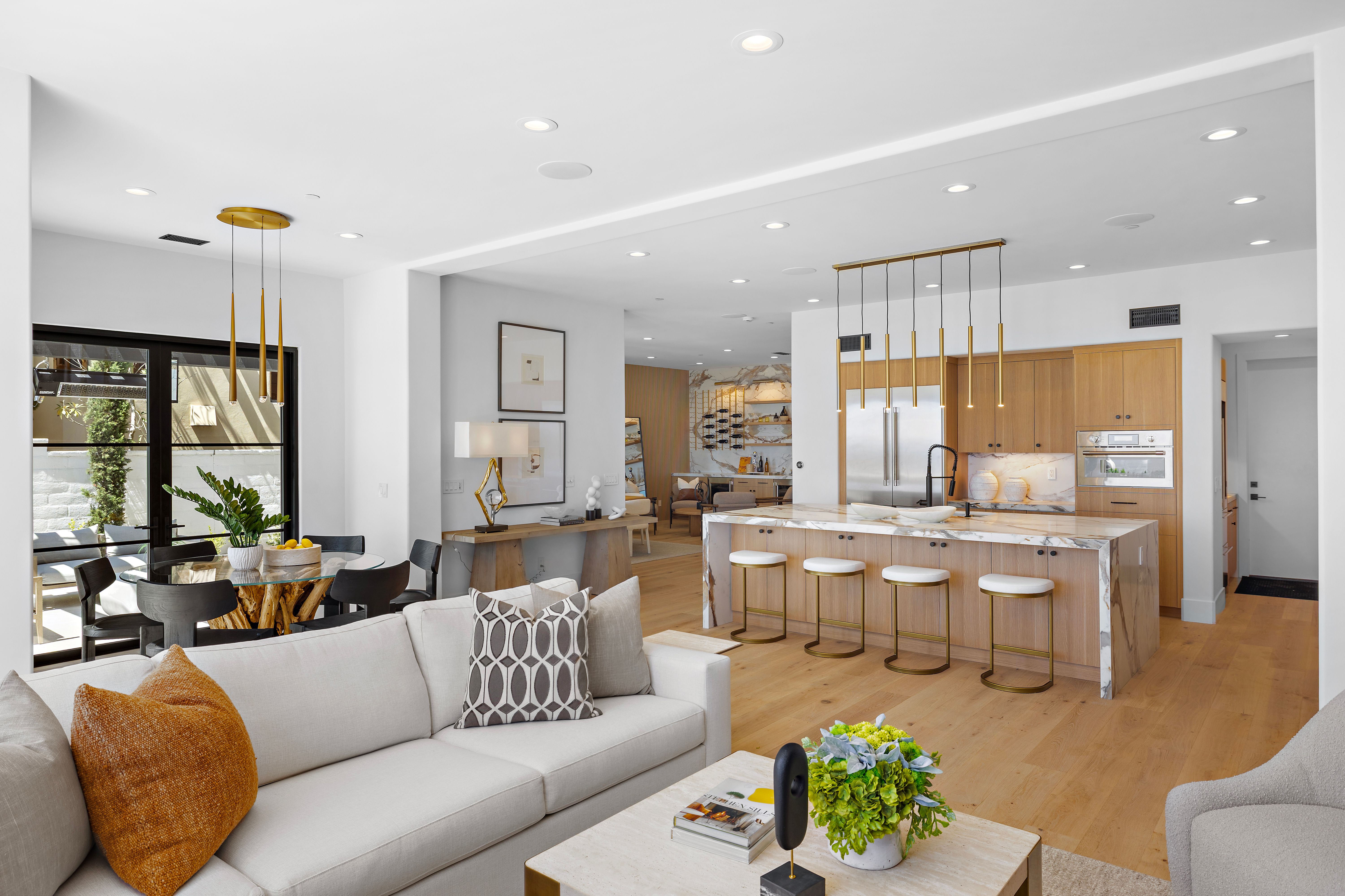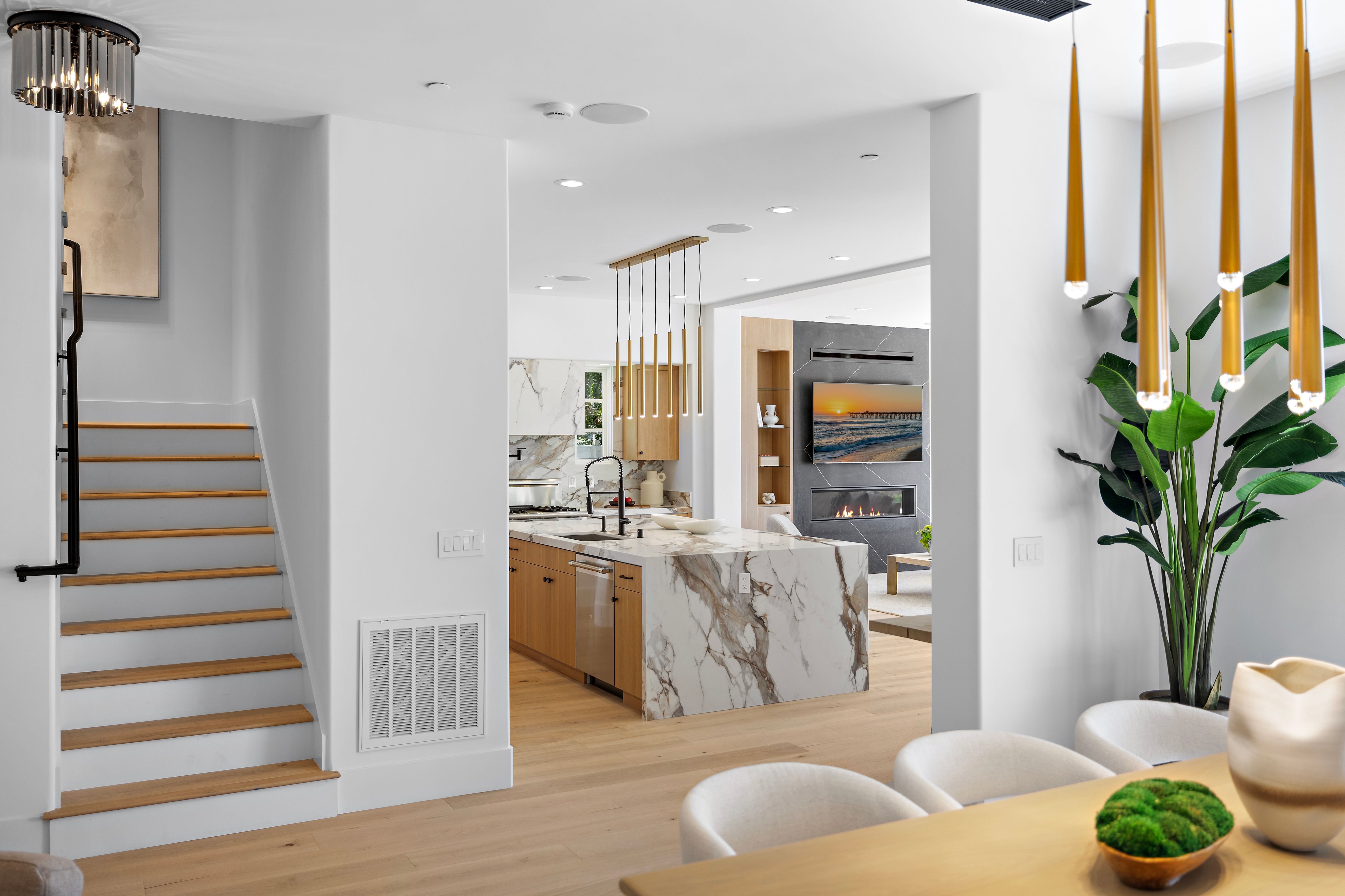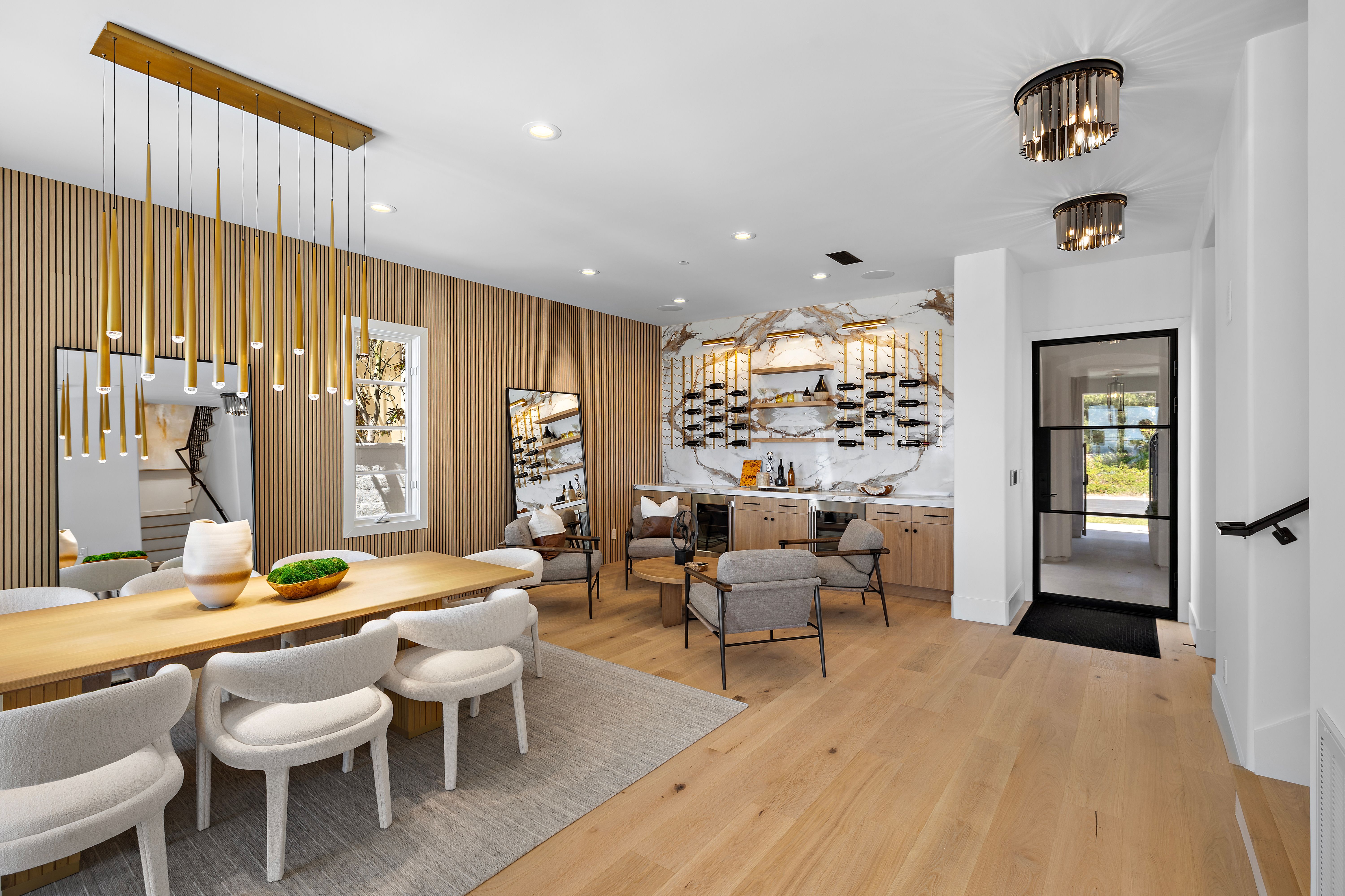 Welcome to 28 Surfspray Bluff, a newly reimagined architectural sanctuary positioned within the coveted Nautilus enclave of Crystal Cove. Blending timeless Santa Barbara-inspired architecture with a refined modern coastal sensibility, this exceptional 3,767 SF, 4 bedroom, 5 bathroom residence has been thoughtfully transformed with meticulous craftsmanship, elevated materials, and a design vision tailored to sophisticated seaside living. A newly designed front drive of sleek concrete and manicured turf creates an immediate sense of arrival, leading to a private gated entry and tranquil courtyard framed by curated landscaping and a serene fountain. Beyond a series of glass-paneled French doors, light-filled interiors unfold with sweeping sit-down ocean and Catalina Island views from both levels. Wide-plank oak flooring, custom vertical slat detailing, and a soft neutral palette establish an atmosphere of understated luxury that complements the natural beauty beyond. The chef’s kitchen is both statement and centerpiece, anchored by a waterfall Calacatta quartz island, white oak cabinetry, and professional-grade appliances by Thermador and Sub-Zero. Designed for effortless entertaining, the adjoining living and dining spaces transition seamlessly to the outdoor terrace, where sunset gatherings are framed by panoramic coastal vistas. The family room is distinguished by a dramatic black marble fireplace wall, custom oak built-ins, and direct access to the expansive patio. A bespoke wine room with illuminated display storage evokes the intimacy of a private tasting lounge. Upstairs, the primary suite serves as a serene retreat with ocean views, a spa-inspired bath, and a boutique-style dressing room. A private office/media lounge captures endless ocean vistas, offering an inspiring setting to unwind. Each secondary bedroom features its own en-suite bath, while a detached casita provides luxurious accommodations for guests. Outdoor living spaces are equally compelling, complete with a BBQ island, dining terrace, and multiple areas designed for evenings beneath the stars. Within the exclusive 24-hour guard-gated community of Crystal Cove, residents enjoy access to the Canyon Club’s resort-style amenities, scenic trails, and proximity to Crystal Cove State Beach, along with the boutiques and dining of Crystal Cove Shopping Center. At 28 Surfspray Bluff, timeless architecture, modern elegance, and coastal living converge in an extraordinary offering by the sea.