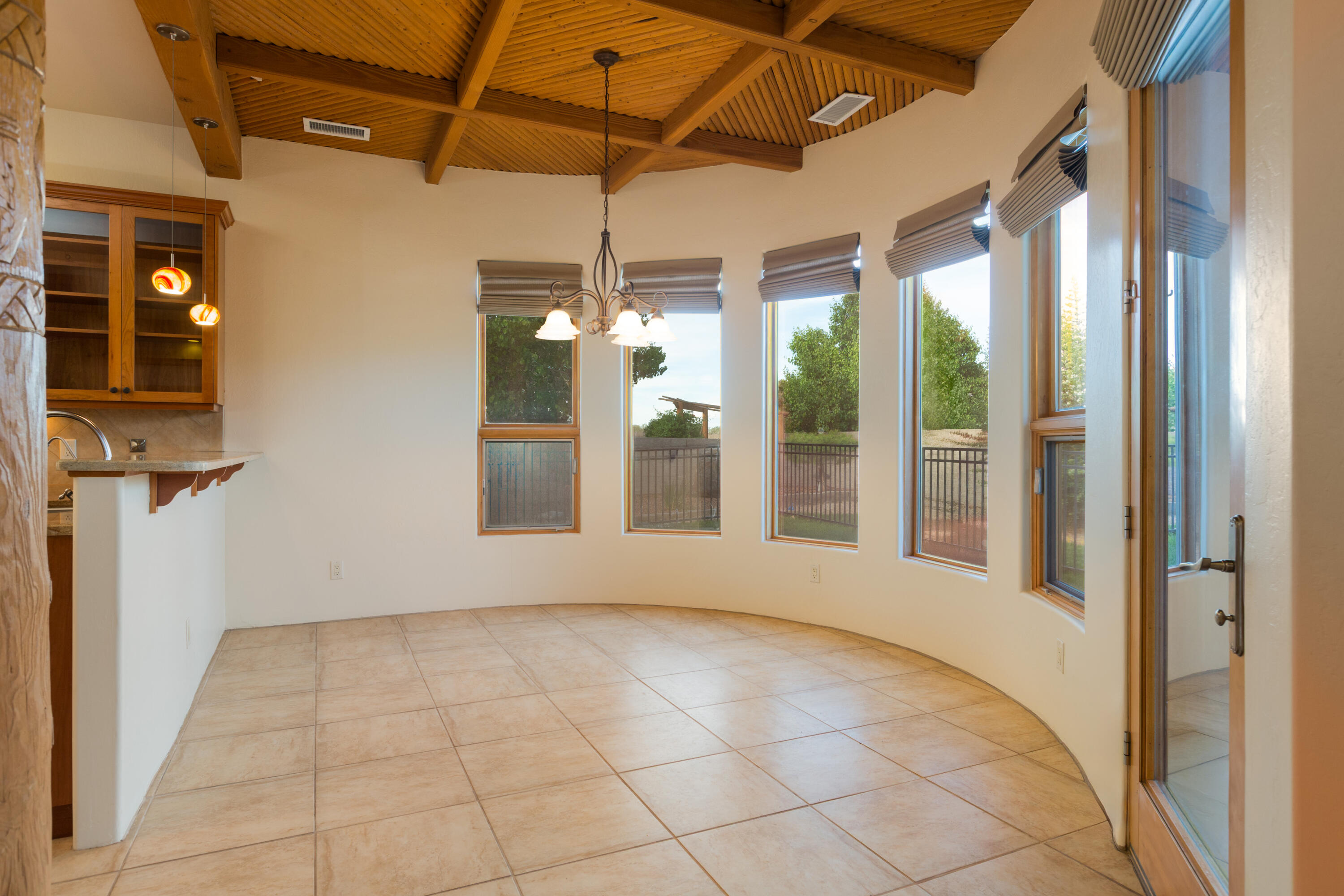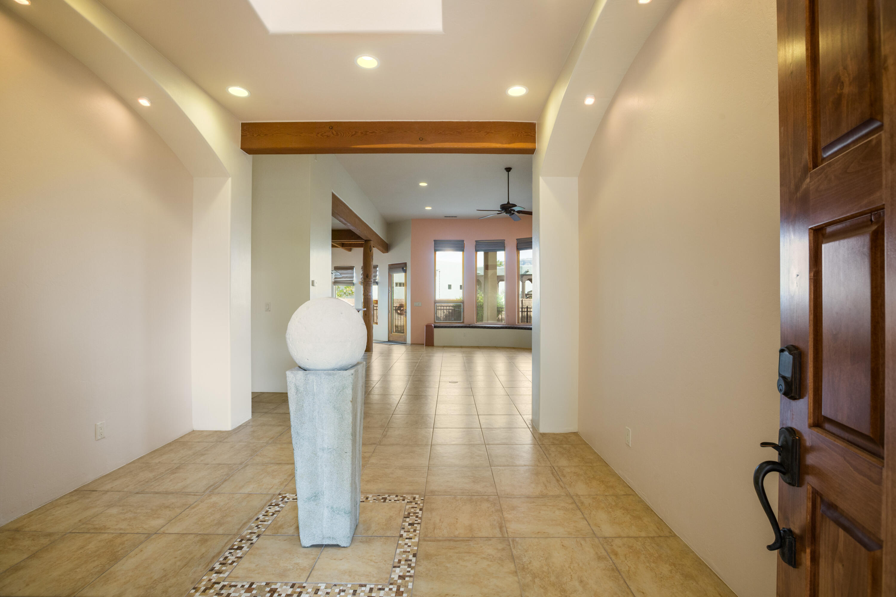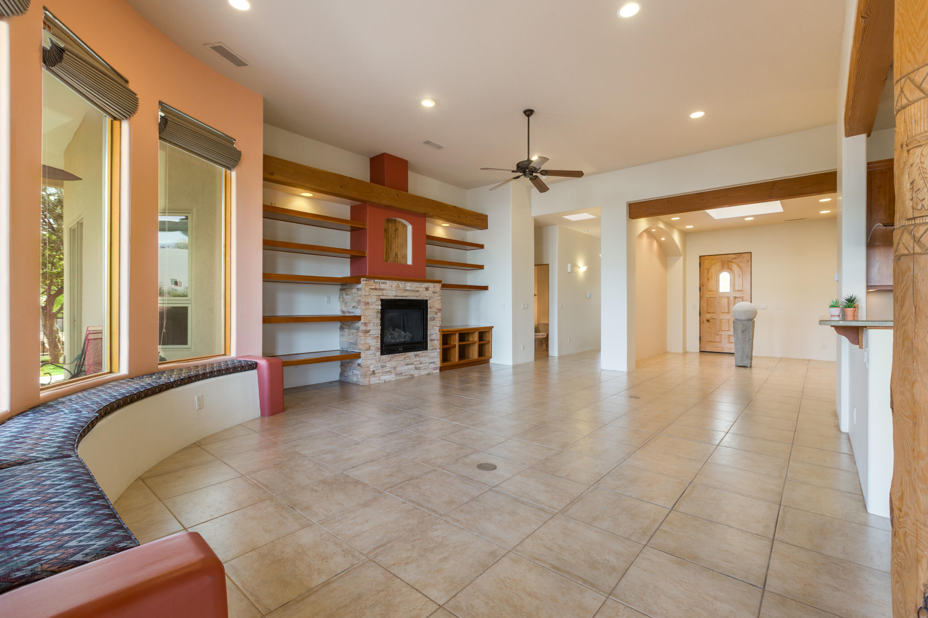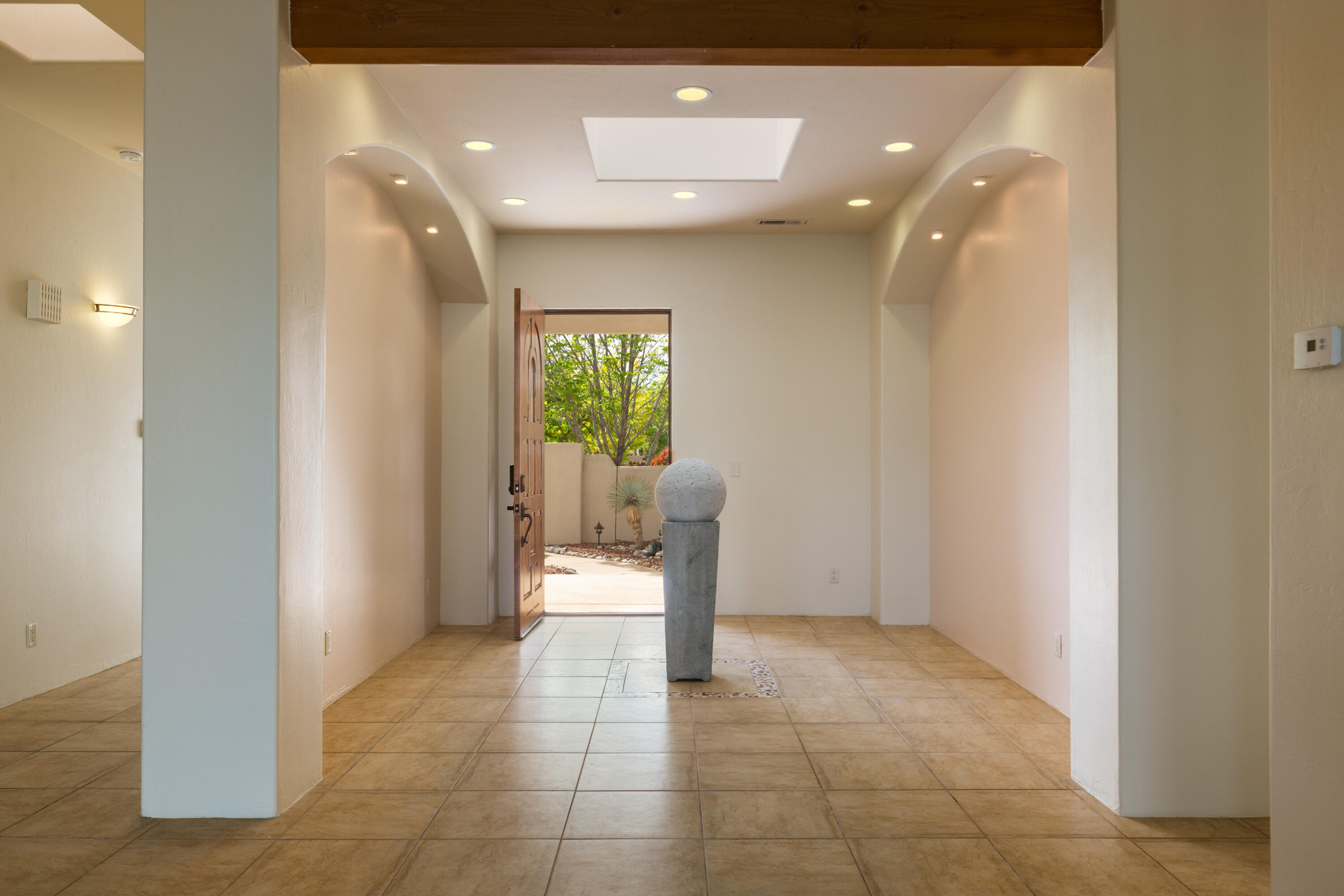 Gorgeous single story custom home in the gated Bosque Encantado community. Nestled on a private cul-de-sac beneath mature trees, this residence blends timeless Southwest design with thoughtful modern updates. Interior features include chef's kitchen w/dual oven & wine rack, granite countertops, hand-scraped wood floors & latilla ceiling in dining room. Recent improvements include 2022 dual rooftop HVAC units, upgraded skylights w/protective covers, roof tune-up, refinished cabinetry, and RO system; 2023 water softener. Landscaping updates include ledger stone and sprinkler valves. Lush front and backyard spaces create a serene retreat in the bosque. This 2,627 sq.ft. 3 bedroom + office home is in excellent condition and is a true retreat with timeless character and modern comfort.