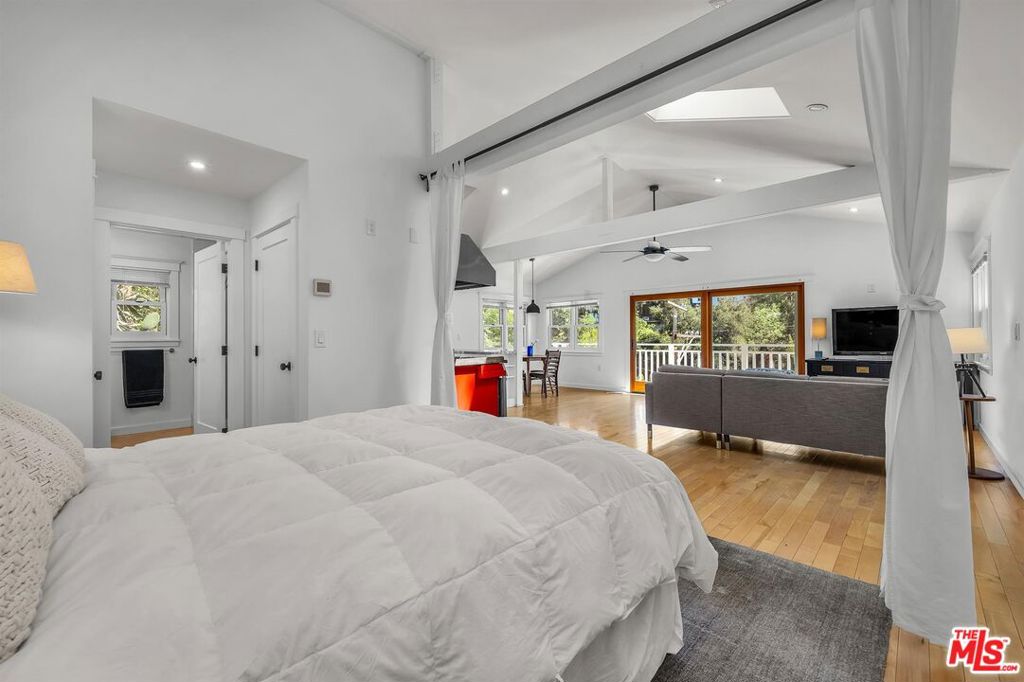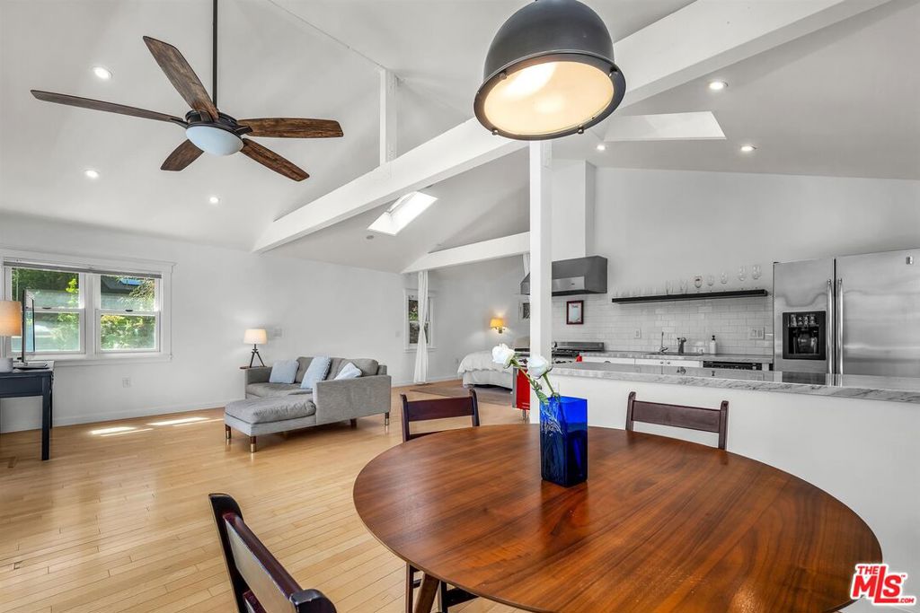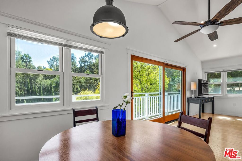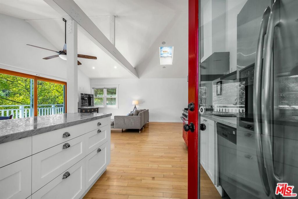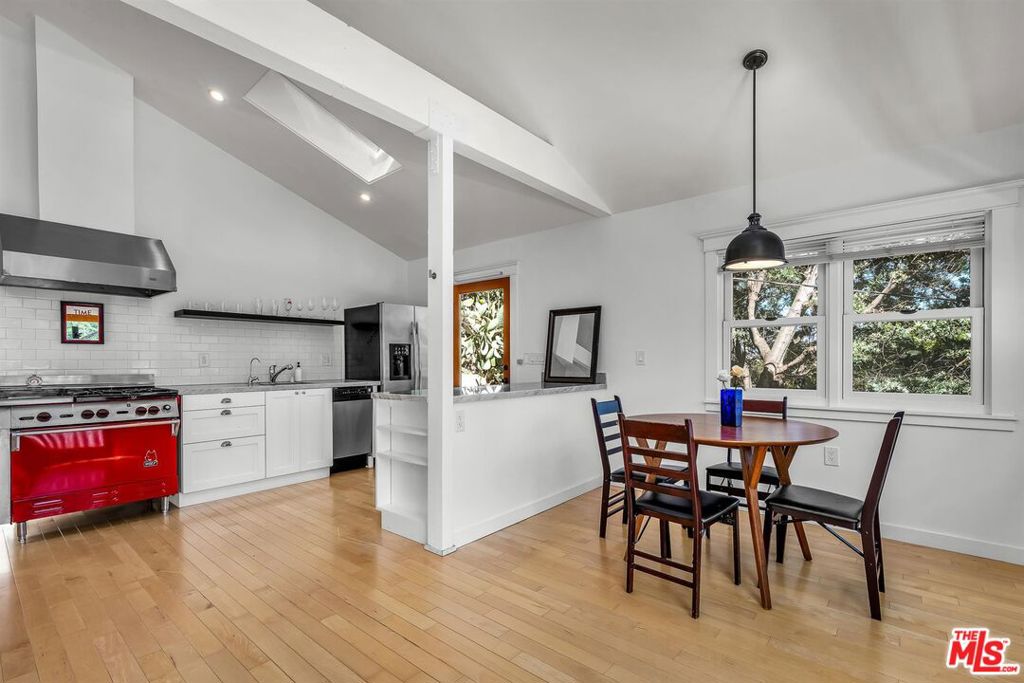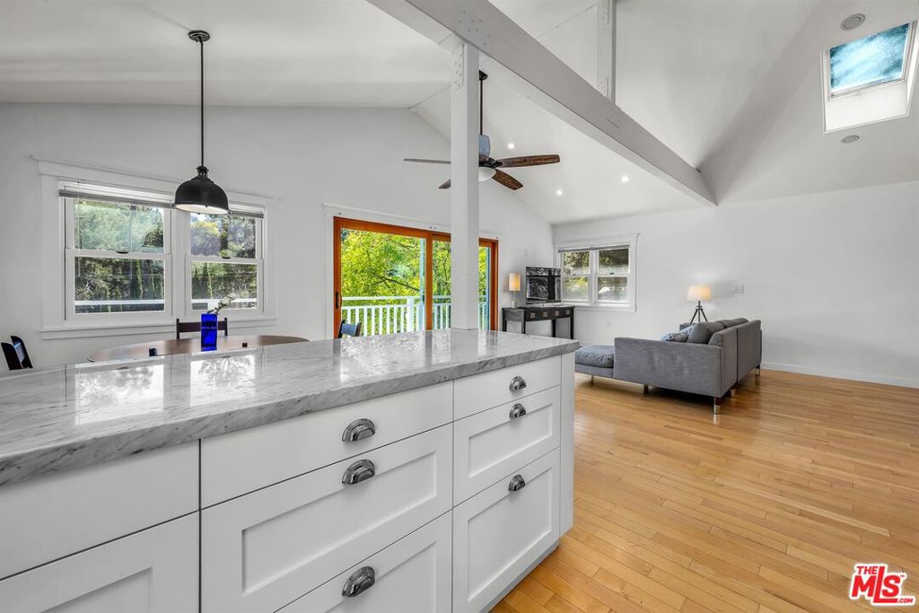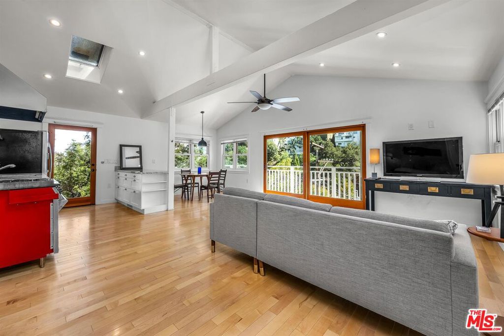 Cape Cod classic in Laurel Canyon. First time on the market in 50 years. Set high above the street among treetops, this 1924 home was reimagined from top to bottom in 2016. Open floor plan with wood floors, vaulted ceilings and skylights offers peaceful views of green beyond the balcony and terraced gardens. Two-car garage. Central heat and a/c + tankless water heater. Plans available for a 300 sq. ft. studio above the garage.