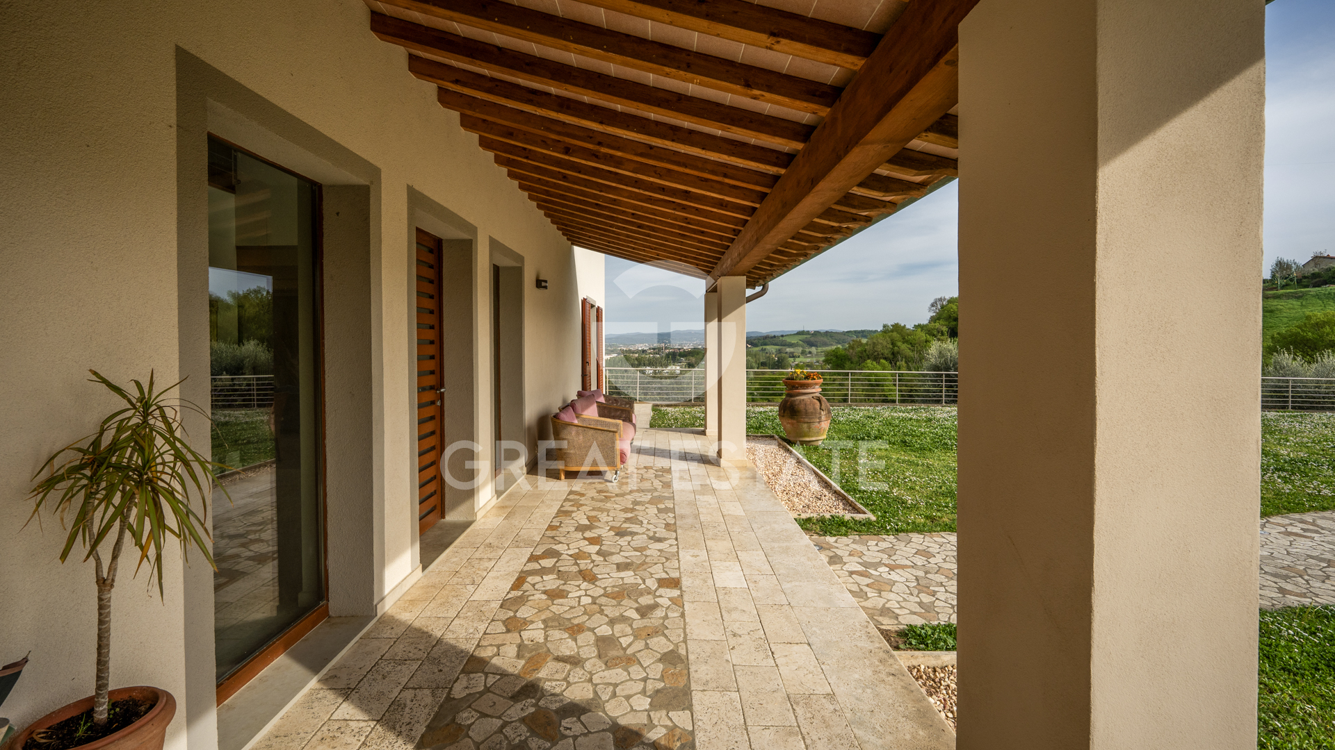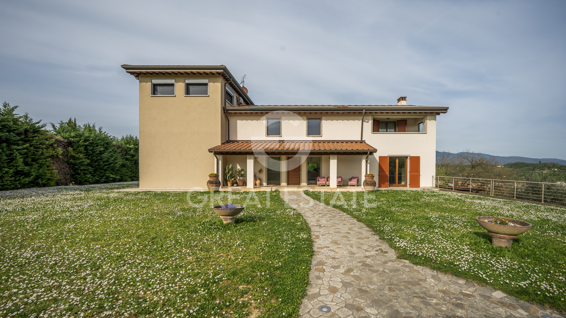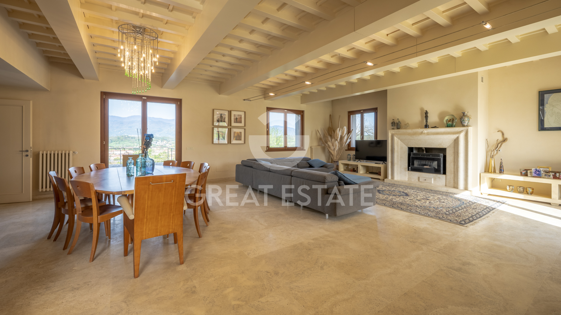 Perched in a privileged position among the gentle hills of the Valdarno, this property represents far more than a simple residence: it is an authentic belvedere overlooking the heart of Tuscany, with spectacular views embracing one of the most enchanting areas of Italy. The villa, approximately 470 mq, is arranged over three levels and welcomes guests through a charming loggia leading to the main entrance. On the ground floor, an impressive and light-filled reception hall opens up, where the warmth of the fireplace blends seamlessly with the natural light streaming through large windows. This level is completed by an elegant dining room, a modern kitchen, a cozy study, and a bathroom. The lower level hosts a spacious tavern designed for leisure and entertainment: a games area, billiard room, lounge spaces, as well as a kitchen, bathroom, and garage. The first floor is entirely dedicated to the sleeping quarters, featuring four bedrooms and four bathrooms. The master suite stands out as an exclusive retreat, with a travertine en-suite bathroom, walk-in closet, and a private terrace offering breathtaking views of the surrounding hills. From here, there is access to a charming panoramic turret of approximately 35 mq, currently used as a living room, offering 360-degree views across the valley. Externally, the property is surrounded by approximately 10,400 mq of land celebrating the Tuscan agricultural tradition, with 40 centuries-old olive trees and a meticulously maintained garden. Enhancing the estate even further is a striking 6x12 meter swimming pool, ideal for moments of relaxation immersed in the tranquility and beauty of the landscape.