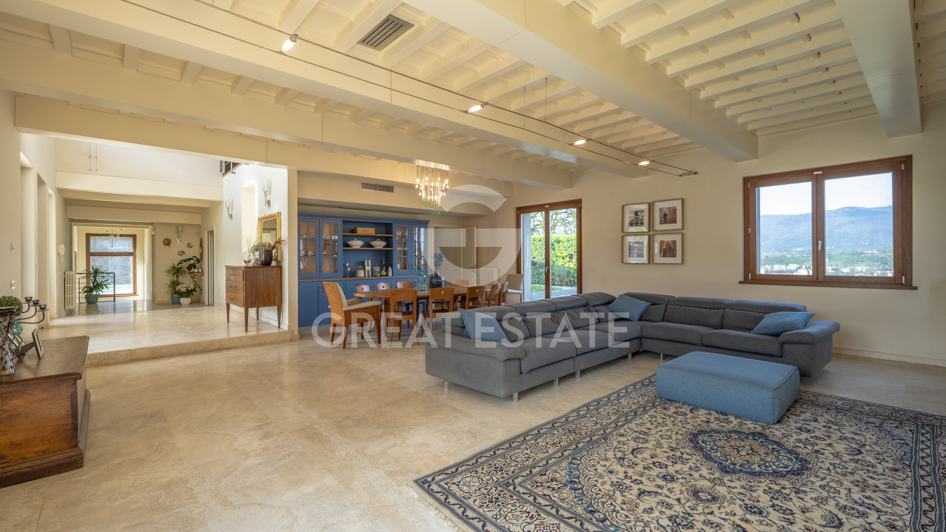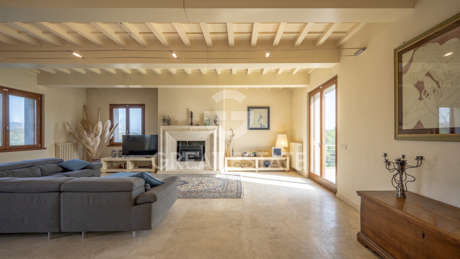 The villa stands out for its modern and elegant style, enhanced by high-quality materials. The premium flooring elevates the interiors, while the travertine bathroom and the refined marble fireplace add a touch of sophistication. The designer kitchen, functional and contemporary, integrates seamlessly with the living spaces. The modern character of the property is also expressed through its state-of-the-art technological features, designed to ensure maximum living comfort and a reduced environmental impact. The bright and harmonious interiors maintain a constant dialogue with the outdoors through large openings, creating a pleasant visual continuity between the living areas and the meticulously landscaped garden.